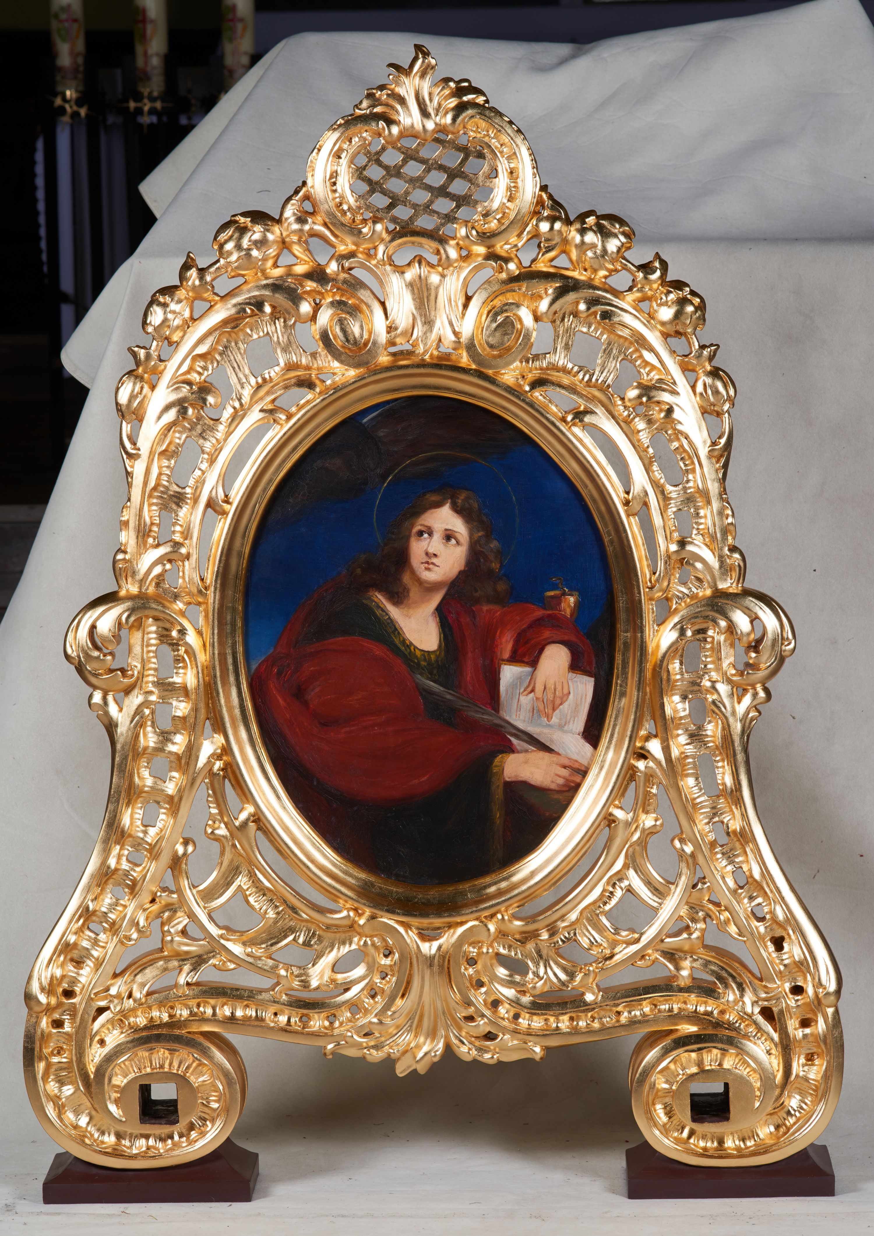 Święty Jan Ewangelista zwrócony trzy czwarte w lewo, z głową w przeciwną stronę. Lewą rękę uniesioną na wysokość piersi opiera na otwartej księdze; w prawej, wspartej o pulpit trzyma pióro. Twarz owalna o młodzieńczych rysach z prostym nosem, brązowymi oczami, wydatnymi i jasnobeżowymi ustami. Głowa okolona długimi, jasnobrązowymi włosami z przedziałkiem na środku, opadającymi lekko skręconymi puklami na ramiona i plecy. Wokół głowy złota, cienka aureola. Apostoł jest ubrany w ciemnozieloną tunikę z żółtozieloną lamówką przy dekolcie i rękawach oraz czerwony płaszcz przerzucony przez przedramiona. Po prawej stronie za ręką świętego widoczny fragment złotego kielicha z wężem w czarze. Tło czarno-granatowe.