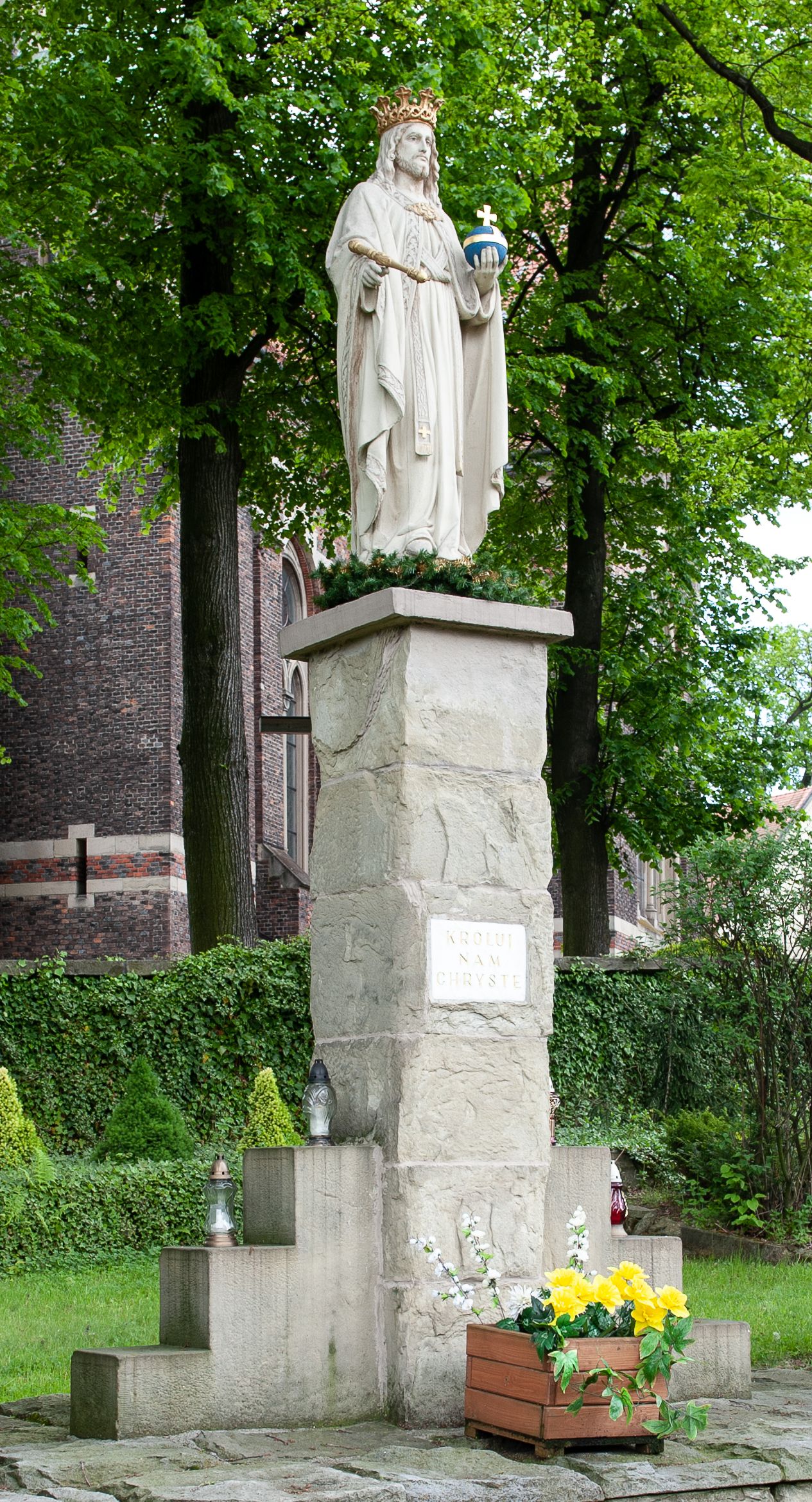 Pełnoplastyczna rzeźba Chrystusa Króla Wszechświata została ustawiona na wysokim czworobocznym postumencie wzniesionym z kamiennych ciosów. Chrystus został przedstawiony frontalnie, stojąc na fragmencie widocznego globu w nieznacznym kontrapoście. W wyciągniętej przed siebie prawej ręce trzyma złocone berło ułożone poziomo. Natomiast lewą ręką podtrzymuje niebieski glob zwieńczony złotym krzyżykiem. Chrystus ma pociągłą twarz otoczoną zarostem oraz długimi włosami spływającymi na ramiona. Ma prosty nos, wydatne usta oraz szeroko otwarte oczy o spojrzeniu skierowanym przed siebie. Ubrany jest w przewiązaną albę odsłaniającą na dole końcówki butów, skrzyżowaną na piersi kapłańską stułę oraz kapę, której poły zarzucone są na przedramienia. Spiętą pod szyją złoconą fibulą kapę lamuje szeroka, wzorzysta borta wyciskana w kamieniu. Zbawiciel ma na głowie złoconą koronę o wysokich, floralnych sterczynach z obręczą dekorowaną motywem wieńca z ciernia. Boki postumentu flankują dwa kamienne uskoki ułożone schodkowo.