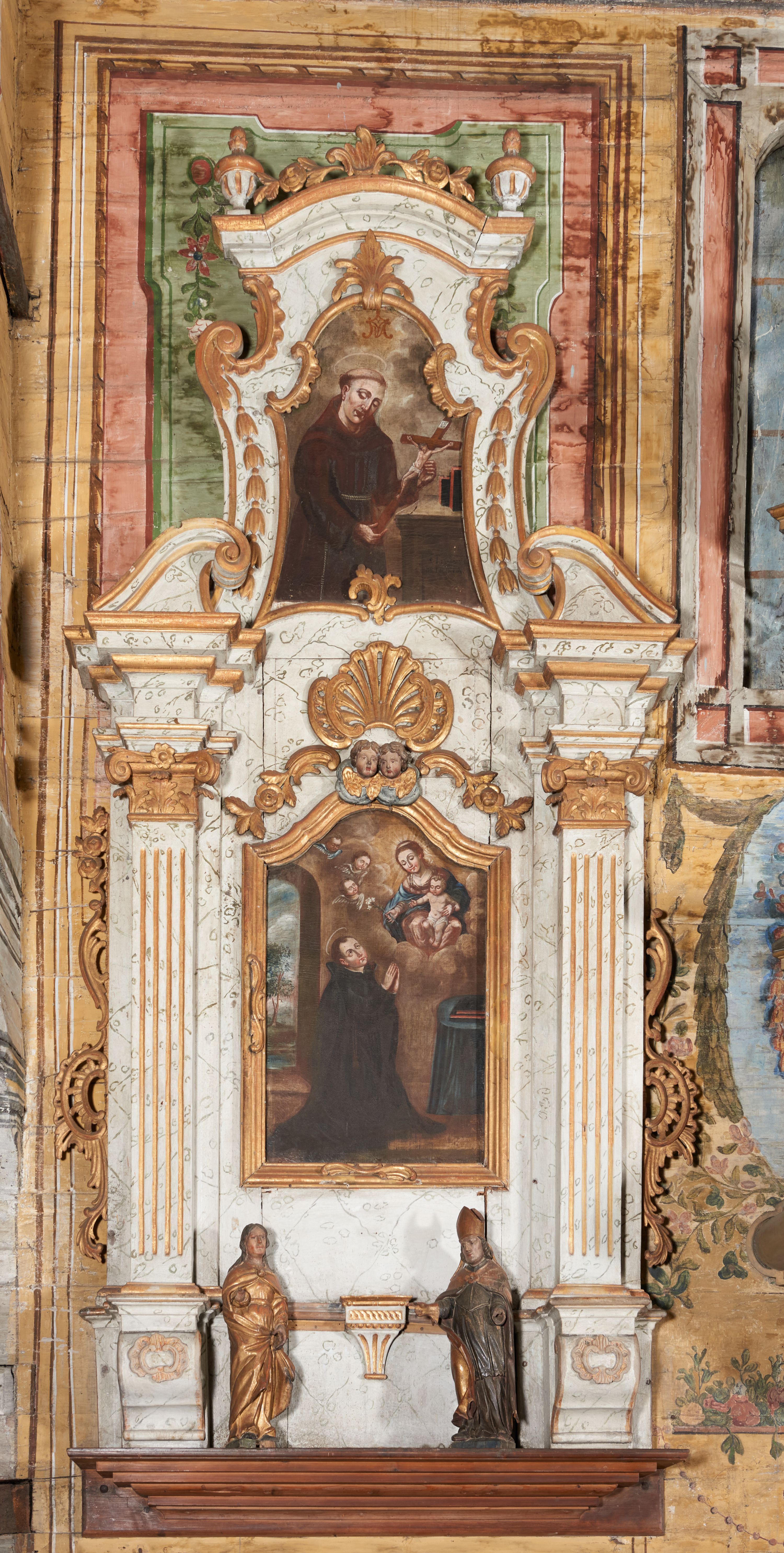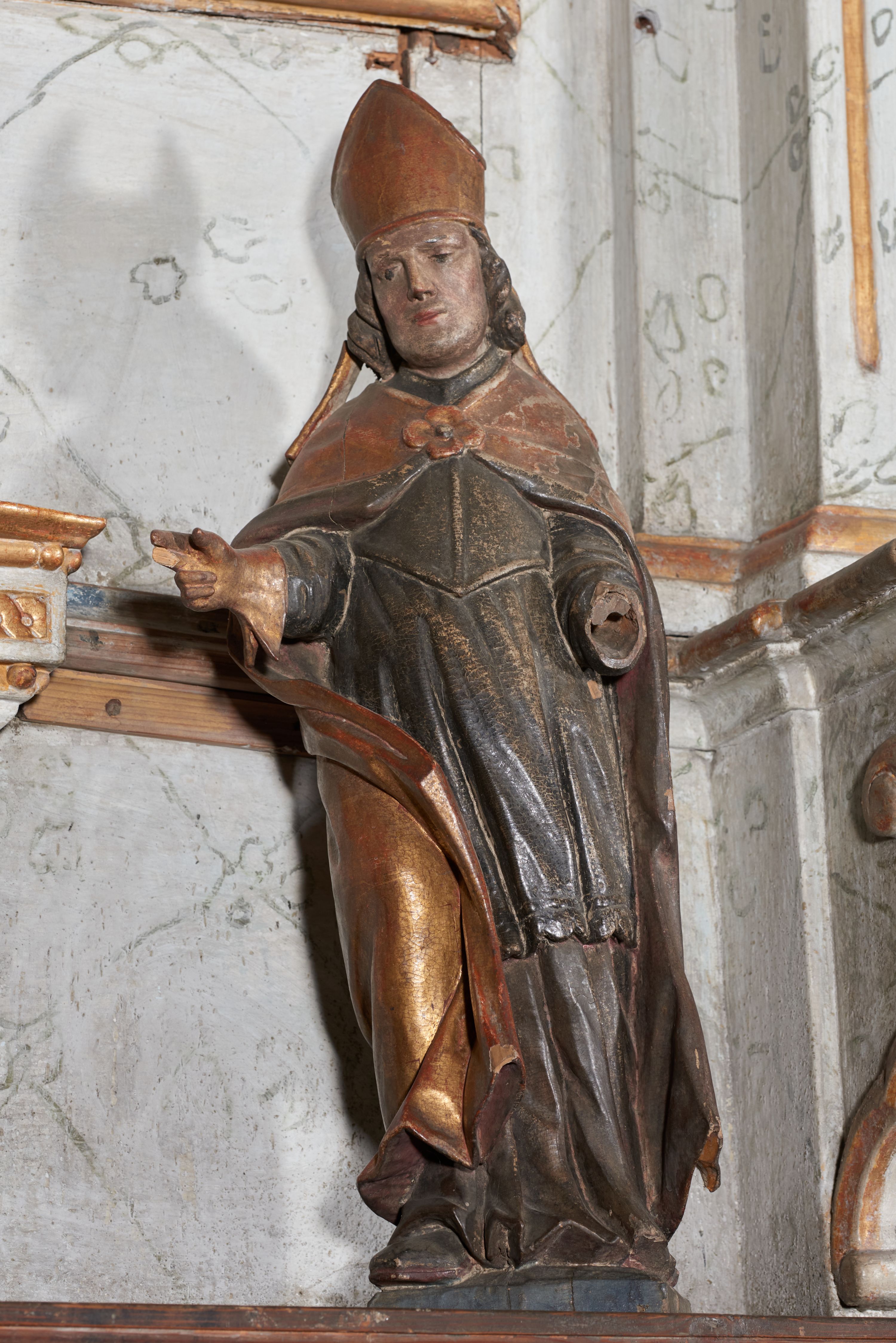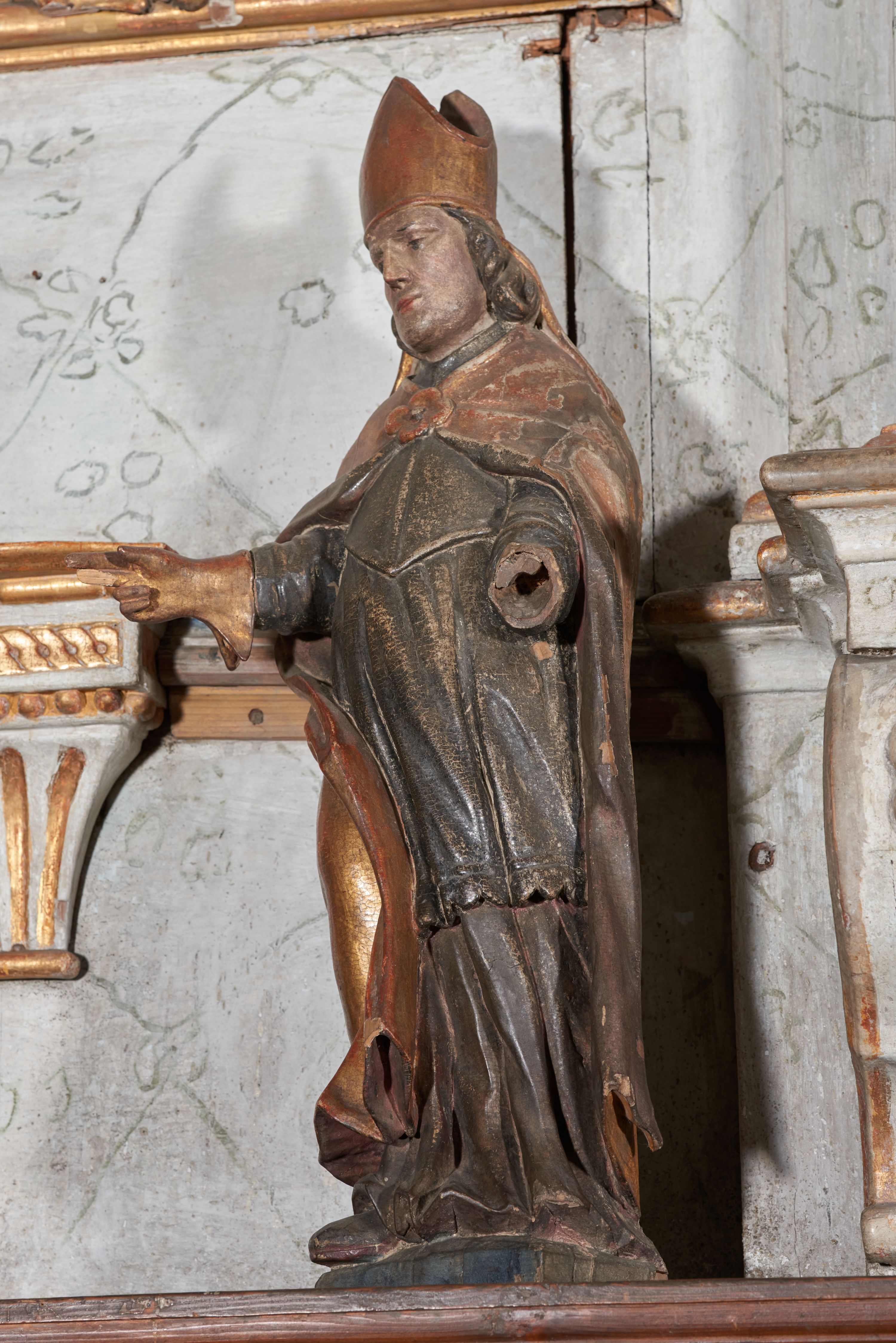 Figura niezidentyfikowanego biskupa (św. Stanisława?) powstała najpewniej przed 1664 rokiem. Prawdopodobnie stanowiła element dekoracji figuralnej dawnej ambony. Po zamontowaniu nowego wyposażenia w XVIII wieku, została zdemontowana i w późniejszym czasie wtórnie ustawiona w jednym z ołtarzy bocznych.