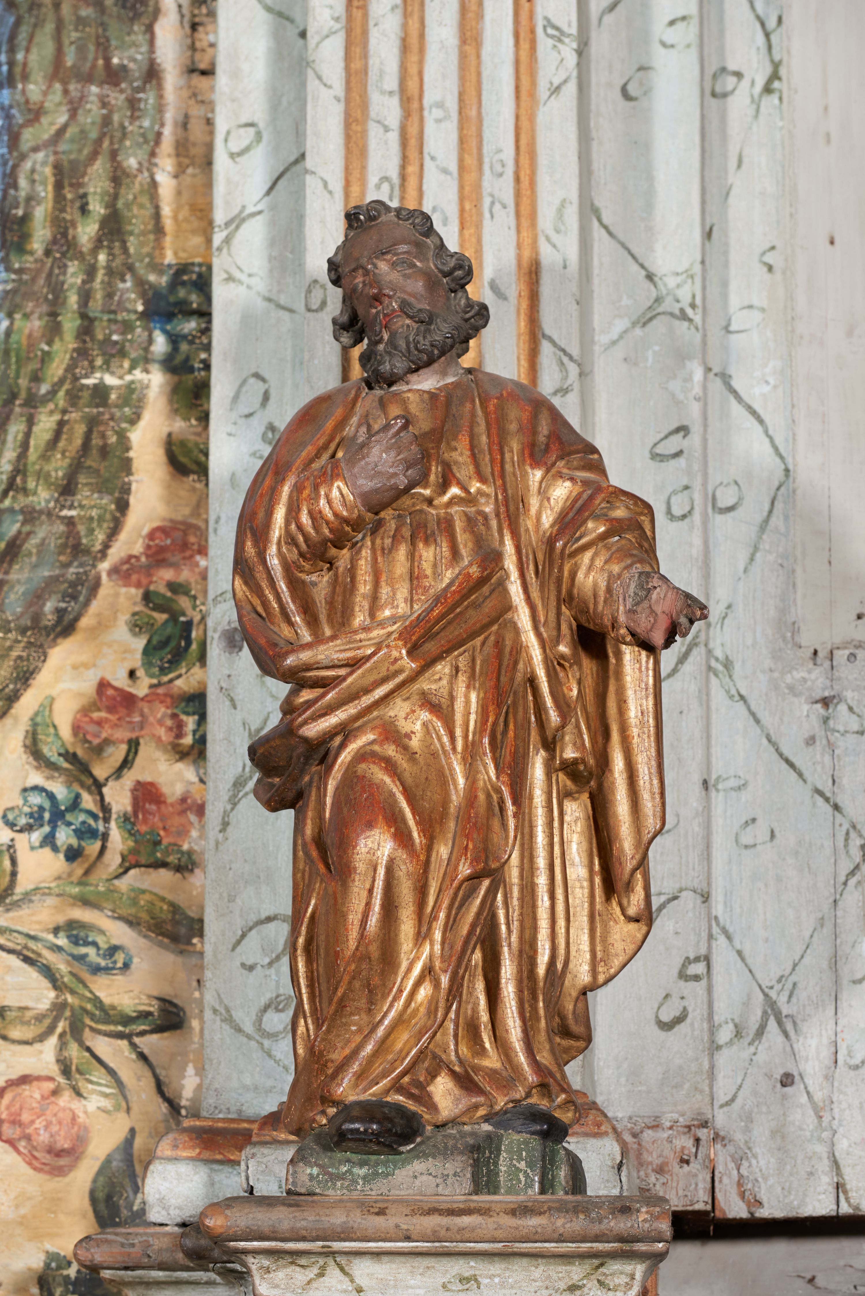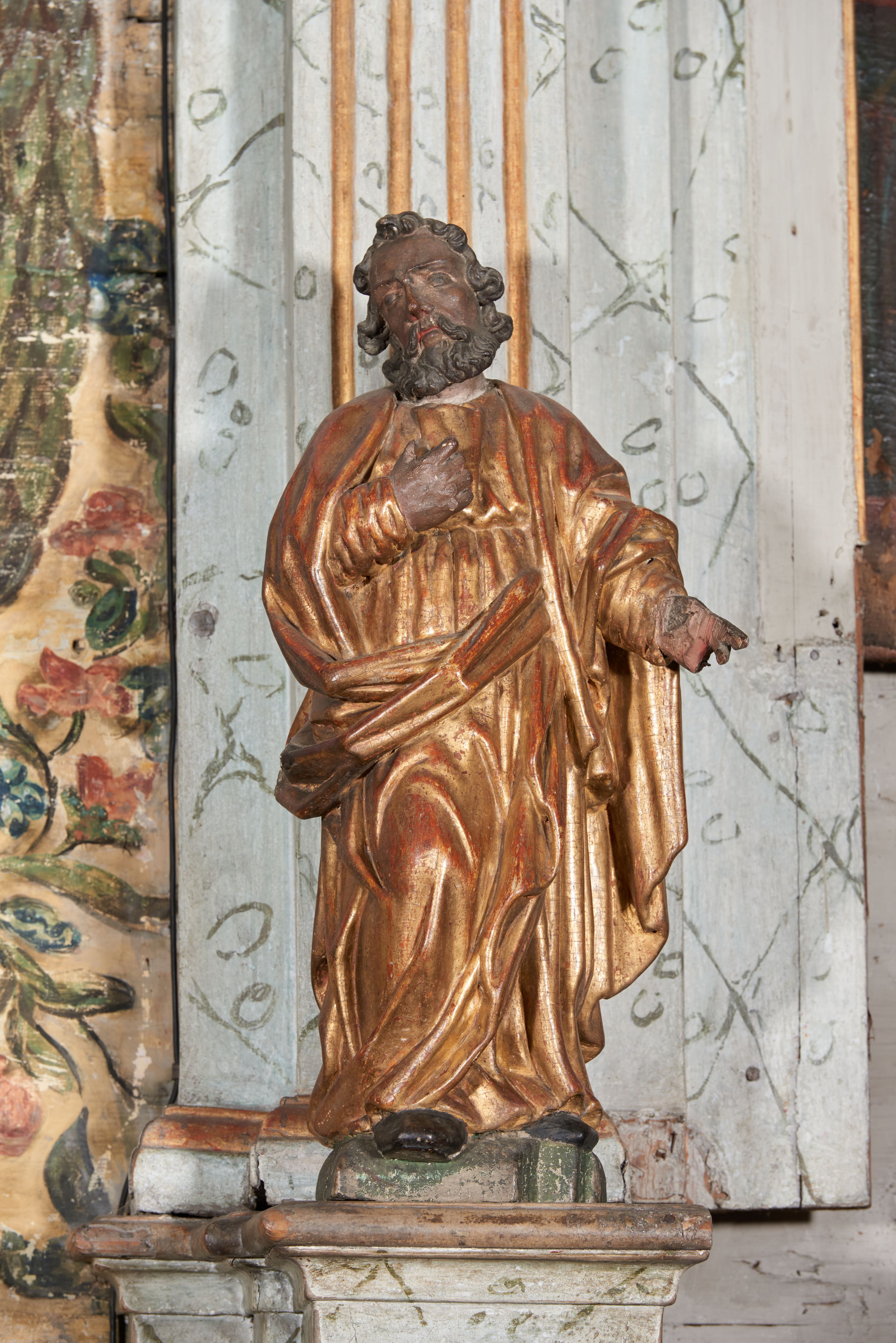 Figura nieopracowana z tyłu; ustawiona na niskiej, nieregularnej podstawie. Święty ukazany frontalnie z prawą nogą ugiętą, lewą rękę wyciąga w bok, prawą kładzie na piersi. Twarz ma pociągłą o niskim czole, niewielkich oczach, krótkim, wąskim nosie i małych ustach, okoloną krótkimi kręconymi włosami i brodą. Ubrany jest w obficie fałdowaną, tunikę przepasaną w talii oraz płaszcz zarzucony na ramiona i zawinięty z przodu postaci. Polichromia ciała naturalistyczna, szaty złocone.