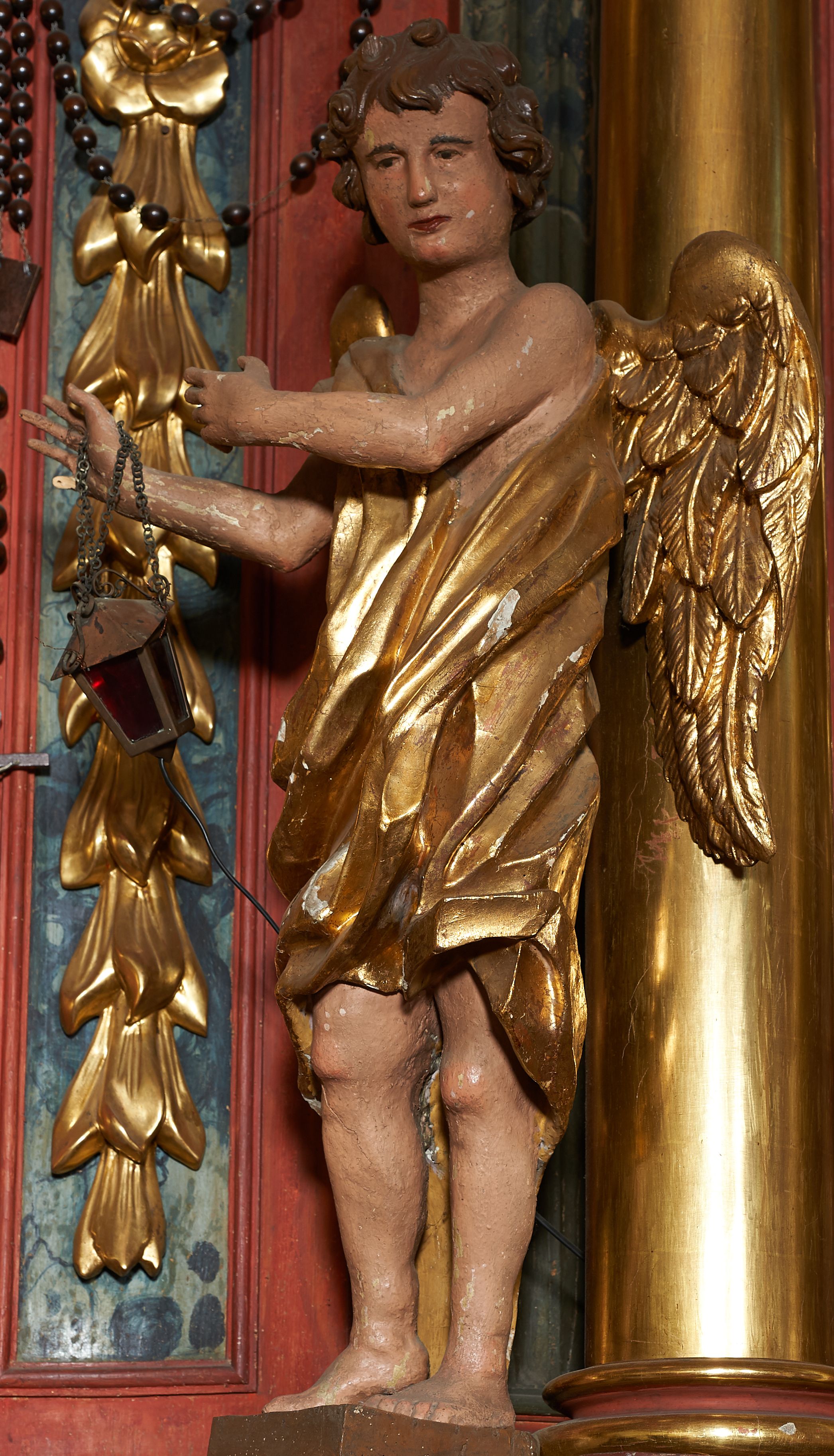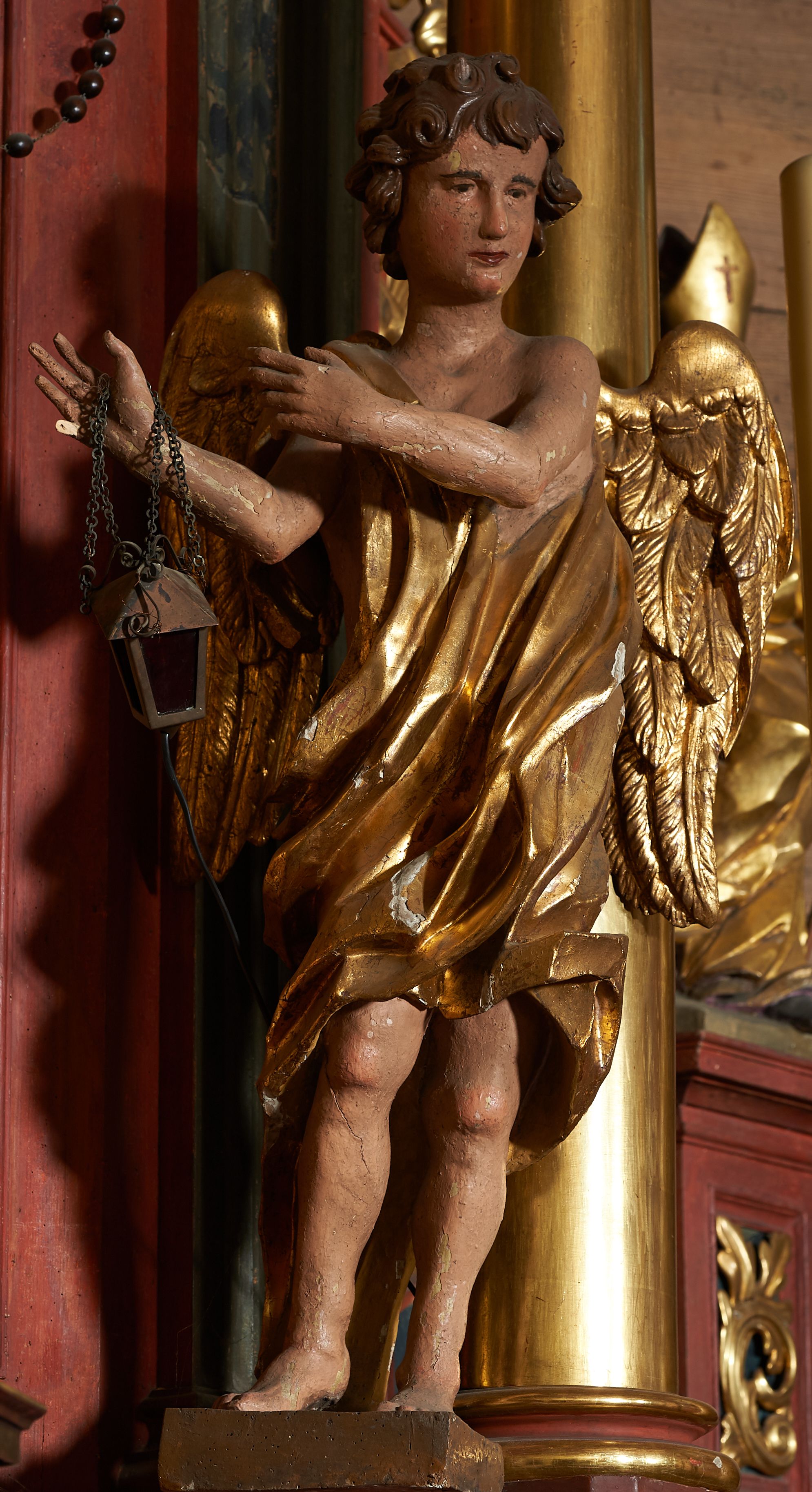 Rzeźby pełnoplastyczne, z tyłu drążone. Figury całopostaciowe, zwrócone antytetycznie, stojące w kontrapoście, z pochylonymi głowami, z obiema rękoma skierowanymi ku środkowi ołtarza, przytrzymują latarnie. Twarze owalne, o indywidualnych rysach, delikatnie zarysowanych oczach i ustach oraz płaskim nosie. Włosy w postaci krótkich, gęstych loków. Ubrane w przewiązaną diagonalnie przez tors, obficie drapowaną szatę, opadającą na tył postaci. Skrzydła złożone. Polichromia naturalistyczna w partiach ciała, szaty i skrzydła złocone.