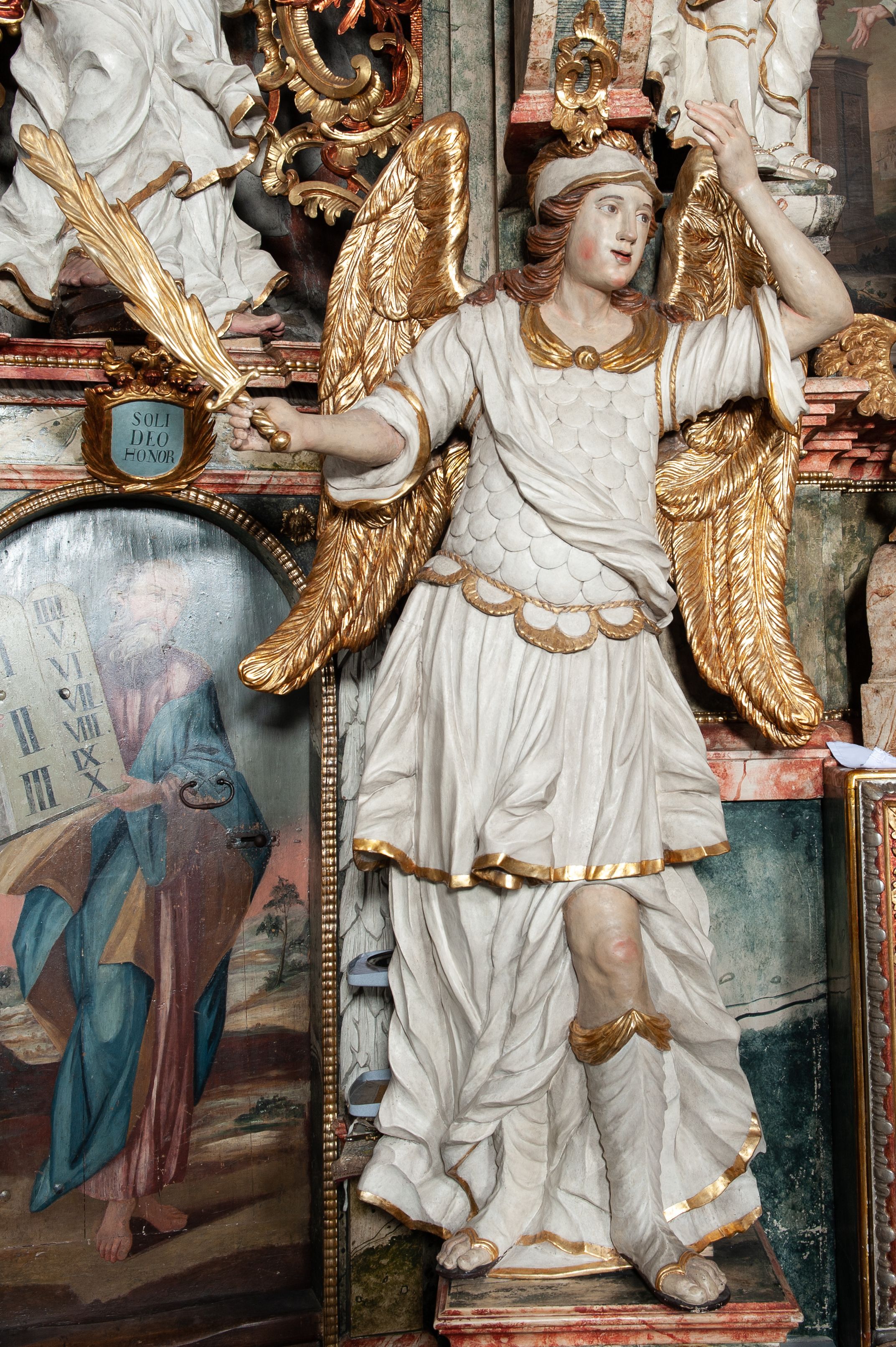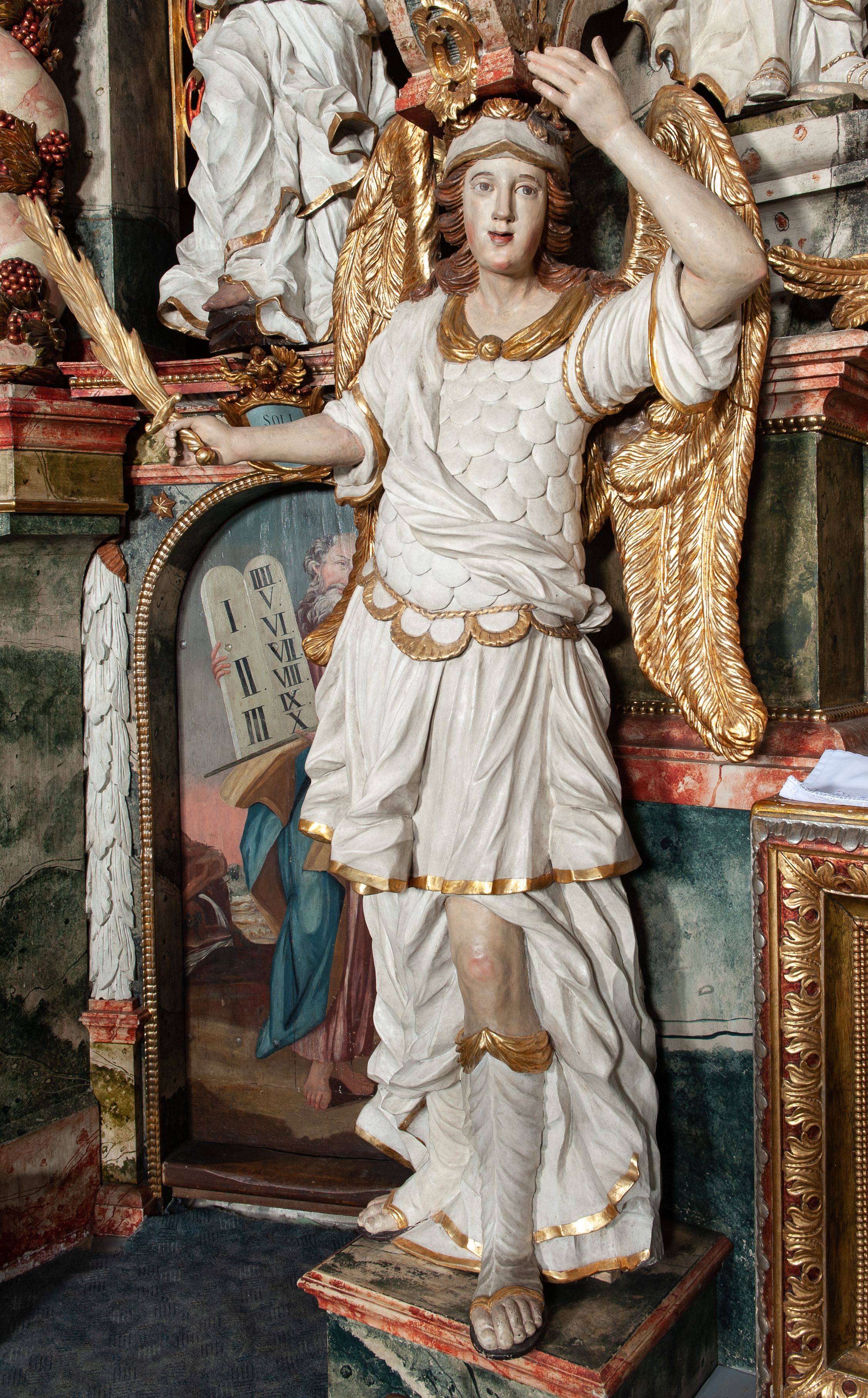 Rzeźby pełnoplastyczne, przyścienne, z tyłu drążone. Figury analogiczne, zwrócone antytetycznie. Anioły ukazane en face, stojące w kontrapoście, o lekko esowato wygiętych sylwetkach, na głowach podtrzymują woluty, ręce od wewnętrznej strony ołtarza, ugięte, uniesione do góry, podtrzymują woluty, zewnętrzne wyciągnięte w bok, dzierżą miecze o płomienistych ostrzach. Twarze pociągłe, o niewielkich oczach i długich prostych nosach. Włosy długie, opadające gęstymi puklami na ramiona. Anioły ubrane w białe tuniki sięgające do kolan, ze złotą lamówką, szatę spodnią sięgającą do kostek, odsłaniającą prawe nogi, obficie drapowane w grube fałdy, ekspresyjnie poruszone; łuskowy puklerz oraz przewieszony ukośnie przez prawe ramię płaszcz. Na głowach hełm, na nogach wysokie sandały. Skrzydła złożone.Polichromia naturalistyczna w odsłoniętych partiach ciała, szaty białe, detale i skrzydła złocone.