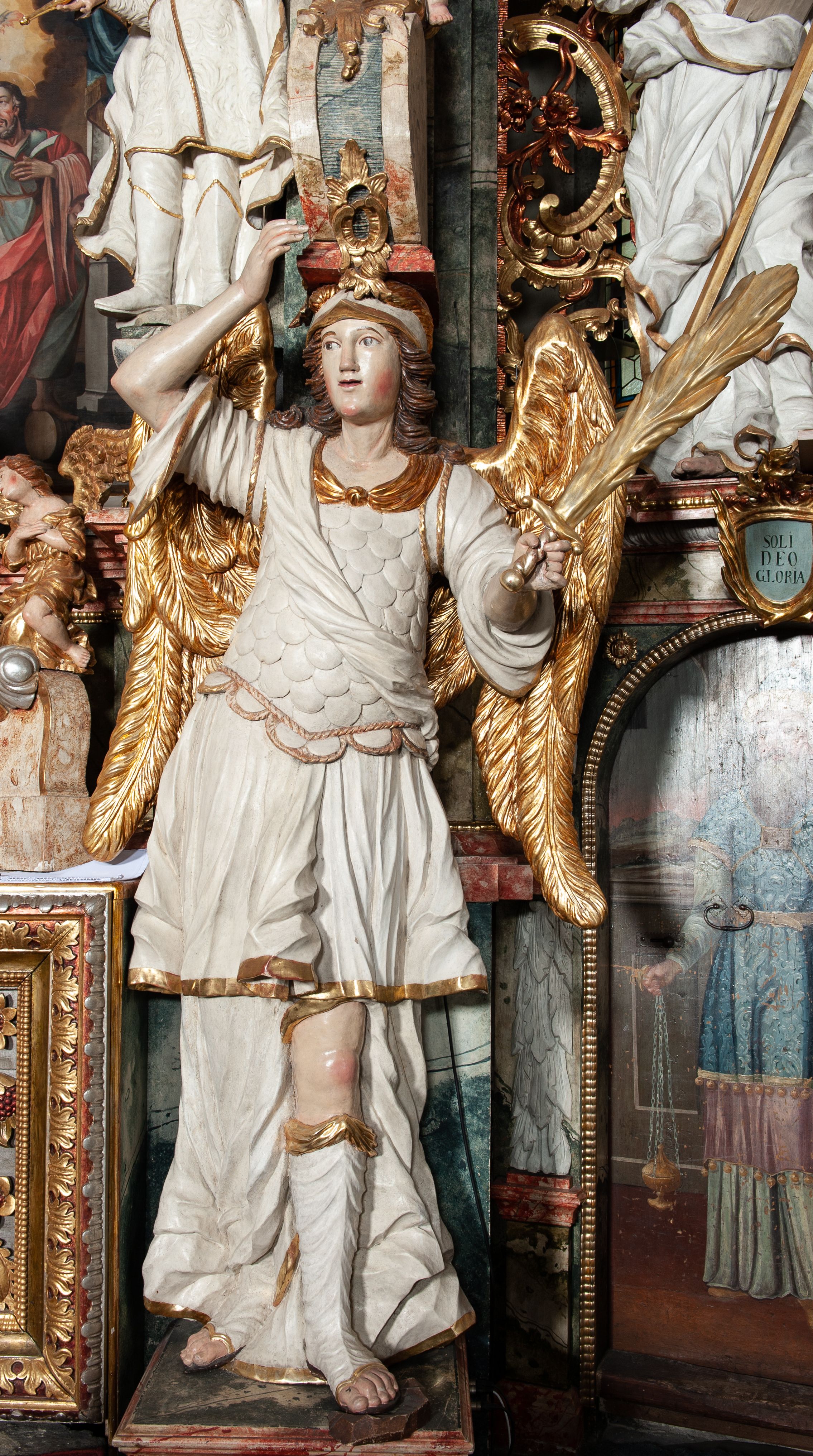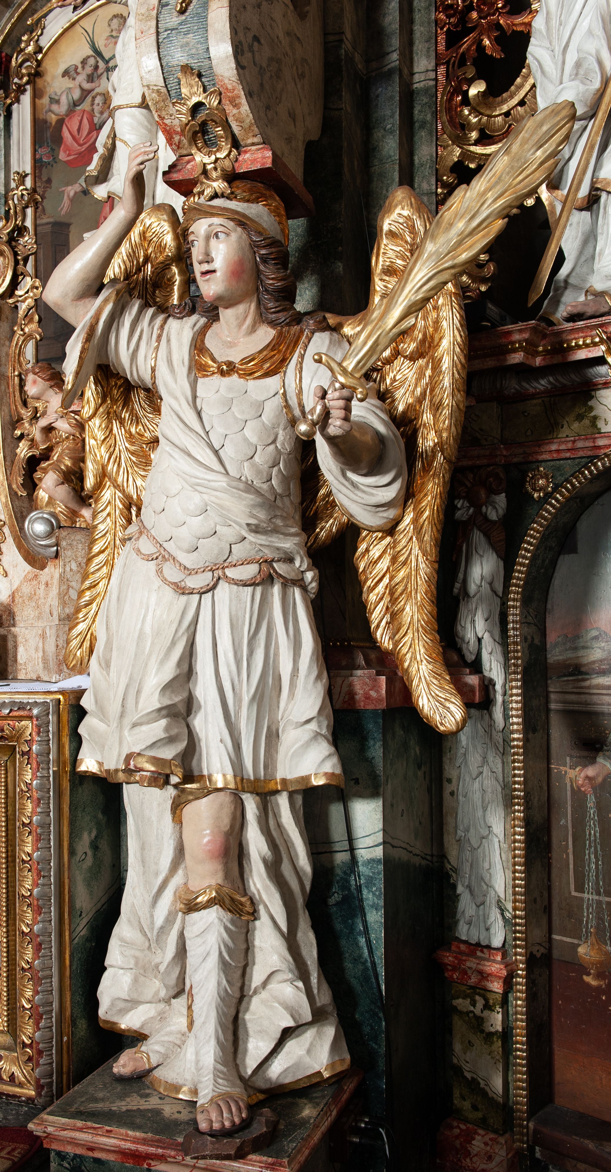 Rzeźby drewniane, polichromowane i złocone, umieszczone w nastawie ołtarza głównego. Para antytetycznie upozowanych aniołów, stojących w kontrapoście, głowami podtrzymujących woluty ołtarza; w jednej ręce trzymają ognisty miecz, drugą unoszą do góry. Rzeźby z około 1750 roku, wykazująca wpływy dzieł Olafa Engelholma, Szweda, czynnego w latach 1694-1700 w Lewoczy.