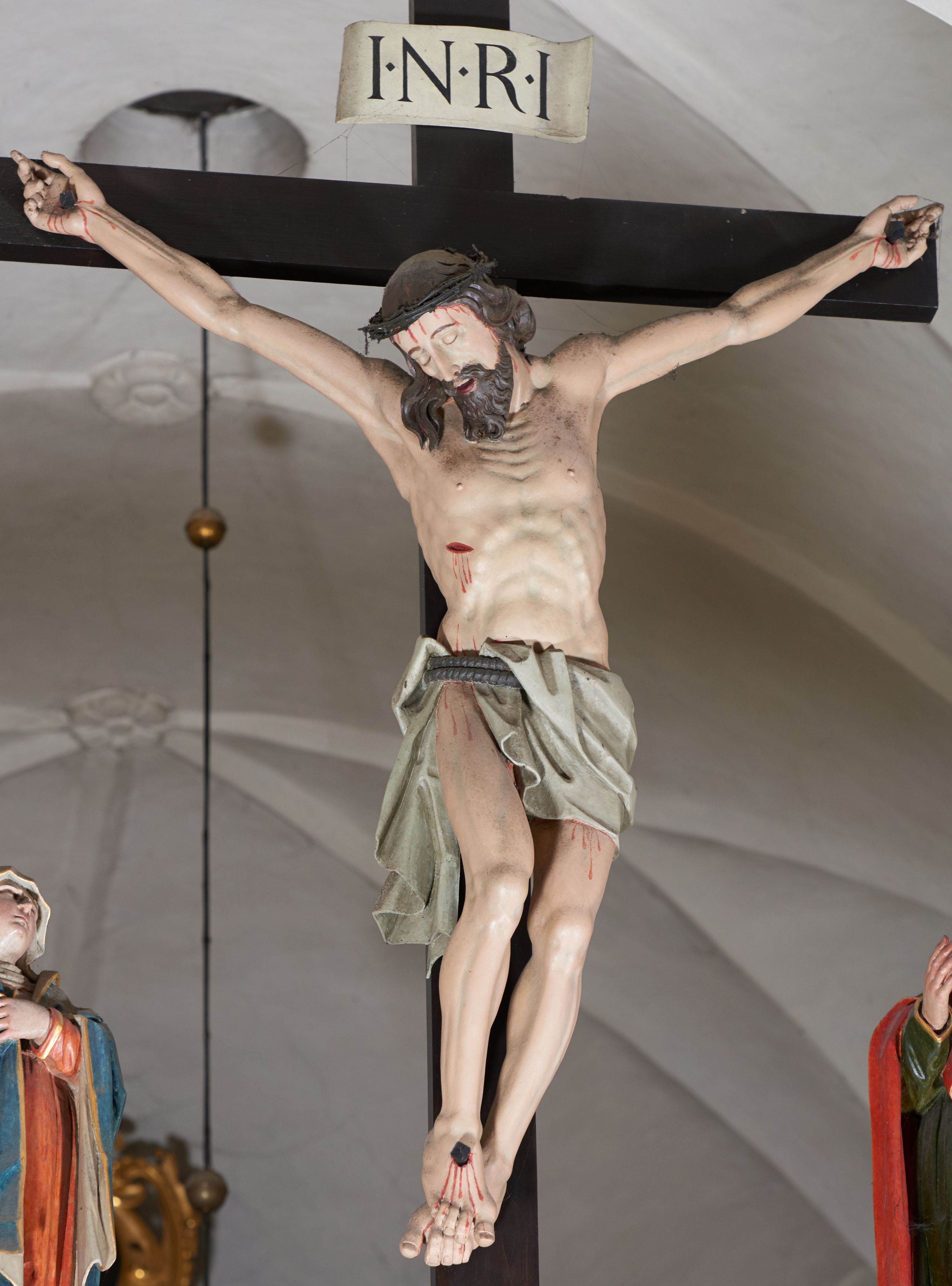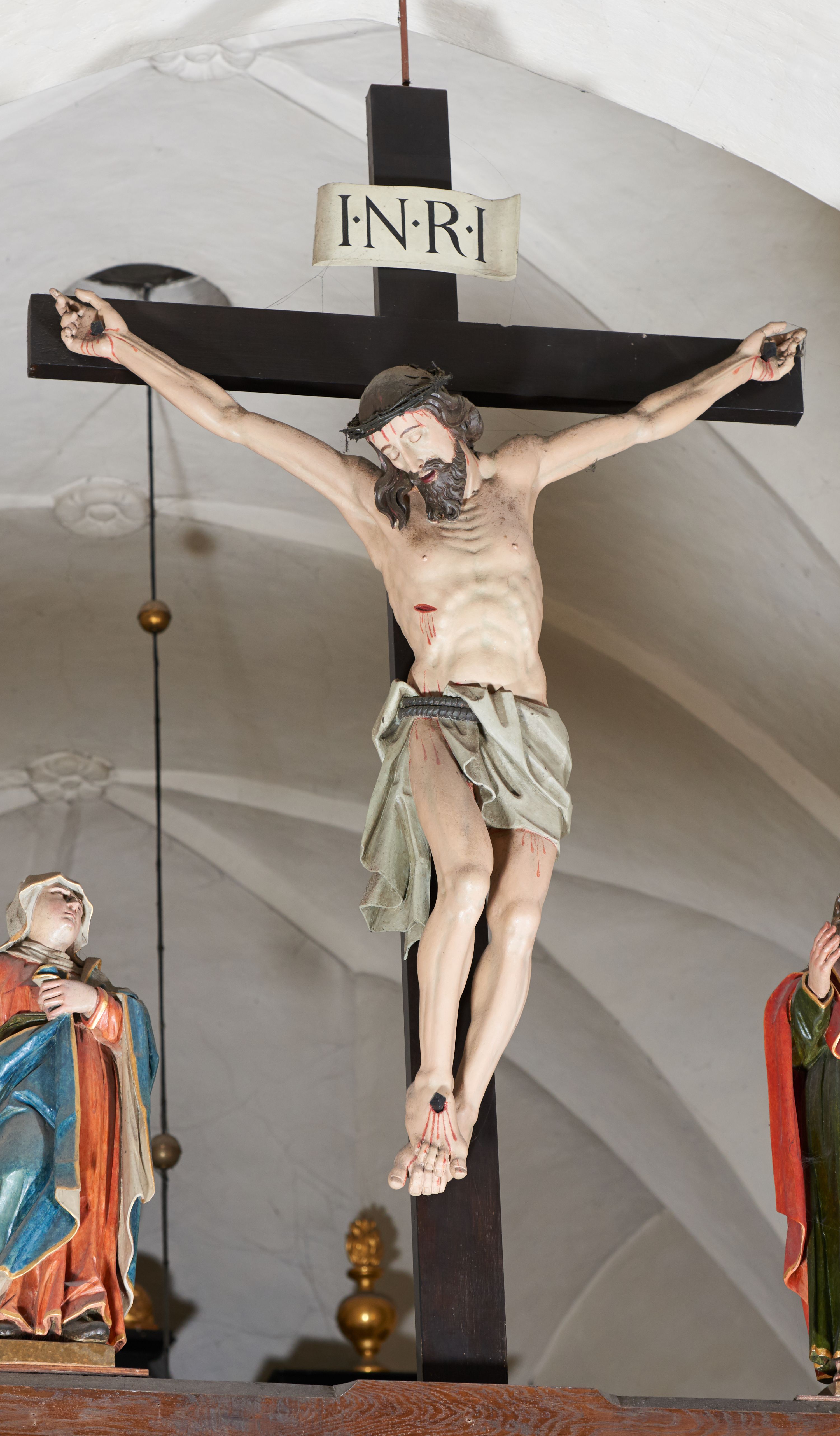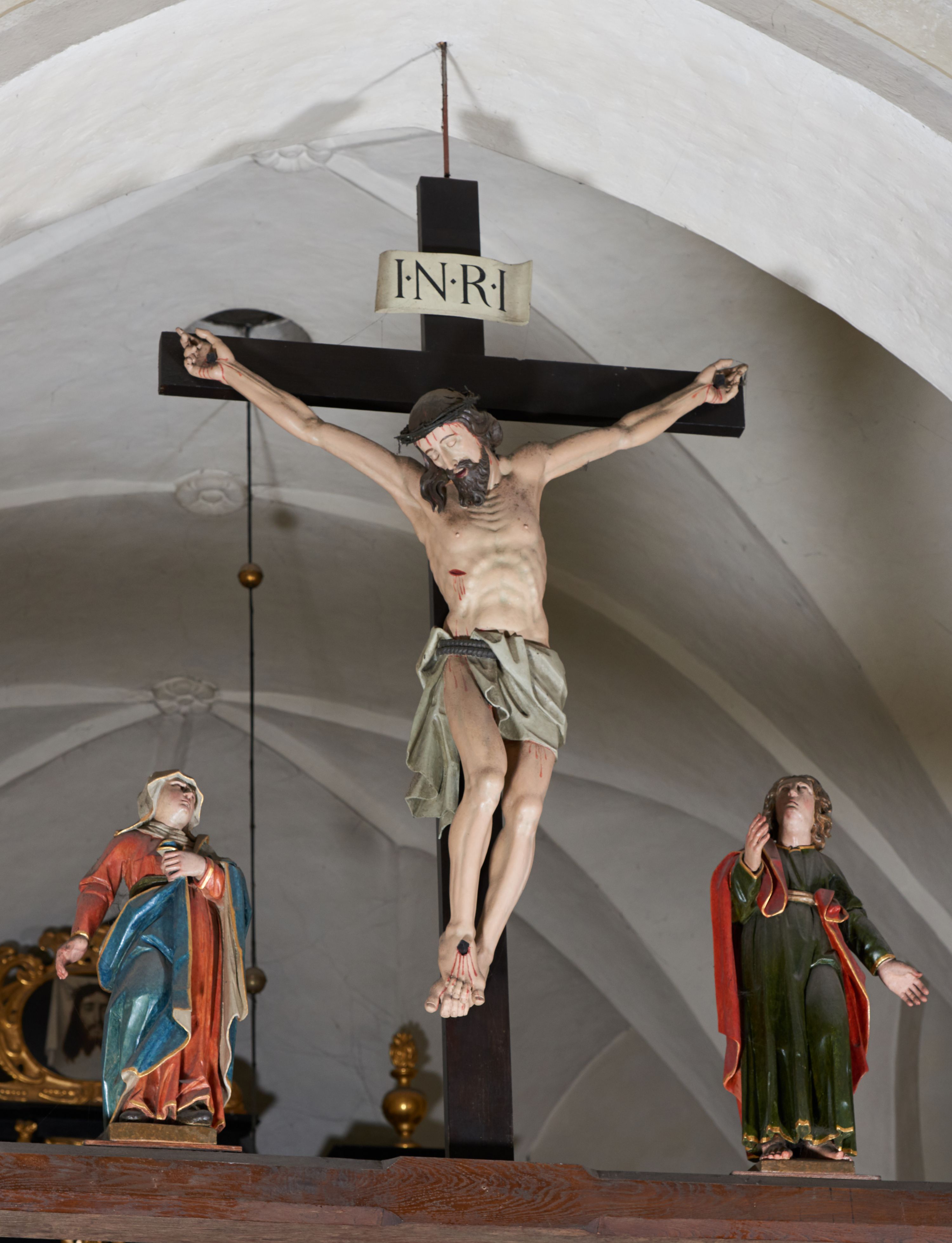 Siedemnastowieczna grupa Ukrzyżowania znajdująca się w łuku tęczowym kościoła, której miejsce ulokowania wykształciło się w procesie historycznym oddziela część świątyni związaną z liturgią od części dla wiernych. Postacie grupy są ze sobą powiązane gestami, zastosowano perspektywę hierarchiczną, pomniejszając figury Matki Boskiej i św. Jana.