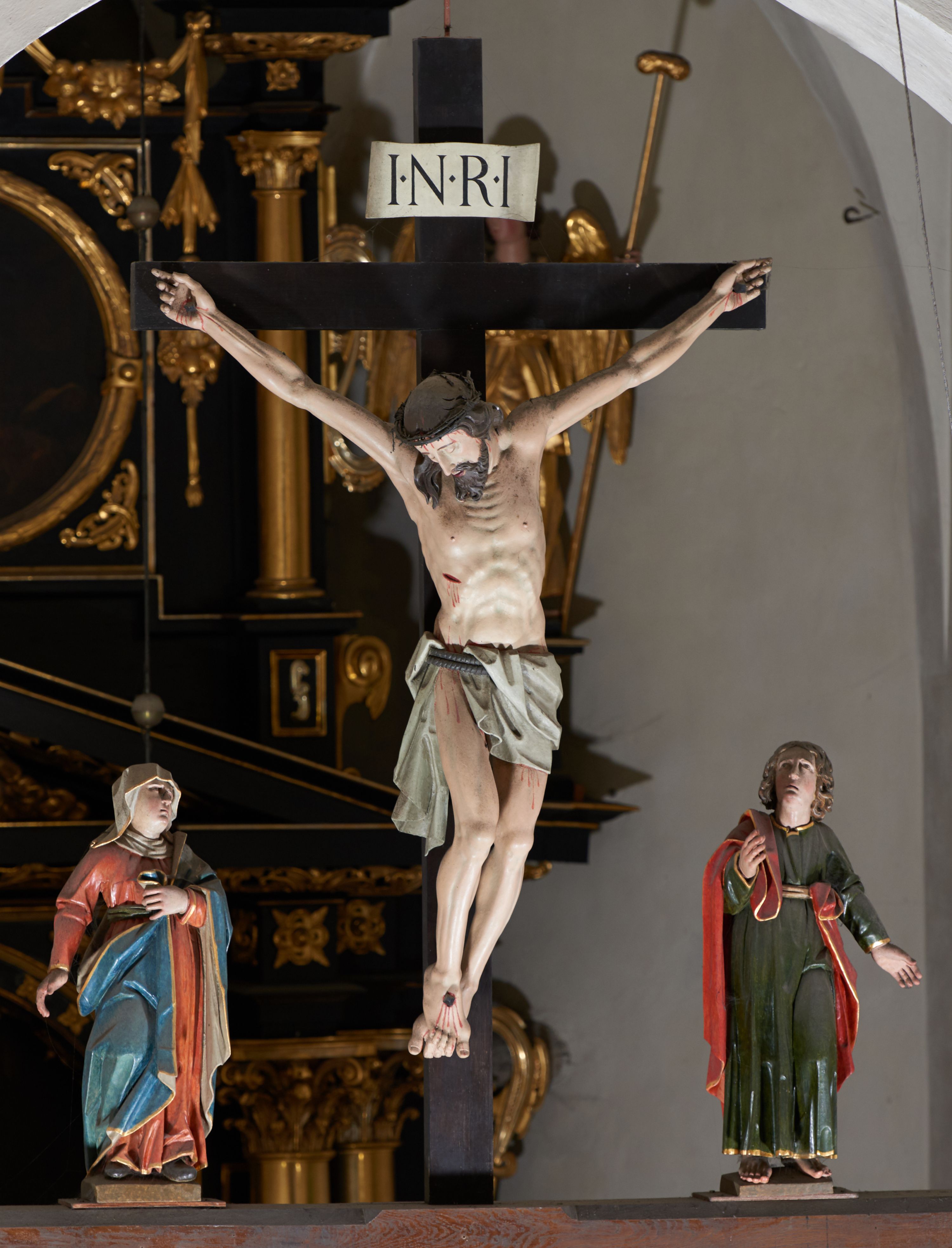 Trójfigurowa grupa Ukrzyżowania, rzeźby pełne. W środku znajduje się krucyfiks z postacią umarłego Chrystusa przybitego trzema gwoździami do krzyża. Chrystus w lekkim zwisie, o szeroko rozłożonych ramionach, bezwładny, głowa opuszczona na prawe ramię. Twarz szczupła, owalna, o prostym nosie, dużych oczach i na wpół otwartych ustach, okolona długim zarostem. Włosy w postaci delikatnych fal opadają na plecy i prawe ramię. Na głowie korona cierniowa. Ciało wychudzone o wyraźnie zarysowanej anatomii. Perizonium w formie tkaniny przewiązanej podwójnym sznurem, odsłaniającej prawe biodro, z dłuższym brzegiem zwisającym po prawej stronie. Draperia gęsto fałdowana, sztywna, o twardych załamaniach materiału. Na szczycie pionowej belki titulus w formie banderoli z napisem „INRI”. Figura Matki Boskiej ustawiona po lewej stronie, zwrócona lekko w stronę krzyża, z głową uniesioną w kierunku Chrystusa. Lewa ręka przyciśnięta do piersi przytrzymuje płaszcz, prawa opuszczona jest wzdłuż ciała. Twarz owalna, niemal bez cech indywidualnych. Ubrana w długą czerwoną suknię, błękitny płaszcz z szarym podbiciem i złoconymi lamówkami, przewiązany diagonalnie przez lewe ramię, opadający na plecy, podtrzymywany na piersi. Na głowie biały welon, opadający na ramiona i plecy. Figura św. Jana Ewangelisty po prawej stronie. Zwrócony delikatnie w stronę krzyża, w kontrapoście, z głową uniesioną w kierunku Chrystusa. Ręce rozpostarte, prawa ugięta i uniesiona w górę, lewa odwiedziona od boku. Twarz młoda, owalna o słabo zindywidualizowanych rysach, włosy w postaci loków sięgają ramion. Święty jest ubrany w ciemnozieloną tunikę przepasaną w talii sznurem oraz czerwony płaszcz ze złoconymi lamówkami, przerzucony diagonalnie przez prawe przedramię i plecy. Matka Boska i św. Jan wykonują podobne gesty; draperie okrywających ich szat są sztywne, ostro załamane. Między figurami Chrystusa i towarzyszącymi mu osobami występuje hierarchia wielkości.