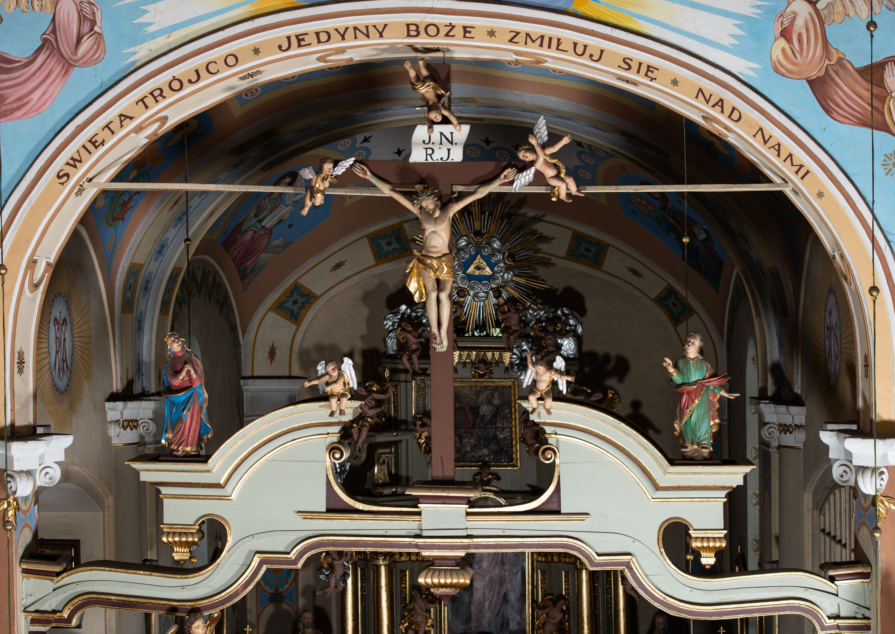 Figury z grupy Ukrzyżowania na belce tęczowej powstały w XVIII wieku.