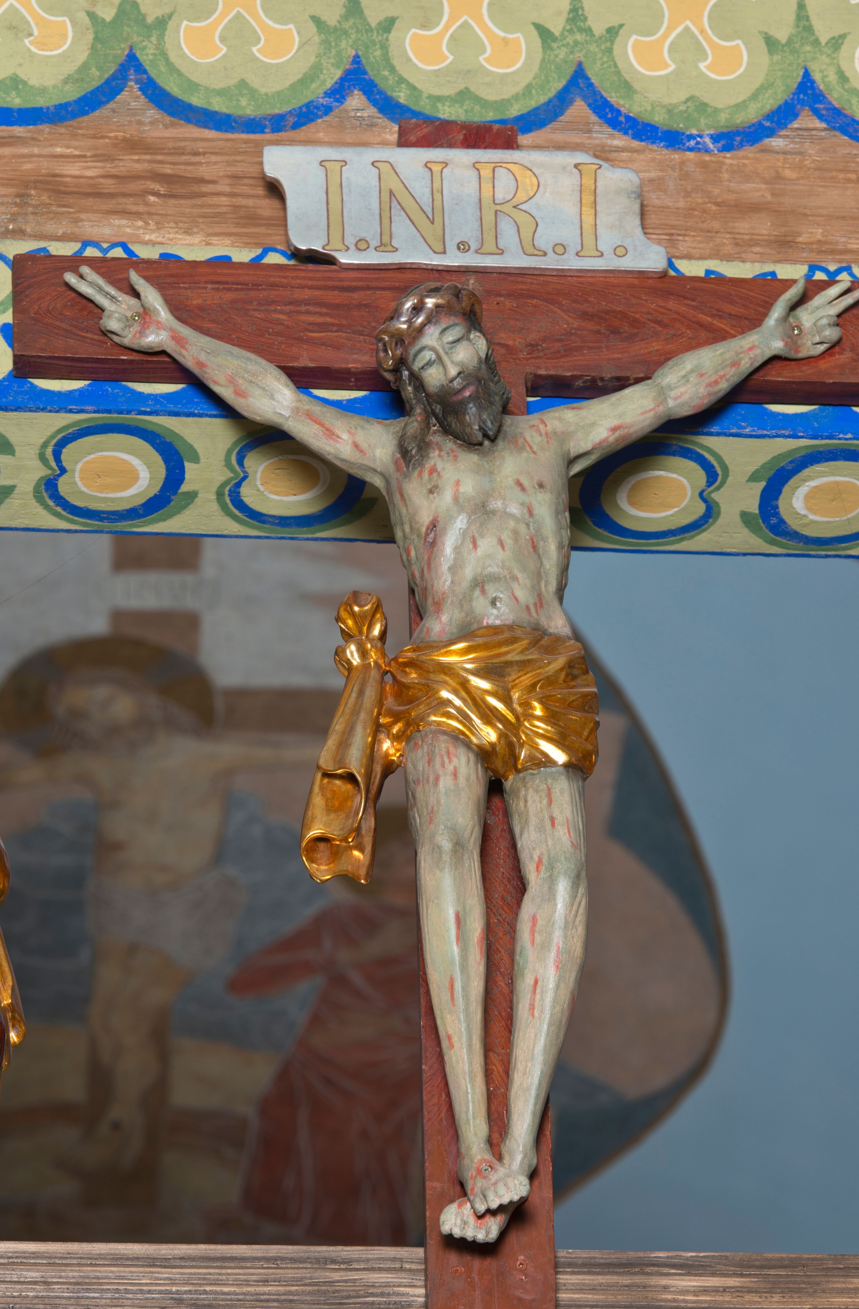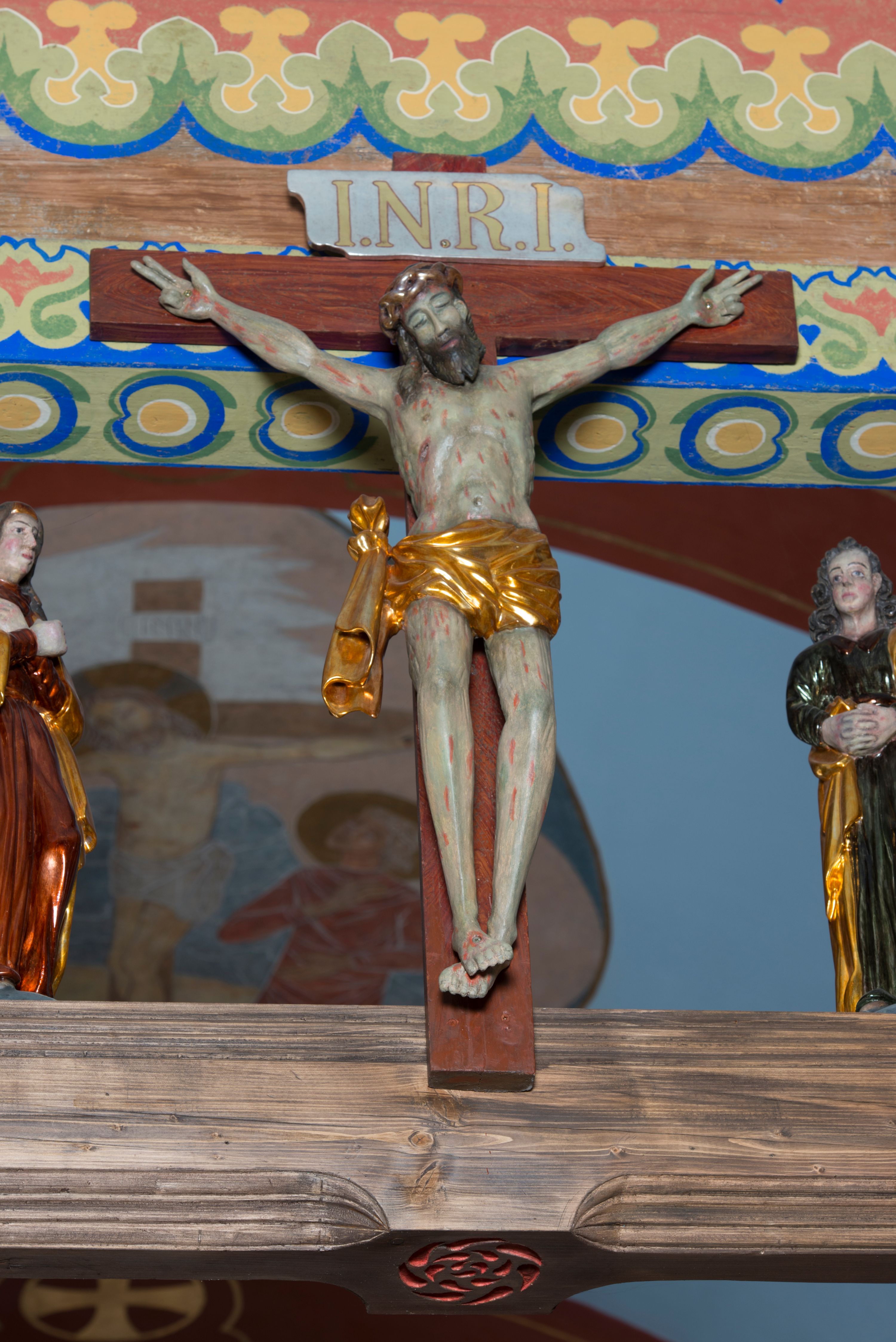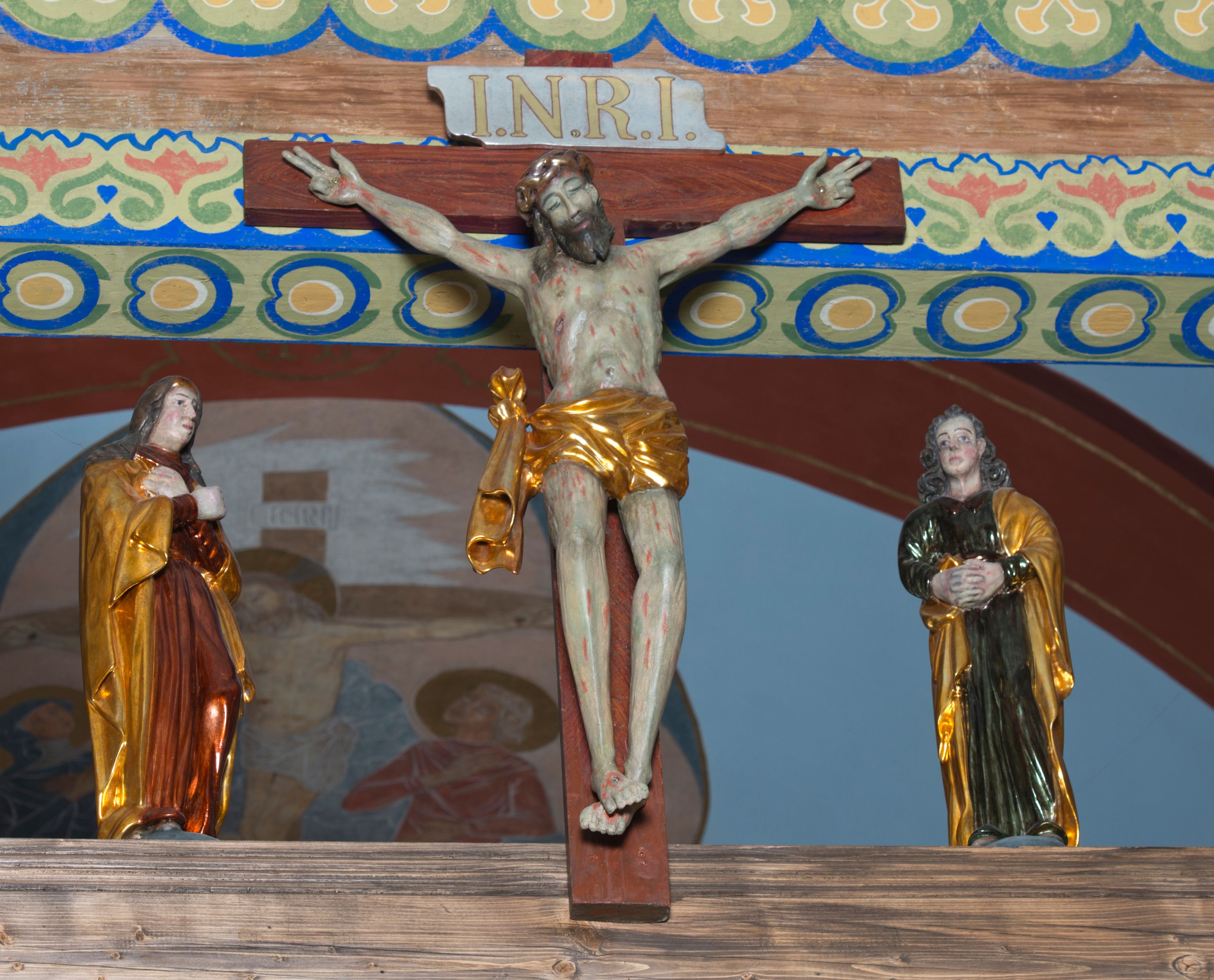 Grupa na tęczy składa się z na wpół ludowo rzeźbionego centralnie krucyfiksu z martwym Chrystusem, po bokach którego stoi pełnorzeźbiona Matka Boska Bolesna i św. Jan Ewangelista. Zbawiciel do krzyża został przymocowany trzema gwoździami. Jezus został ukazany jako martwy z zamkniętymi oczami i głową opadającą na piersi. Jego postać jest wysmukła z nienaturalnie potraktowaną muskulaturą korpusu. Ciało jest wychudzone o zapadłej klatce piersiowej z podkreśloną linią żeber i mostkiem. Z prawej strony widoczny jest przebity bok. Nieznacznie rozchylone nogi są sztywne w kolanach. Prawa stopa założona jest na lewą. Pociągła twarz Chrystusa została miękko opracowana bez szczególnej dbałości o szczegóły anatomiczne. Chrystus ma zamknięte oczy, prosty nos oraz lekko otwarte usta otoczone ciemnobrązowym zarostem, przechodzącym w brodę nieznacznie rozdwojoną na końcu. Jego ciemnobrązowe włosy z lekkim puklowaniem opadają pasmem z prawej strony na ramię, a z lewej na kark, odsłaniając wydatną małżowinę lewego ucha. Chrystus ma na głowie srebrzoną laserunkowo, cierniową koronę, spod której na czoło spływają krople krwi. Krew widoczna jest również na jego rękach, torsie i nogach. Charakterystycznie rzeźbione są nieproporcjonalnie duże dłonie o dwóch zgiętych palcach. Biodra Zbawiciela przepasane są złoconym, krótkim perizonium w formie chusty zawiązanej na duży węzeł z festonem opadającym wzdłuż prawego boku. Ponad głową Chrystusa zawieszony jest titulus w formie tabliczki o faliście wycinanych brzegach ze złotym napisem: „INRI”.