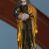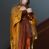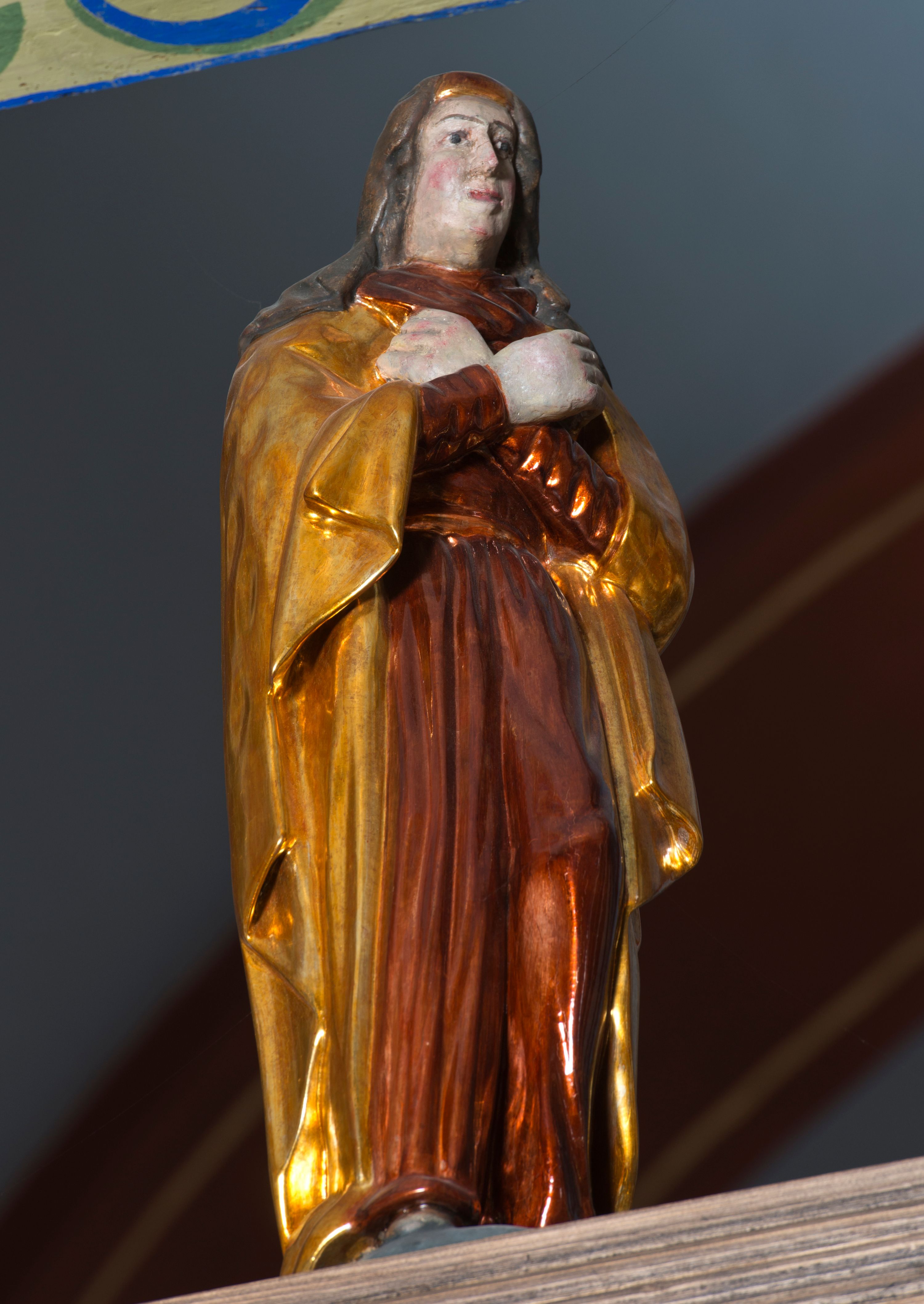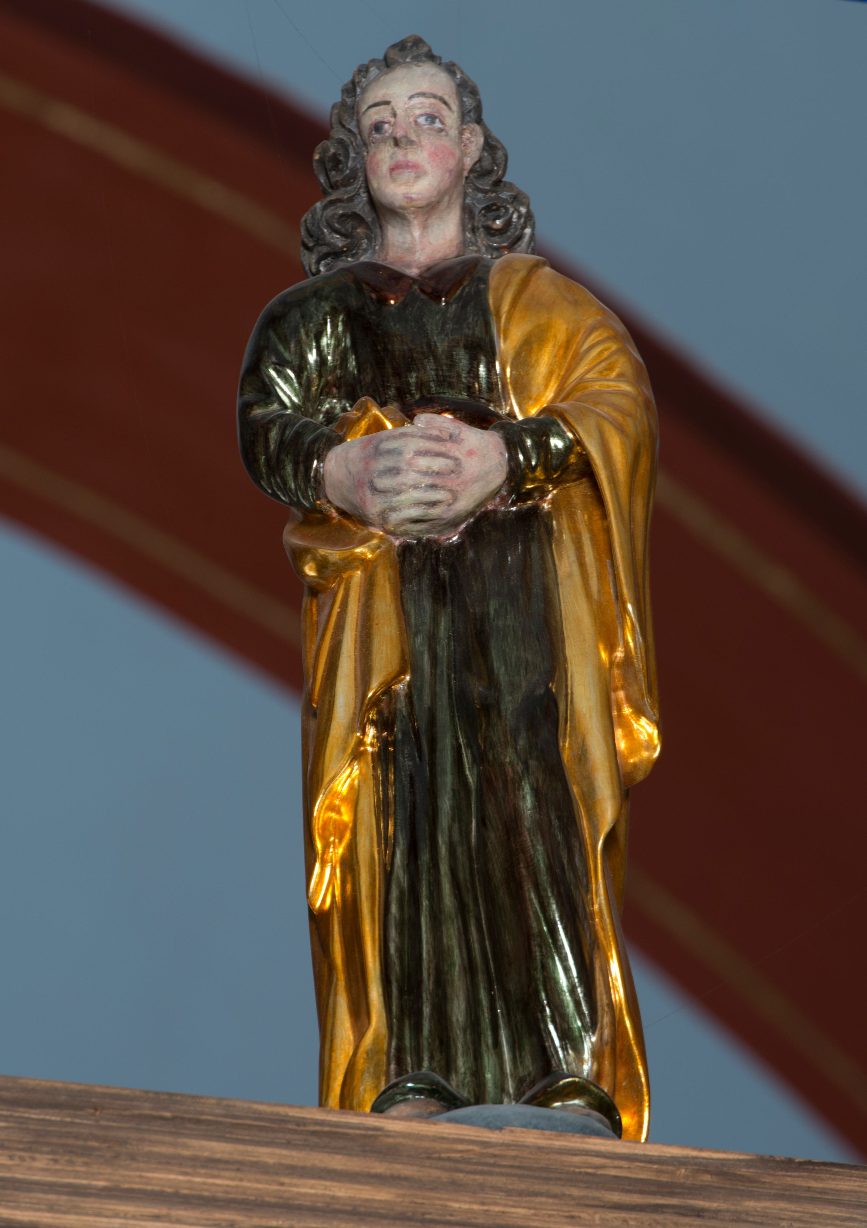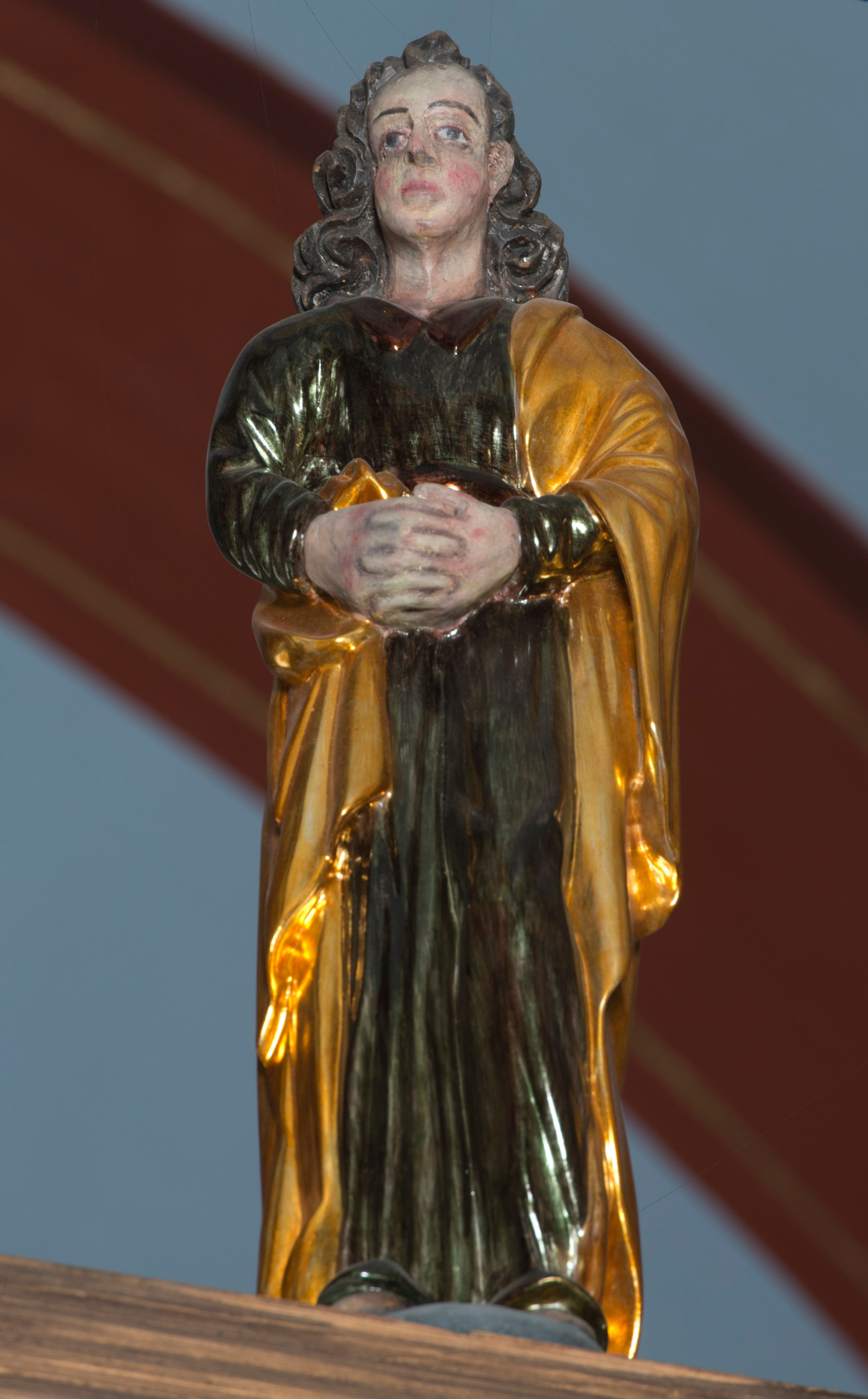 Święty Jan Ewangelista został zwrócony trzy czwarte w prawo w lekkim kontrapoście. Stojąc na niewielkim wzgórku, trzyma na wysokości brzucha splecione nieproporcjonalnie duże dłonie. Święty ma pociągłą twarz okoloną półdługimi, mocno kręconymi włosami, których pasma z lewej strony odsłaniają wydatną małżowinę uszną. Bardzo mocno zaakcentowano jego krtań. Apostoł ubrany jest w długą tunikę z charakterystycznym kołnierzykiem, malowaną laserunkiem na ciemnooliwkowo oraz złocony płaszcz narzucony na lewe ramię, którego połę zdaje się przyciskać do pasa prawą ręką. Spod tuniki widoczne są czubki stóp.