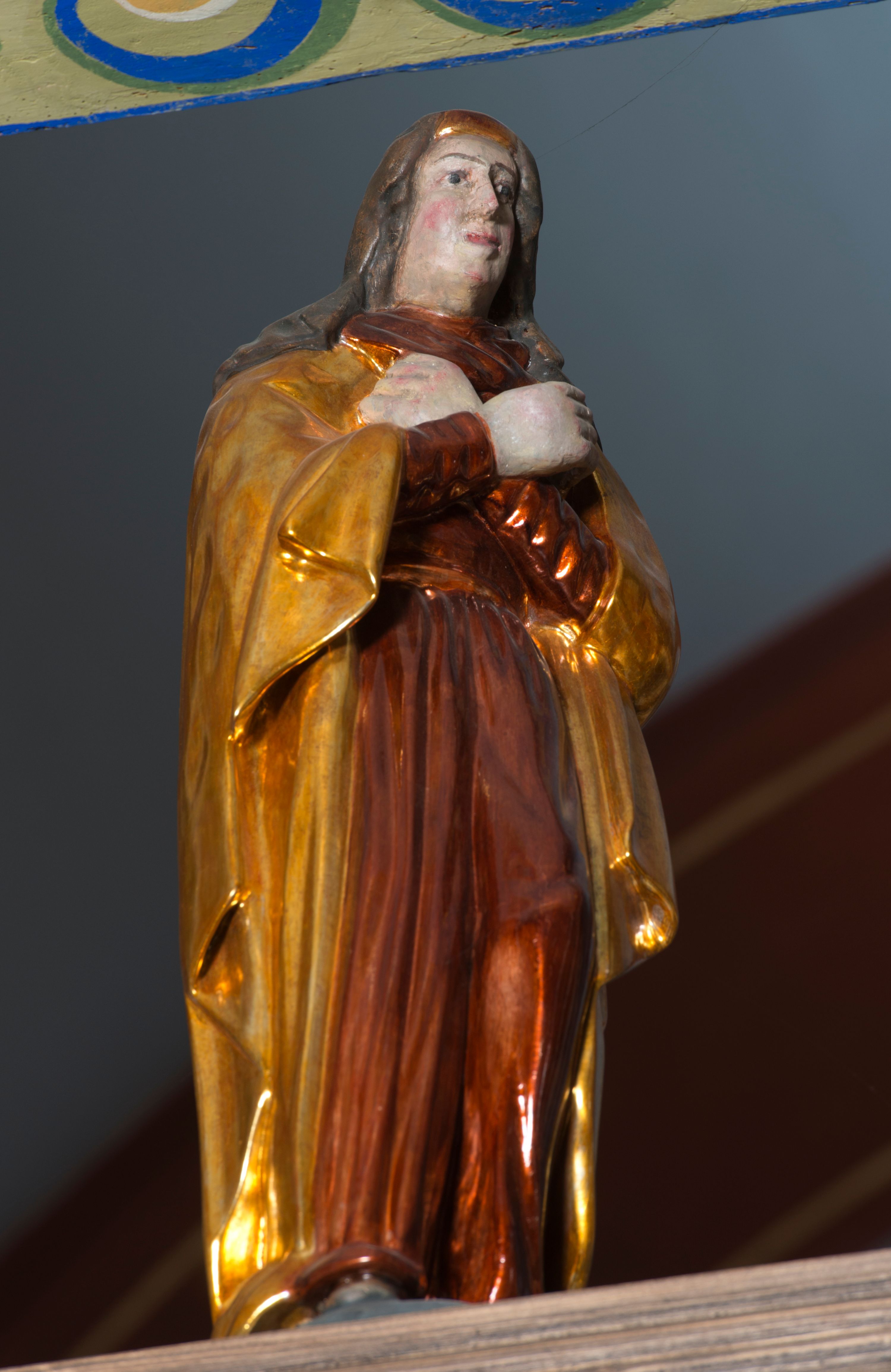 Stojąca na lekkim wzgórku Matka Boska Bolesna ukazana została w ujęciu trzy czwarte w lewo w nieznacznym kontrapoście. Zgięte w łokciach ręce o nieproporcjonalnie dużych dłoniach ma skrzyżowane na piersi. Maria ma podłużną twarz pozbawioną cech szczególnych. Jej głowę osłania złocona chusta opadająca na ramiona, spod której widoczne są pasma brązowych włosów. Ubrana jest w długą, ciemnoochrową suknię, malowaną laserunkiem, przepasaną w tali oraz płaszcz narzucony na ramiona. Spod sukni widać czubki stóp.