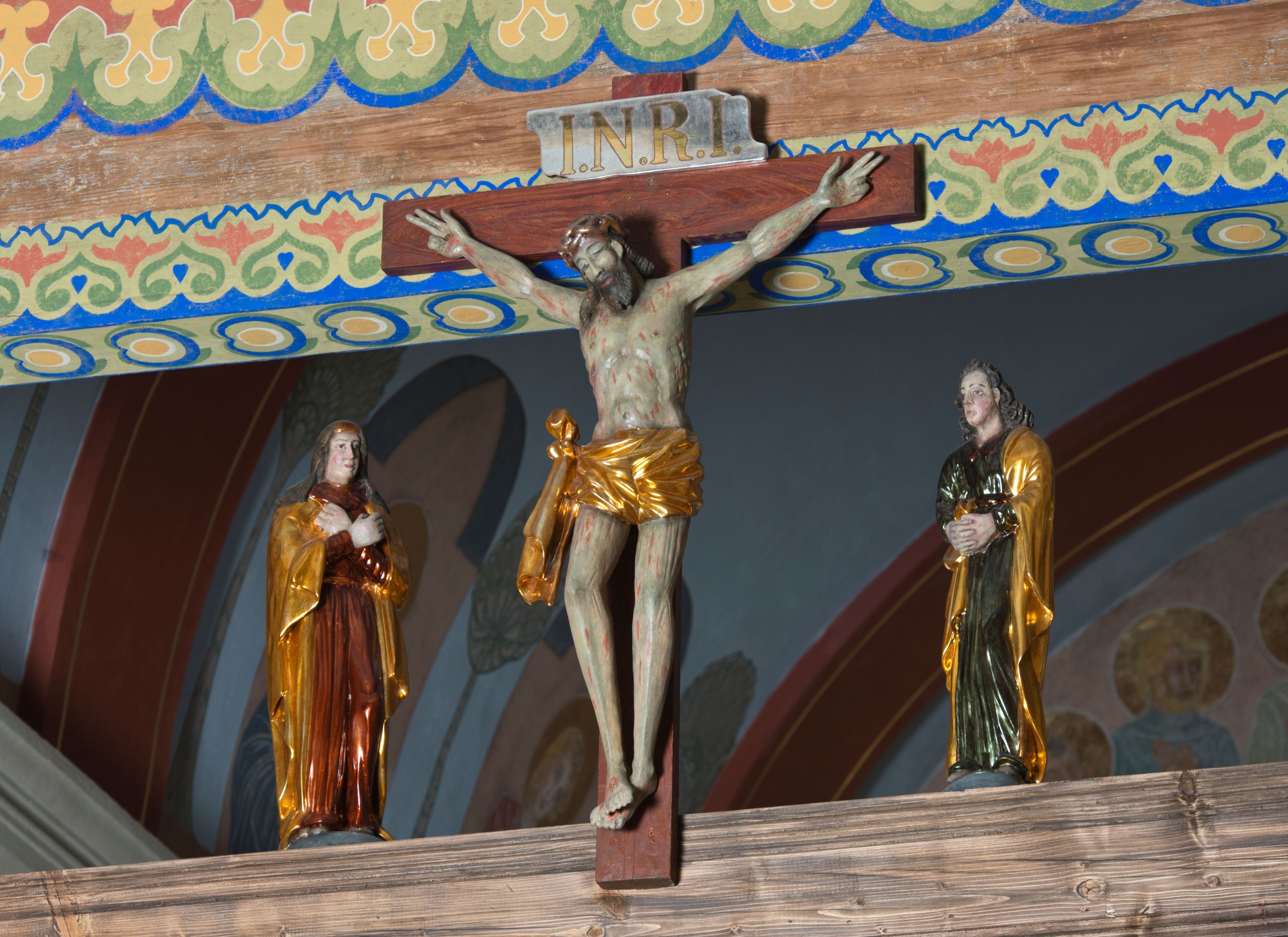 Grupę z belki tęczowej tworzy krucyfiks oraz pełnoplastycznie rzeźbione przedstawienia Matki Boskiej i św. Jana Ewangelisty. Arkada tęczowa najprawdopodobniej została zlikwidowana w czasie przebudowy wschodniej części kościoła w XIX wieku lub w okresie międzywojennym. Figury były przez długi czas eksponowane pod wieżą nad głównym wejściem do kościoła. W 2017 roku po odnalezieniu otworów w ścianach nawy zrekonstruowano belkę tęczową, umieszczając w niej znaleziony na strychu oryginalny fragment belki pierwotnej z łacińską inskrypcją. Konserwację grupy Ukrzyżowania i rekonstrukcję belki przeprowadziła Monika Domańska-Tomczyk.