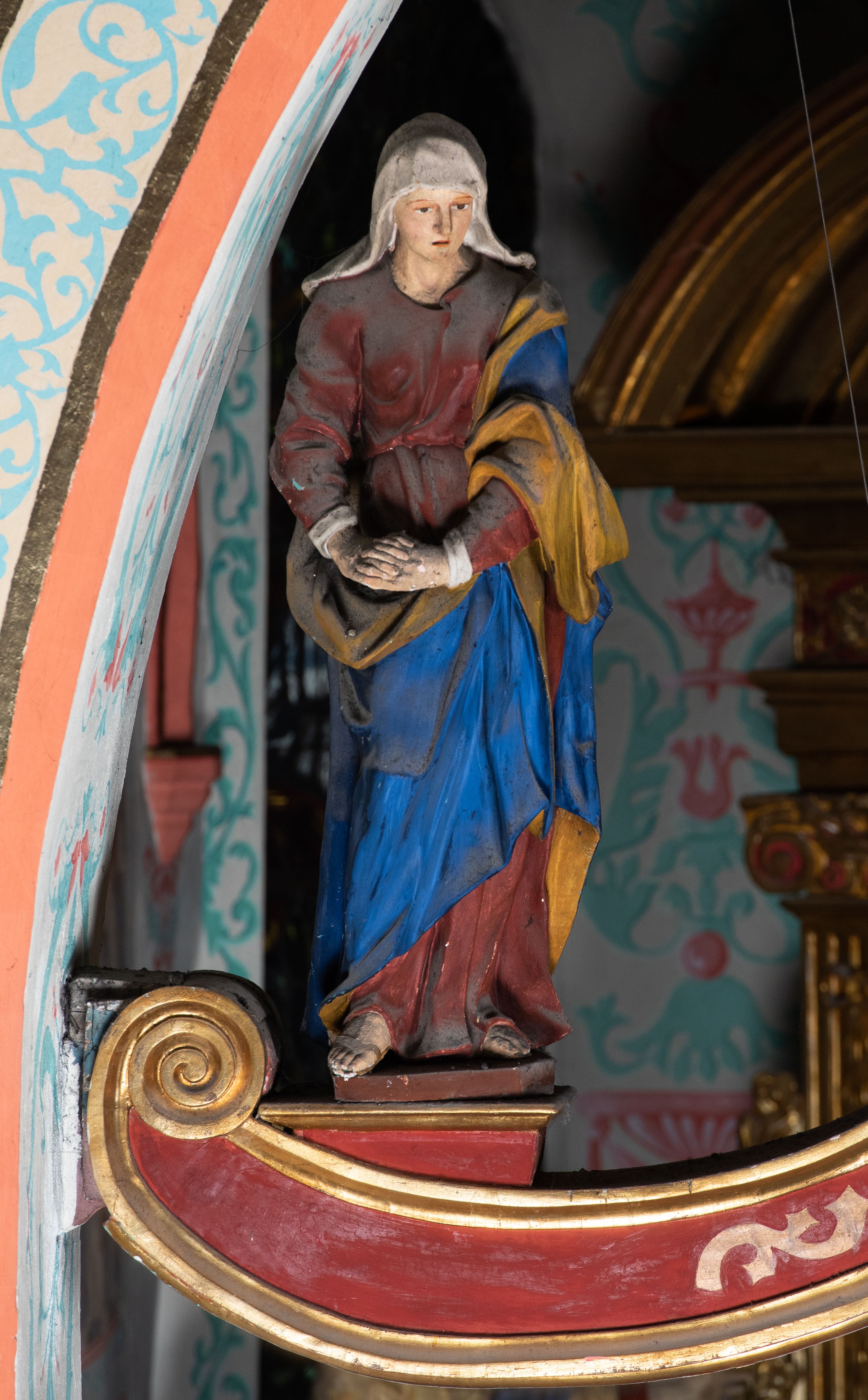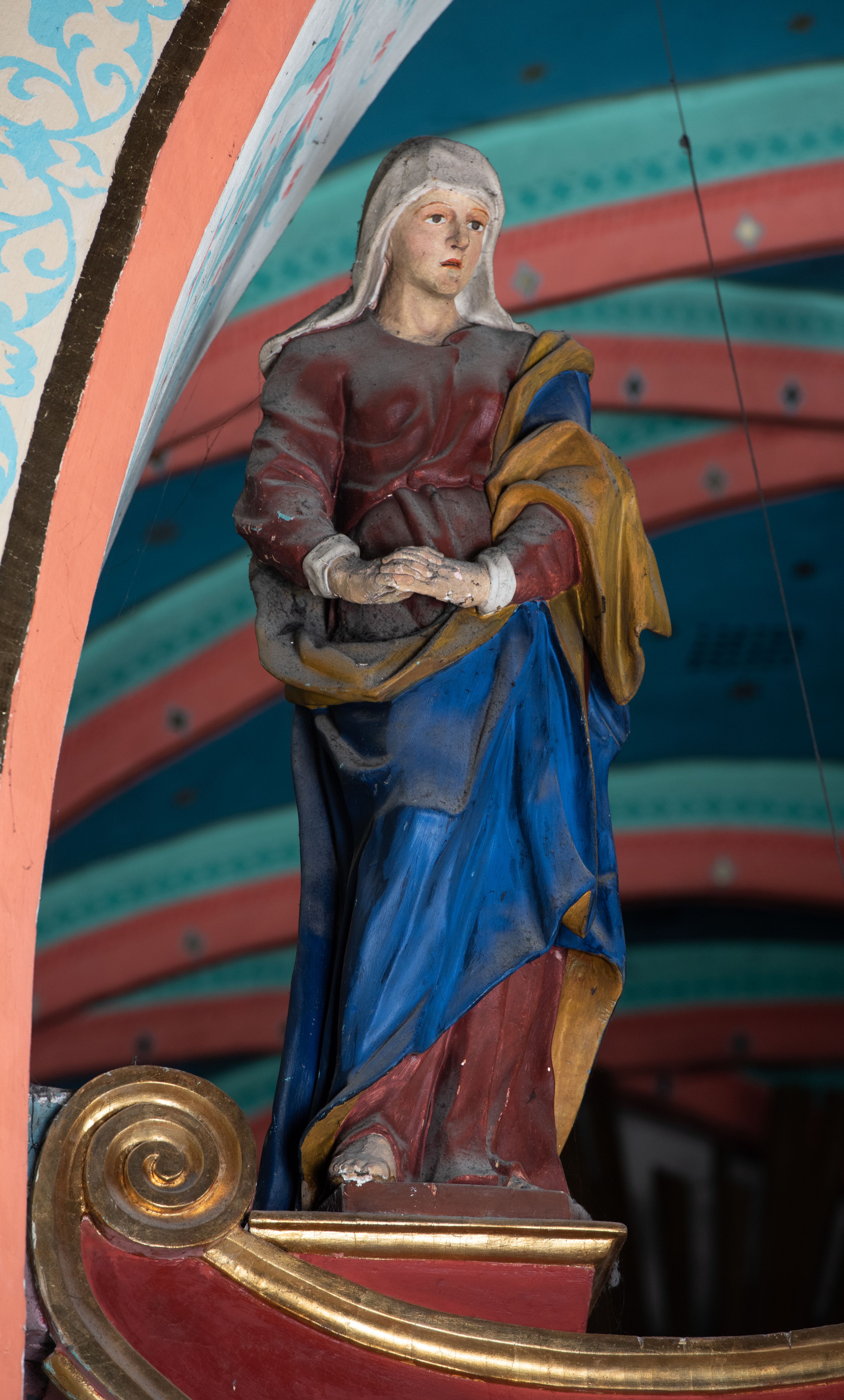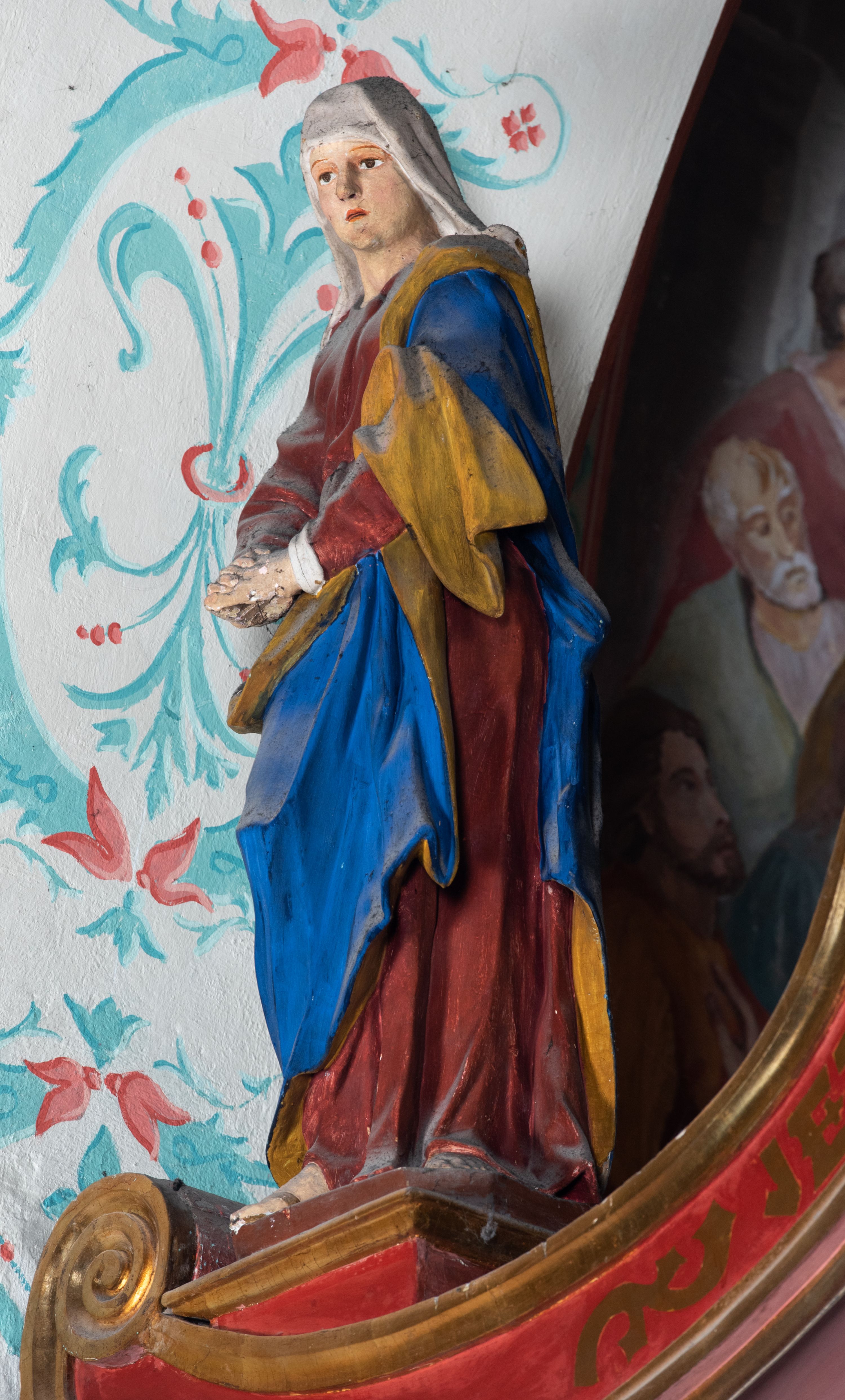Po lewej stronie krzyża figura Marii, ukazana frontalnie, w kontrapoście, pochylona, z dłońmi splecionymi z przodu. Twarz ma szczupłą, o małych oczach, prostym nosie i wąskich ustach. Ubrana jest w ciemnoczerwoną suknię, przepasaną w talii oraz niebieski płaszcz z jasnobrązową podszewką, zarzucony na lewe ramię i zawinięty wokół postaci.