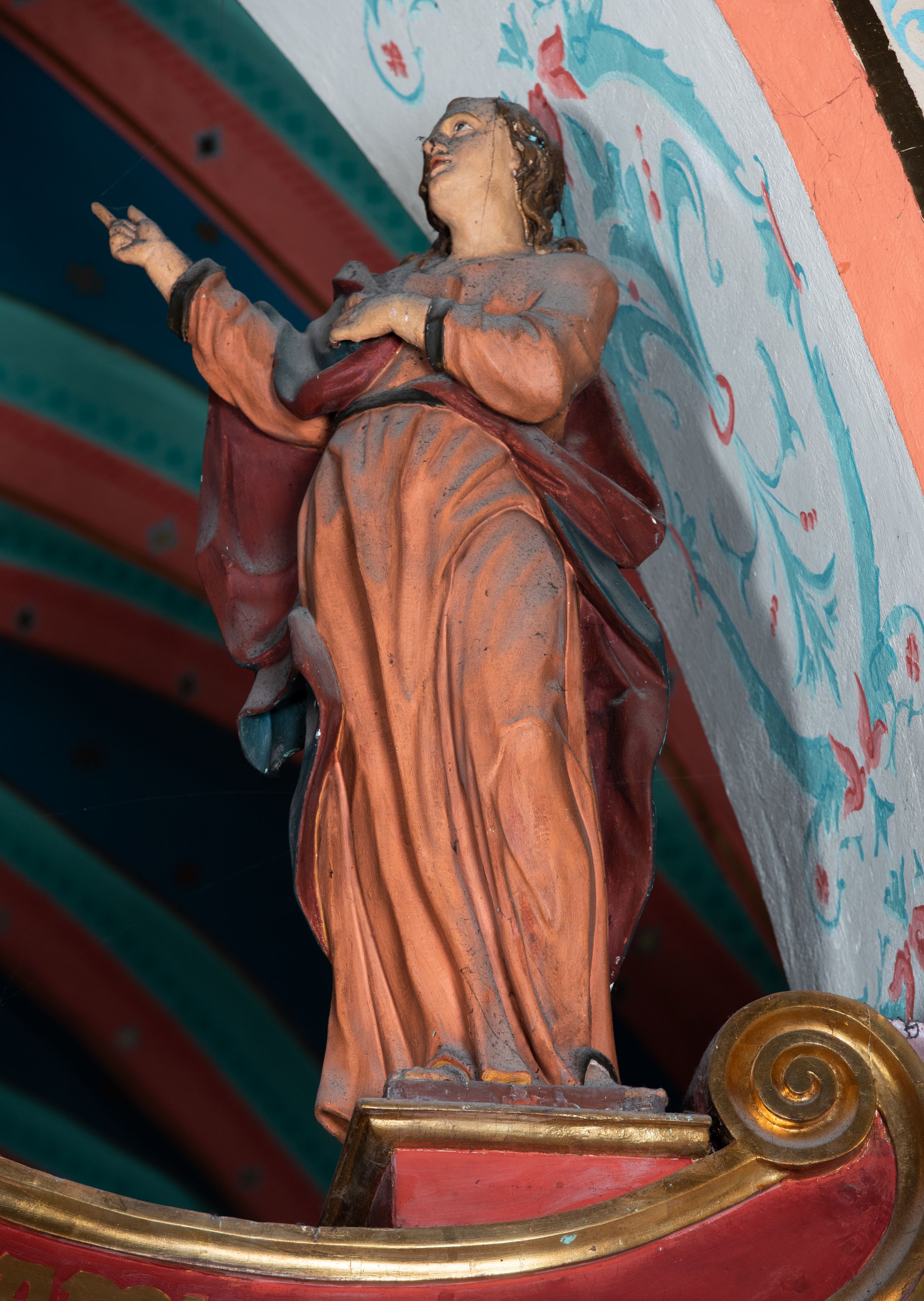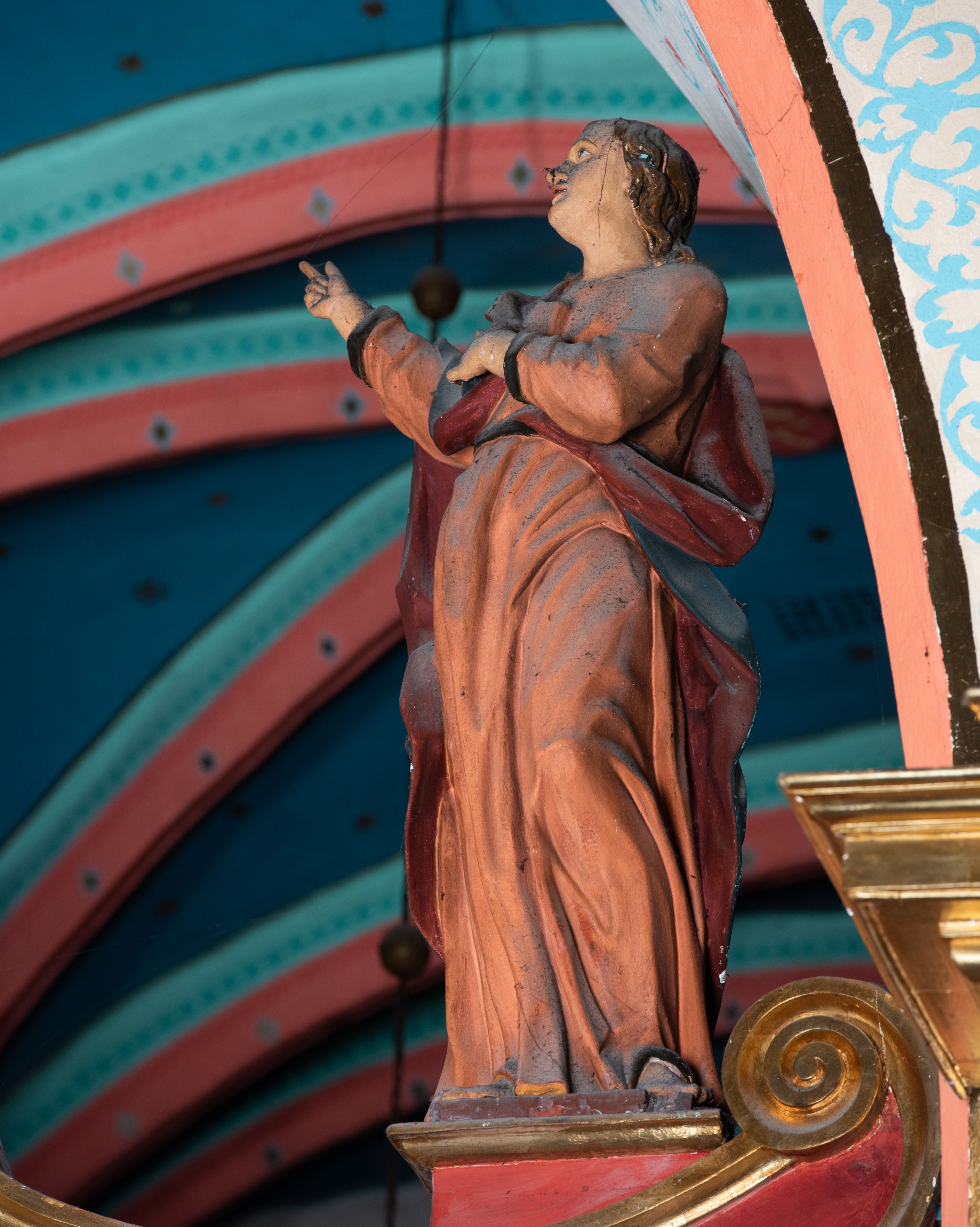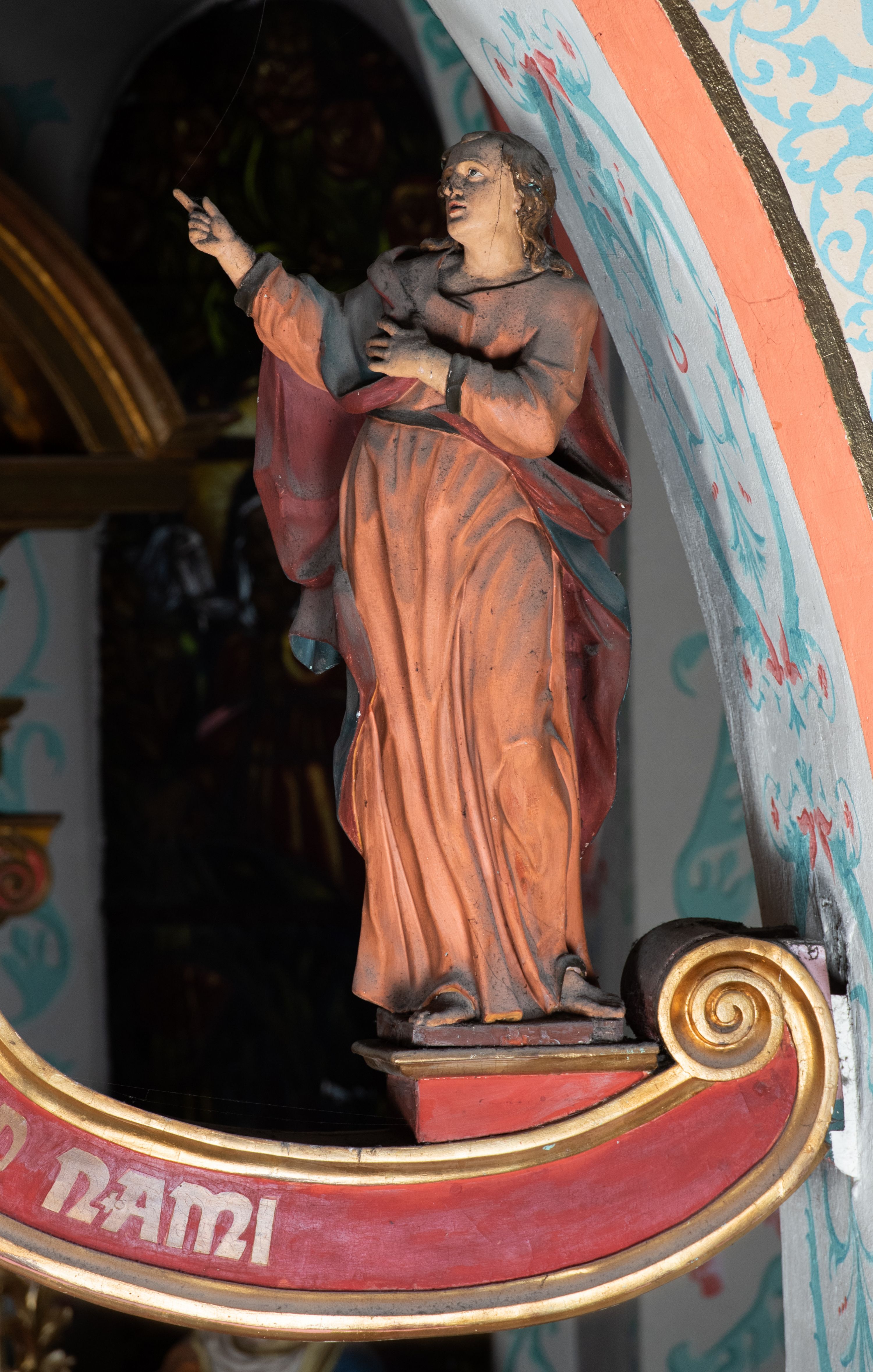 Po prawej stronie krzyża figura św. Jana, zwrócona w trzech czwartych w prawo, w kontrapoście, z uniesioną głową oraz rękami skierowanymi w prawo, z prawą w geście wskazującym. Twarz ma szczupłą, o oczach skierowanych w górę, prostym nosie i rozchylonych ustach, okoloną falowanymi włosami opadającymi na ramiona. Ubrany jest w jasnobrązową tunikę, przepasaną w talii oraz niebieski płaszcz z ciemnoczerwoną podszewką, zarzucony na prawe ramię i zawiązany na lewym boku. Polichromia ciał postaci naturalistyczna.