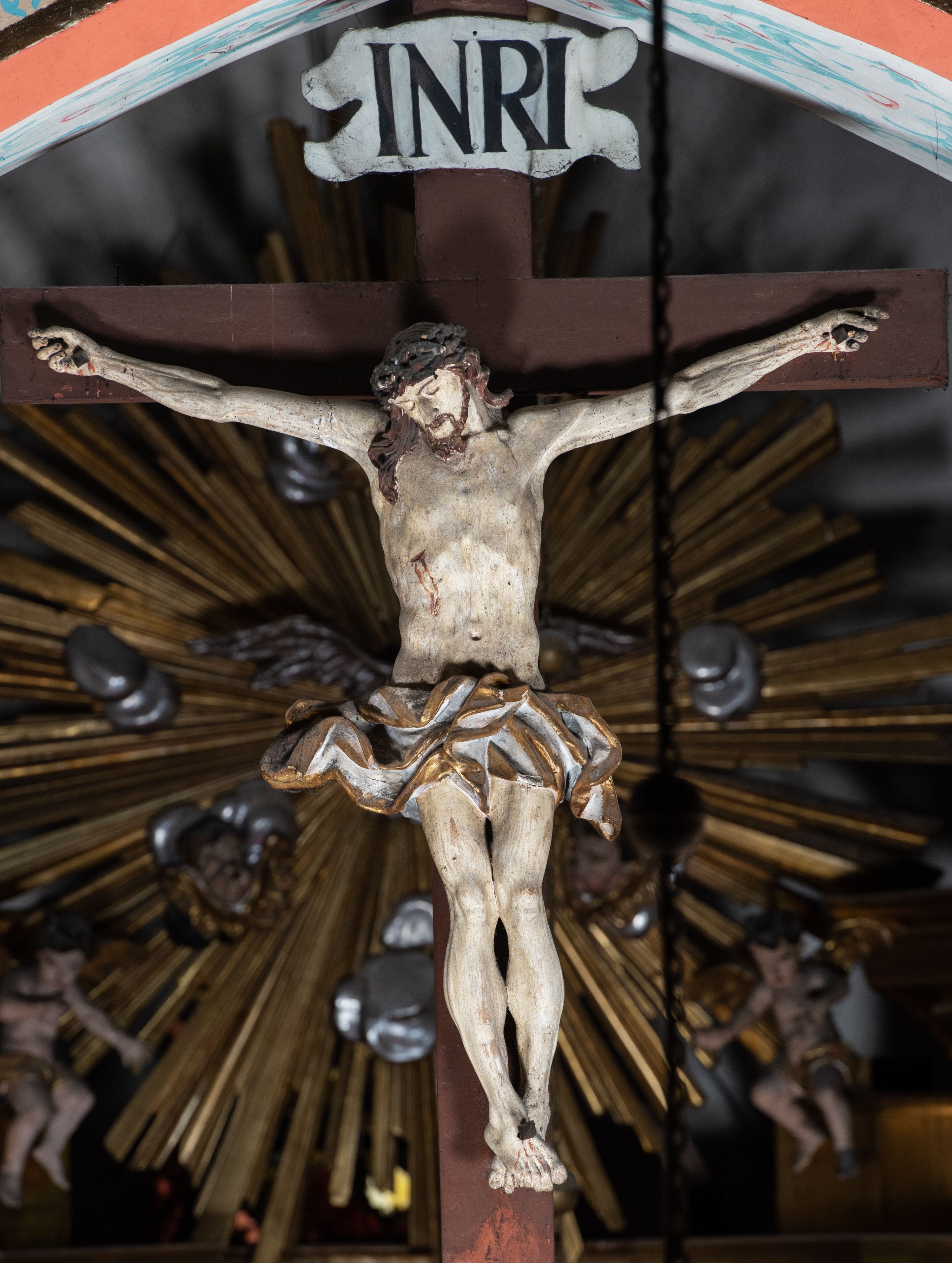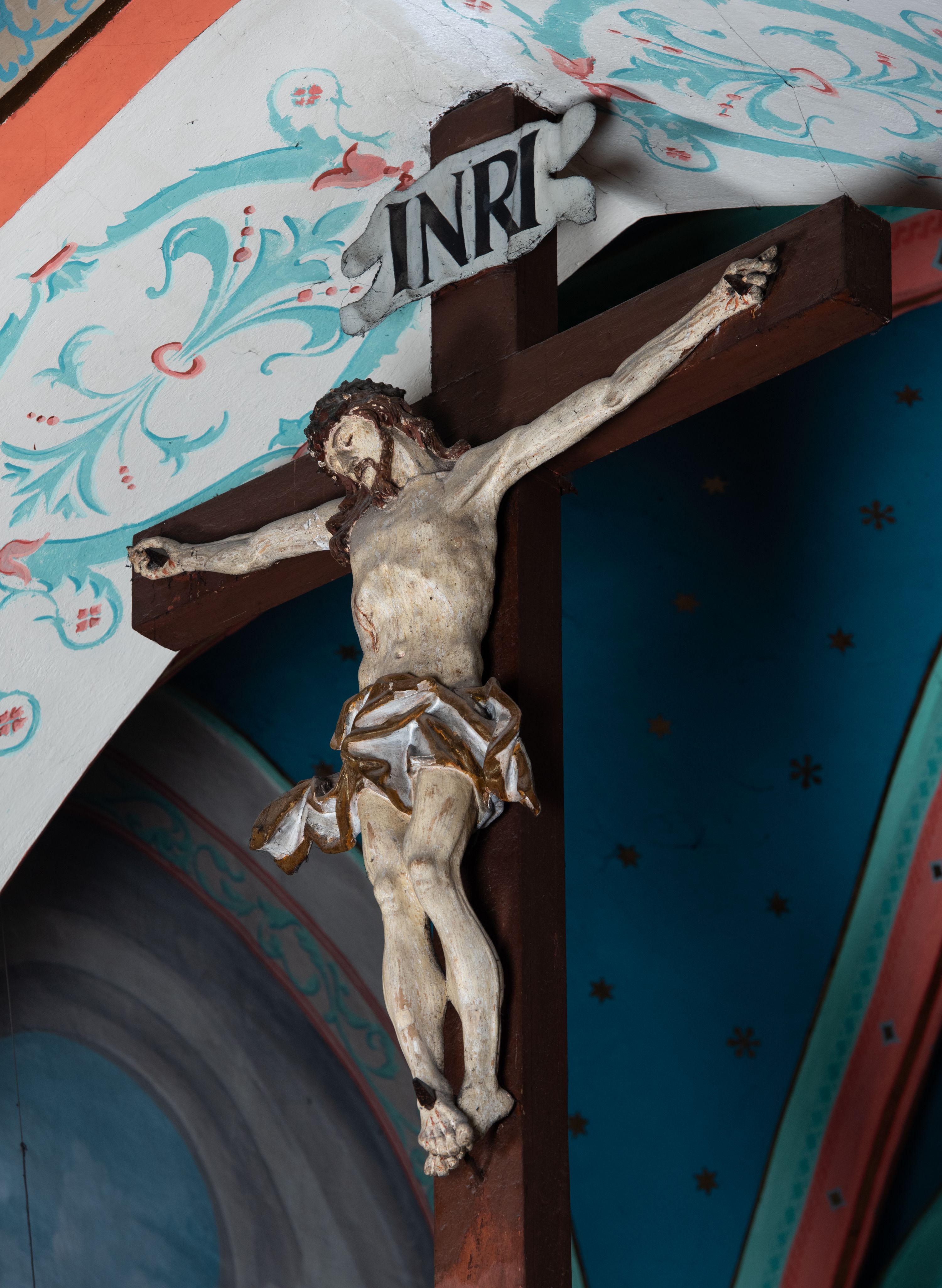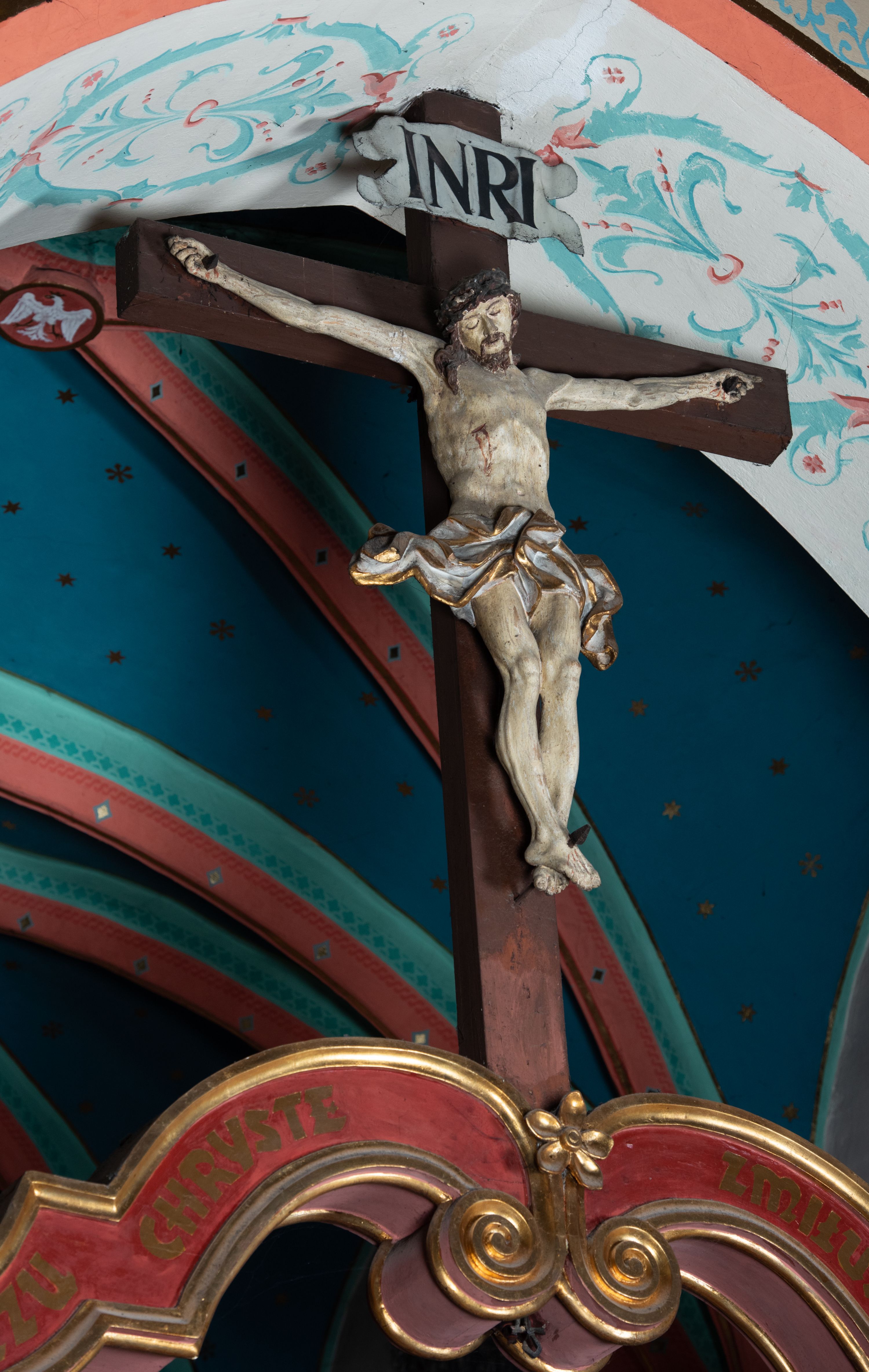 Drewniana belka o wklęsło-wypukłej formie utworzona z dwóch stykających się wolut. Na jej froncie napis: „JEZU CHRYSTE ZMIŁUJ SIĘ NAD NAMI”. W centrum krzyż z figurą umarłego Chrystusa przybitą trzema gwoździami. Ciało w lekkim zwisie, o szeroko rozłożonych ramionach, z głową opadającą na prawy bark oraz stopami skrzyżowanymi w układzie prawa na lewą. Twarz ma szczupłą, o zamkniętych oczach, garbatym nosie i wąskich ustach, okoloną krótką brodą oraz kręconymi, brązowymi włosami opadającymi na ramiona. Na głowie ma koronę cierniową. Ciało jest wychudzone, o podkreślonych mięśniach ramion i nóg oraz żebrach klatki piersiowej. Przez biodra przewiązane krótkie, ekspresyjnie drapowane perizonium, rozwiane po bokach. Pionowa belka krzyża zwieńczona tabliczką z napisem „INRI”.