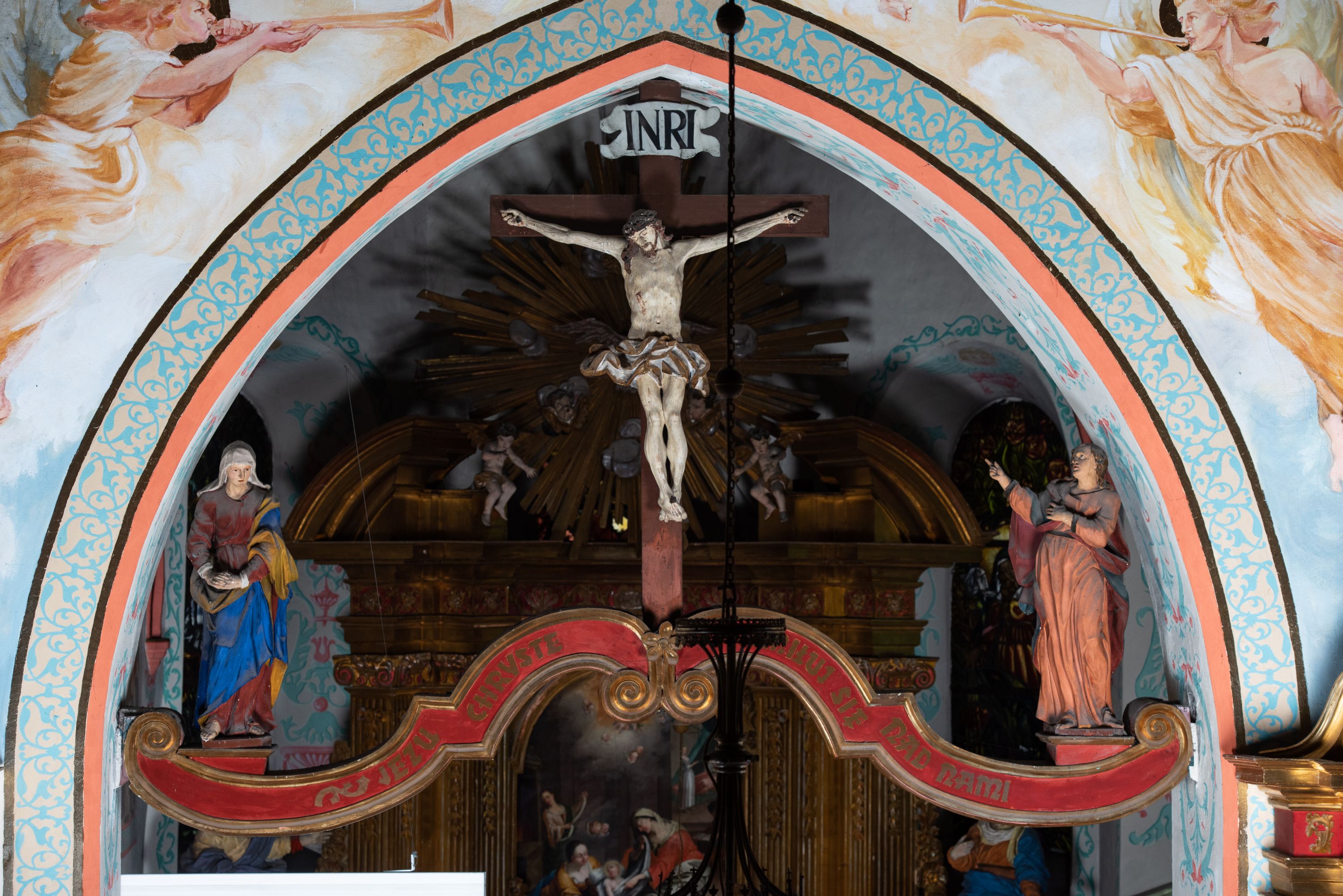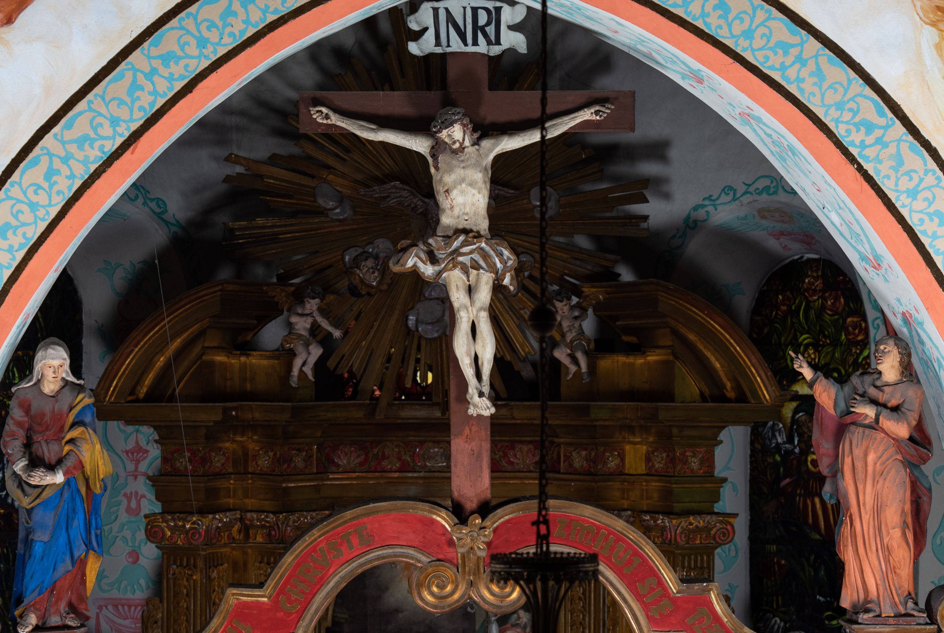 Przedstawienie Ukrzyżowania z Marią i św. Janem zostało zaczerpnięte ze sceny, która wydarzyła się podczas męczeńskiej śmierci Chrystusa na krzyżu, a którą opisuje Ewangelia św. Jana: „Kiedy więc Jezus ujrzał Matkę i stojącego obok Niej ucznia, którego miłował, rzekł do Matki: «Niewiasto, oto syn Twój». Następnie rzekł do ucznia: «Oto Matka twoja». I od tej godziny uczeń wziął Ją do siebie” (J 19, 26-27). Chwilę później Chrystus skonał i ten właśnie moment opłakiwania z postaciami Marii i św. Jana przedstawia grupa rzeźbiarska.