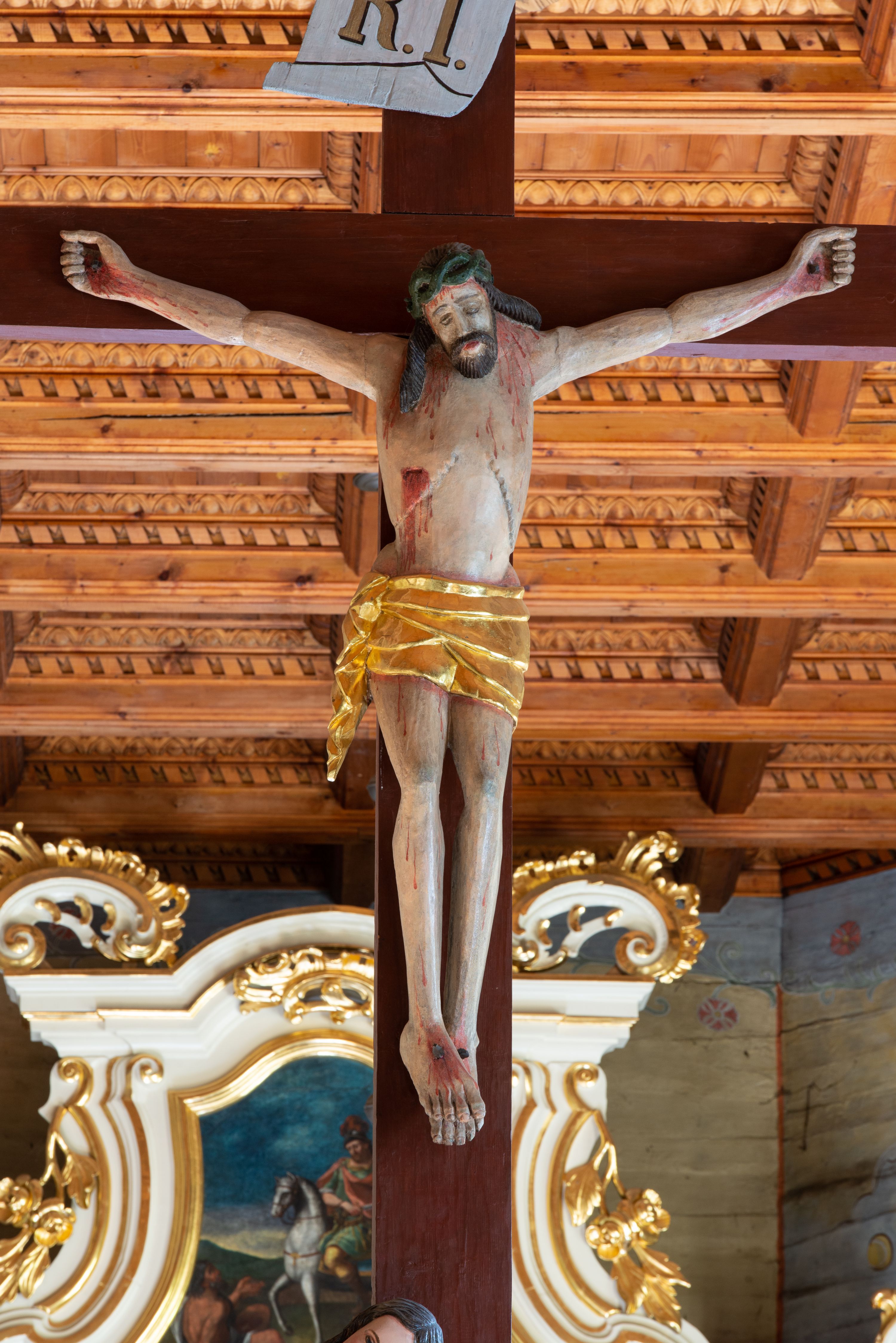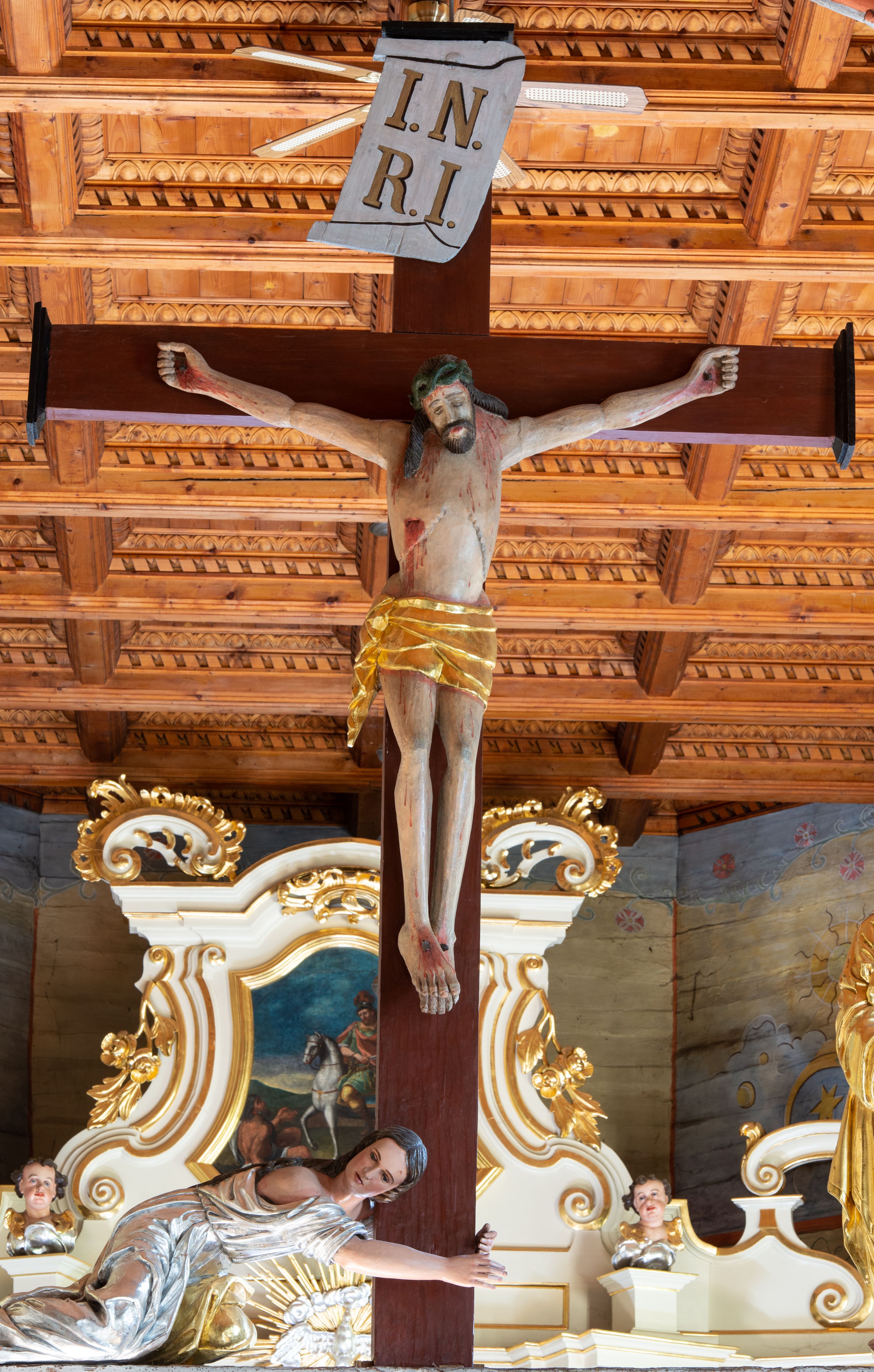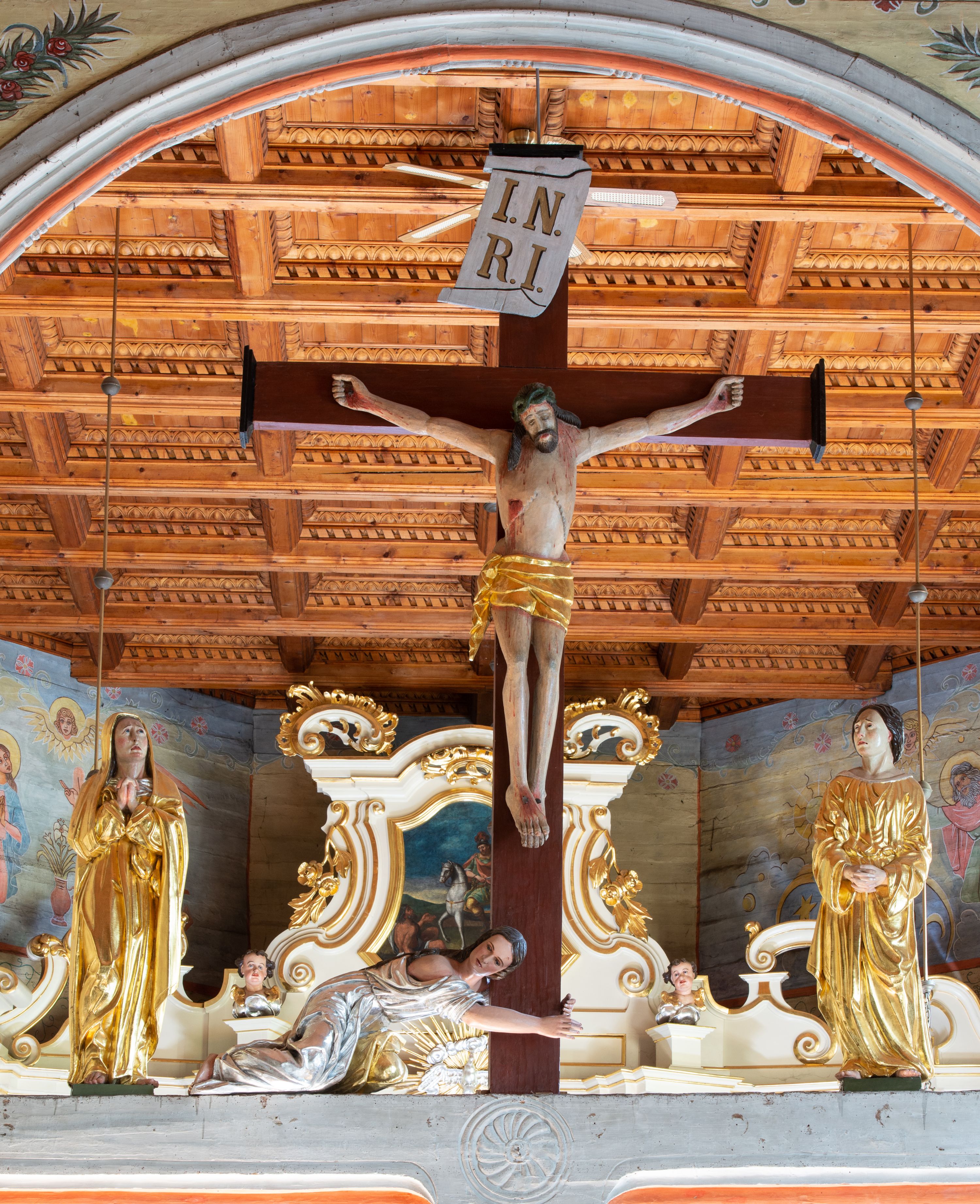Łuk tęczowy o półkolistym wykroju, na profilowanej belce zdobionej pośrodku ryzowaną rozetą ustawiona grupa Ukrzyżowania. W centrum krucyfiks, po prawej św. Jan Ewangelista, po lewej Matka Boska i św. Maria Magdalena obejmująca krzyż. Chrystus przybity do krzyża trzema gwoździami, sylwetka w delikatnym zwisie, z głową pochyloną delikatnie w dół, o sztywnym układzie sylwetki z zaznaczonymi śladami męki. Perizonium w formie tkaniny przewiązanej na prawym biodrze ze zwisem wzdłuż prawego uda. Twarz podłużna, okolona zarostem; włosy długie spływające na prawe ramię w silnie skręcone pukle, na głowie zielona korona cierniowa złożona z dwóch przeplatających się gałązek. Nad głową Chrystusa biały titulus z napisem: „I(ESUS) N(AZARENUS) R(EX) I(UDAEORUM)”. Krzyż prosty, gładki o ramionach zakończonych gzymsikami. Po lewej stronie krucyfiksu rzeźba św. Marii Magdaleny ukazana w pozycji klęczącej, pochylonej do przodu, obejmująca dłońmi krzyż. Święta jest ubrana w długą, srebrzoną suknię, odsłaniającą nagie ramiona, przewiązaną w talii. Twarz szeroka, delikatnie otwarte usta, małe oczy i długi nos. Głowę okalają długie, ciemne włosy, spływające na plecy. Za nią ustawiona jest rzeźba Matki Boskiej w delikatnym kontrapoście, z prawą nogą ugiętą w kolanie, ze splecionymi na wysokości piersi rękami. Maria jest ubrana w długą, złoconą suknię oraz złocony płaszcz założony na głowę i spływający wzdłuż sylwetki. Twarz szeroka, z wyraźnie zaznaczonym podbródkiem, wzrok skierowany na krucyfiks, zmarszczone brwi. Po prawej stronie rzeźba św. Jana Ewangelisty, ukazanego w postawie stojącej, zwróconego w trzech czwartych w prawo, z rękami splecionymi na wysokości pasa. Twarz owalna, małe usta, długi i wąski nos, wzrok skierowany ku górze, zmarszczone brwi. Włosy ciemne, bujne, spływające na plecy. Święty ubrany jest w długą, złoconą suknię z długimi rękawami. Rzeźby ustawione są na niskich, zielonych cokolikach. Polichromia w odsłoniętych partiach ciała naturalistyczna, detale złocone i srebrzone.
