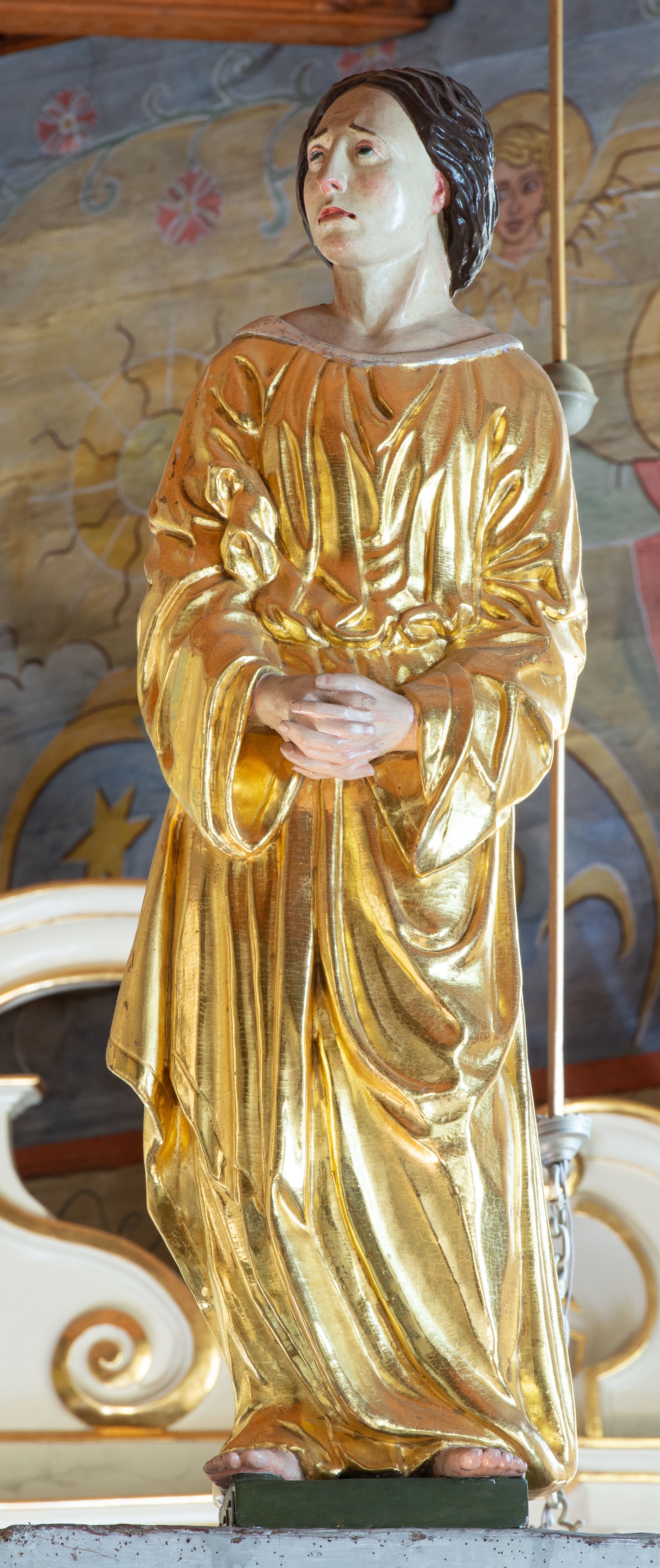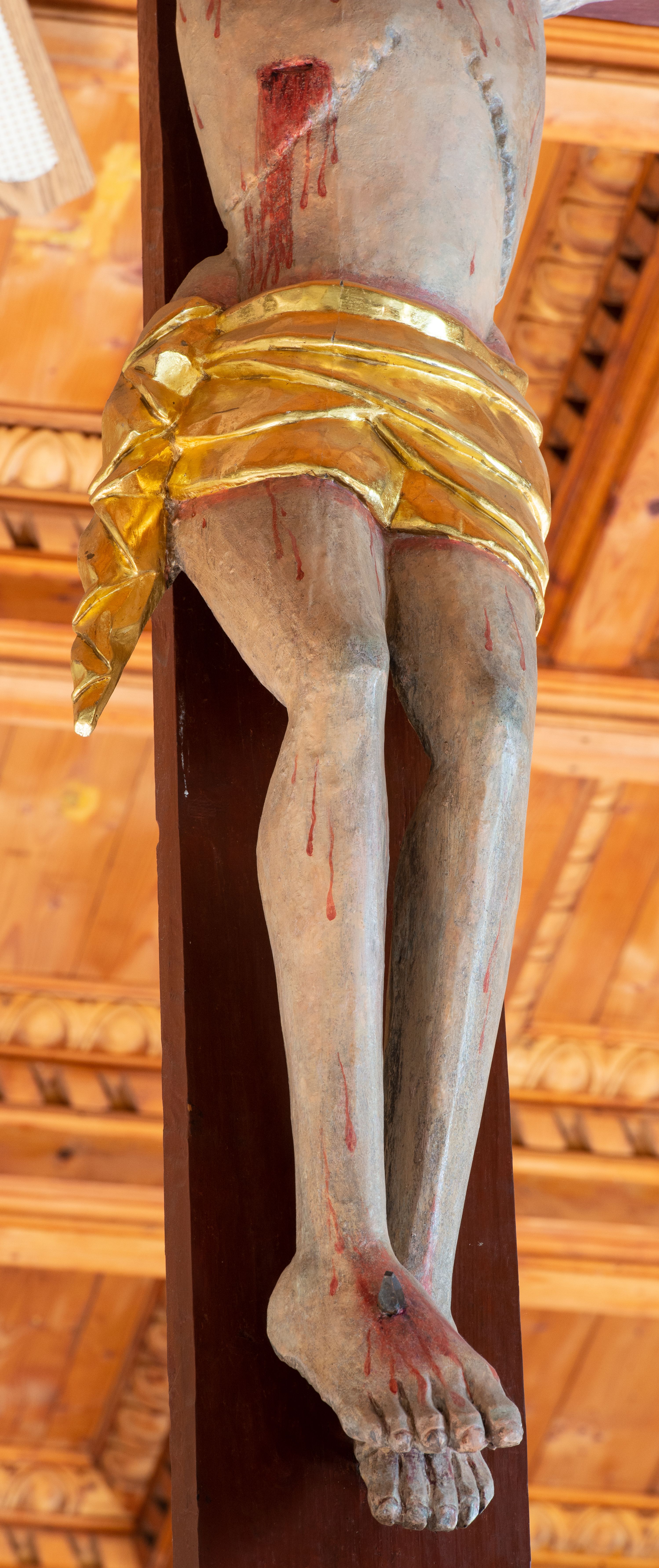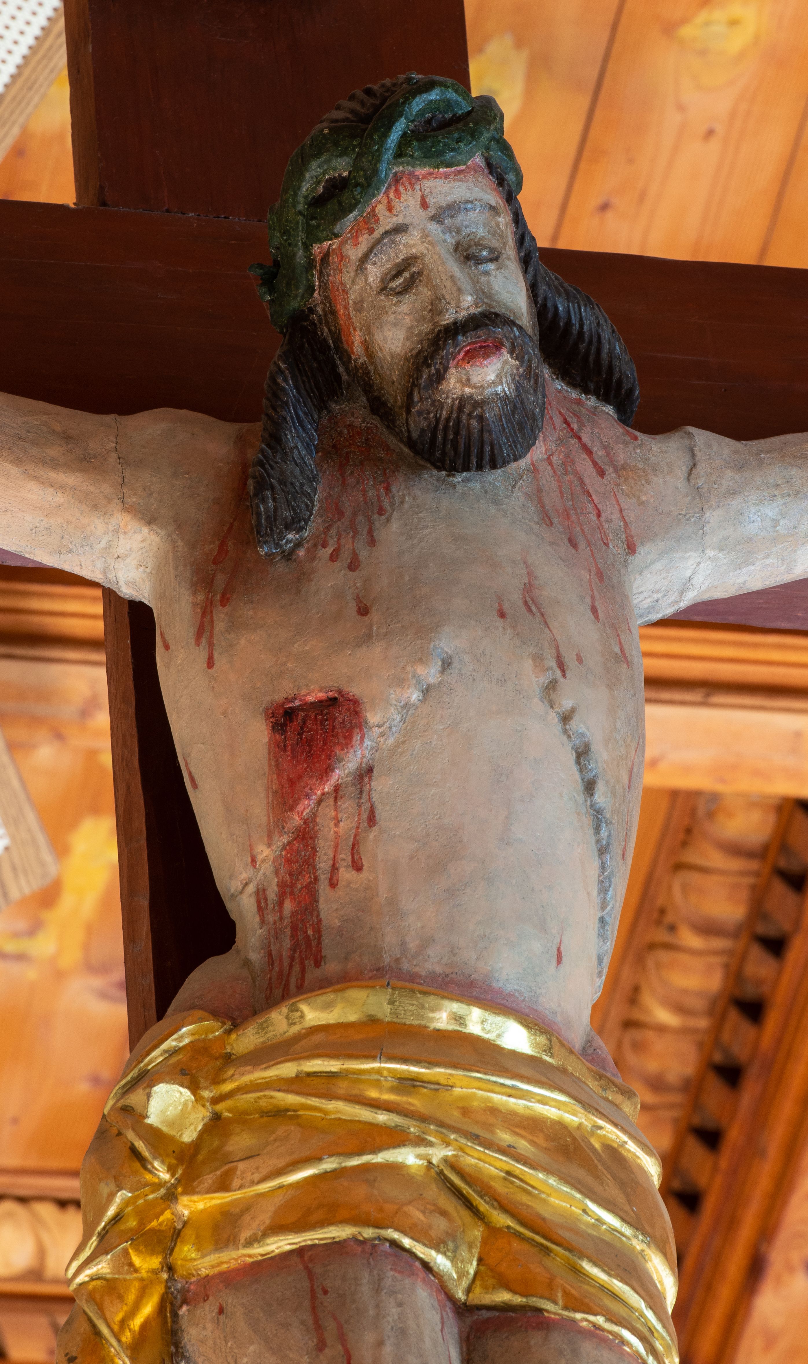 Łuk tęczowy o półkolistym wykroju, na profilowanej belce zdobionej pośrodku ryzowaną rozetą ustawiona grupa Ukrzyżowania. W centrum krucyfiks, po prawej św. Jan Ewangelista, po lewej Matka Boska i św. Maria Magdalena obejmująca krzyż. Chrystus przybity do krzyża trzema gwoździami, sylwetka w delikatnym zwisie, z głową pochyloną delikatnie w dół, o sztywnym układzie sylwetki z zaznaczonymi śladami męki. Perizonium w formie tkaniny przewiązanej na prawym biodrze ze zwisem wzdłuż prawego uda. Twarz podłużna, okolona zarostem; włosy długie spływające na prawe ramię w silnie skręcone pukle, na głowie zielona korona cierniowa złożona z dwóch przeplatających się gałązek. Nad głową Chrystusa biały titulus z napisem: „I(ESUS) N(AZARENUS) R(EX) I(UDAEORUM)”. Krzyż prosty, gładki o ramionach zakończonych gzymsikami. Po lewej stronie krucyfiksu rzeźba św. Marii Magdaleny ukazana w pozycji klęczącej, pochylonej do przodu, obejmująca dłońmi krzyż. Święta jest ubrana w długą, srebrzoną suknię, odsłaniającą nagie ramiona, przewiązaną w talii. Twarz szeroka, delikatnie otwarte usta, małe oczy i długi nos. Głowę okalają długie, ciemne włosy, spływające na plecy. Za nią ustawiona jest rzeźba Matki Boskiej w delikatnym kontrapoście, z prawą nogą ugiętą w kolanie, ze splecionymi na wysokości piersi rękami. Maria jest ubrana w długą, złoconą suknię oraz złocony płaszcz założony na głowę i spływający wzdłuż sylwetki. Twarz szeroka, z wyraźnie zaznaczonym podbródkiem, wzrok skierowany na krucyfiks, zmarszczone brwi. Po prawej stronie rzeźba św. Jana Ewangelisty, ukazanego w postawie stojącej, zwróconego w trzech czwartych w prawo, z rękami splecionymi na wysokości pasa. Twarz owalna, małe usta, długi i wąski nos, wzrok skierowany ku górze, zmarszczone brwi. Włosy ciemne, bujne, spływające na plecy. Święty ubrany jest w długą, złoconą suknię z długimi rękawami. Rzeźby ustawione są na niskich, zielonych cokolikach. Polichromia w odsłoniętych partiach ciała naturalistyczna, detale złocone i srebrzone.