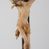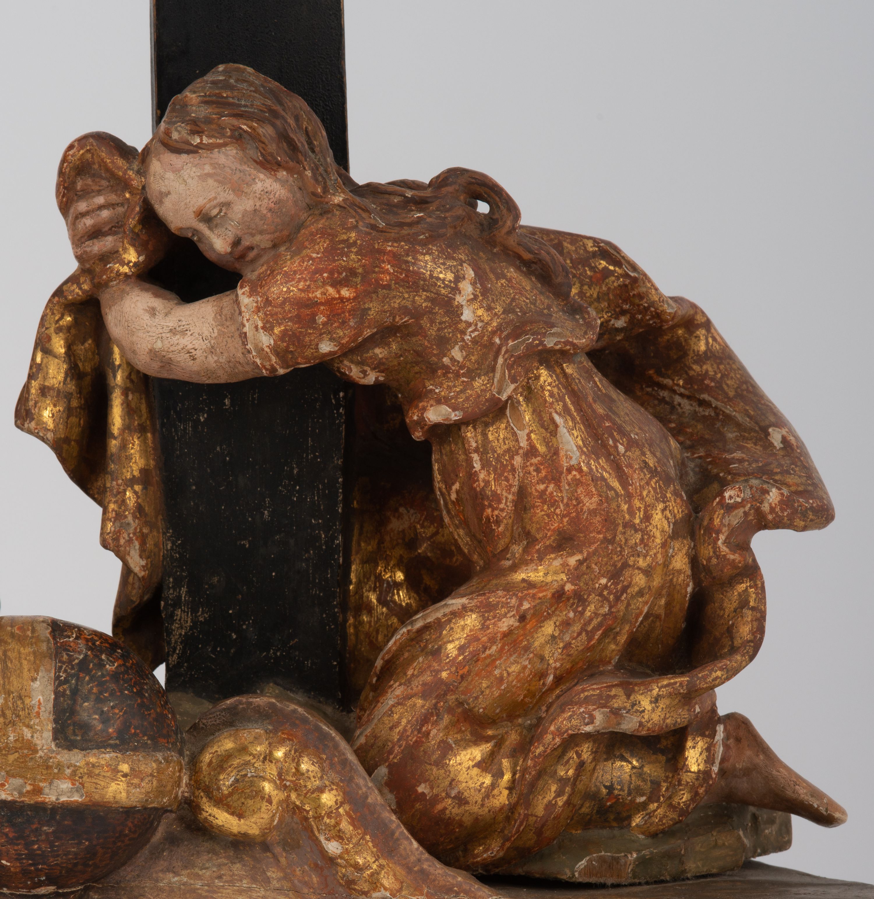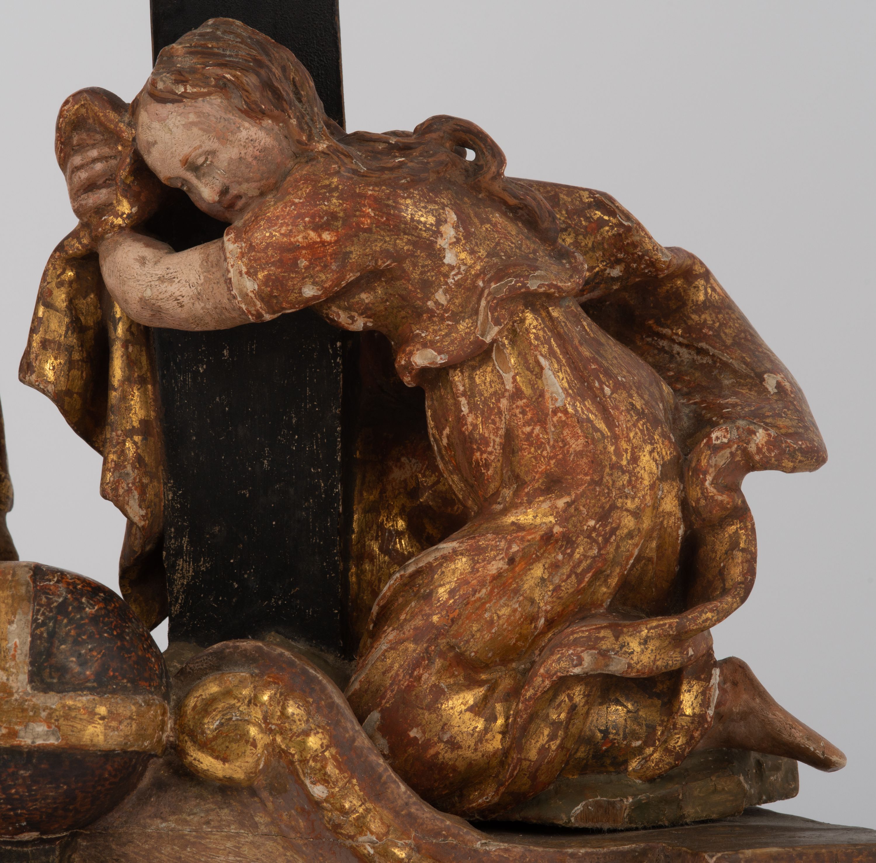 Rzeźbiarska grupa Ukrzyżowania z Matką Boską, św. Janem Ewangelistą i św. Marią Magdaleną ustawiona na cokole, wspartym na dwóch wolutowych nóżkach i trzeciej w formie liścia. Frontalna ścianka cokołu flankowana pilastrami i zamknięta gzymsem utworzonym z dwóch wolut, spiętych pośrodku kulą, dekorowanym perełkowaniem. Jego pole zdobione jest esownicami, palmami oraz niewielką rzeźbą węża gryzącego jabłko po lewej i czaszką po prawej stronie cokołu. Na cokole ustawiona grupa rzeźbiarska: nieco z prawej strony krucyfiks i św. Maria Magdalena, po lewej św. Jan Ewangelista i Matka Boska. Chrystus przybity do krzyża trzema gwoździami. Figura w dużym zwisie o układzie rąk bliskim literze „V”, sylwetka esowato wygięta, stopy ułożone w układzie prawa na lewą, głowa opuszczona na prawe ramię. Twarz okolona zarostem, włosy długie, spływające na prawe ramię, na głowie korona cierniowa oraz krzyżowy nimb promienisty, zachowany fragmentarycznie. Ciało wychudzone o plastycznie kształtowanej anatomii z podkreśloną muskulaturą i zaznaczonymi śladami męki. Perizonium w formie tkaniny przewiązanej sznurem, z odsłoniętym prawym biodrem oraz zwisem z tyłu. Krzyż gładki, pomalowany na czarno. Poniżej figura św. Marii Magdaleny ukazana w pozycji klęczącej, rękami obejmująca krzyż, ustawiona na niskim cokole. Święta widoczna z lewego profilu. Twarz szeroka, usta małe, oczy zamknięte, czoło wysokie, długie włosy opadają na plecy. Święta ubrana w długą suknię z krótkimi rękawami oraz obszerny płaszcz okrywający ją z prawego boku, którego jedną połę trzyma w dłoniach. Po lewej stronie kompozycji św. Jan Ewangelista podtrzymujący rękami mdlejącą Matkę Boską. Święty zwrócony delikatnie w lewo, z głową skierowaną w stronę krzyża. Twarz szeroka, nos długi i szeroki, oczy skierowane ku górze, usta wąskie, długie włosy opadają na plecy. Święty ubrany w długą suknię z długimi rękawami oraz płaszcz rozwiany za jego plecami. Poniżej Matka Boska, która opada bezwładnie, prawą rękę trzyma na piersi, lewą opuszcza w dół. Twarz szeroka z zamkniętymi oczami i małymi ustami. Ubrana w długą suknię z długimi rękawami, welon na głowie oraz płaszcz otulający nogi. Polichromia naturalistyczna w odsłoniętych partiach ciała, szaty i ornamenty na cokole złocone.