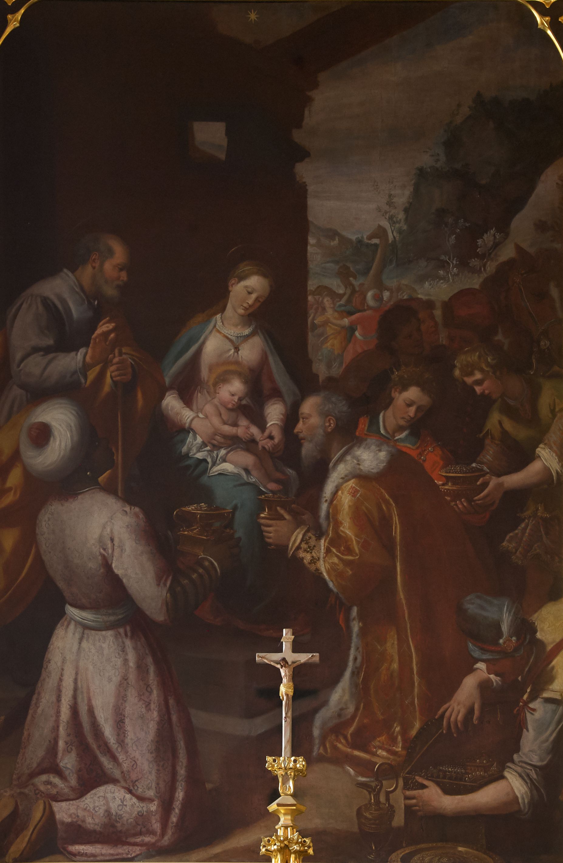 W środku kompozycji Maria w jasnej sukni, z niebieskim płaszczem narzuconym na ramiona i odkrytą głową siedzi, trzymając nagie Dzieciątko na kolanach. Obok niej po lewej stronie stoi św. Józef zwrócony profilem, wsparty na lasce. Na pierwszym planie Trzej Królowie: z lewej Murzyn w turbanie odwrócony tyłem klęczy, podając szkatułkę, pośrodku, zwrócony profilem klęczy brodaty monarcha w aksamitnym złotym płaszczu i podaje Dzieciątku naczynie. Trzeci król w czapce z piórem ukazuje się w prawym dolnym narożniku, pochylony otwiera szkatułę z darami. Na drugim planie po prawej grupa dwóch giermków z naczyniem. W tle po lewej architektura ruin, po prawej daleki „romantyczny” krajobraz. Koloryt soczysty, odpowiadający w tonacji wieczornej porze sceny.