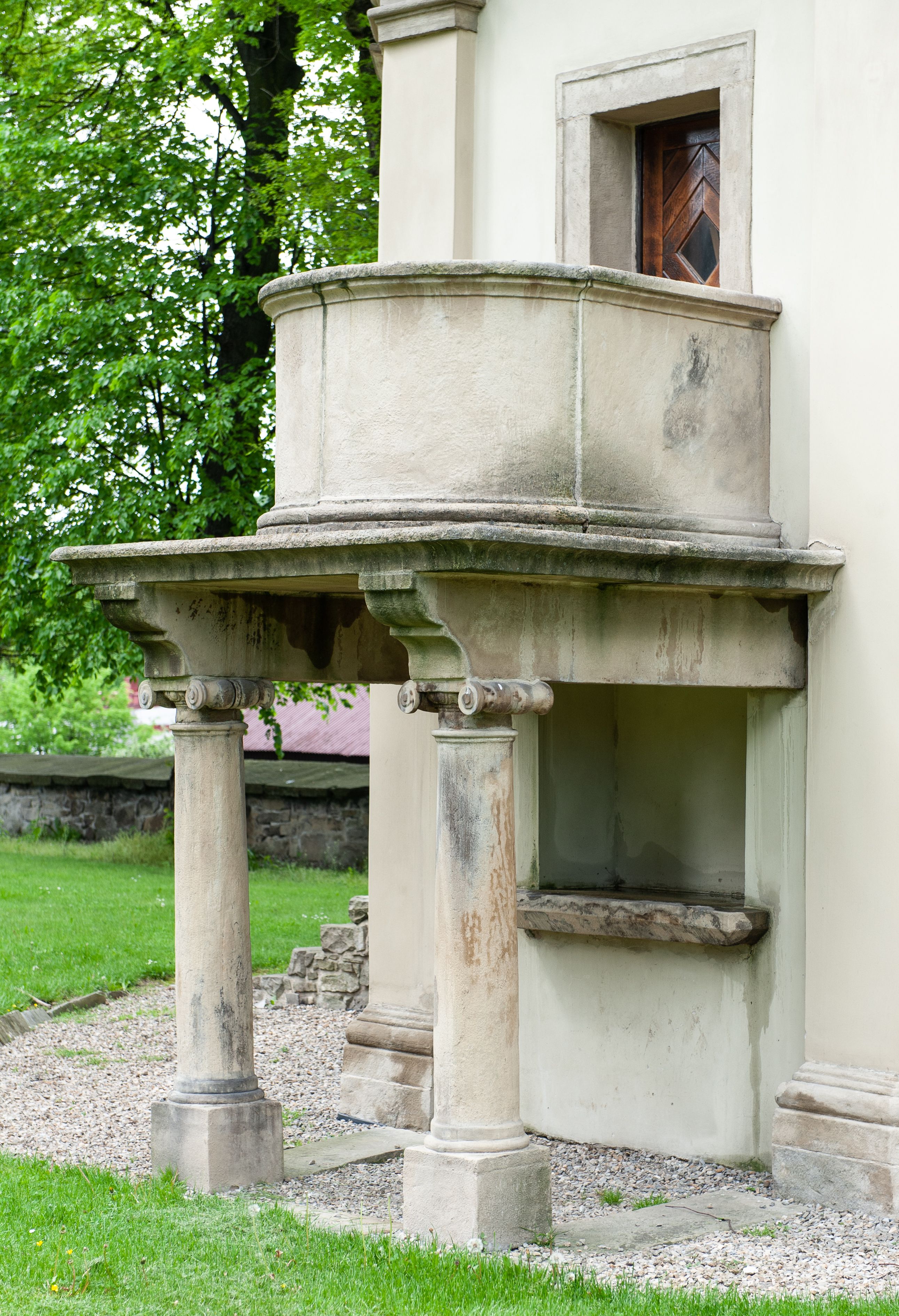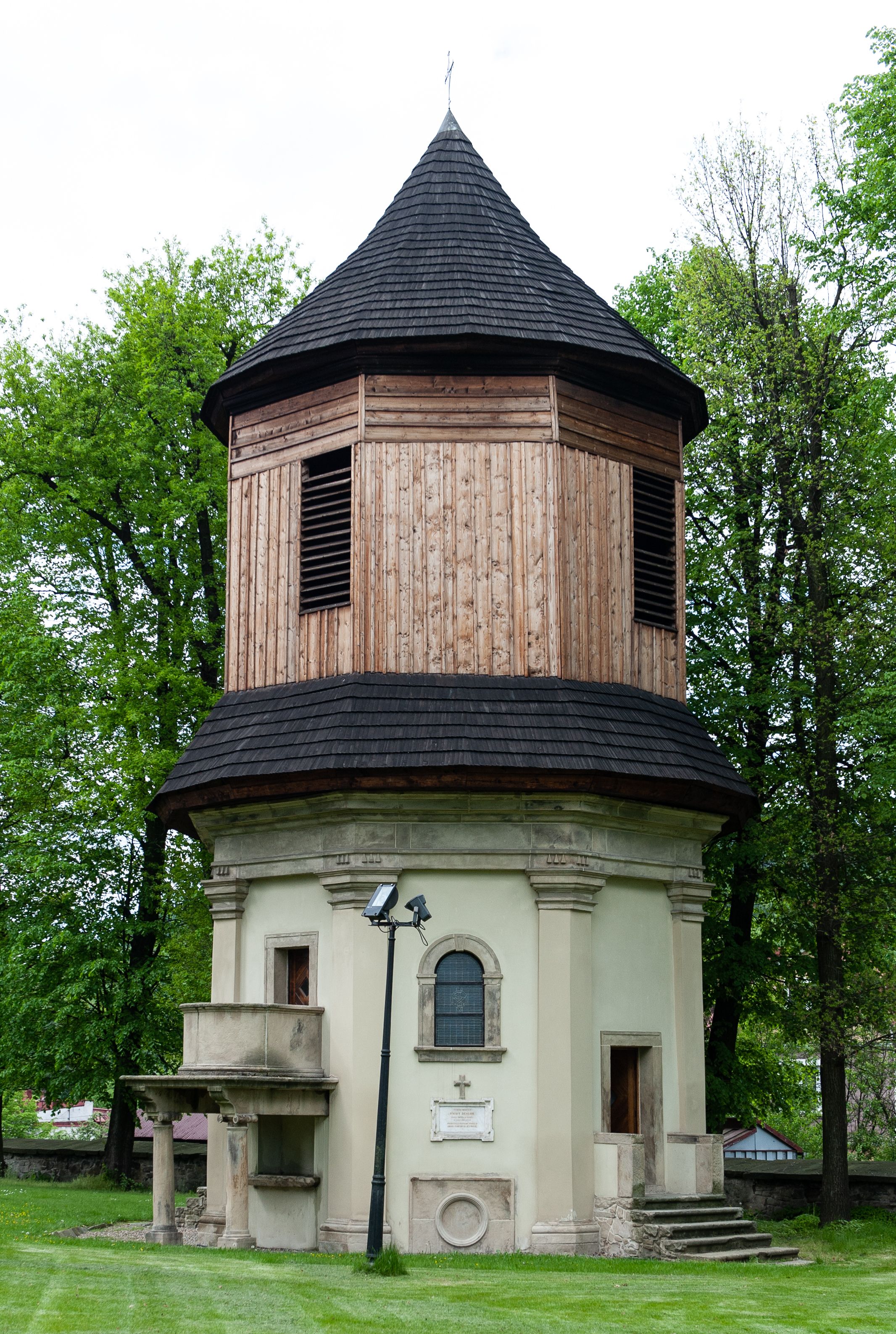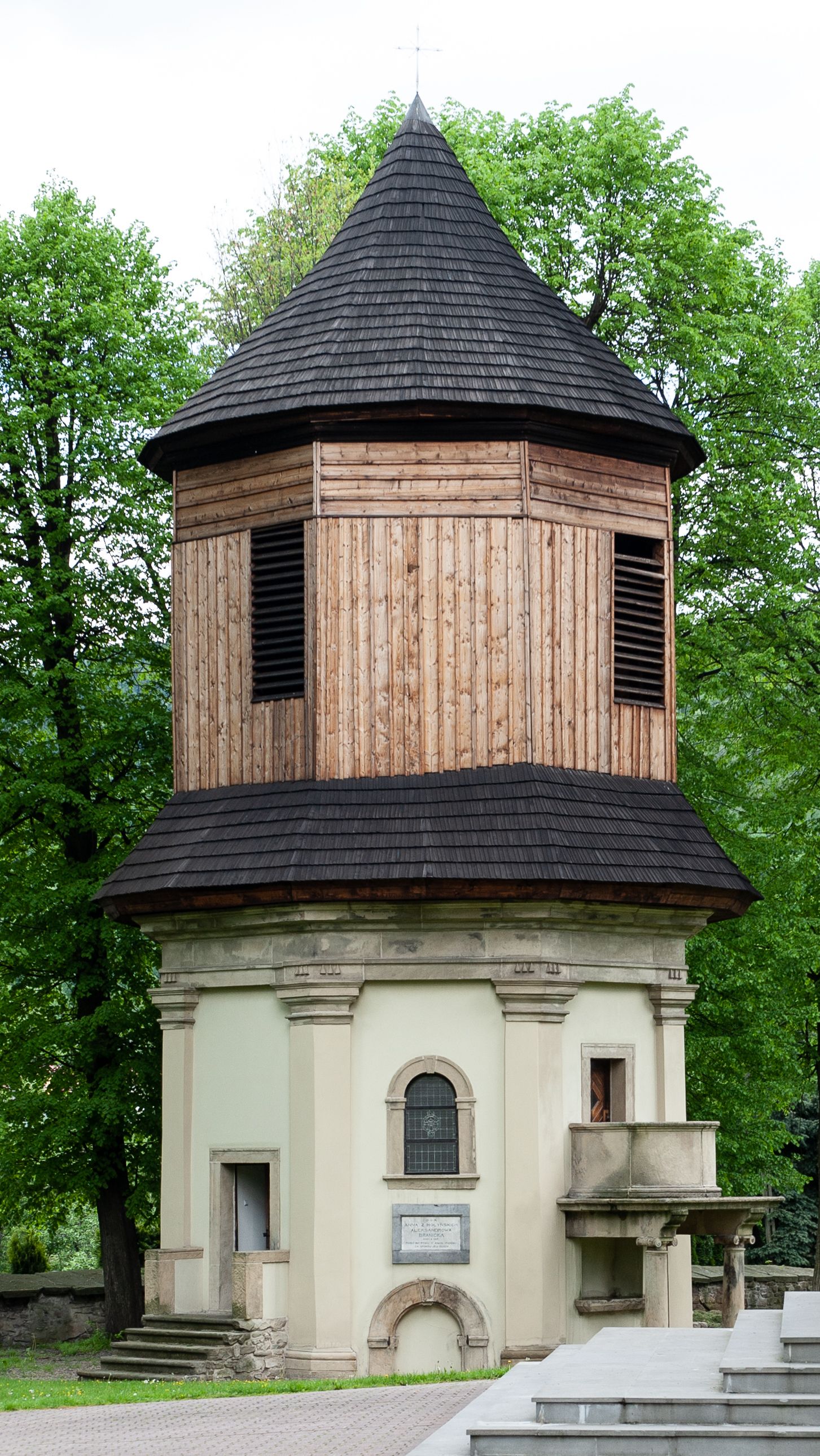 Część dolna została wybudowana z kamienia łamanego, otynkowana i mieści kaplicę nakrytą sklepieniem kopulastym z lunetami (?) oraz kryptę grobową. Ściany zewnętrzne ujęte są w narożach pilastrami toskańskimi dźwigającymi belkowanie. Od wschodu i zachodu prostokątne wejścia do kaplicy po schodach, od południowego-zachodu wejście do krypty zamknięte półkolem, po przeciwnej stronie takie samo zamurowane. Od południa ambona wsparta na dwóch jońskich kolumnach. Kaplicę oświetlają duże okna zamknięte półkolem, kryptę małe okrągłe, obecnie ślepe. Nad gzymsem koronującym okap gontowy, górna część nakryta stożkowym dachem gontowym.