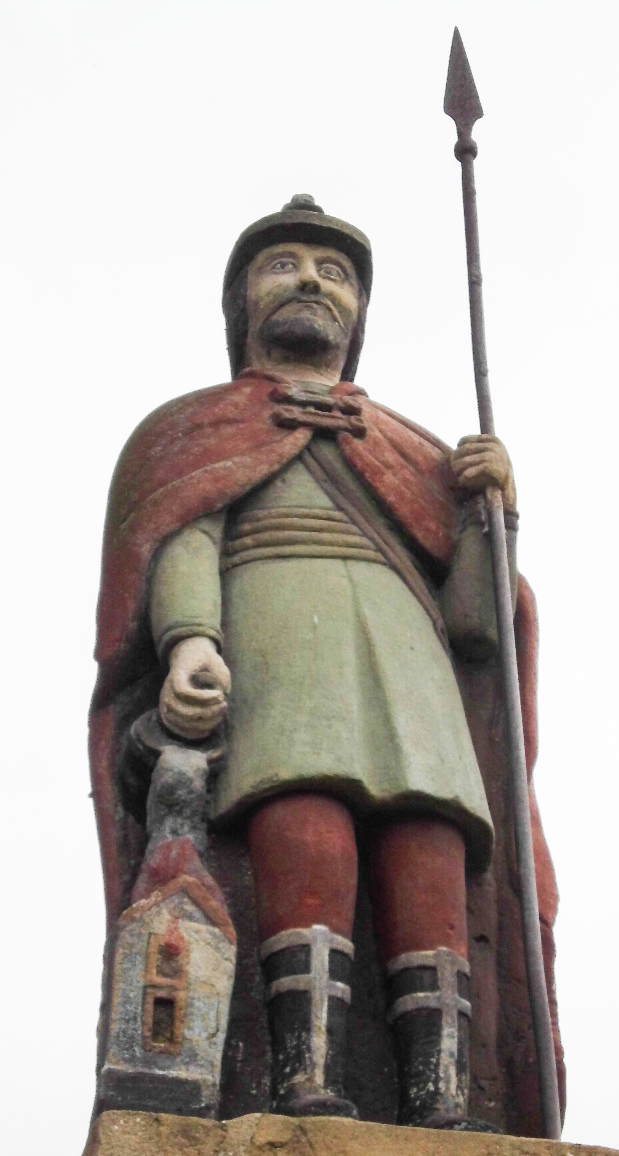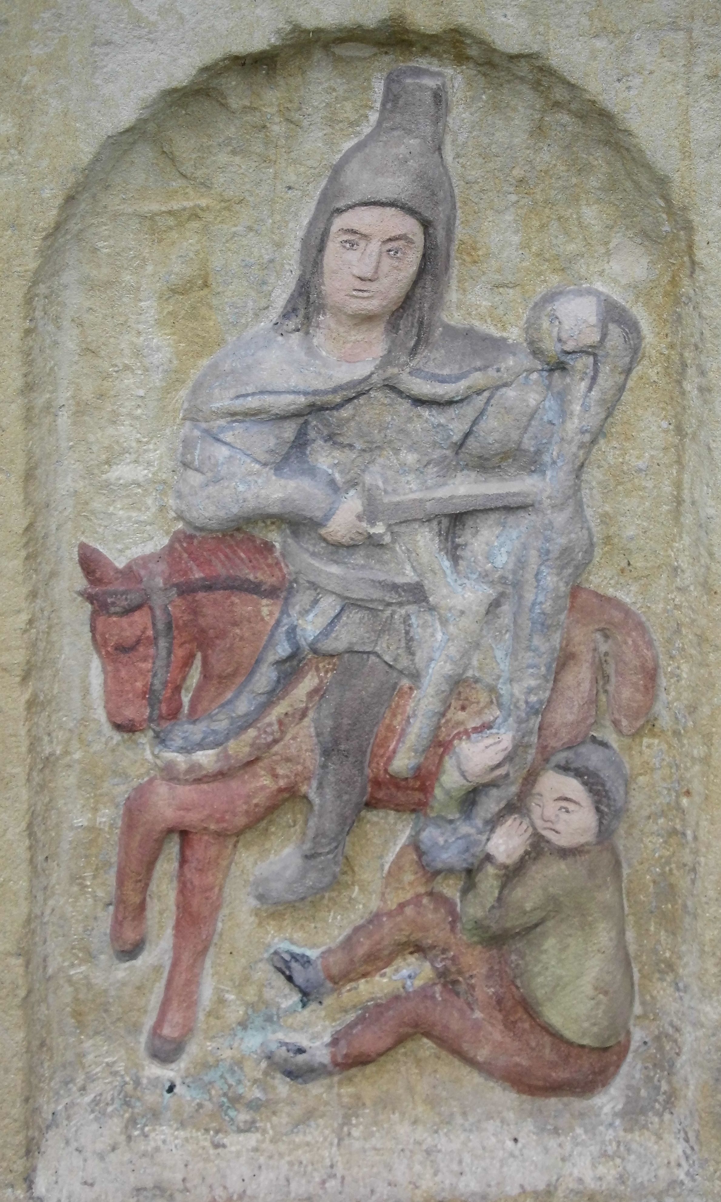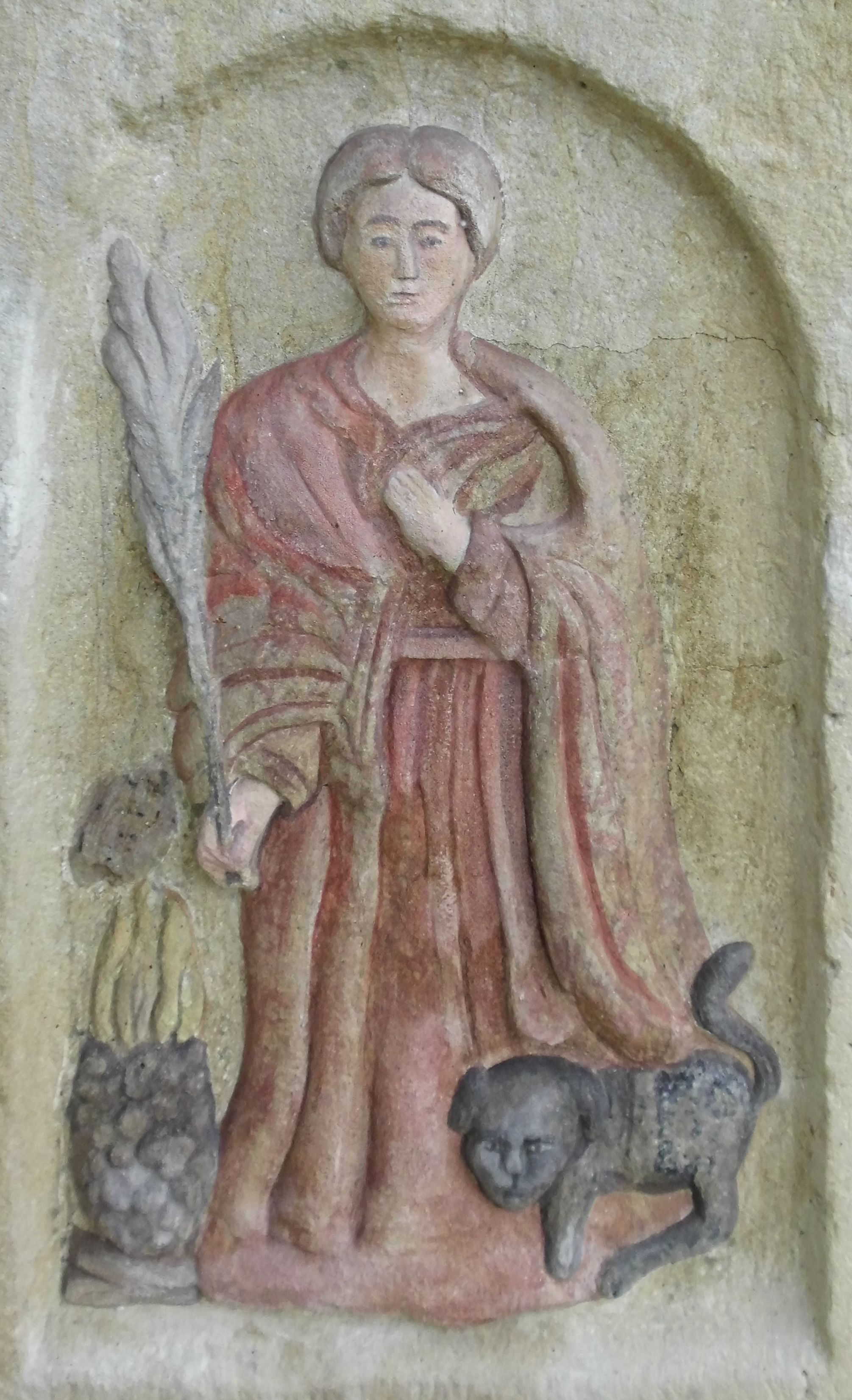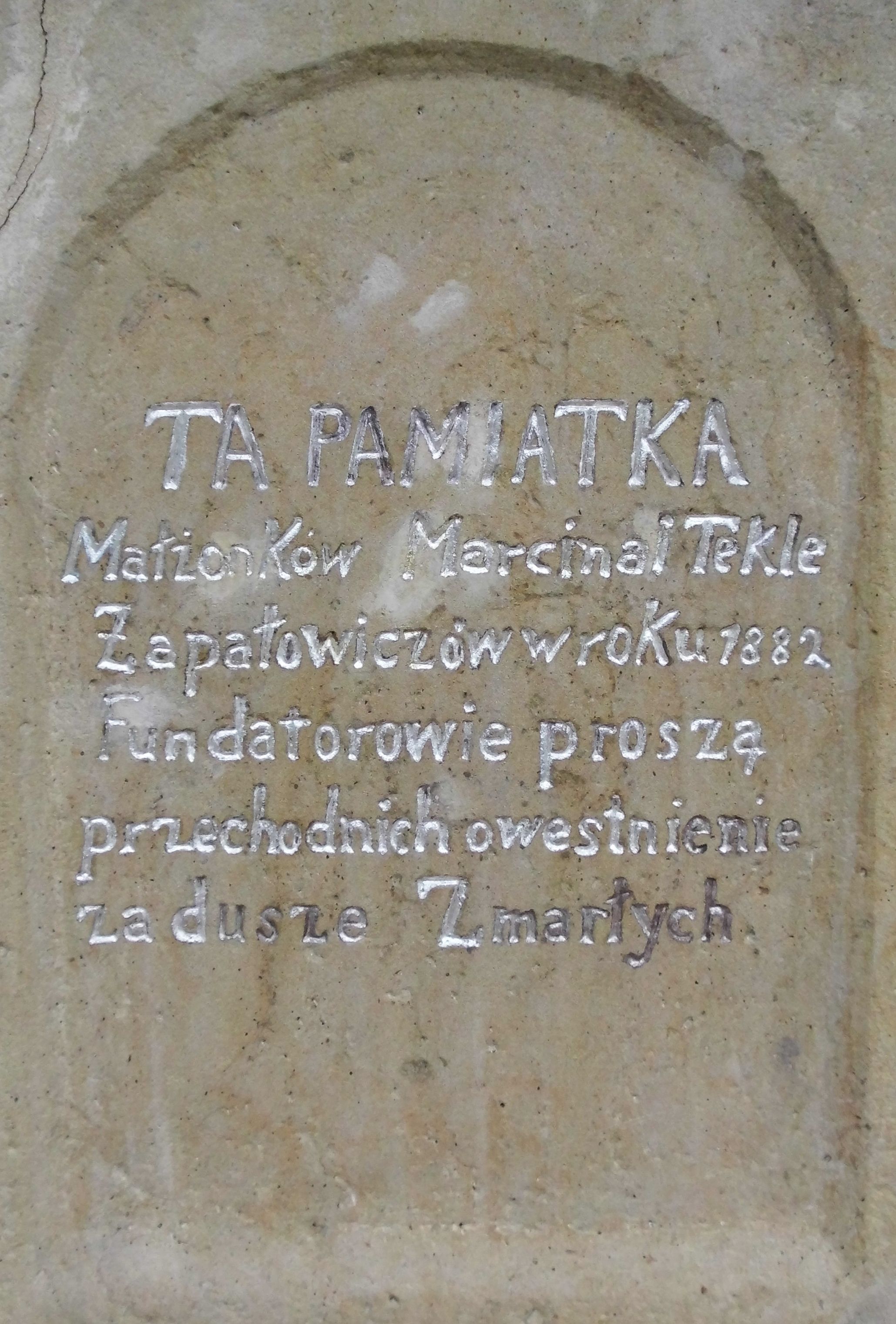 Kapliczka wolnostojąca z figurą św. Floriana na wysokim, dwustrefowym cokole. Dolna część prostopadłościenna, na profilowanej podstawie, z płytką niszą w kształcie stojącego prostokąta zamkniętego łukiem pełnym na każdej ścianie. Na froncie napis „TA PAMIATKA / Małżonków Marcina i Telke / Zapałowiczów w roku 1882 / Fundatorowie proszą / przechodnich o westchnienie / za dusze Zmarłych”. Na bocznych ścianach płaskorzeźbione postacie świętych ukazanych w całej postaci, frontalnie. Z jednej strony wizerunek świętej męczennicy z płonącą budowlą z lewej strony i psem/smokiem z prawej (św. Małgorzata?). Święta trzyma w prawej ręce palmę męczeństwa, lewą przyciska do piersi. Ma łagodną, owalną twarz, włosy z przedziałkiem, zaczesane do tyłu. Jest ubrana w czerwoną, przepasaną suknię i czerwony płaszcz. Na innej płaszczyźnie postać św. Andrzeja przedstawionego jako brodaty mężczyzna w niebieskiej tunice i czerwonym płaszczu. Za jego plecami widać końce ramion krzyża w kształcie litery „X”. Na kolejnej św. Jan Nepomucen w sutannie, komży i płaszczu, w birecie. Z krucyfiksem i palmą męczeństwa w rękach. Na kolejnej ściance św. Marcin na koniu, w stroju żołnierza, trzymanym w prawej ręce mieczem odcina część płaszcza, który chwyta siedząca na ziemi postać w czerwonych spodniach i zielonej koszuli. W górnej strefie cokołu, w ścianie frontowej nisza z figurą Matki Boskiej w całej postaci, frontalnie, z rękami złożonymi do modlitwy i różańcem. Maria ma na sobie białą suknię i niebieski płaszcz zarzucony na głowę; na bosych stopach kwiaty róż Na cokole postać św. Floriana w całej postaci, frontalnie, z cebrzykiem z którego leje się woda na płonący dom w prawej i włócznią w lewej ręce. Ma owalną twarz, wąsy i brodę. Ubrany jest w strój rzymskiego legionisty – jasną tunikę, czerwony płaszcz, wysokie buty i hełm.