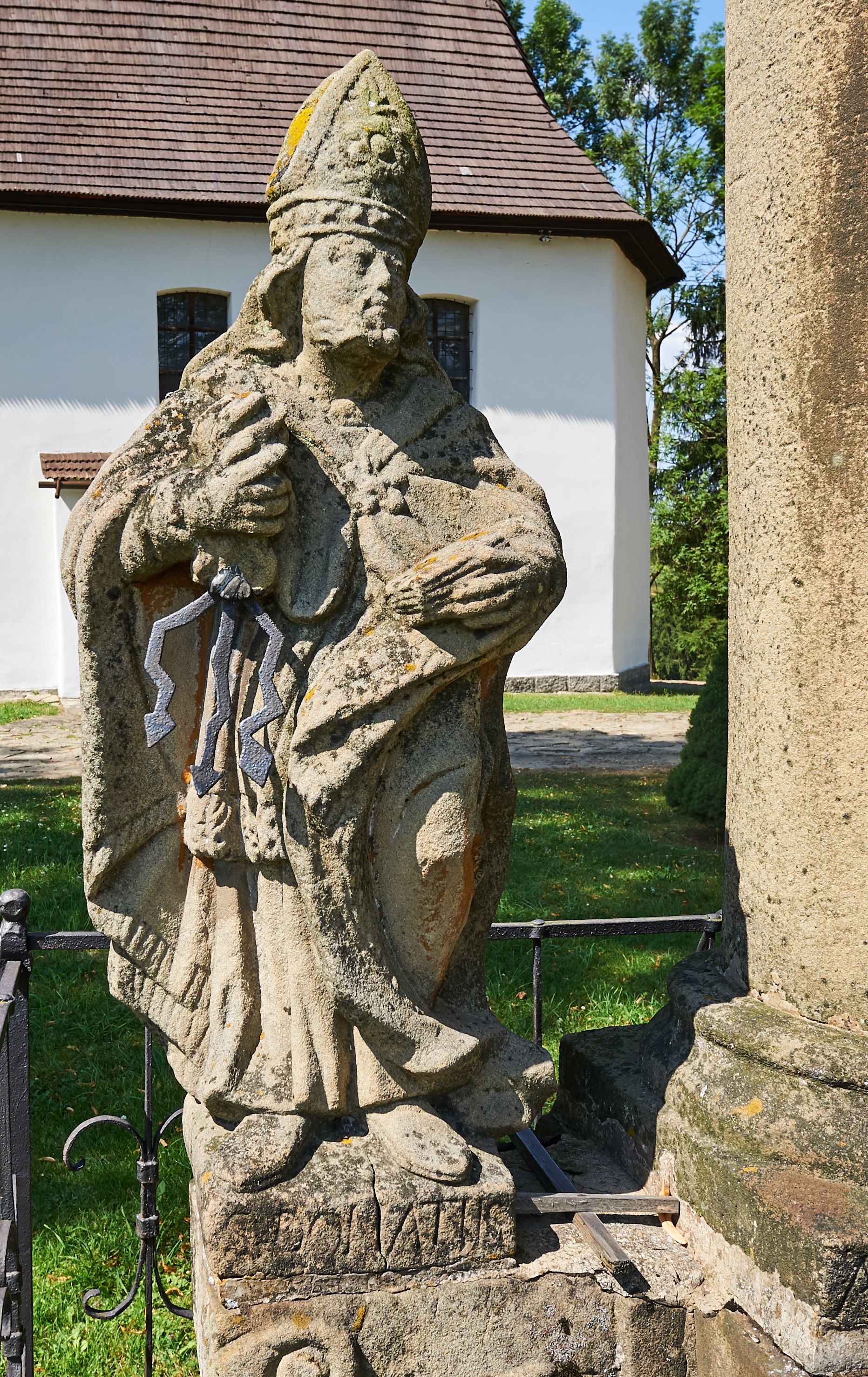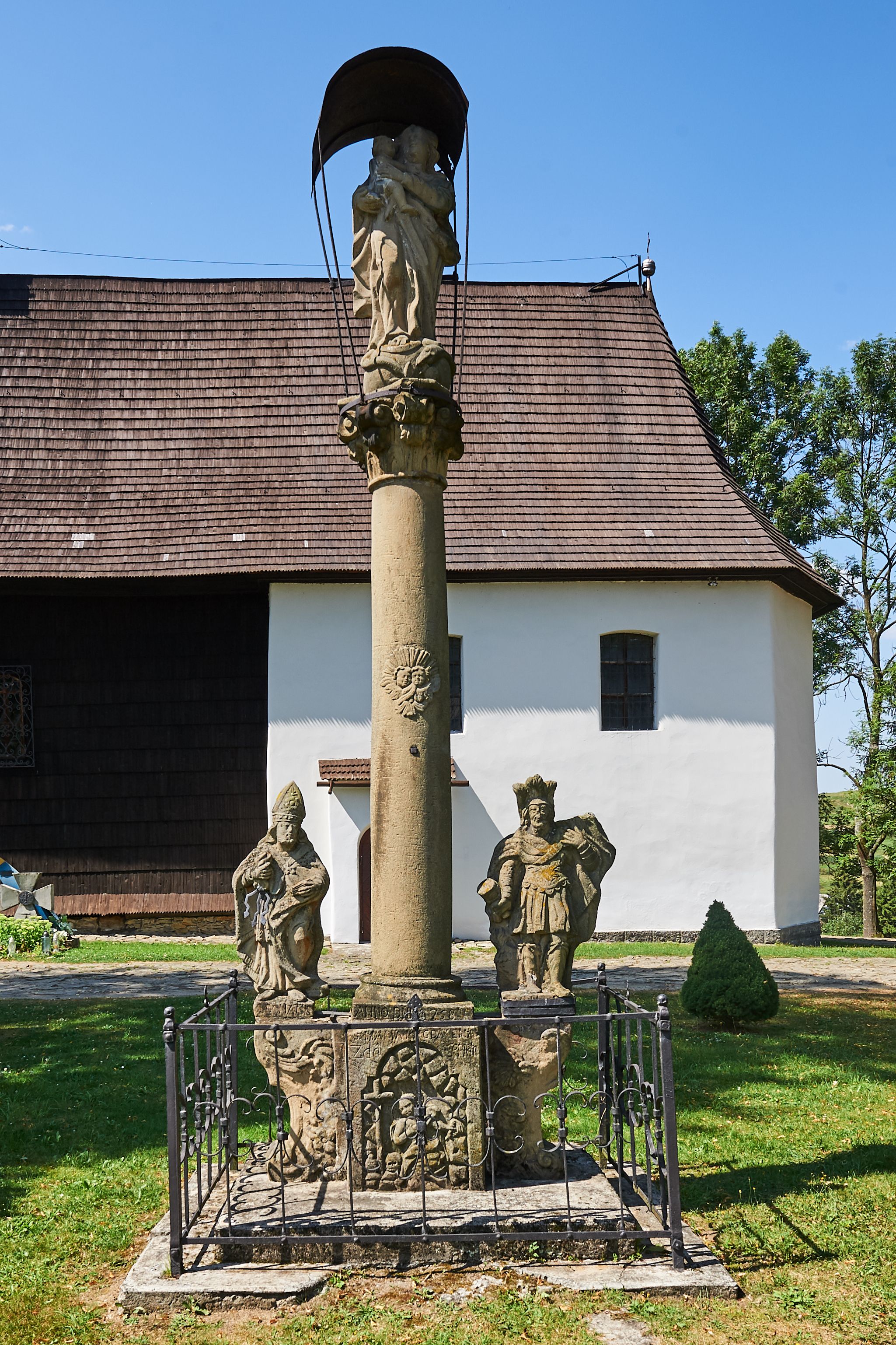 Kapliczka ustawiona na niskim prostopadłościennym postumencie. Pośrodku na wysokim cokole umieszczona kolumna, na której szczycie ustawiona jest figura Matki Boskiej Niepokalanie Poczętej z Dzieciątkiem. Cokół flankowany szerokimi spływami wolutowymi, na których ustawione są na niskich podstawach rzeźby: po lewej św. Donata, a po prawej św. Floriana. Na przedniej ściance cokołu znajduje się płaskorzeźba św. Marii Magdaleny ujęta płyciną w kształcie stojącego prostokąta, zamkniętego łukiem nadwieszonym z uskokami. Święta ukazana jest na tle groty, zwrócona trzy czwarte w prawo z rozpuszczonymi włosami, z dyscypliną w dłoni. Po lewej stronie kompozycji znajduje się wysoki, prosty krzyż i czaszka. Nad płyciną napis „ANNO D(OMI)NI 1758 / S(ANCTA) MARIA MAGDALENA / Zda SPPIPM”. Na tylnej ściance cokołu rzeźba św. Rozalii, ukazana w podobnym ujęciu z napisem „SANCTA ROSALIA VIRGO”. Święty Donat ukazany w postawie stojącej w delikatnym kontrapoście z księgą w lewej dłoni i trójzębem w prawej. Ubrany jest w strój biskupi: albę, komżę, kapę, infułę, rękawice i buty. Ma szeroką twarz, okoloną krótką brodą, bujne i długie włosy spływające na plecy. Na podstawie napis: „S(ANCTUS) DONATUS”. Po prawej stronie kolumny rzeźba św. Floriana, ustawionego frontalnie, który prawą ręką polewa wodą płonący dom, a lewą podtrzymuje u ramienia połę płaszcza. Ubrany jest w strój legionisty rzymskiego z hełmem o wyraźnie podkreślonym pióropuszu. Twarz szeroka, okolona średniej długości włosami, schowanymi pod hełmem. Podstawa pod rzeźbą opleciona metalowymi ściskami. Kolumna ustawiona na bazie, trzon gładki, dekorowany w połowie wysokości dwiema uskrzydlonymi główkami aniołów na tle promienistej glorii, kapitel koryncki. Rzeźba Matki Boskiej Niepokalanej z Dzieciątkiem na prawym ręku ustawiona jest frontalnie, w delikatnym kontrapoście na globie ziemskim, oplecionym przez węża. Maria ubrana jest w długą suknię i silnie drapowany płaszcz. Twarz owalna, okolona bujnymi i długimi włosami. Dzieciątko zwrócone jest w stronę Matki Boskiej. Rzeźba Marii osłonięta jest metalowym daszkiem wspartym na czterech prętach przytwierdzonych do metalowej opaski oplatającej kapitel kolumny. Kapliczka obwiedziona metalowym płotkiem.