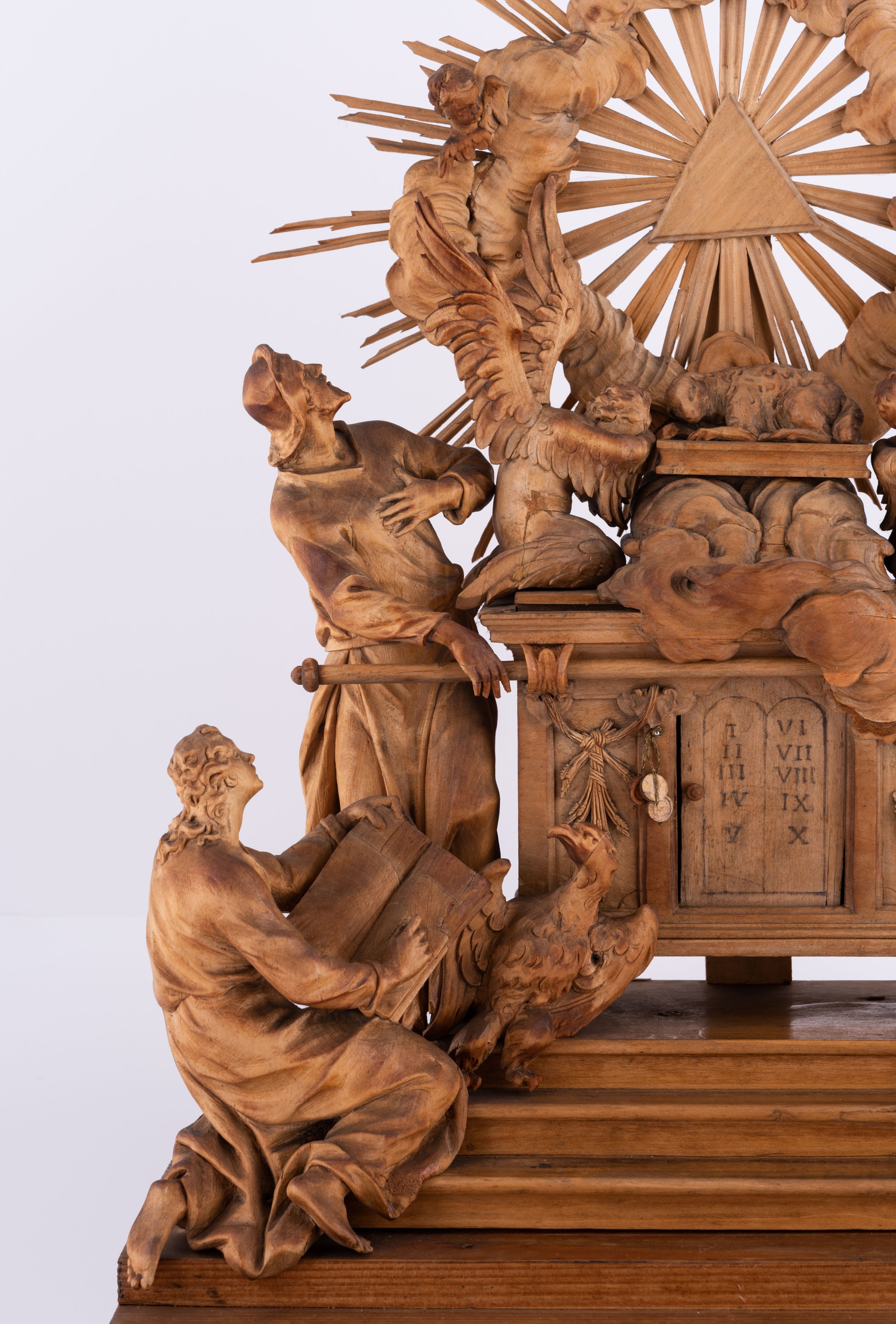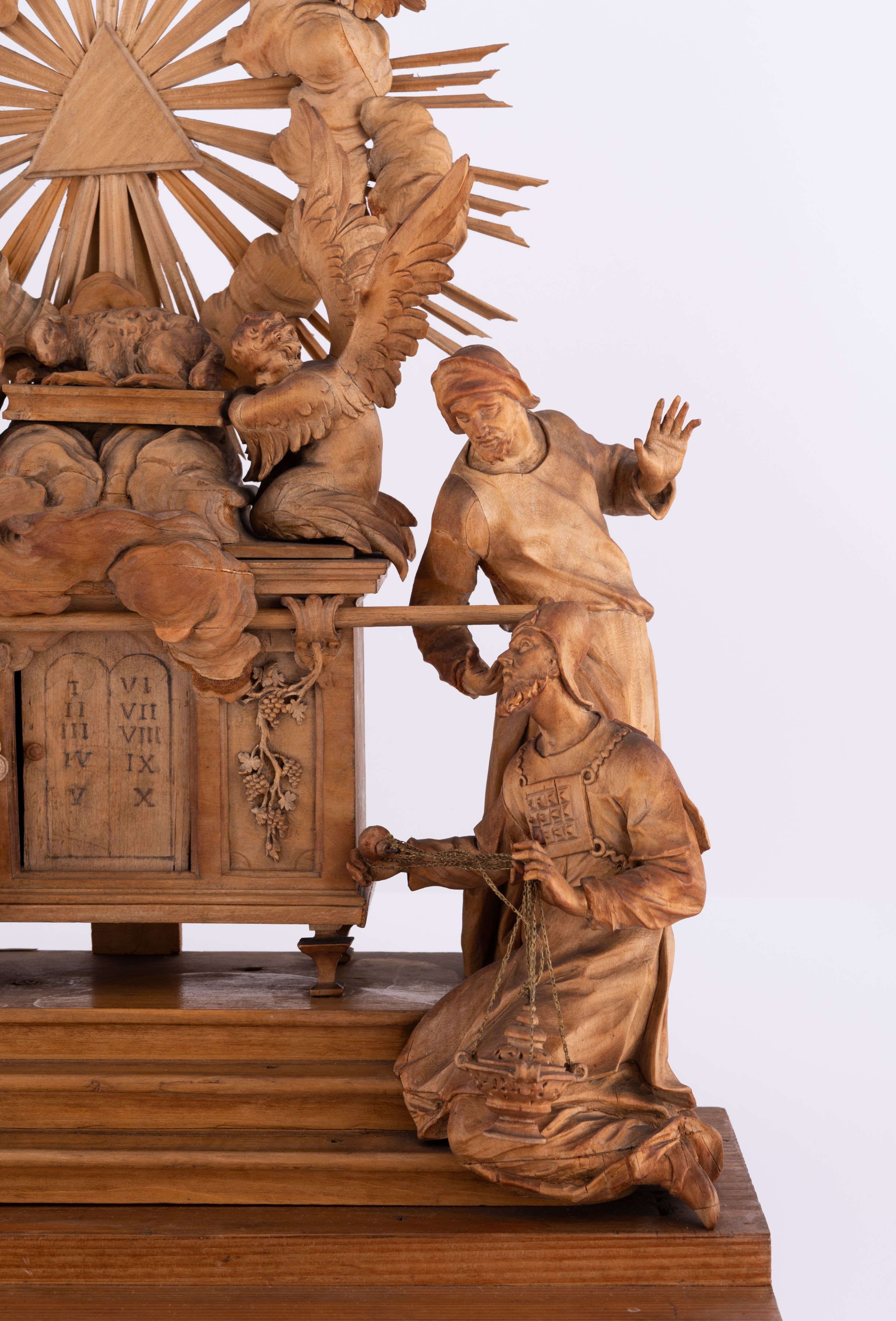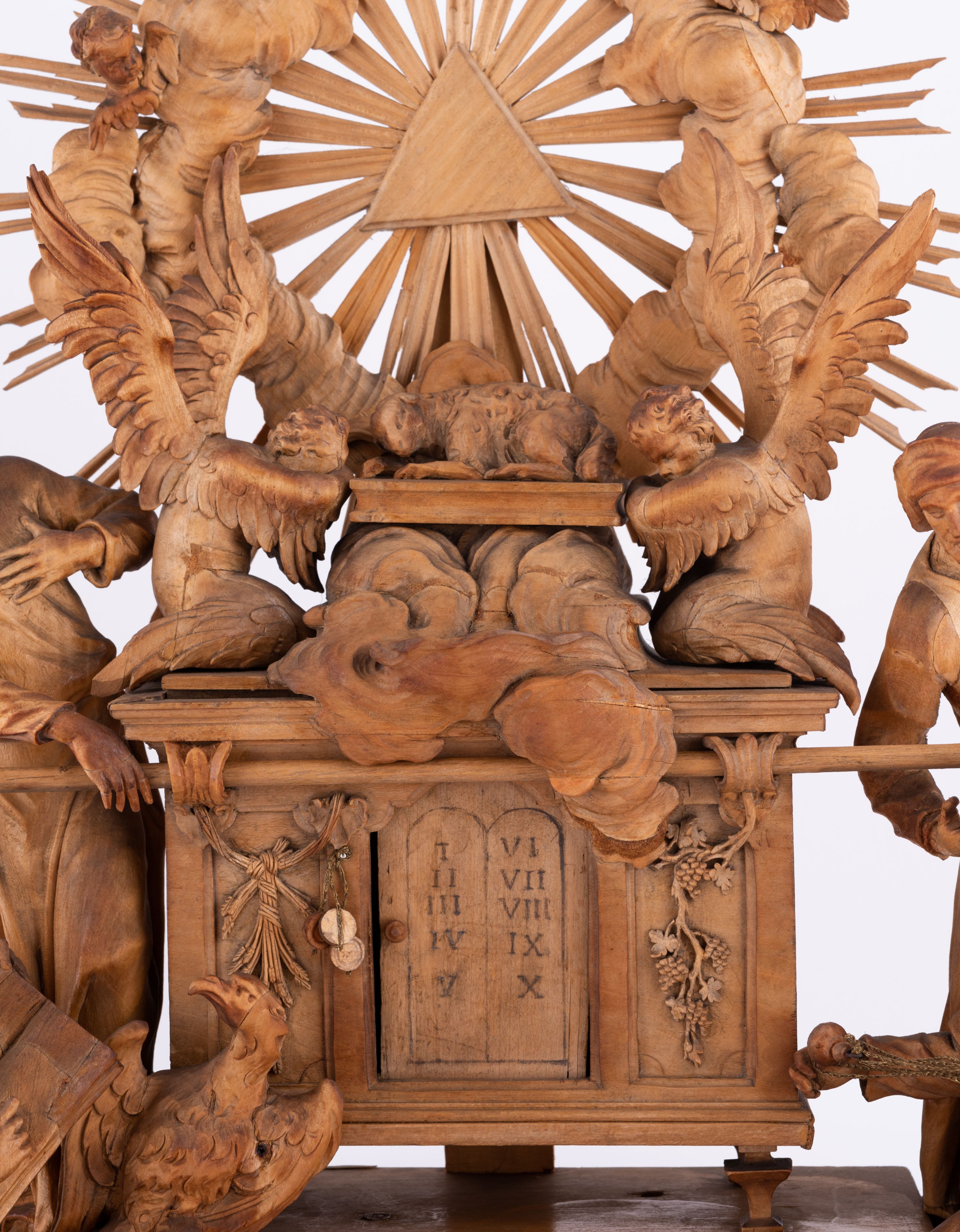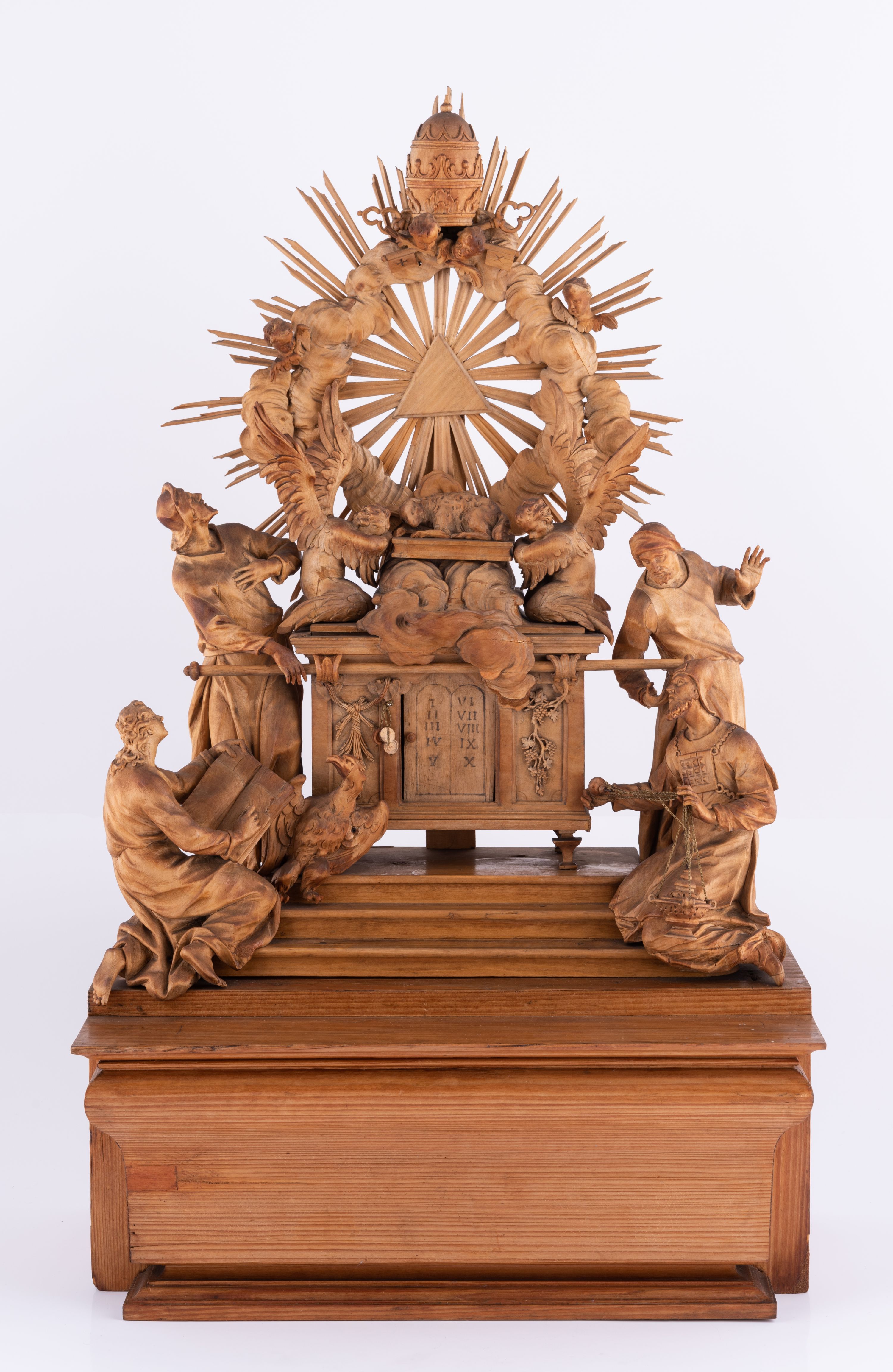 Tabernakulum w formie Arki Przymierza, adorowanej przez dwie klęczące figury św. Jana i starotestamentowego arcykapłana, dwie stojące postacie lewitów oraz klęczących aniołów, zwieńczonej glorią promienistą z okiem Opatrzności. Arka w formie prostopadłościennej szafki z dwoma drążkami do noszenia jest od frontu podzielone na trzy pola: środkowe zamknięte łukiem wklęsło-wypukłym i boczne o ćwierćkoliście wyciętych narożach. Pole środkowe stanowią drzwiczki z rytymi cyframi Dekalogu, a w bocznych znajdują się kłosy zbóż i winne grono. Na skłębionych chmurach z podestem leży baranek. Nad nim widnieje znacznej wielkości gloria promienista z wieńcem chmur i umieszczonym w nim okiem Opatrzności oraz cztery uskrzydlone główki anielskie. Nad parą główek w górnej części papieska tiara ze skrzyżowanymi kluczami. Po bokach baranka dwa klęczące, uskrzydlone nagie aniołki o rękach i nogach utworzonych z piór. Obok arki dwie postacie lewitów ubranych w długie szaty, w różnicowanych pozach i gestach. Poniżej klęczą postacie św. Jana z księgą i orłem obok niego i kapłana w tradycyjnym starotestamentowym stroju – efodzie czyli tunice i płaszczu wierzchnim przepasanym na biodrach, z pektorałem na piersi i czapką na głowie.