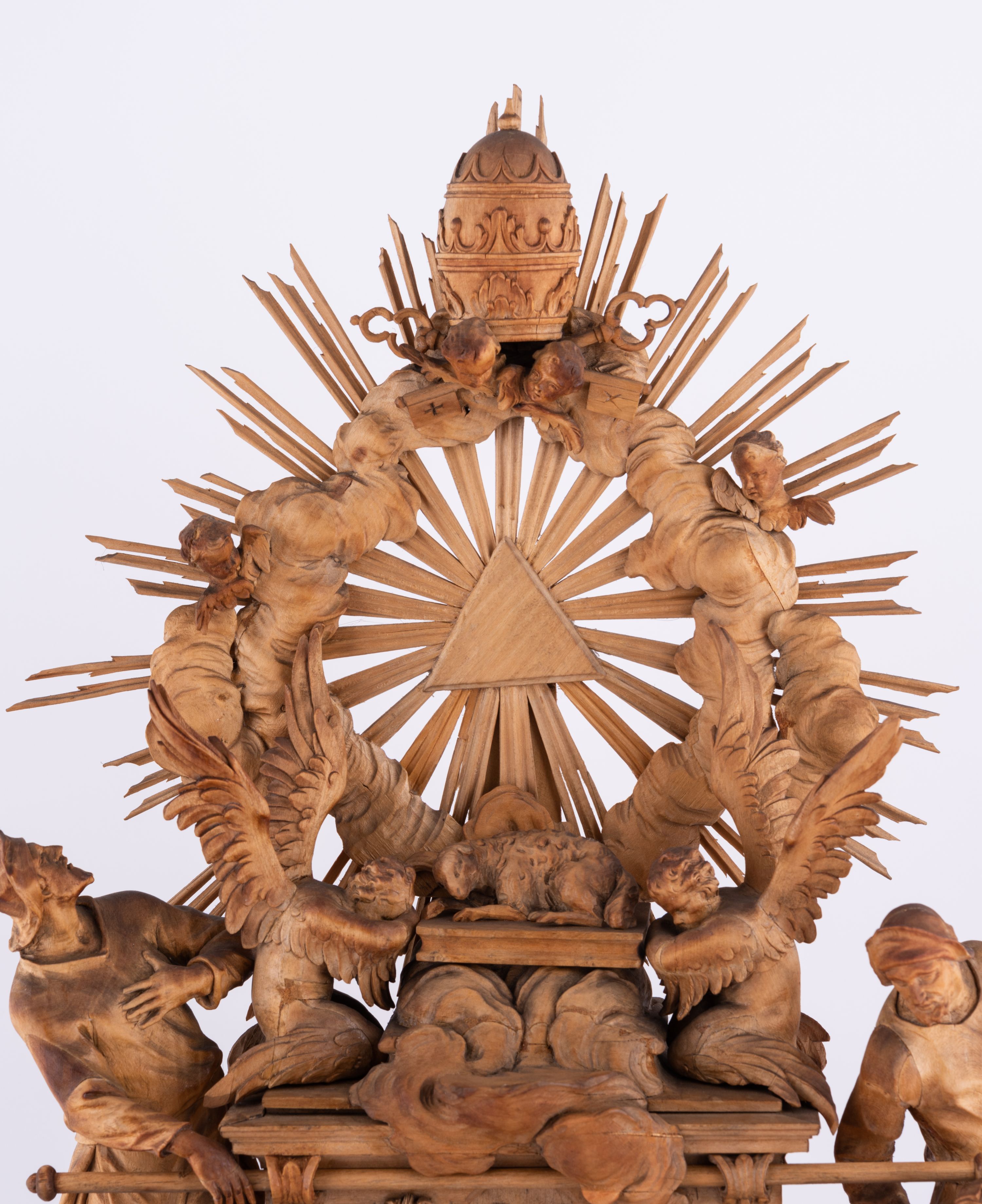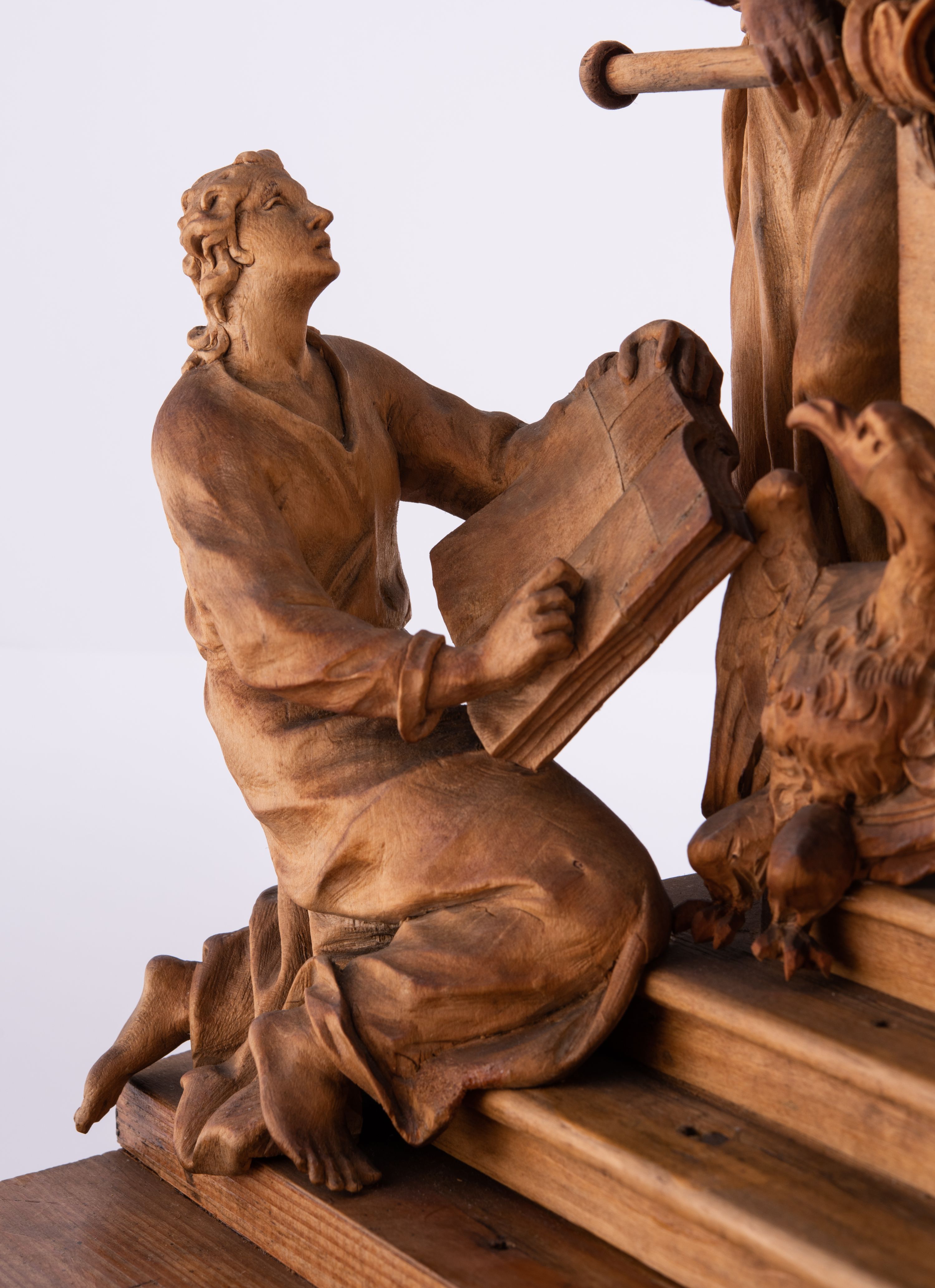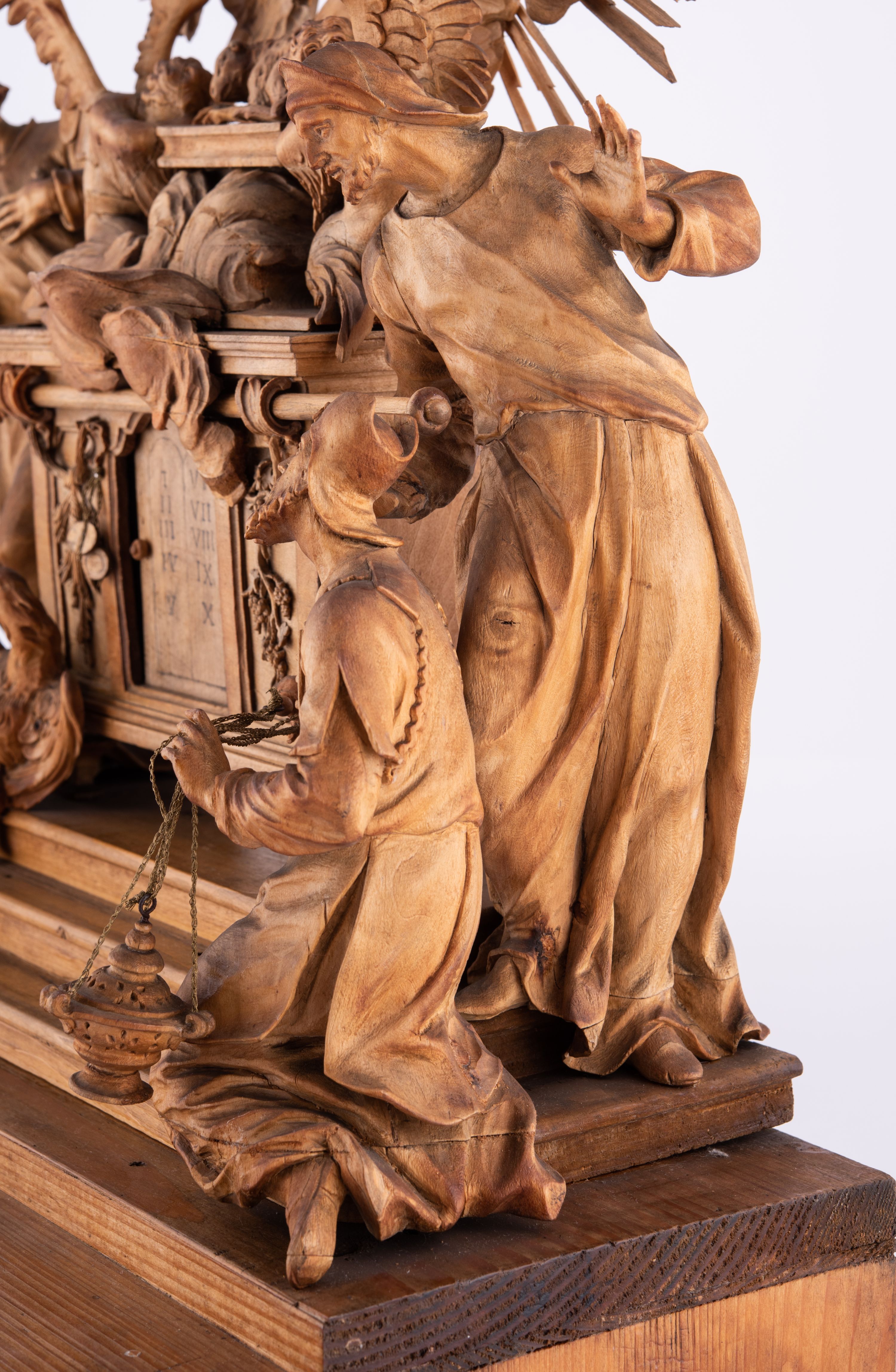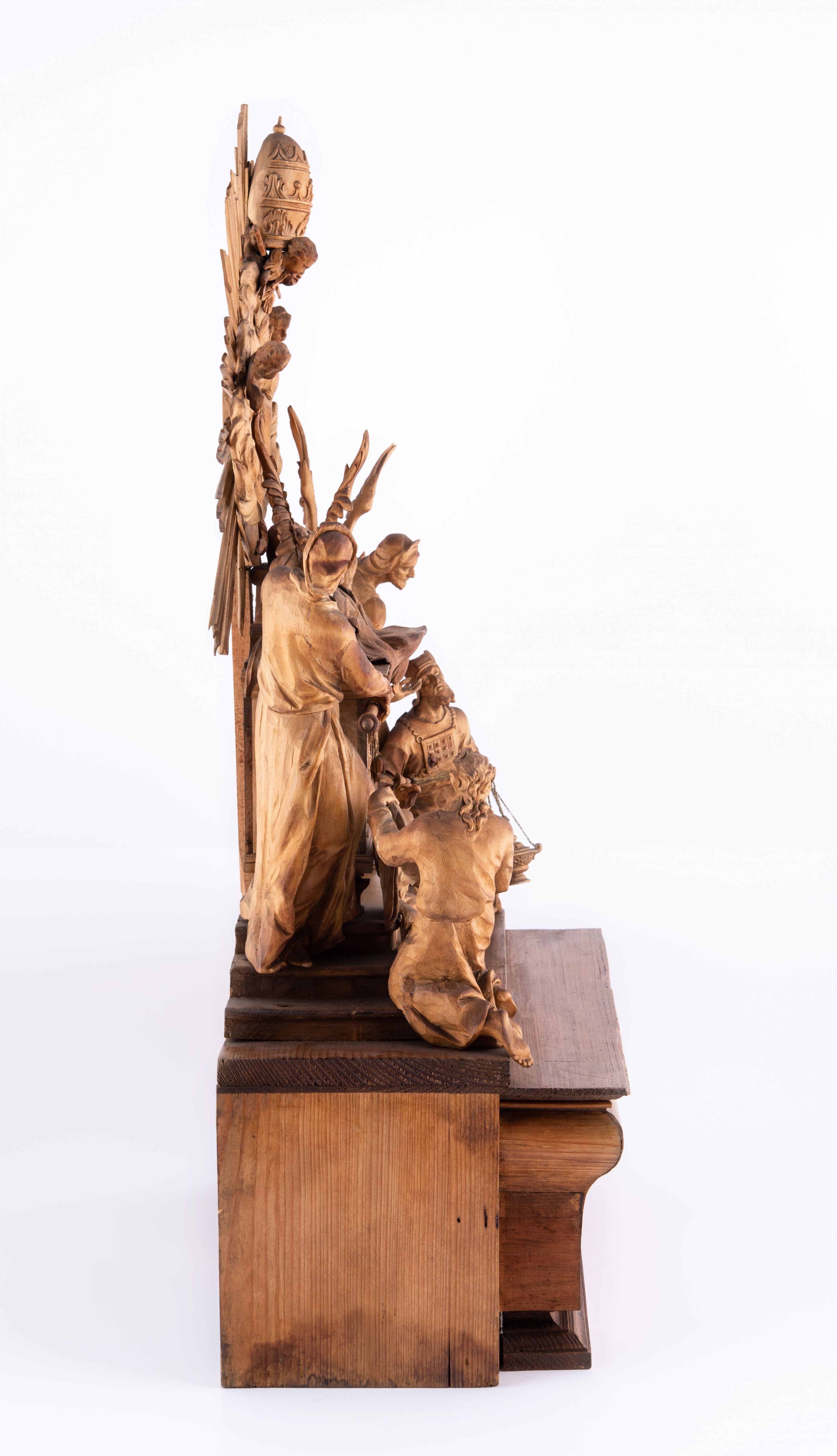 Tabernakulum w formie Arki Przymierza, adorowanej przez dwie klęczące figury św. Jana i starotestamentowego arcykapłana, dwie stojące postacie lewitów oraz klęczących aniołów, zwieńczonej glorią promienistą z okiem Opatrzności. Arka w formie prostopadłościennej szafki z dwoma drążkami do noszenia jest od frontu podzielone na trzy pola: środkowe zamknięte łukiem wklęsło-wypukłym i boczne o ćwierćkoliście wyciętych narożach. Pole środkowe stanowią drzwiczki z rytymi cyframi Dekalogu, a w bocznych znajdują się kłosy zbóż i winne grono. Na skłębionych chmurach z podestem leży baranek. Nad nim widnieje znacznej wielkości gloria promienista z wieńcem chmur i umieszczonym w nim okiem Opatrzności oraz cztery uskrzydlone główki anielskie. Nad parą główek w górnej części papieska tiara ze skrzyżowanymi kluczami. Po bokach baranka dwa klęczące, uskrzydlone nagie aniołki o rękach i nogach utworzonych z piór. Obok arki dwie postacie lewitów ubranych w długie szaty, w różnicowanych pozach i gestach. Poniżej klęczą postacie św. Jana z księgą i orłem obok niego i kapłana w tradycyjnym starotestamentowym stroju – efodzie czyli tunice i płaszczu wierzchnim przepasanym na biodrach, z pektorałem na piersi i czapką na głowie.