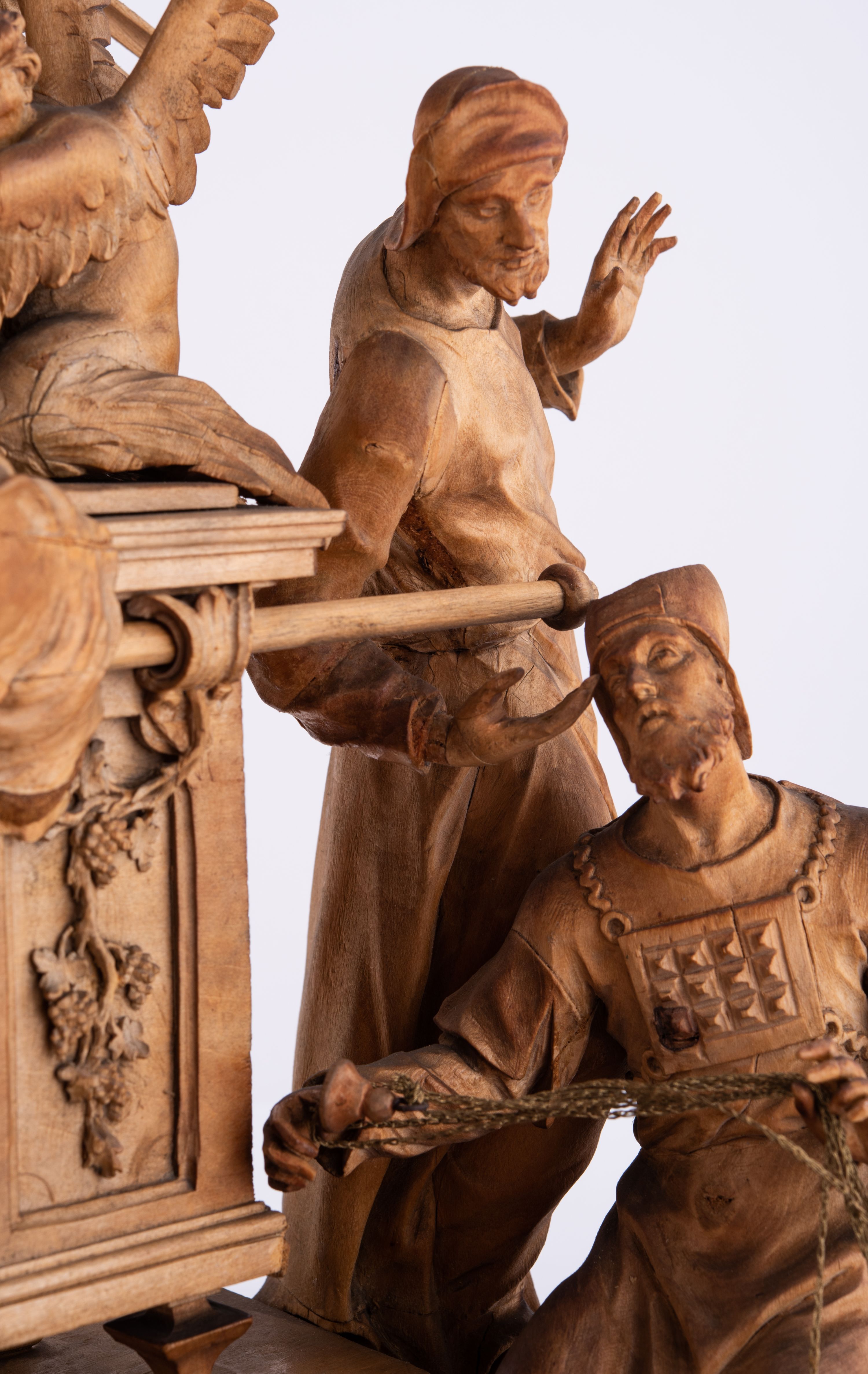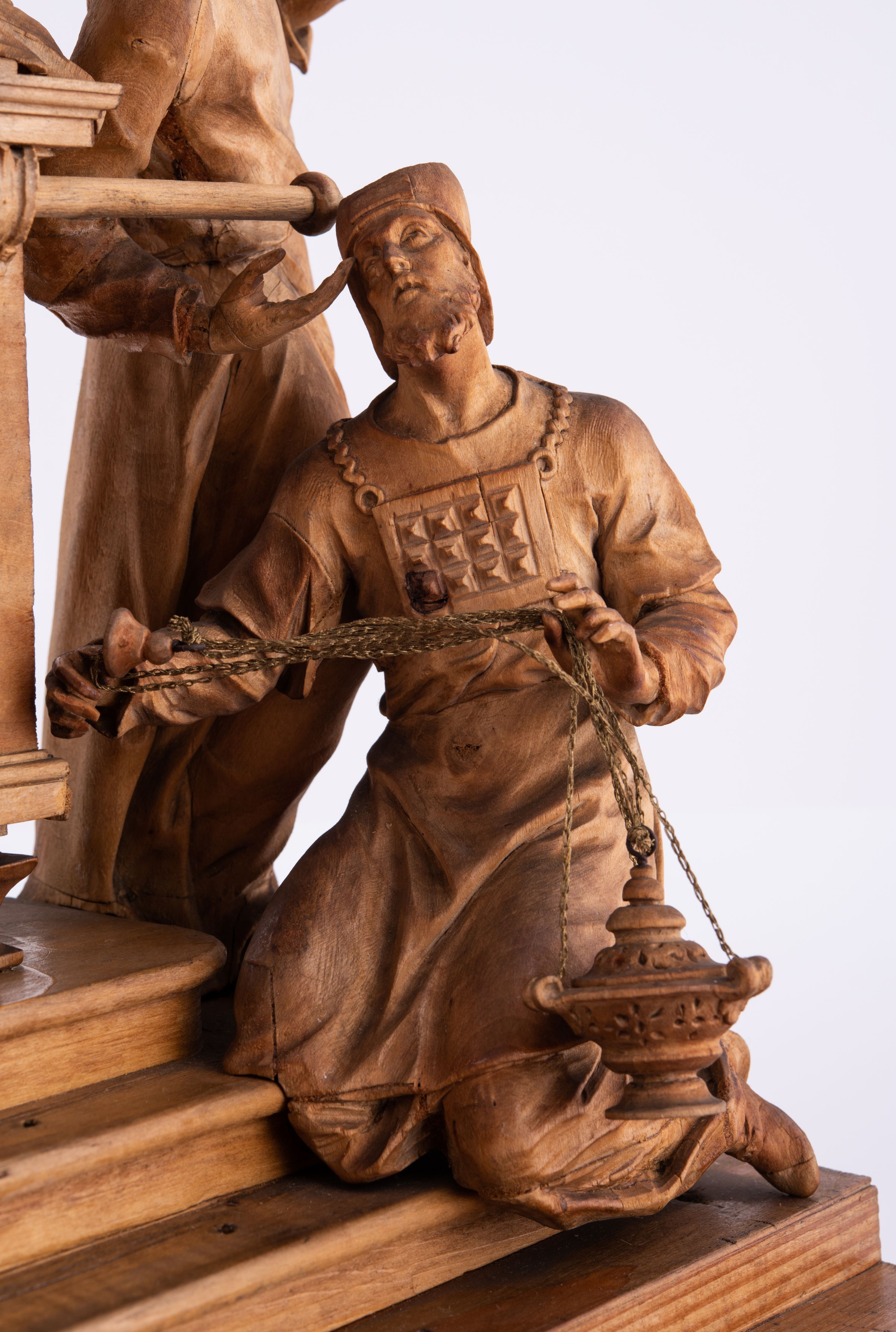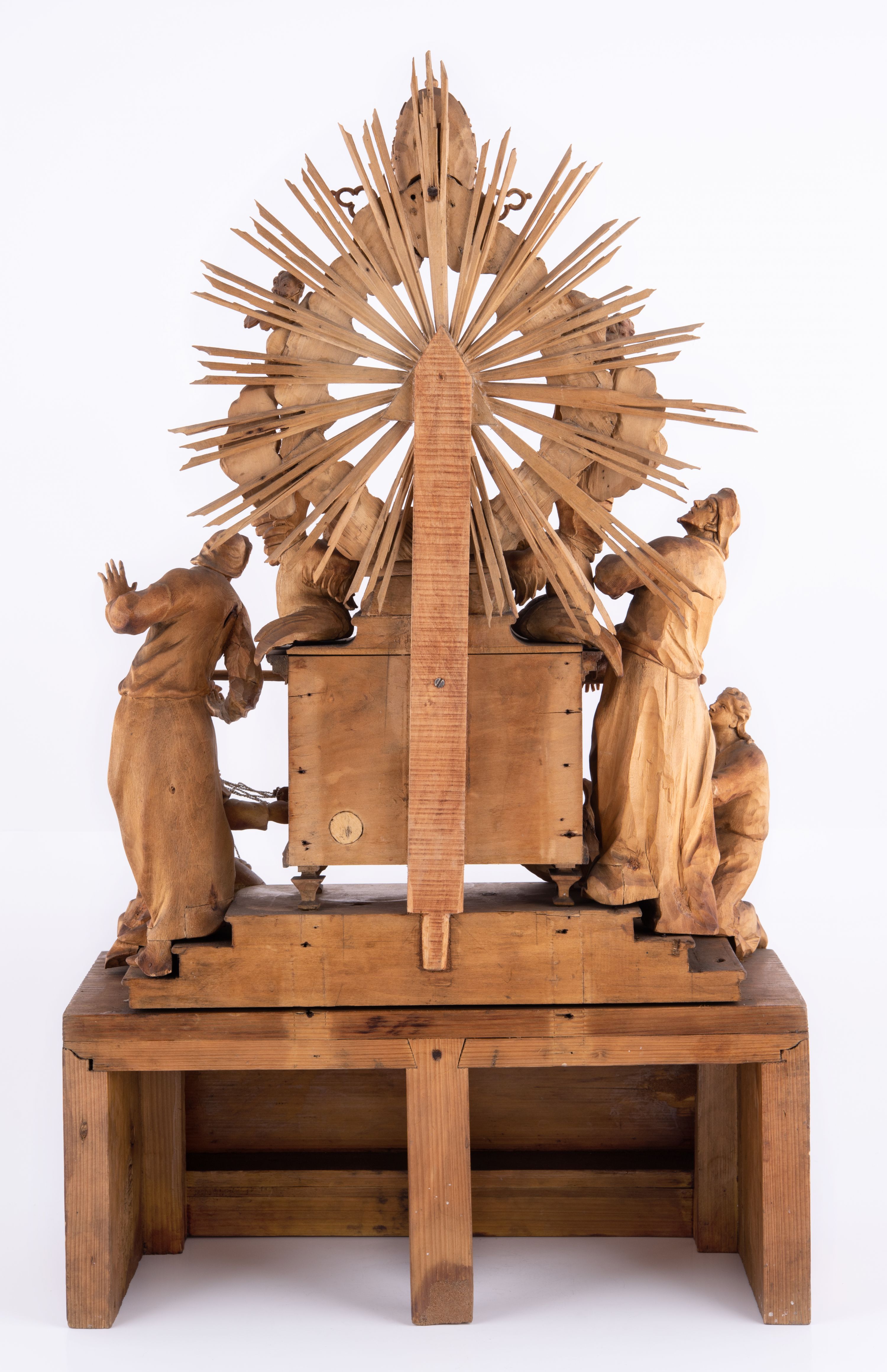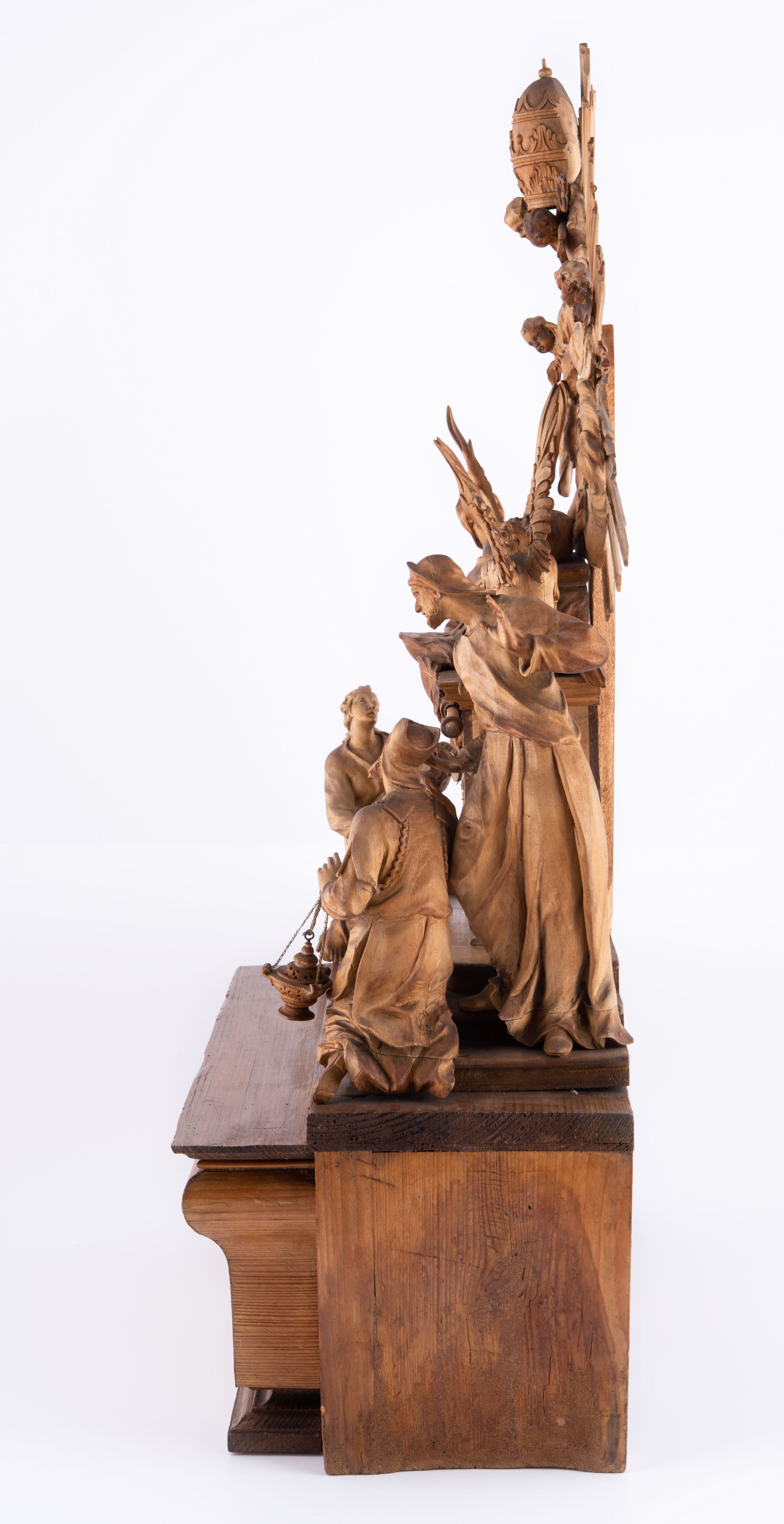 Tabernakulum w formie Arki Przymierza, adorowanej przez dwie klęczące figury św. Jana i starotestamentowego arcykapłana, dwie stojące postacie lewitów oraz klęczących aniołów, zwieńczonej glorią promienistą z okiem Opatrzności. Arka w formie prostopadłościennej szafki z dwoma drążkami do noszenia jest od frontu podzielone na trzy pola: środkowe zamknięte łukiem wklęsło-wypukłym i boczne o ćwierćkoliście wyciętych narożach. Pole środkowe stanowią drzwiczki z rytymi cyframi Dekalogu, a w bocznych znajdują się kłosy zbóż i winne grono. Na skłębionych chmurach z podestem leży baranek. Nad nim widnieje znacznej wielkości gloria promienista z wieńcem chmur i umieszczonym w nim okiem Opatrzności oraz cztery uskrzydlone główki anielskie. Nad parą główek w górnej części papieska tiara ze skrzyżowanymi kluczami. Po bokach baranka dwa klęczące, uskrzydlone nagie aniołki o rękach i nogach utworzonych z piór. Obok arki dwie postacie lewitów ubranych w długie szaty, w różnicowanych pozach i gestach. Poniżej klęczą postacie św. Jana z księgą i orłem obok niego i kapłana w tradycyjnym starotestamentowym stroju – efodzie czyli tunice i płaszczu wierzchnim przepasanym na biodrach, z pektorałem na piersi i czapką na głowie.