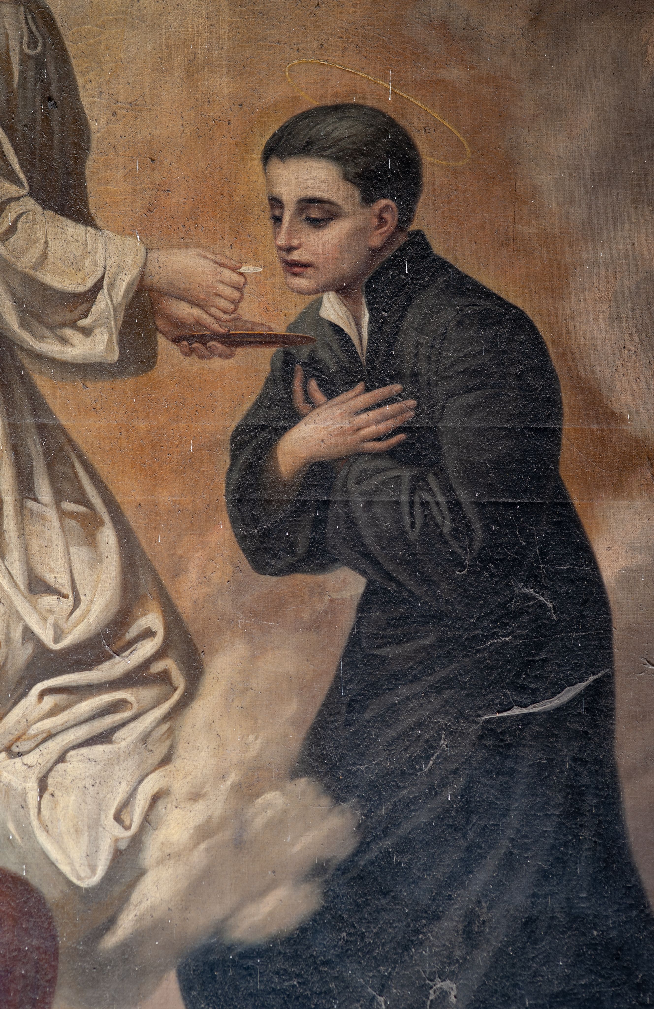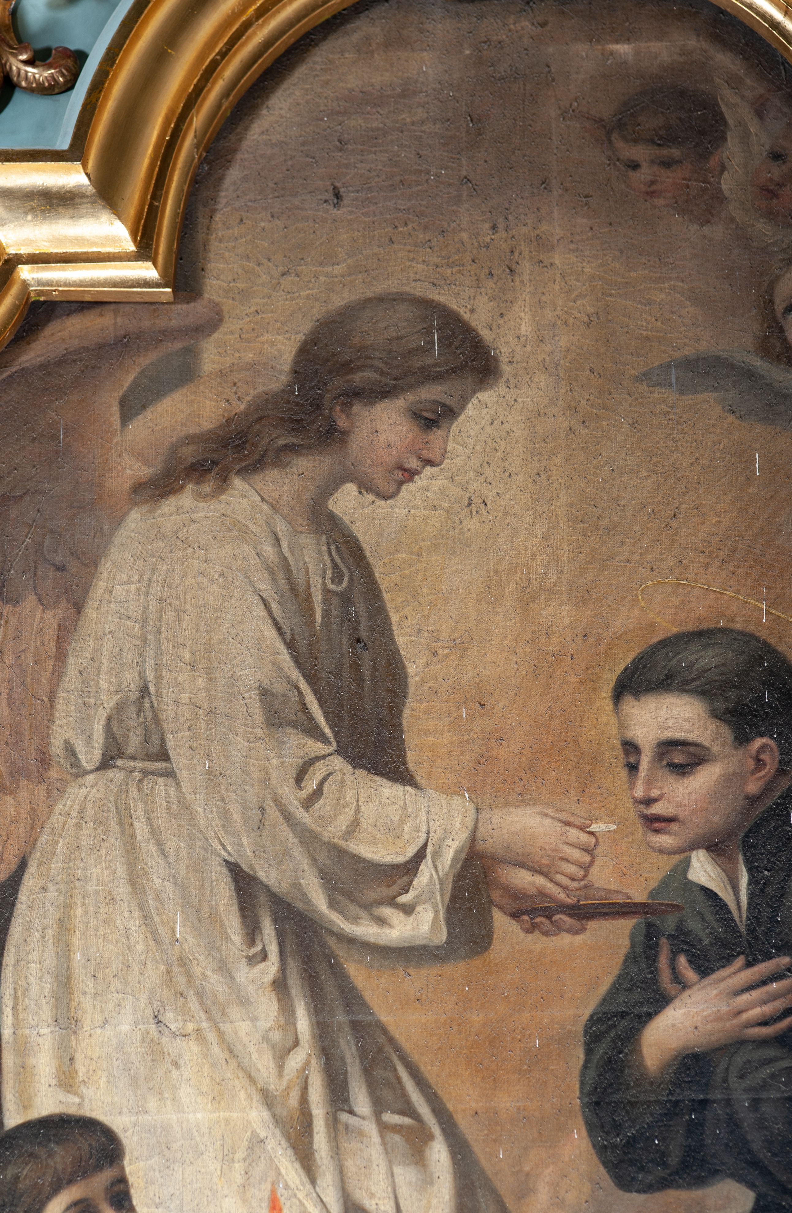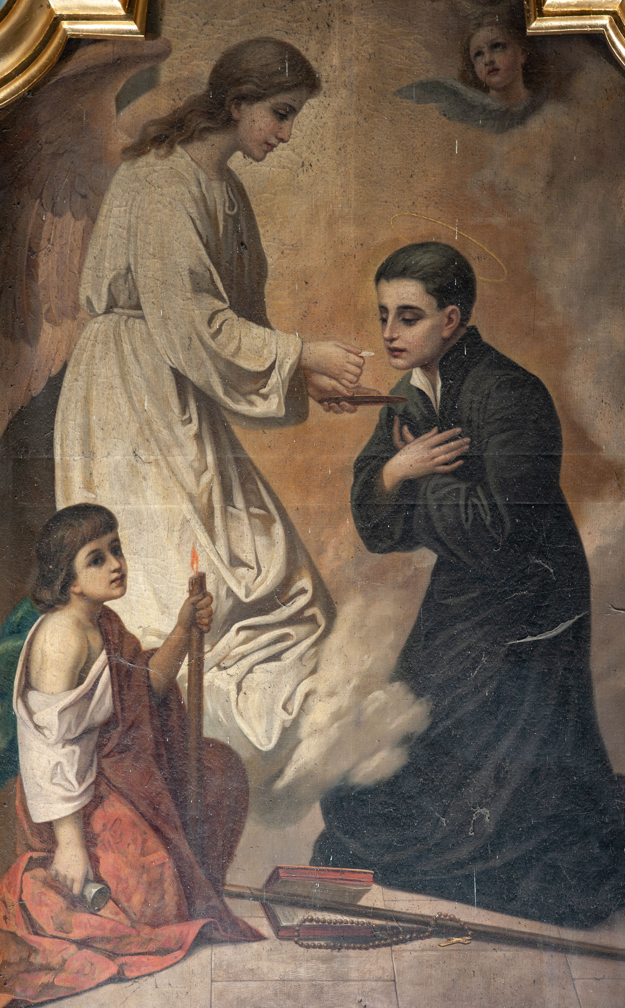 Omawiany obraz przedstawia epizod z życia św. Stanisława Kostki. Gdy święty odbierał naukę w Wiedniu zapadł w chorobę, podczas której miał mistyczne wizje. W jednej z nich ukazała mu się św. Barbara z dwoma aniołami, aby dać mu Komunię Świętą. Omawiany obraz przedstawia zredukowaną wersję tej sceny, ukazując samą komunię anielską.
