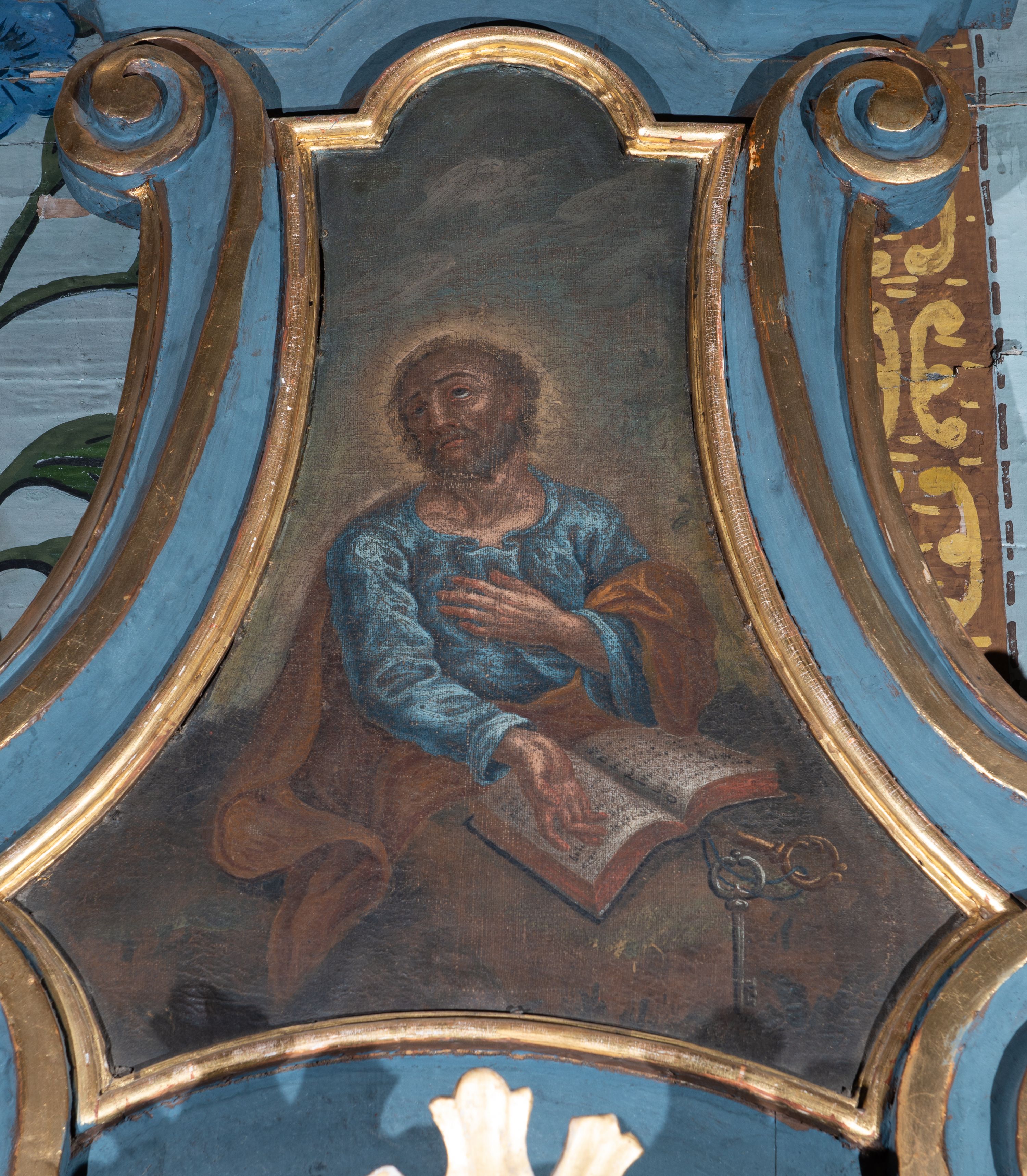 Konfesjonał ustawiony na dwustopniowej podstawie na planie półowalu. Złożony z siedziska z wysokim zapleckiem, zakończonym gzymsem wyłamanym po bokach, dekorowanym kartuszem, ze zwieńczeniem. Siedzisko ujęte dwiema ściankami bocznymi, w górnej połowie przyjmującymi fantazyjną formę rysowaną przez spływy wolutowe, z prześwitami z kratownicą. W partii przedpiersia wypukłe drzwiczki zakończone profilowanym gzymsem. Zaplecek ujęty dwiema ściankami tylnymi w formie spływów wolutowych opadających na półfilary z wazonikami. Zwieńczenie w kształcie zbliżonym do trapezu, flankowane przez spływy wolutowe, zamknięte fragmentem gzymsu przyjmującym formę łuku odcinkowego nadwieszonego, zwieńczonego dużą muszlą. W polu obraz św. Piotra ujęty profilowaną ramą, w kształcie zbliżonym do zwieńczenia. Struktura polichromowana w kolorze niebieskim, profile i ornamentyka złocone, detal srebrzony.