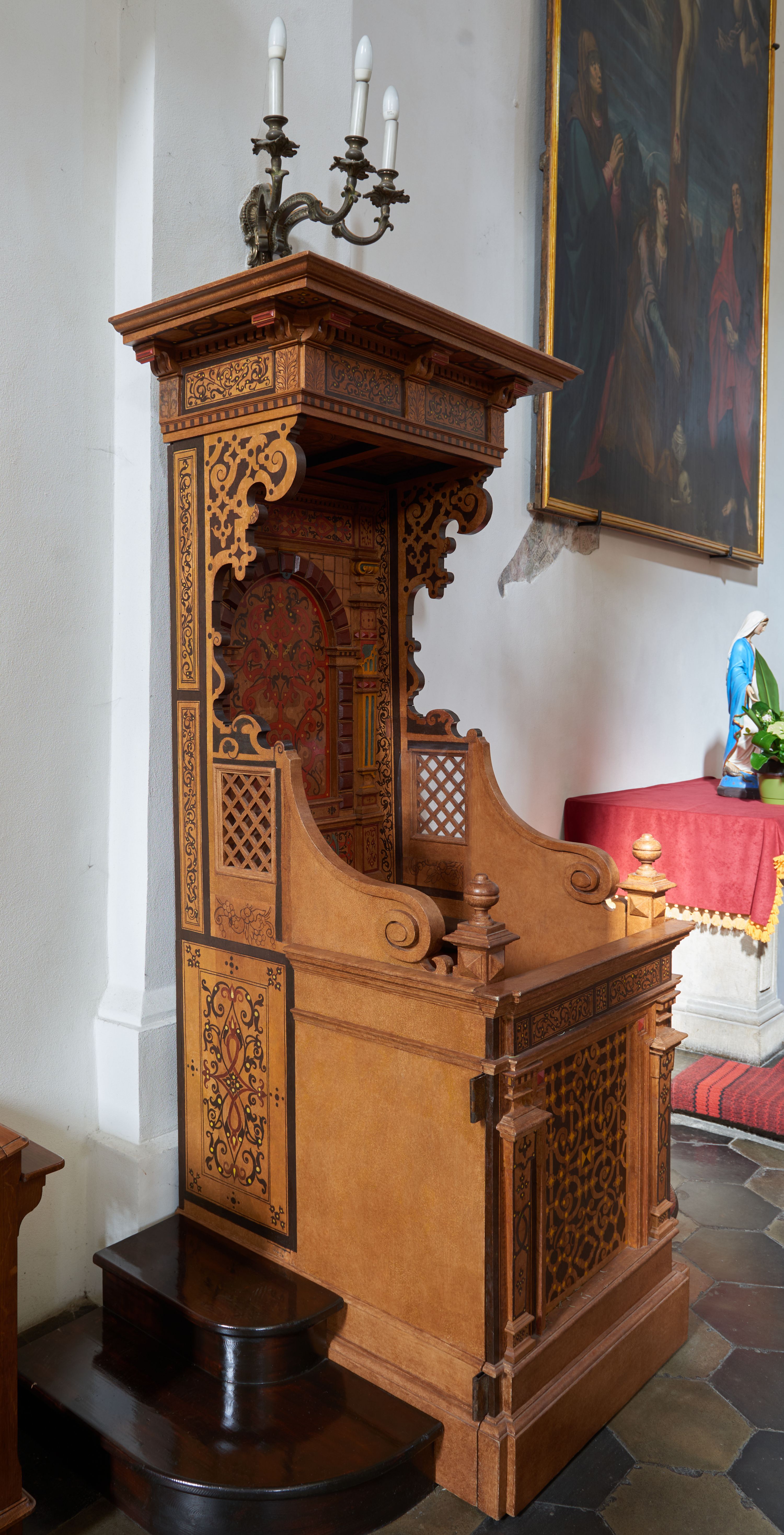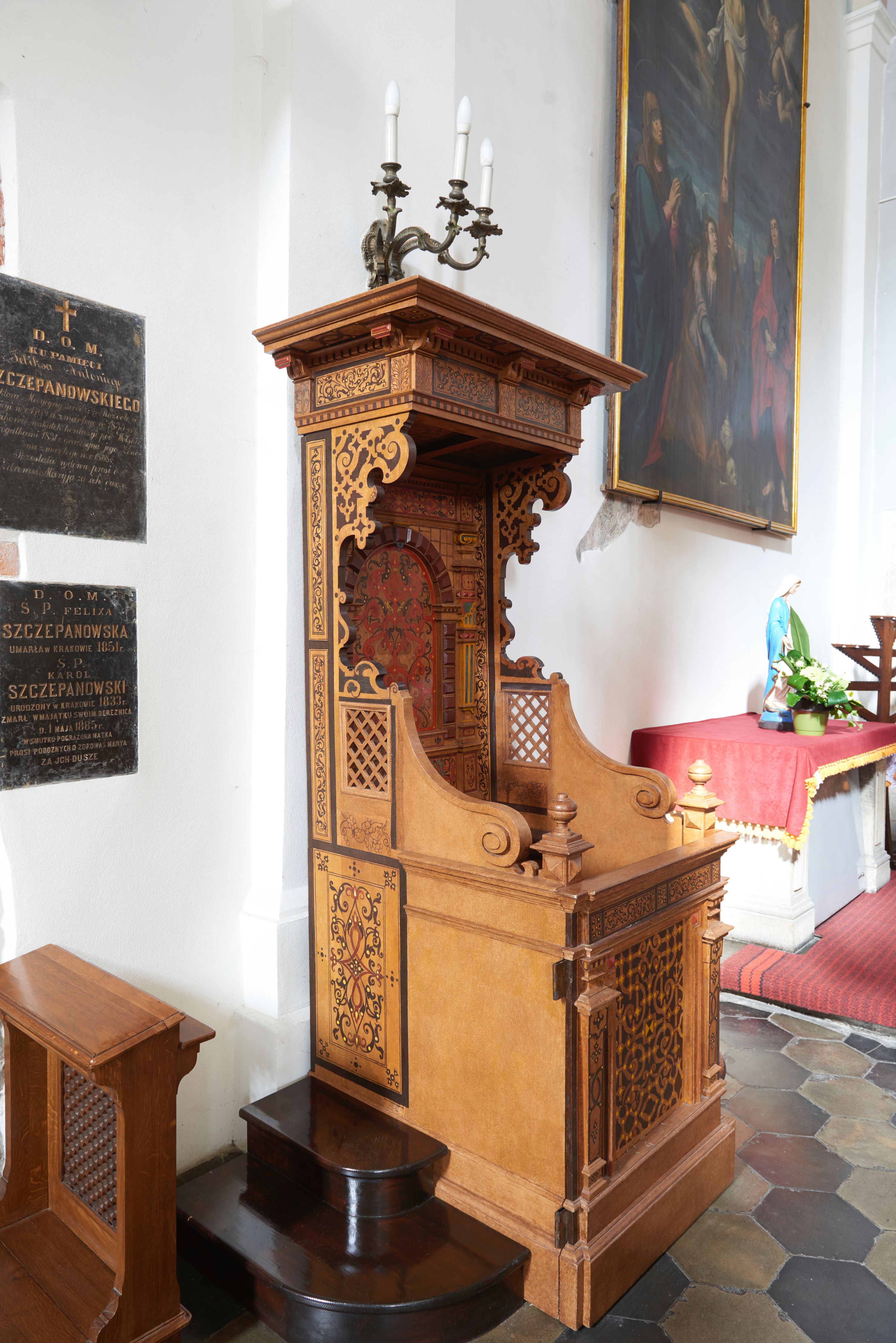 Konfesjonał typu architektonicznego na niskim cokole, o prostokątnym korpusie, ze zwieńczeniem w formie baldachimu. Na drzwiczkach płycina w kształcie zbliżonym do prostokąta, wypełniona symetrycznym ornamentem okuciowym z zaznaczonymi nitami, rozchodzącym się od centralnie umieszczonego rautu. Płycina jest flankowana tej samej wysokości pilastrami hermowymi z dekoracjami o motywach okuciowych i floralnych, które podtrzymują pełne belkowanie z fryzem z maureskową wicią roślinną. Ścianki boczne korpusu kontynuują podziały poziome drzwiczek. Są w przedniej części gładkie, a bliżej pleców dekorowane płycinami w kształcie stojącego prostokąta wypełnionymi czerwono-czarną maureską. Na lewej ściance dekoracja jest przesunięta ku przodowi i poprzedzona podziałami geometrycznymi, lecz jest częściowo ucięta. Powyżej poziomu drzwiczek kratownice, które sięgają połowie wysokości zaplecka i przechodzą ku frontowi w spływy wolutowe dochodzące do niewysokich cokołów z gzymsami i gałkami. Ścianki boczne zwężają się i rozszerzają w kierunku baldachimu ukazując szeroki, fantazyjnie wycięty, wklęsło-wypukły, zaczerniony profil. Przy tylnej krawędzi ścianki dekoruje wąski pas dzielonego na fragmenty ornamentu maureskowego, poniżej kratownicy na lewej ściance widoczny jest niewielki rysunek przypominjącym kiść owoców, kratownica na prawej ściance od dołu ujęta jest większym rysunkiem z motywem floralnym. Powyżej kratownic motyw okuciowy. Części dekoracji oddzielają szerokie, czarne ramy. Zaplecek o rozbudowanej dekoracji - cokół dźwigający ujętą boniowaniem niszę flankowaną pilastrami podtrzymującymi pełne belkowanie. Płycina centralnej części cokołu wypełniona jest ornamentem rollwerkowym w kolorach czerwonym i zielonym oraz fragmentami czarnej wici maureskowej. Cokoły pilastrów plakietami z czerwoną maureską. W niszy rozbudowany ornament okuciowy utworzony z szerokich, czerwonych taśm z żółtymi nitami, przez który przewleczono czarną wić. Boniowanie ciemnobrązowe, dość silnie wysunięte. Pilastry o skomplikowanym kształcie, wklęsło-wypukłe w dolnej części, poprzedzielane fragmentami gzymsu, z równoległymi żłobieniami w kolorach żółtym i niebieskim, rautami na belkowaniu, wklęskami i fragmentami głowic inspirowanymi jońskimi. Na belkowaniu w części środkowej ornament okuciowy w kolorze czerwonym połączony z czarną wicia maureskową. Zwieńczenie w formie baldachimu złożonego z belkowania zakończonego profilowanym, silnie wysuniętym gzymsem. Fryz stanowią naprzemiennie ułożone większe fragmenty wici maureskowej i mniejsze, pojedyncze liście akantu. Zdobiony od dołu okuciami gzyms podtrzymują wklęsło-wypukłe kroksztyny, między którymi biegnie wąski pas ornamentu kostkowego.