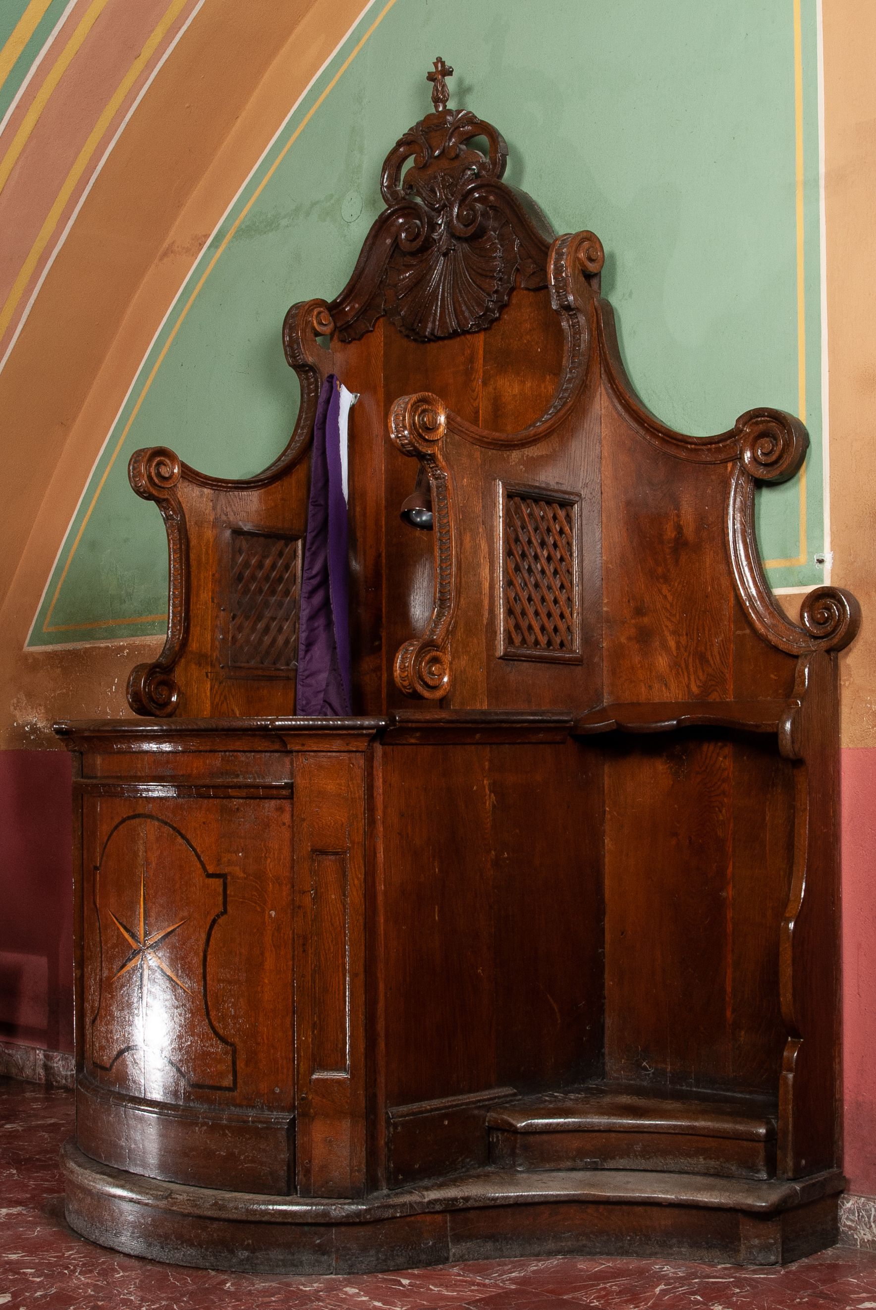 Konfesjonał późnobarokowy z połowy XVIII wieku. Konstrukcja konfesjonału nawiązuje do stylu epoki, zarówno w partii podstawy o charakterystycznym dla baroku łuku wklęsło-wypukłym, jak i w partii zwieńczenia ścianek bogato dekorowanych ślimacznicami, wolutami i muszlą palmetową. Nazwa konfesjonał wywodzi się od łacińskiego słowa „confiteri”, tzn. „wyznawać, spowiadać się”. Obecna forma konfesjonału, z kratą w części bocznej została rozpowszechniona po soborze trydenckim dzięki staraniom św. Karola Boromeusza.