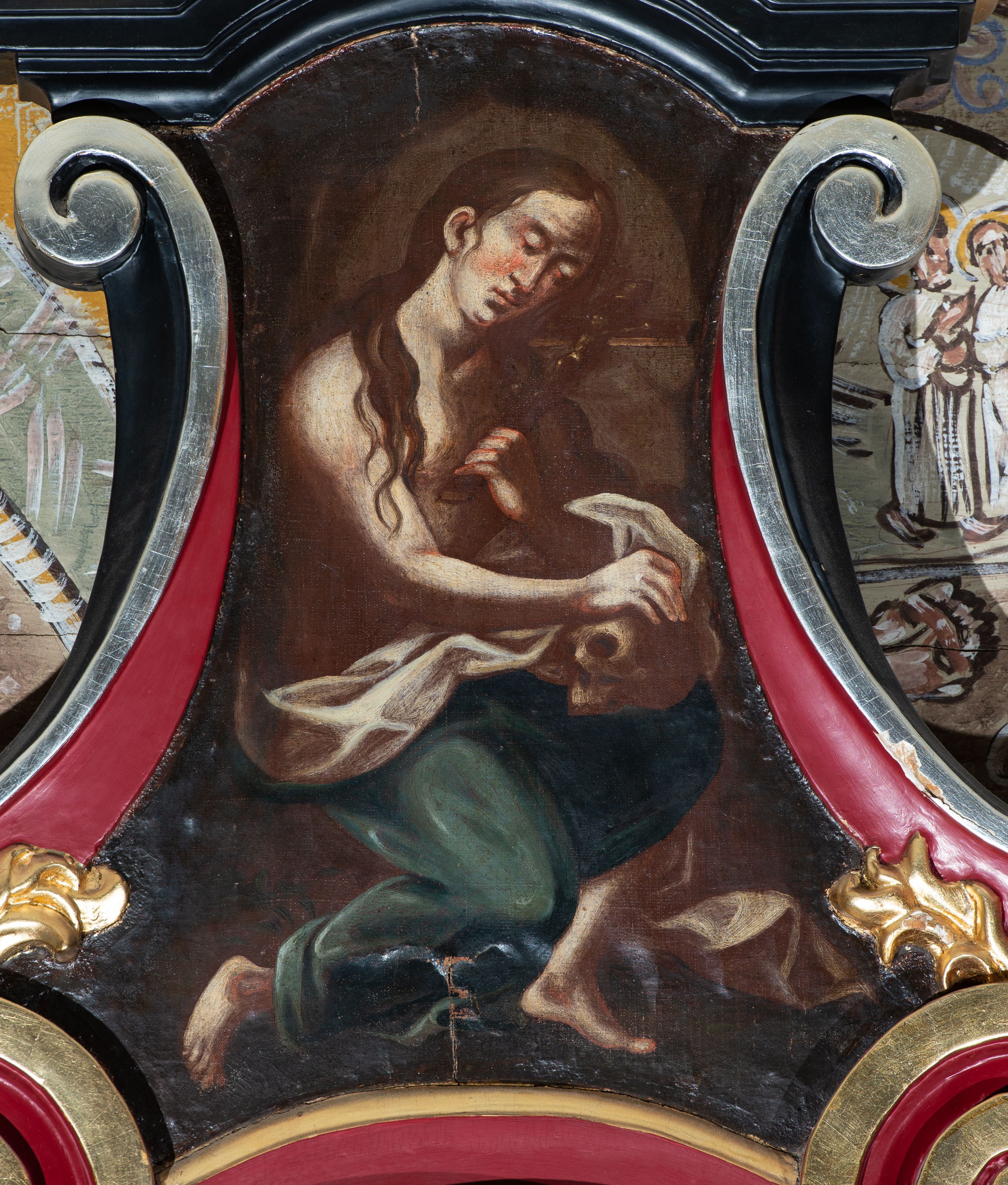Obraz św. Marii Magdaleny w kształcie wklęsło-wypukłym. W centrum kompozycji całopostaciowe przedstawienie świętej, zwróconej trzy czwarte w lewo w pozycji siedzącej, z głową przechyloną na lewe ramię, z prawą stopą cofniętą do tyłu. Święta Maria Magdalena w lewej dłoni trzyma krucyfiks, który przybliża do twarzy, a prawą wspiera na położonej na lewym kolanie czaszce. Twarz podłużna z wyraźnie zaznaczonym podbródkiem, małymi ustami, długim nosem i niemal zamkniętymi oczami i silnie zarumienionymi policzkami. Włosy długie, ciemnobrązowe, opadające lokami na ramiona i piersi. Święta jest półnaga, w pasie ubrana w zielony płaszcz o białej podszewce, który jest silnie drapowany. Po lewej stronie obrazu, u dołu widoczna jest roślinność. Tło bliżej nieokreślone, przypominające wejście do groty, a dookoła obrazu ciemnobrązowe.