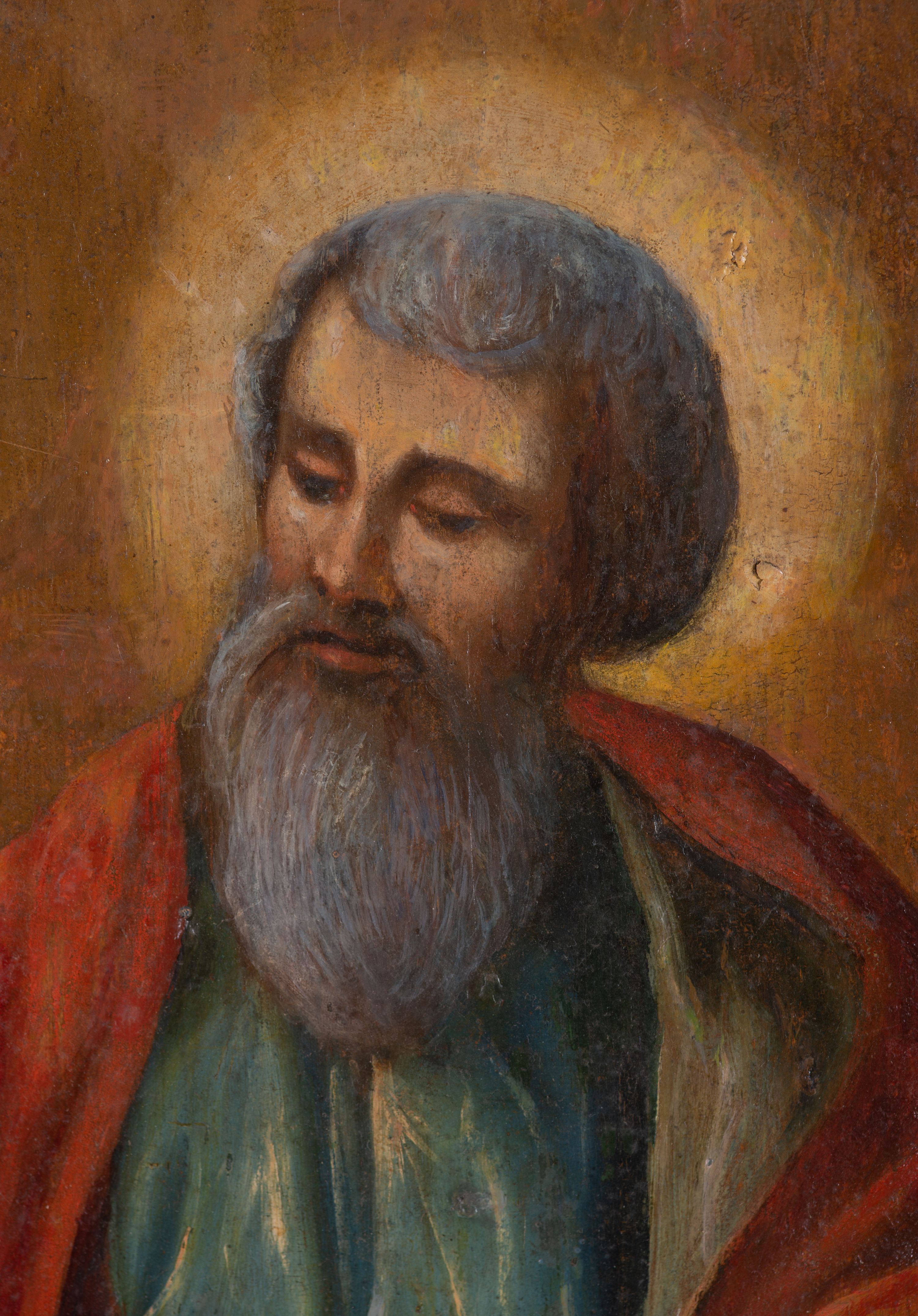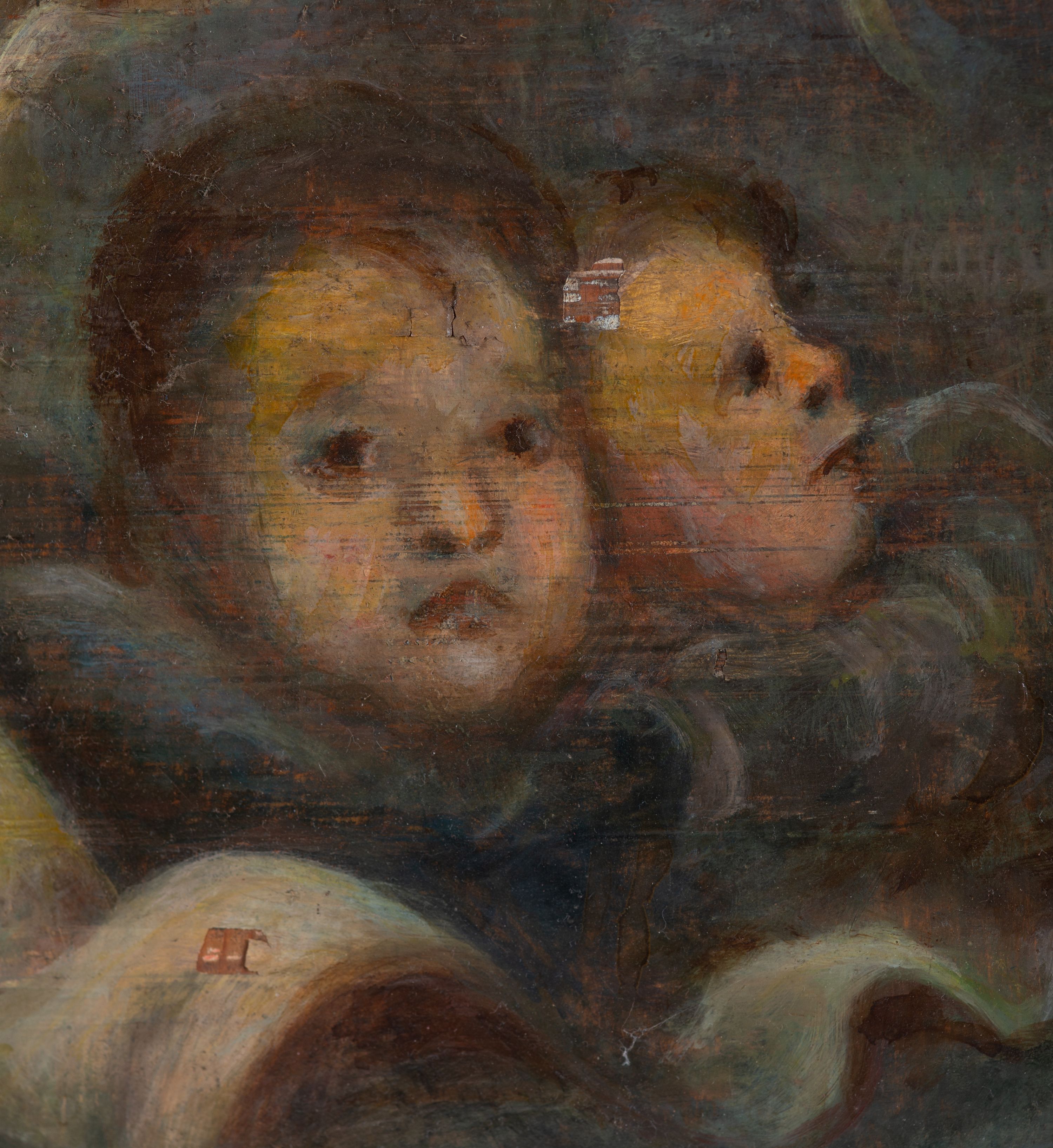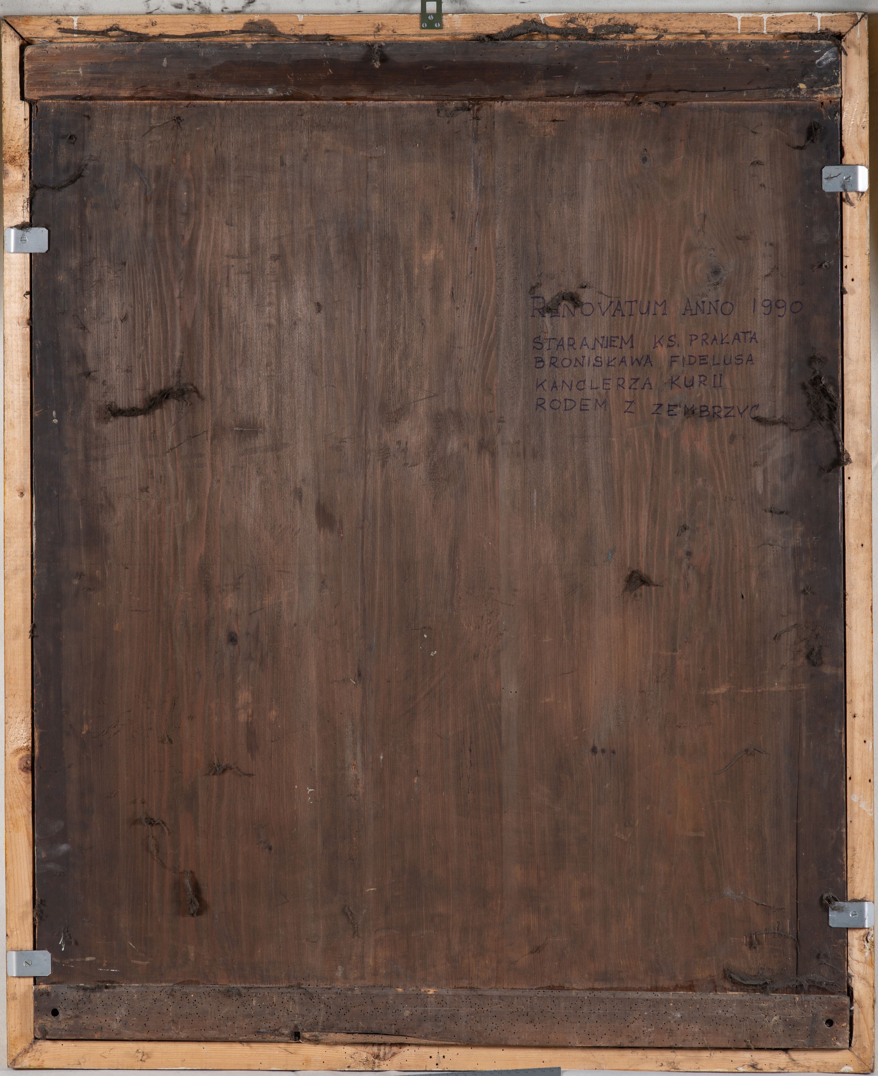 Przy krawędziach odpryski warstwy malarskiej i zaprawy, przy górnej i dolnej krawędzi widoczne poziome pęknięcia wzdłuż całego podobrazia. Na odwrociu u dołu widoczne ślady po drewnojadach.