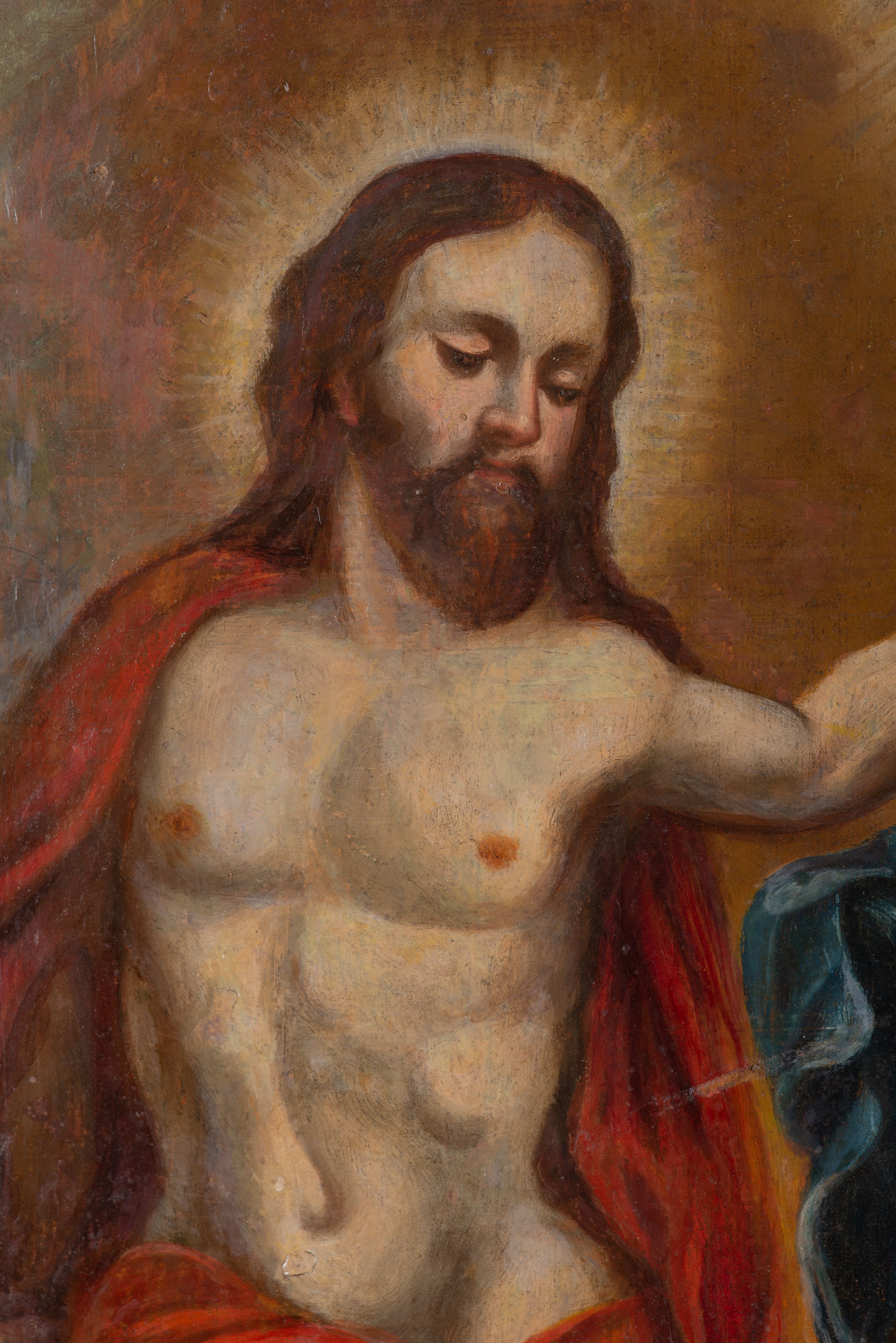 Obraz przedstawia scenę Koronacji Matki Boskiej przez Trójcę Świętą – temat, który w ikonografii sztuki europejskiej, a także polskiej pojawił się w końcu XIV wieku. W sztuce nowożytnej szczególnie charakterystyczne było rozbudowanie strefy niebiańskiej przedstawienia poprzez ukazanie obszernych partii chmur oraz uskrzydlonych główek anielskich, tak jak w omawianym dziele. W XVII wieku szczególnie popularne były różne kompozycje tego przedstawienia malarza Hermana Hana, m.in. dla kościołów Cystersów w Pelpinie i Oliwie oraz w Buczku Wielkim, a także późniejsze dzieła autorstwa naśladowców Hermana Hana. Niestety źródła archiwalne nie ujawniły autora dzieła.