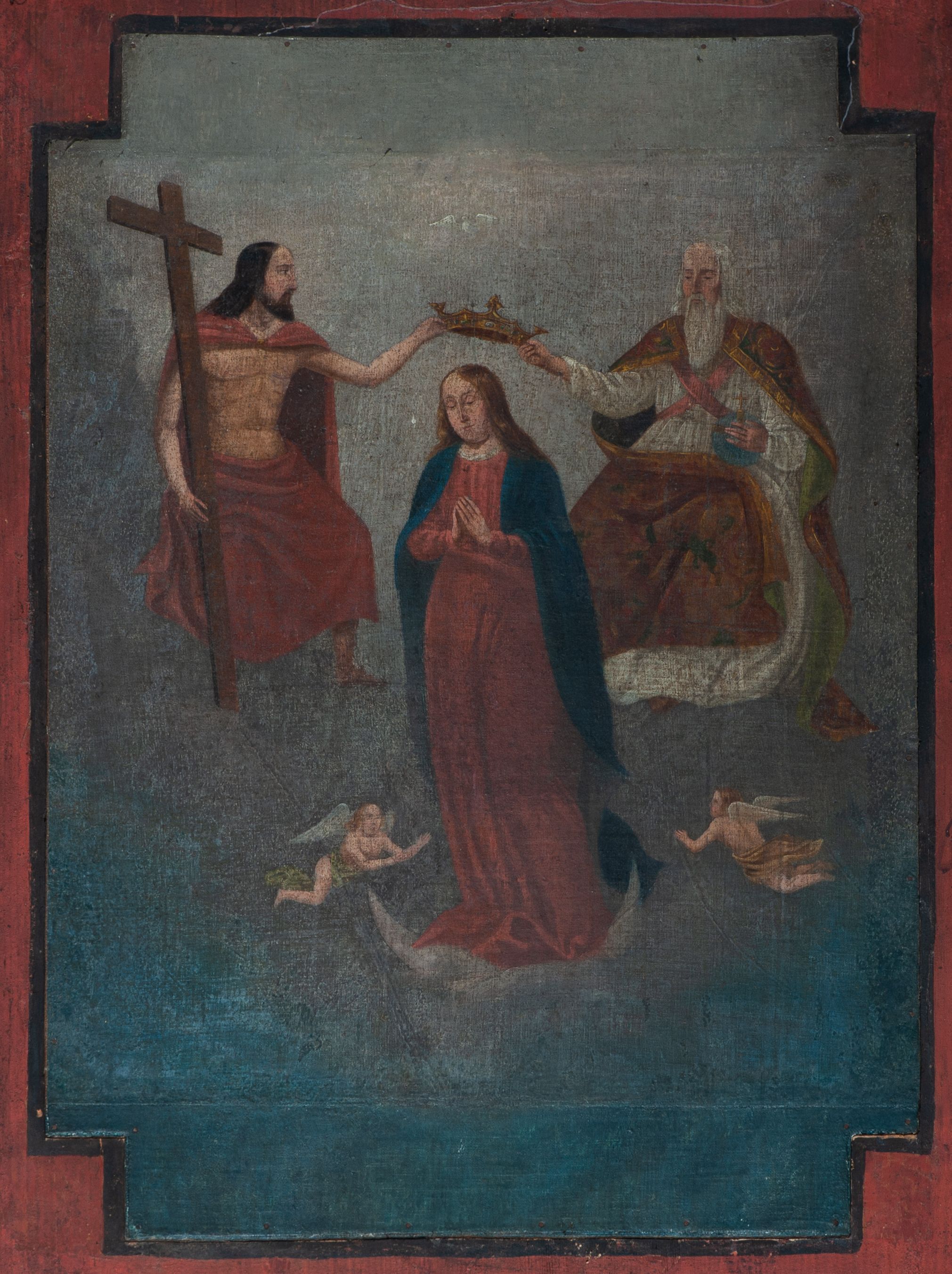 Obraz w kształcie stojącego prostokąta o wyciętych prostokątnie narożach. Pośrodku Matka Boska zwrócona en trois quarts w lewo, z dłońmi złożonymi w geście modlitwy. Maria stoi na półksiężycu, u jej stóp dwa putta. Ubrana w czerwoną suknię przepasaną w talii oraz przerzucony przez ramiona niebieski płaszcz. Po bokach Marii nieco w głębi siedzą Bóg Ojciec i Chrystus, którzy podtrzymują nad jej głową koronę otwartą. Po prawej stronie Bóg Ojciec ukazany jako starzec w białej tunice oraz czerwonym płaszczu. Po lewej Chrystus przepasany czerwonym płaszczem, podtrzymujący prawą ręką krzyż. Na głową Marii Gołębica Ducha Świętego. Scena na tle szarobłękitnego nieba. Kolorystyka przytłumiona, ściemniała, postacie podkreślone intensywnymi plamami barwnymi.