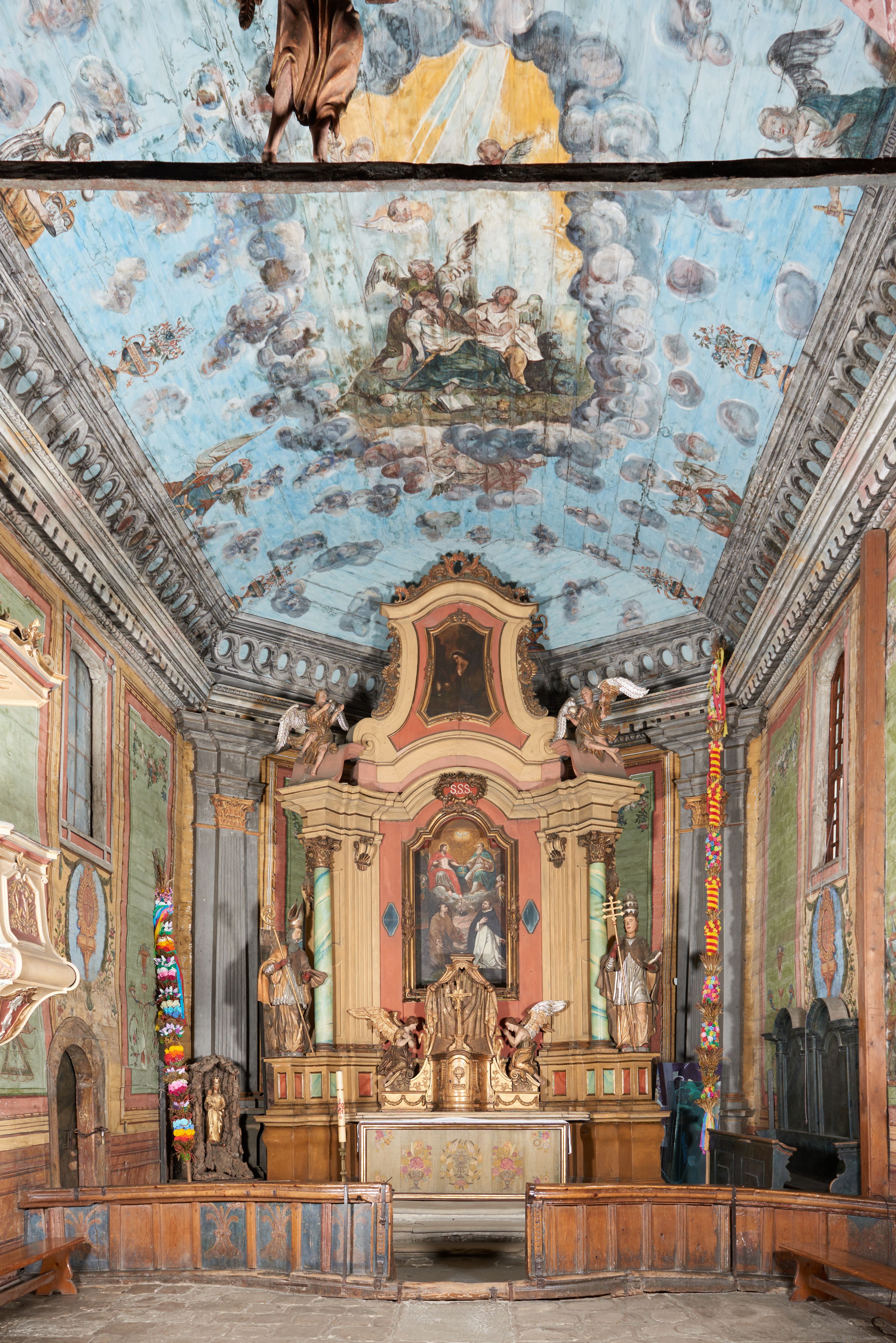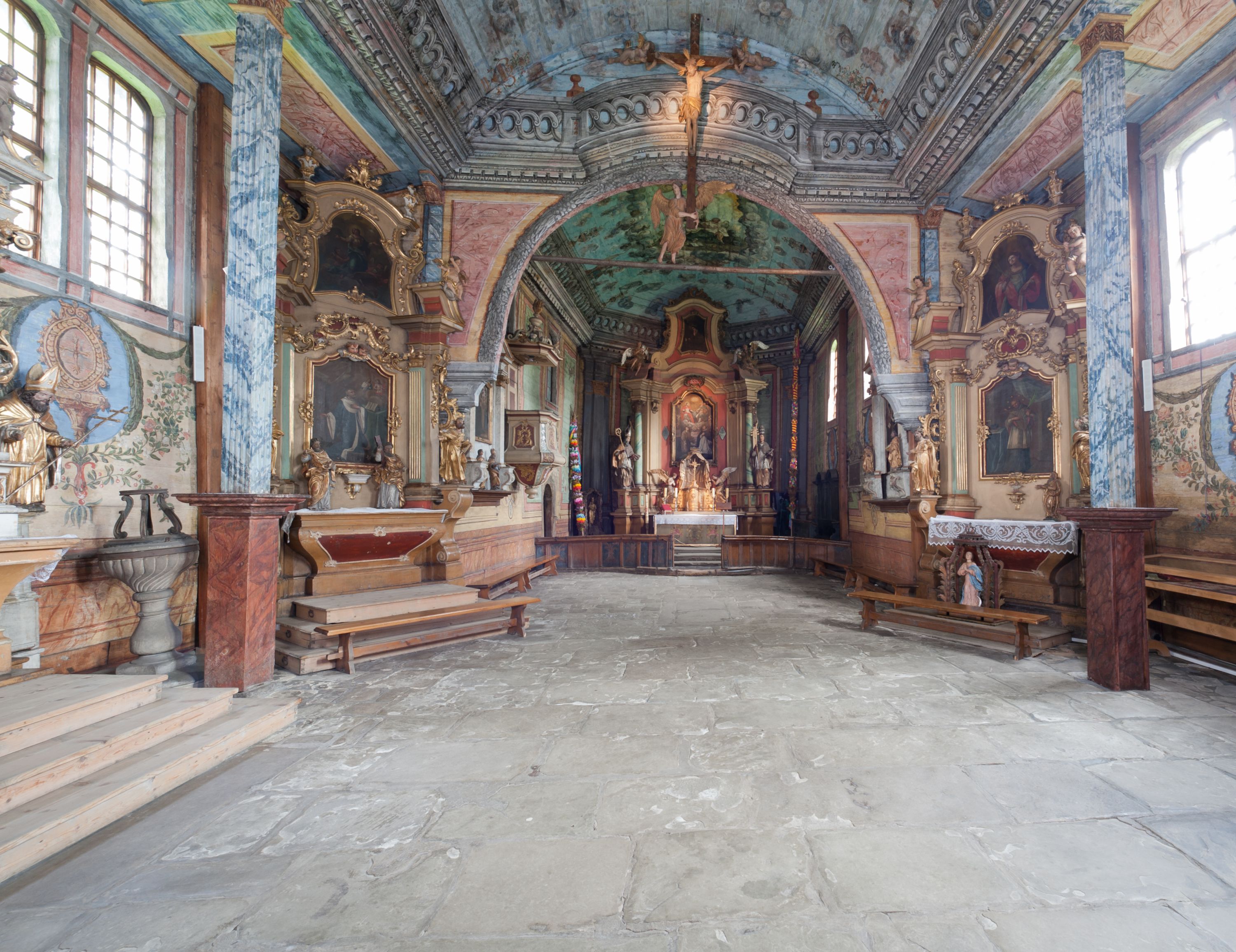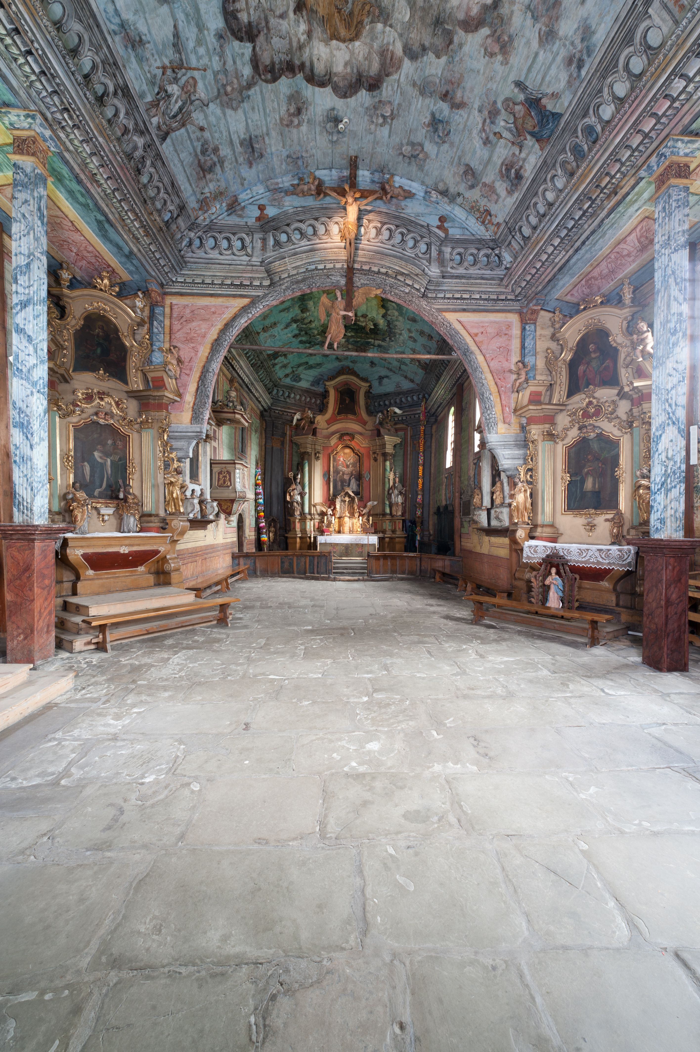 Pomiędzy nawą a prezbiterium otwór tęczowy.