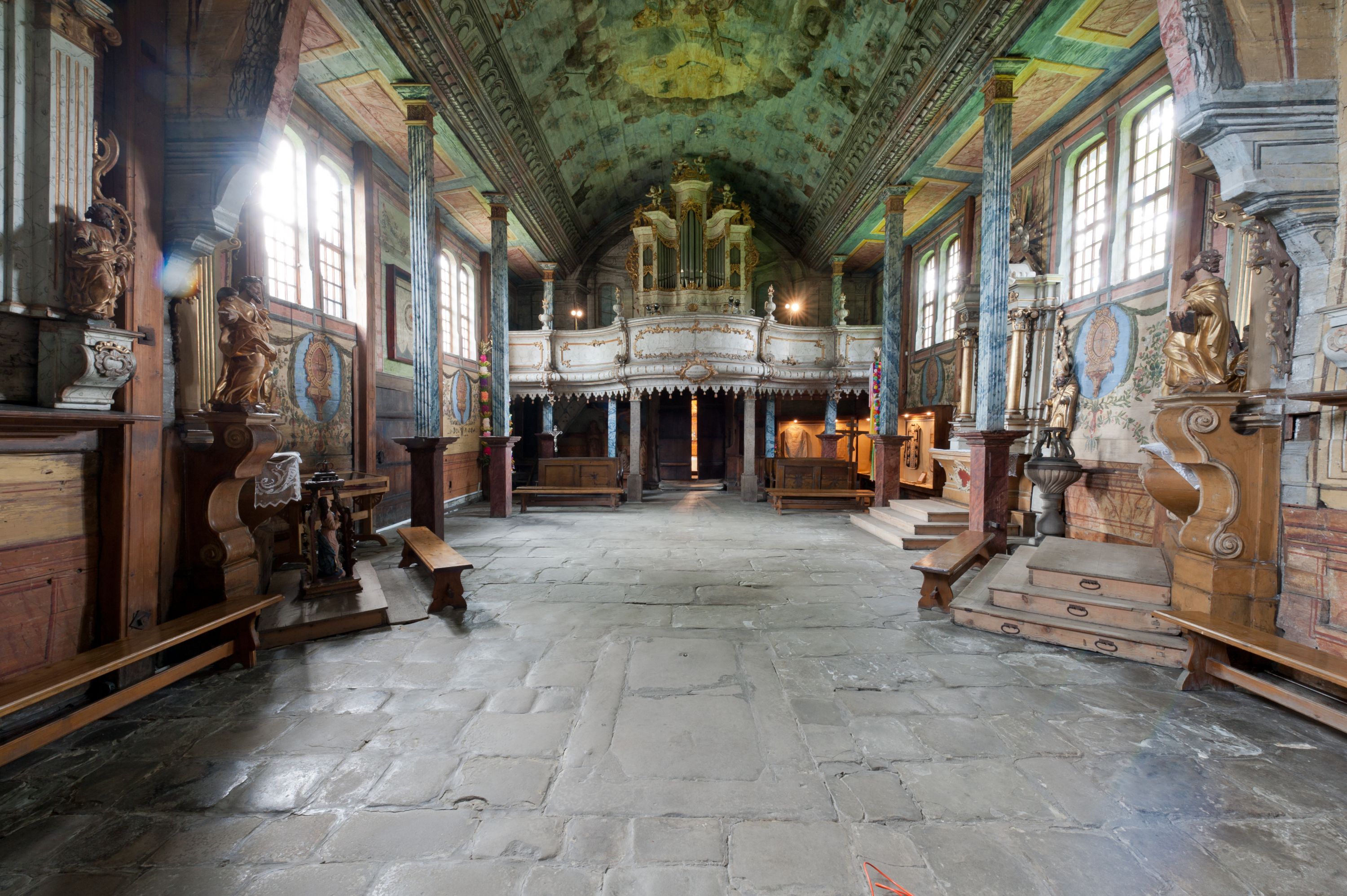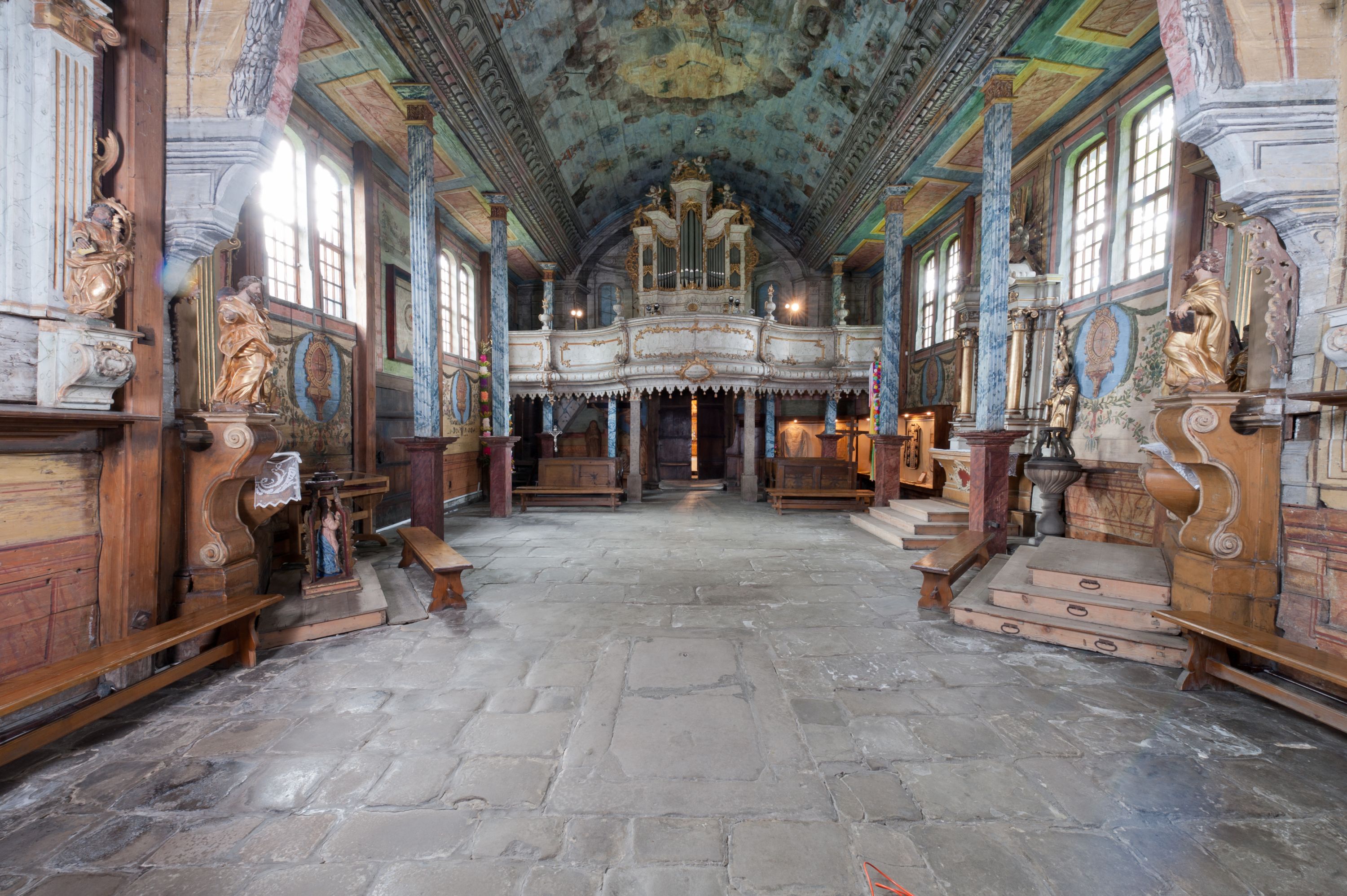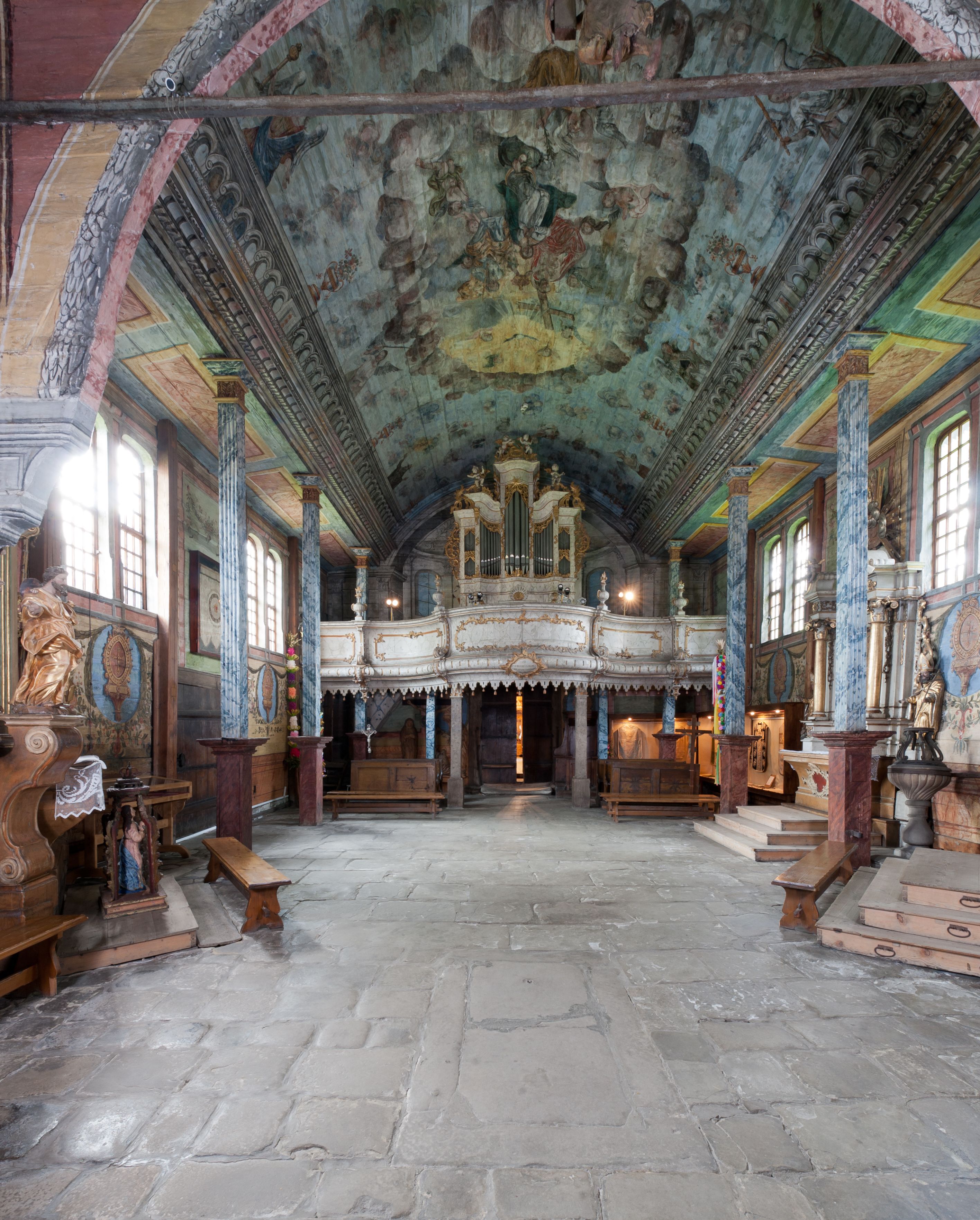 Pomiędzy nawą a prezbiterium otwór tęczowy.