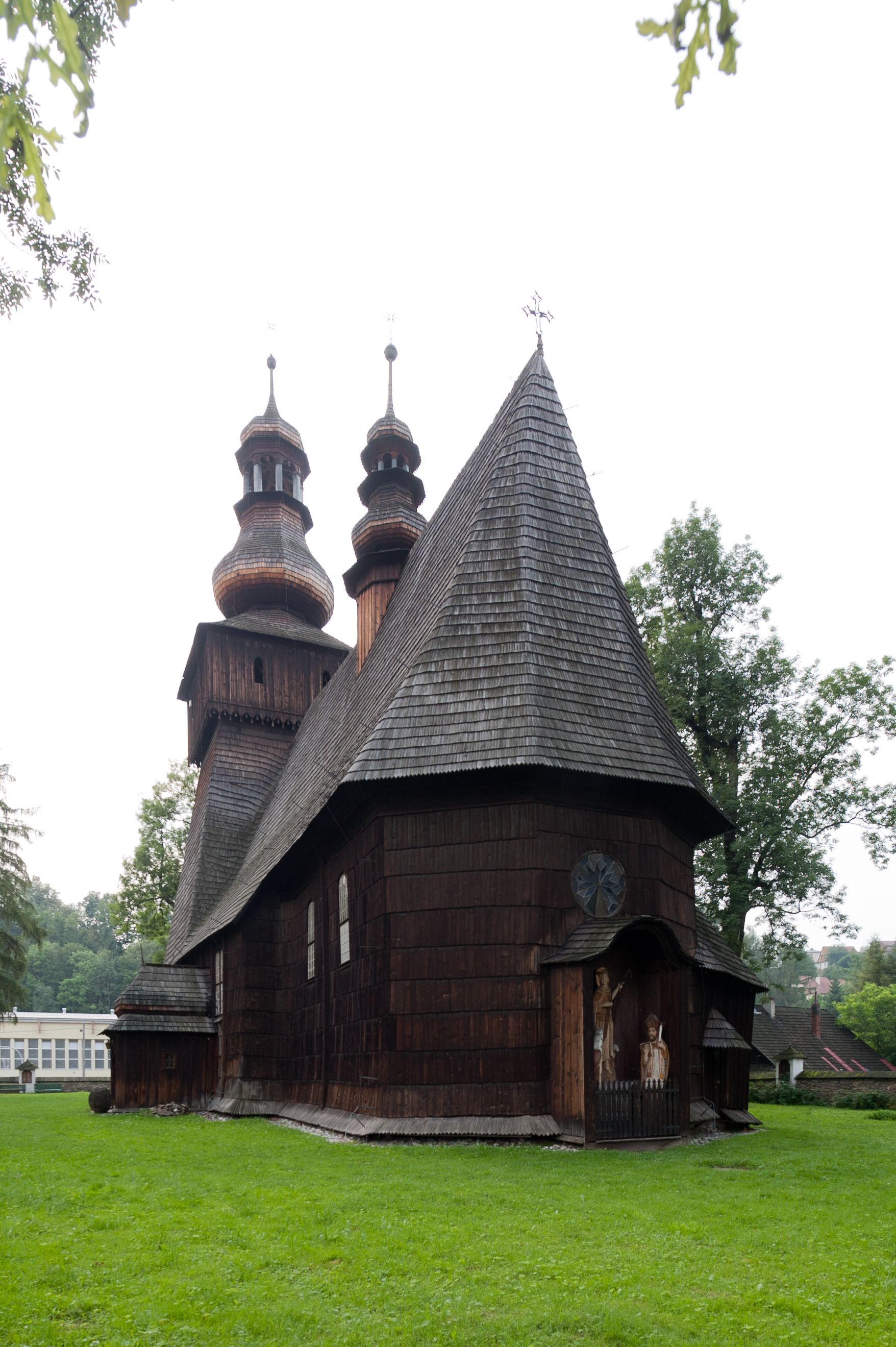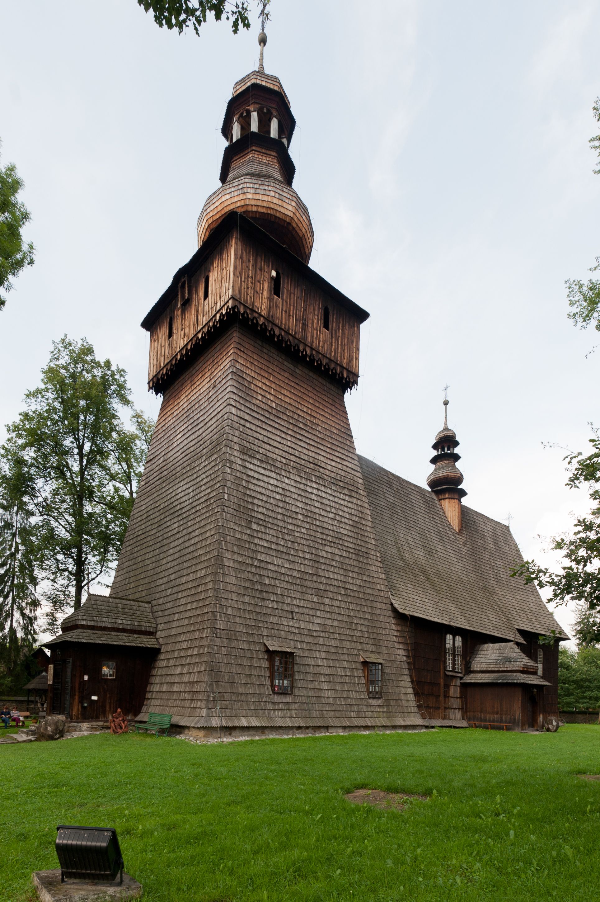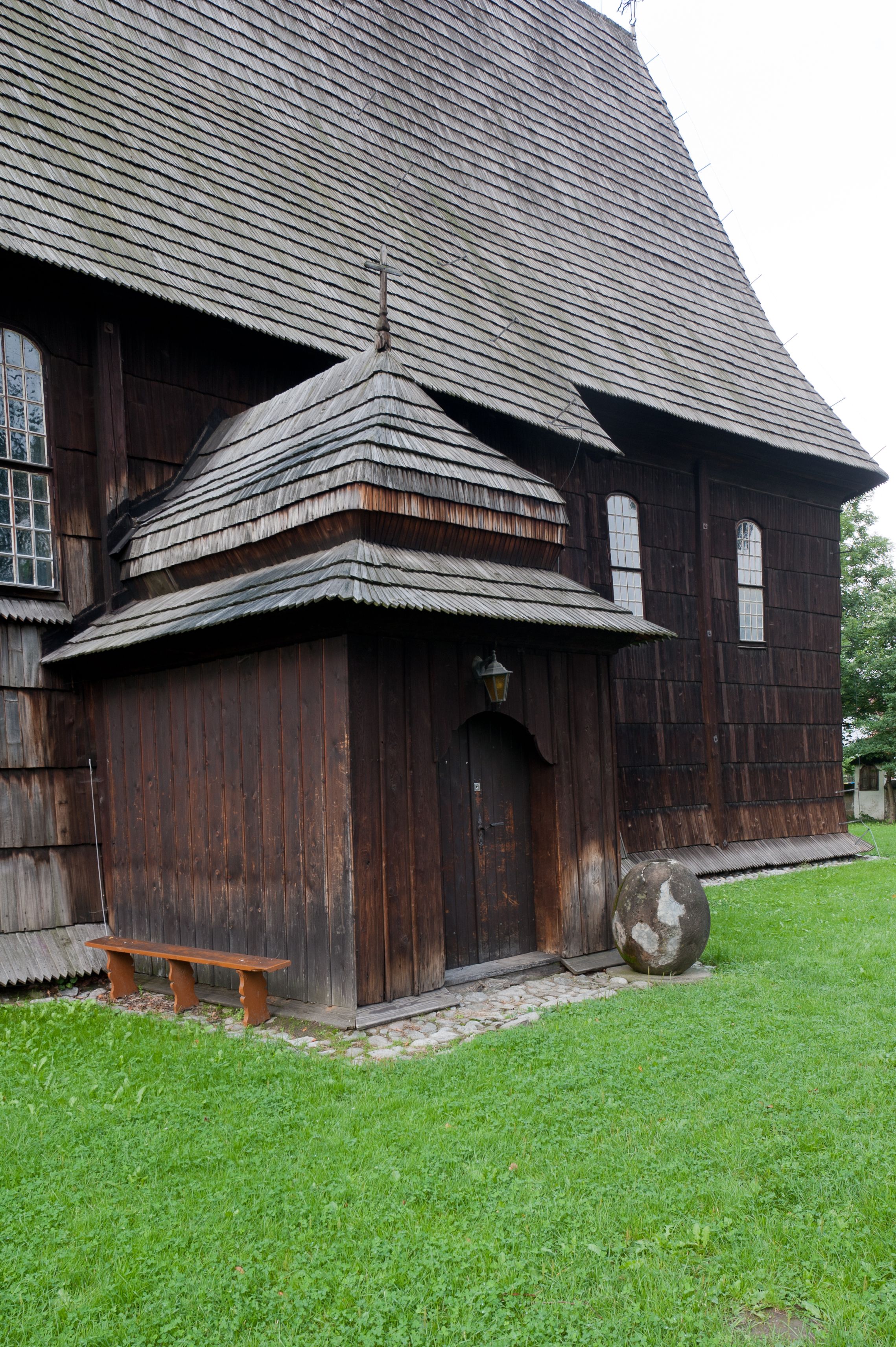Dach wyniosły, wspólny dla nawy i prezbiterium, hełm wieży cebulasty z latarnią, a w połowie długości dachu, nad nawą, wbudowana wieżyczka na sygnaturkę, wszystko kryte gontem. Kruchty nakryte osobnymi daszkami hełmowymi, baniastymi, krytymi gontem.