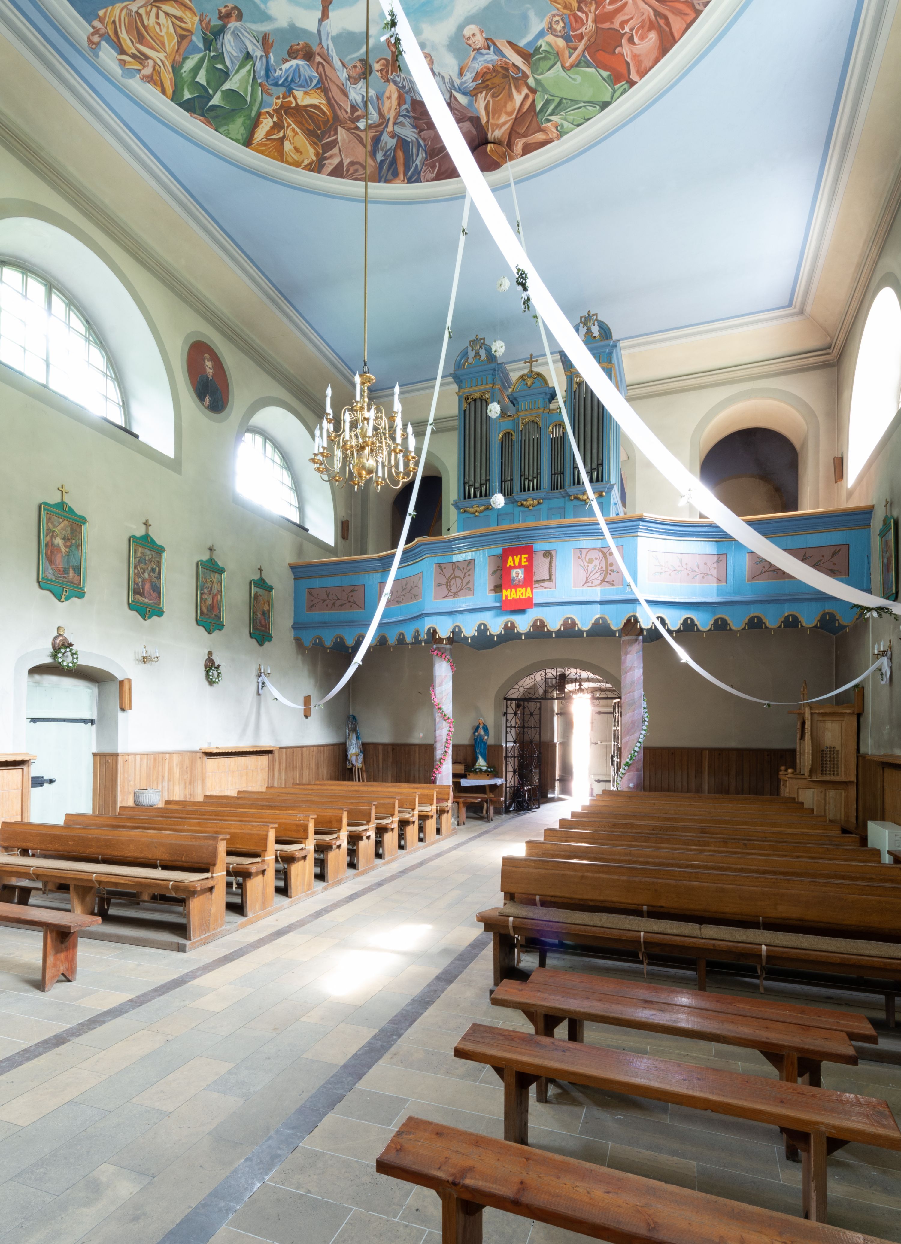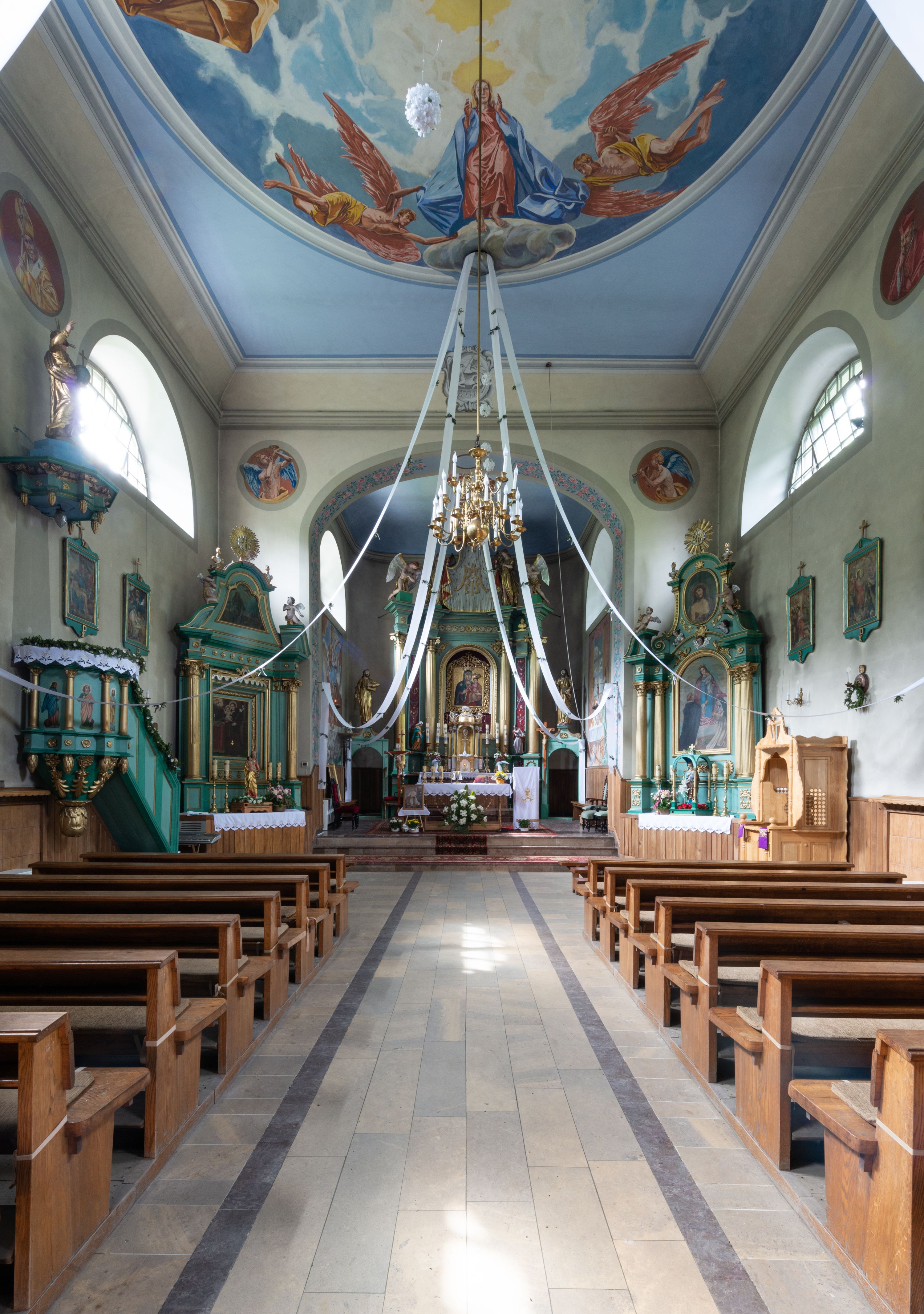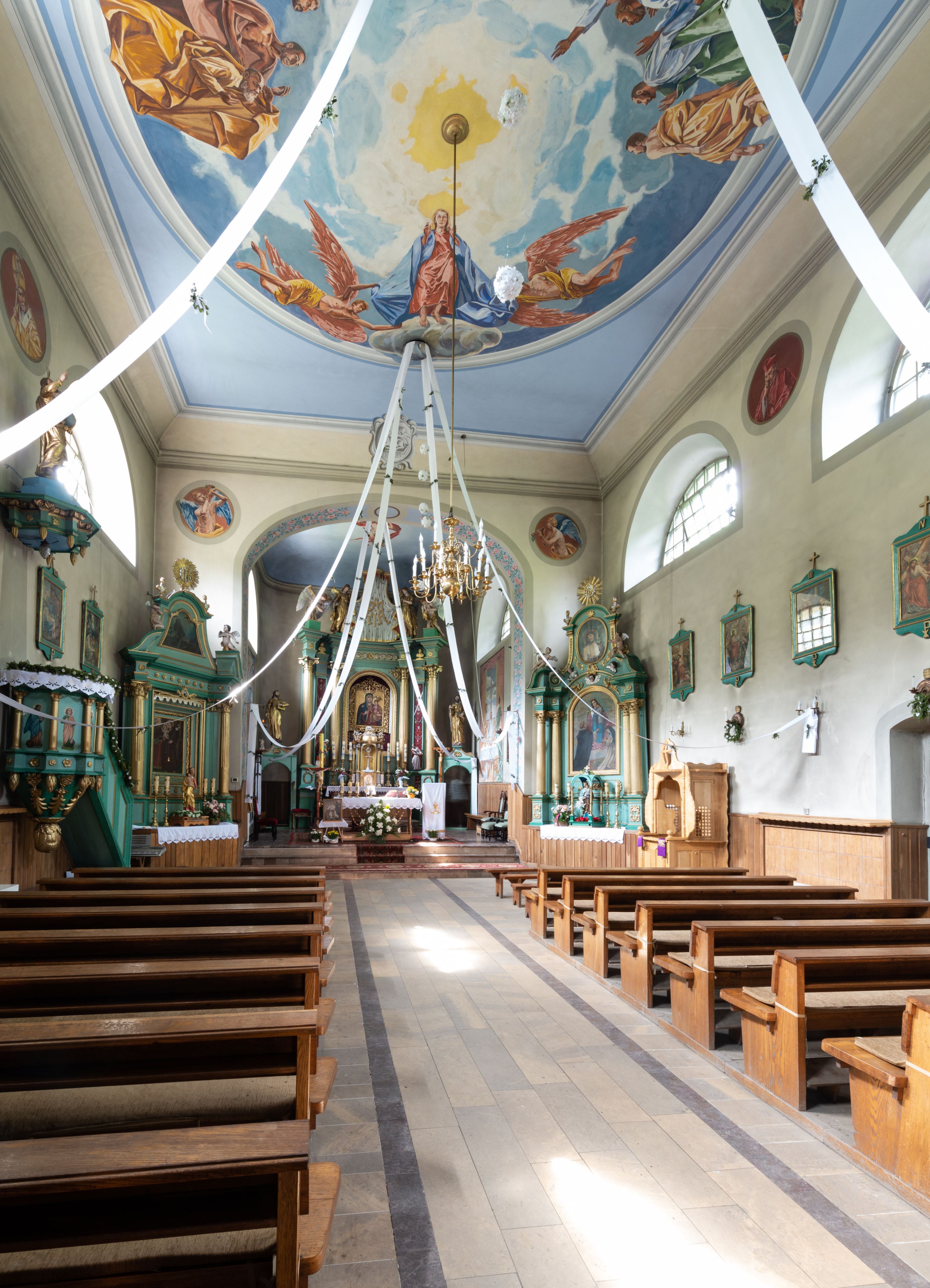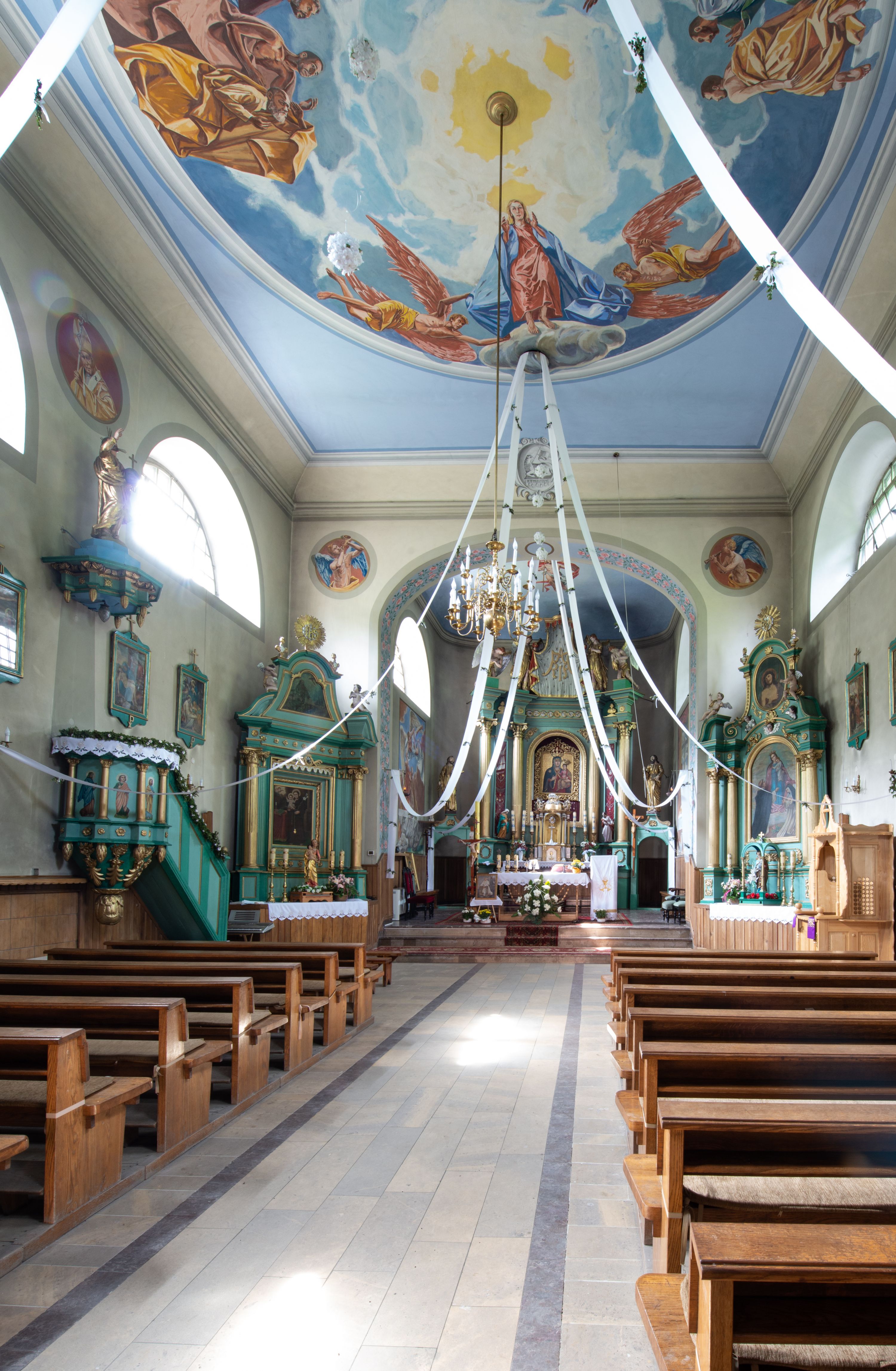 Kościół murowany, składa się z nawy i zwróconego na południe prezbiterium, do którego przylega zakrystia, nad którą znajduje się skarbiec; od północy wieża. Prezbiterium jest węższe od nawy, o zaokrąglonych narożach, oddzielone od prostokątnej nawy łukiem tęczowym. Ściany kościoła gładkie, przeprute półkolistymi oknami – dwoma w prezbiterium, sześcioma w nawie. Od zachodu chór wsparty na dwóch kolumnach, z balustradą wyłamaną na środku, dekorowaną u spodu lambrekinem. Ściany kościoła gładkie, w dolnej partii osłonięte drewnianą boazerią, z wnęką na chrzcielnicę po lewej i drugą na drzwi z prawej strony. Wnętrze przekrywają stropy – zwierciadlany w prezbiterium i płaski z fasetami w nawie. Na nich oraz w górnej partii ścian polichromia. Nad prezbiterium wizerunek zmartwychwstałego Chrystusa, nad nawą zakomponowana w kole scena adoracji Najświętszej Marii Panny przez apostołów, poniżej, na ścianach medaliony z postaciami ważnych osobistości, świętych i aniołów. Główne drzwi od północy, boczne od zachodu.