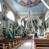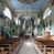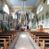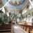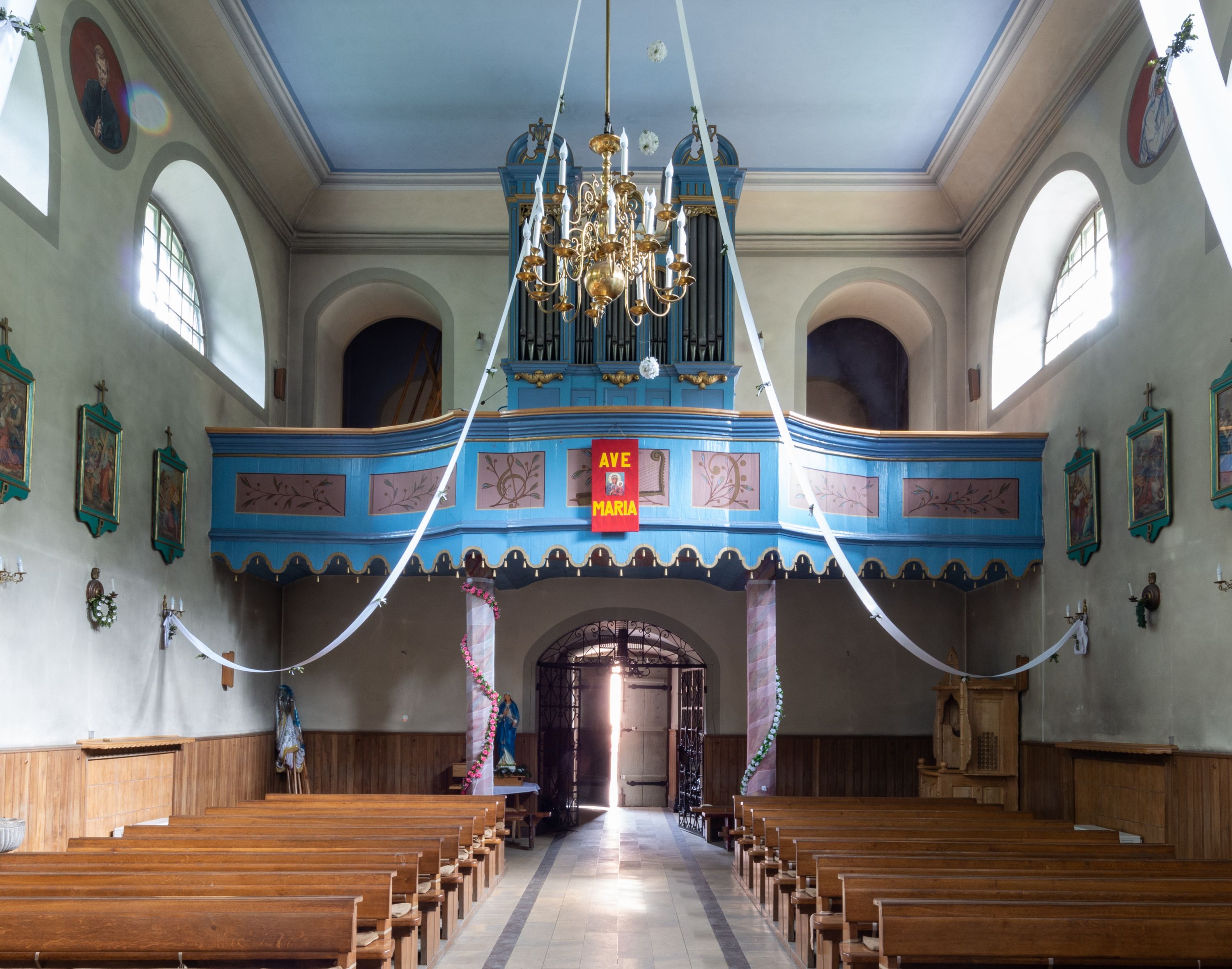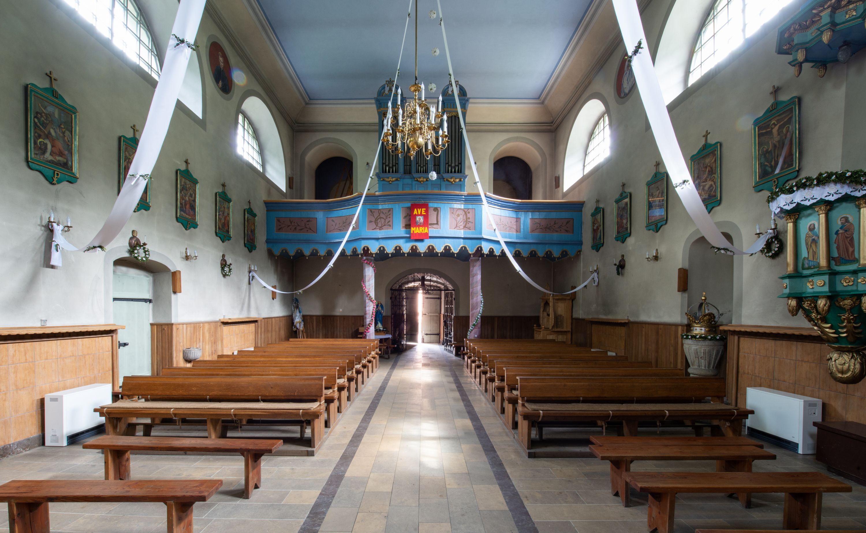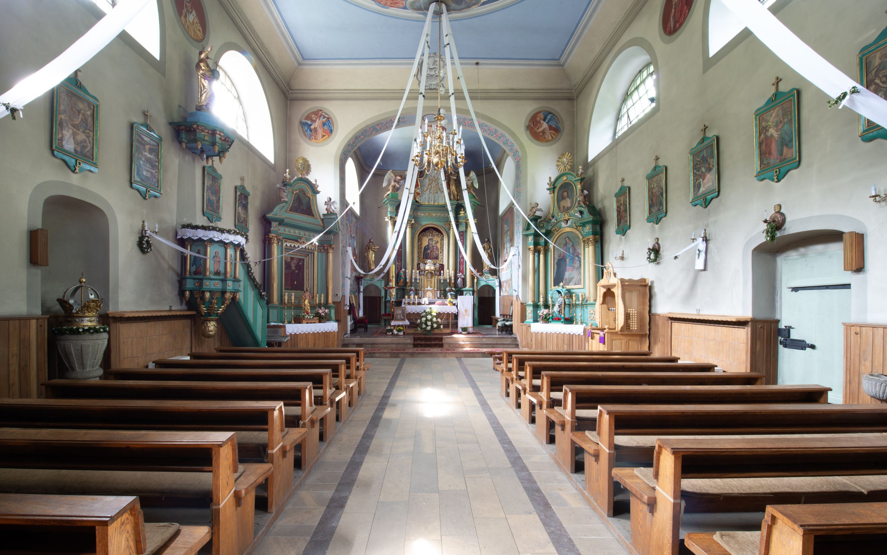 Kościół murowany, składa się z nawy i zwróconego na południe prezbiterium, do którego przylega zakrystia, nad którą znajduje się skarbiec; od północy wieża. Prezbiterium jest węższe od nawy, o zaokrąglonych narożach, oddzielone od prostokątnej nawy łukiem tęczowym. Ściany kościoła gładkie, przeprute półkolistymi oknami – dwoma w prezbiterium, sześcioma w nawie. Od zachodu chór wsparty na dwóch kolumnach, z balustradą wyłamaną na środku, dekorowaną u spodu lambrekinem. Ściany kościoła gładkie, w dolnej partii osłonięte drewnianą boazerią, z wnęką na chrzcielnicę po lewej i drugą na drzwi z prawej strony. Wnętrze przekrywają stropy – zwierciadlany w prezbiterium i płaski z fasetami w nawie. Na nich oraz w górnej partii ścian polichromia. Nad prezbiterium wizerunek zmartwychwstałego Chrystusa, nad nawą zakomponowana w kole scena adoracji Najświętszej Marii Panny przez apostołów, poniżej, na ścianach medaliony z postaciami ważnych osobistości, świętych i aniołów. Główne drzwi od północy, boczne od zachodu.
