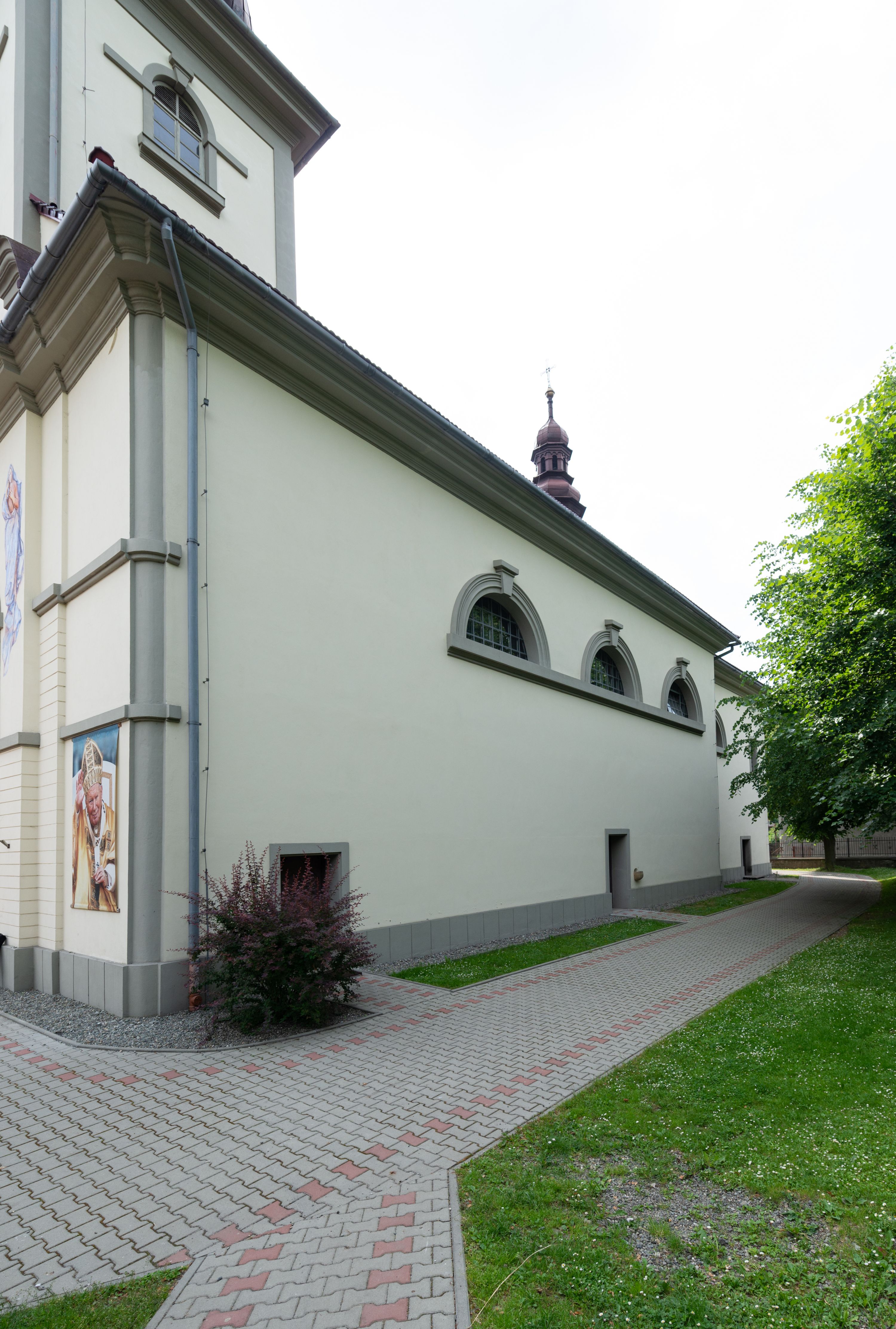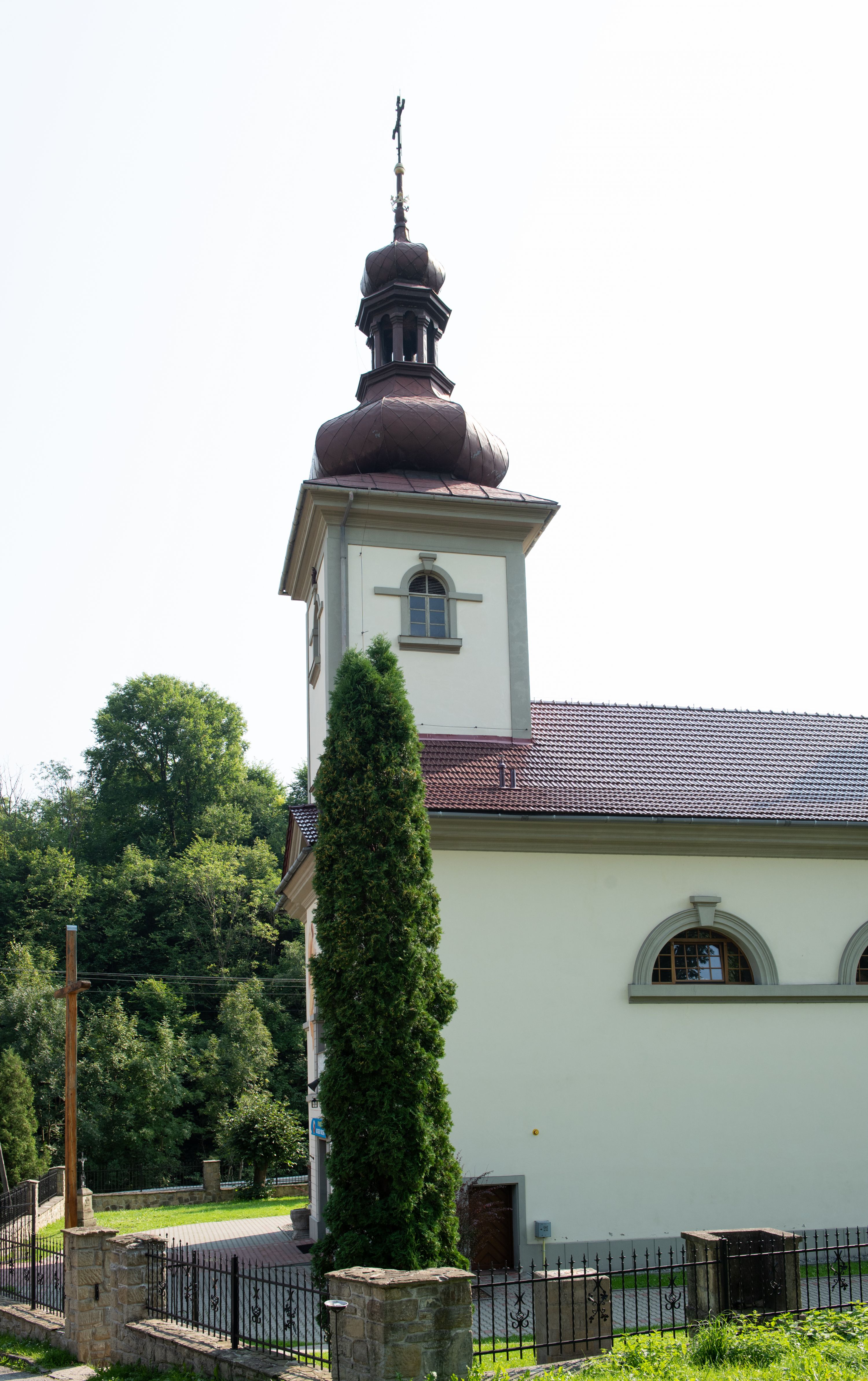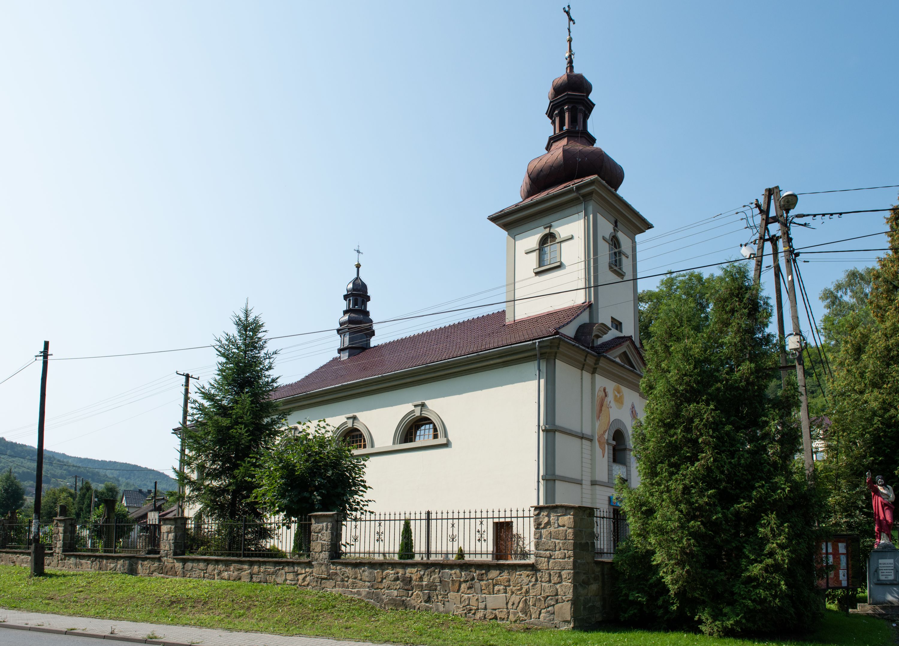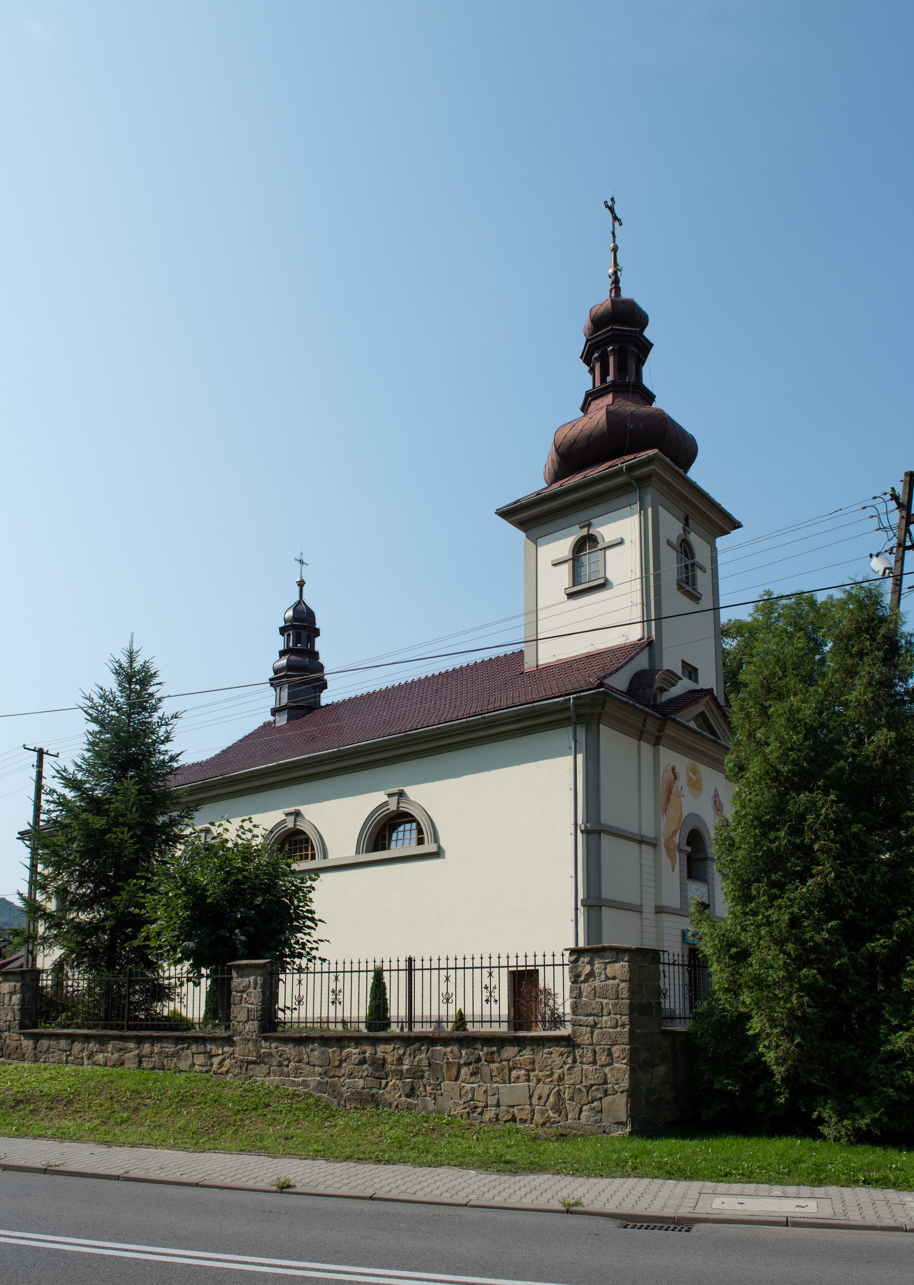 Kościół posadowiony na cokole. Elewacja frontowa ze zdwojonym ryzalitem, którego środek odpowiada szerokości wieży; podziały poziome przeprowadzone przy pomocy gzymsów. Na osi wejście i okno, oba w boniowanym obramieniu. Okno ujmuje polichromowana scena Zwiastowania. Ryzalit wieńczy trójkątny fronton. Cofnięty ryzalit w dolnej partii boniowany, wyżej gładki, zwieńczony ćwierćkolistymi fragmentami przerwanego przyczółka. Boki elewacji frontowej gładkie, zwieńczone frontonem przerwanym na masyw czworobocznej wieży przeprutej z każdej strony oknem w kształcie stojącego prostokąta zamkniętego łukiem pełnym. Elewacje boczne gładkie, przeprute półkolistymi oknami. Od wschodu poniżej okien szare płyciny, od południa, w kapliczkowej oprawie grupa Ukrzyżowania. Dach nad nawą dwuspadowy, nad prezbiterium trójspadowy, dach wieńczy baniasty hełm z latarnią zakończony krzyżem, na kalenicy barokowa wieżyczka na sygnaturkę.