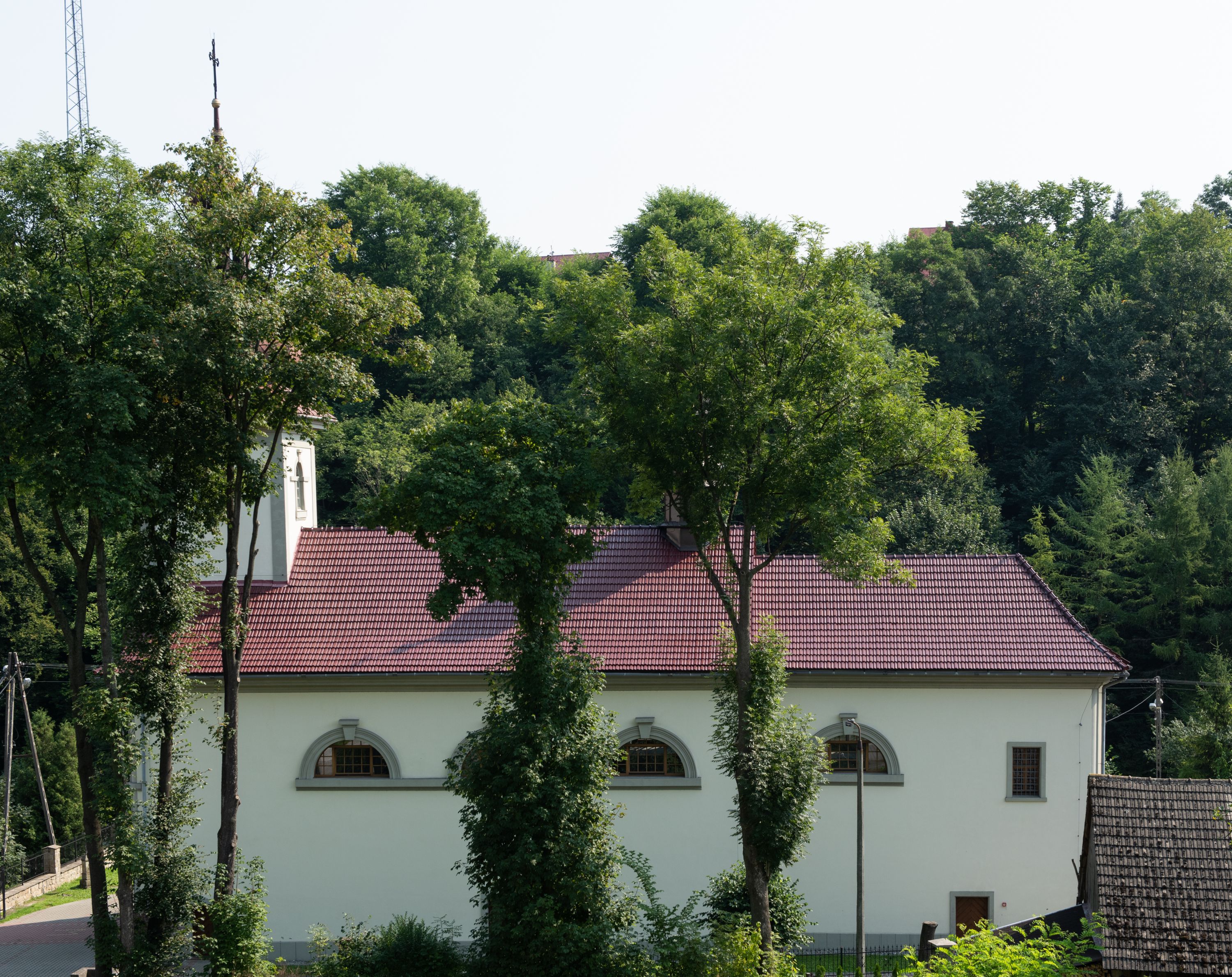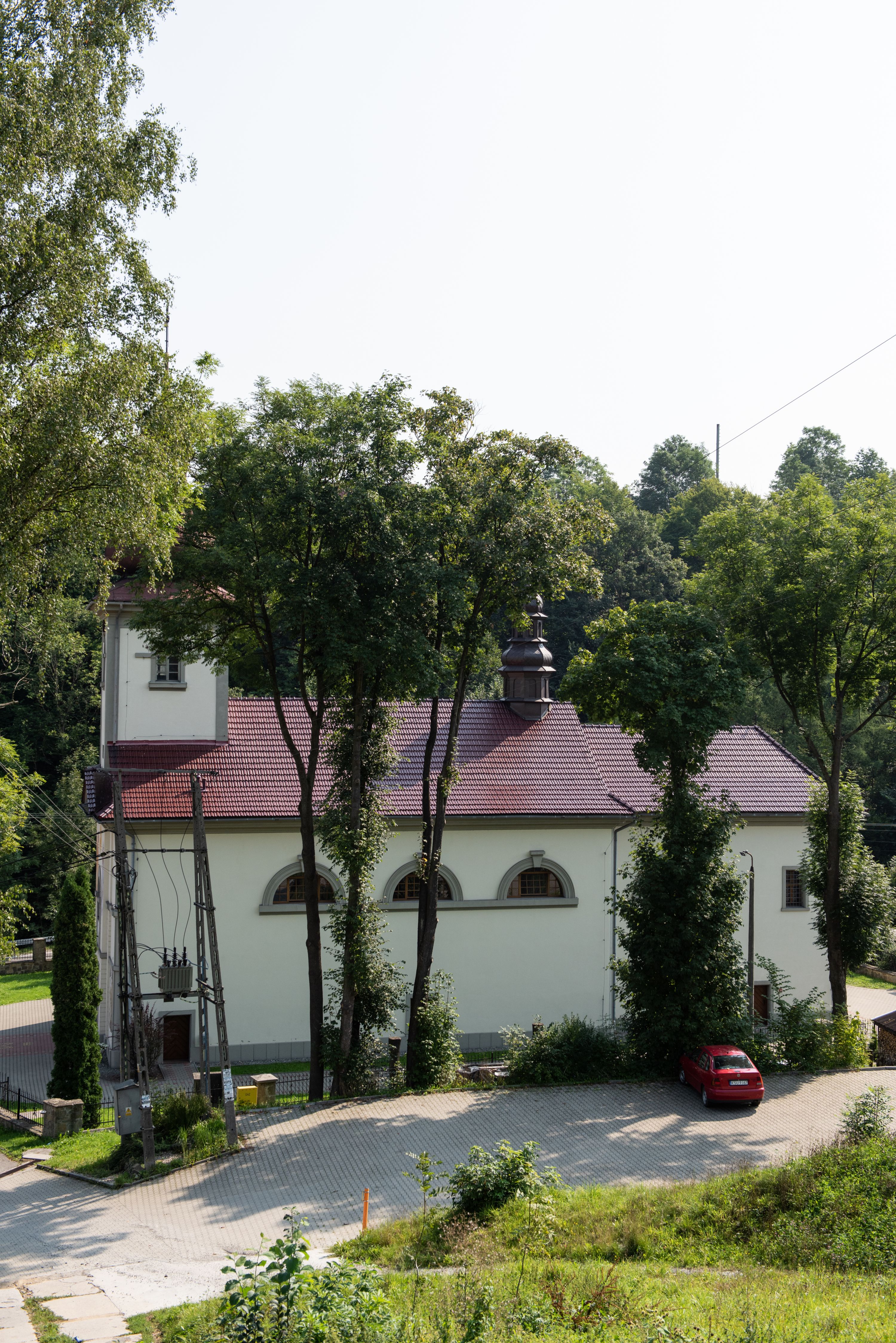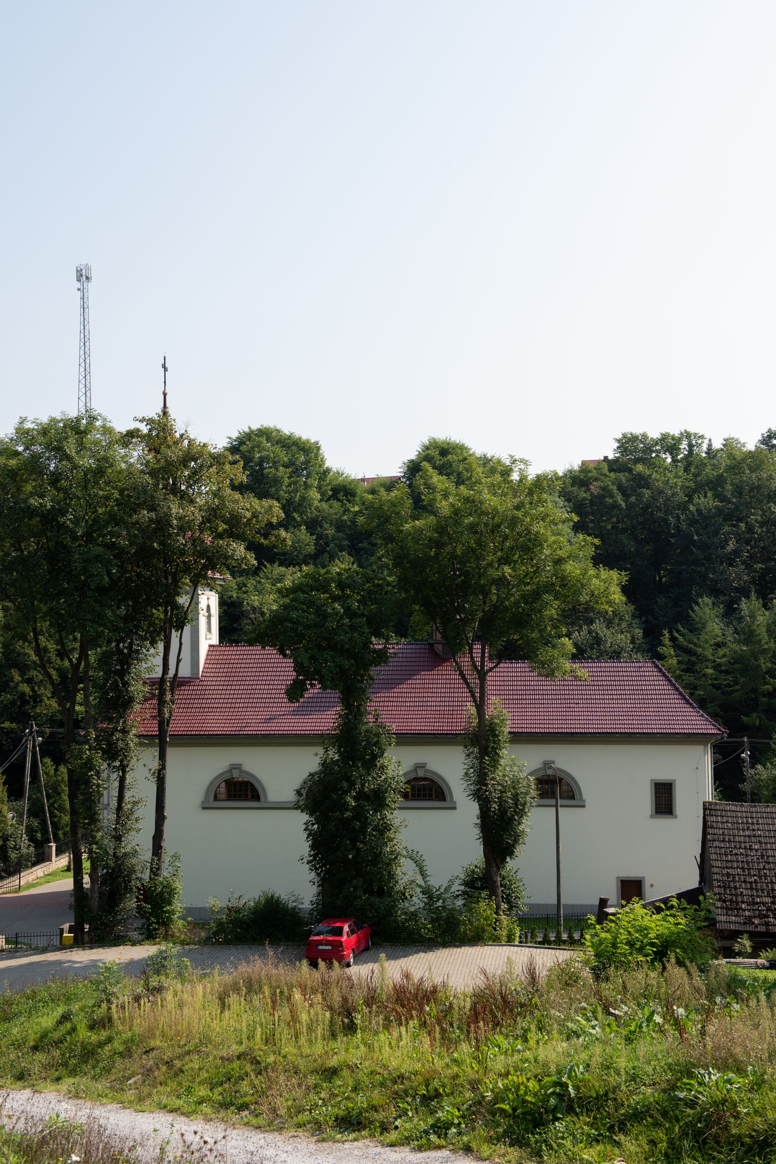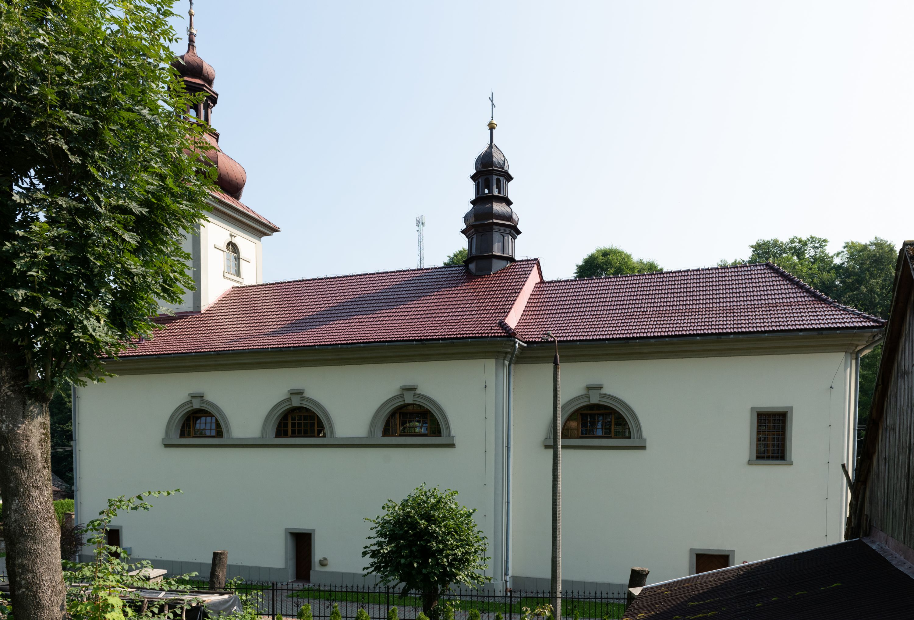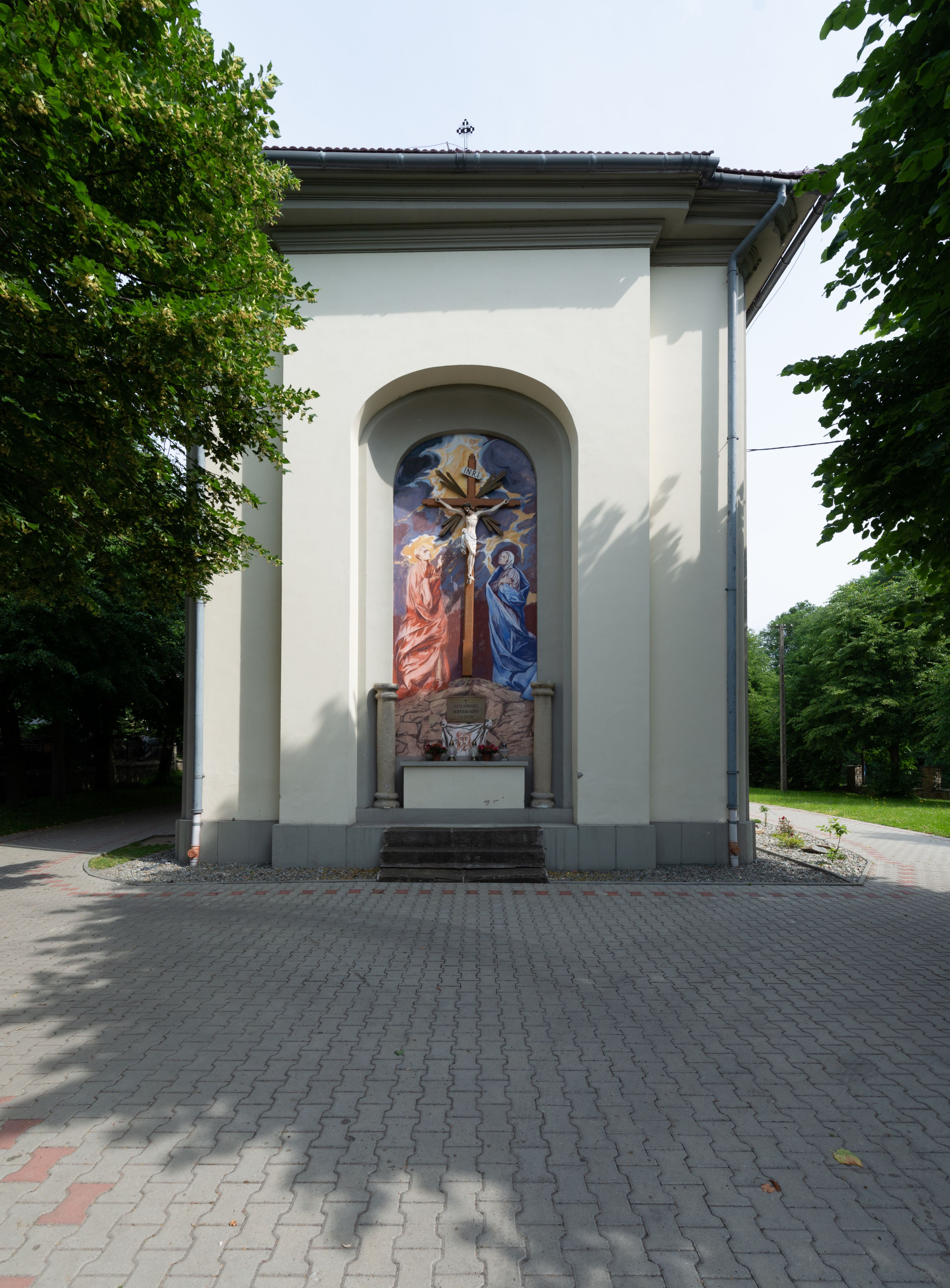 Kościół posadowiony na cokole. Elewacja frontowa ze zdwojonym ryzalitem, którego środek odpowiada szerokości wieży; podziały poziome przeprowadzone przy pomocy gzymsów. Na osi wejście i okno, oba w boniowanym obramieniu. Okno ujmuje polichromowana scena Zwiastowania. Ryzalit wieńczy trójkątny fronton. Cofnięty ryzalit w dolnej partii boniowany, wyżej gładki, zwieńczony ćwierćkolistymi fragmentami przerwanego przyczółka. Boki elewacji frontowej gładkie, zwieńczone frontonem przerwanym na masyw czworobocznej wieży przeprutej z każdej strony oknem w kształcie stojącego prostokąta zamkniętego łukiem pełnym. Elewacje boczne gładkie, przeprute półkolistymi oknami. Od wschodu poniżej okien szare płyciny, od południa, w kapliczkowej oprawie grupa Ukrzyżowania. Dach nad nawą dwuspadowy, nad prezbiterium trójspadowy, dach wieńczy baniasty hełm z latarnią zakończony krzyżem, na kalenicy barokowa wieżyczka na sygnaturkę.