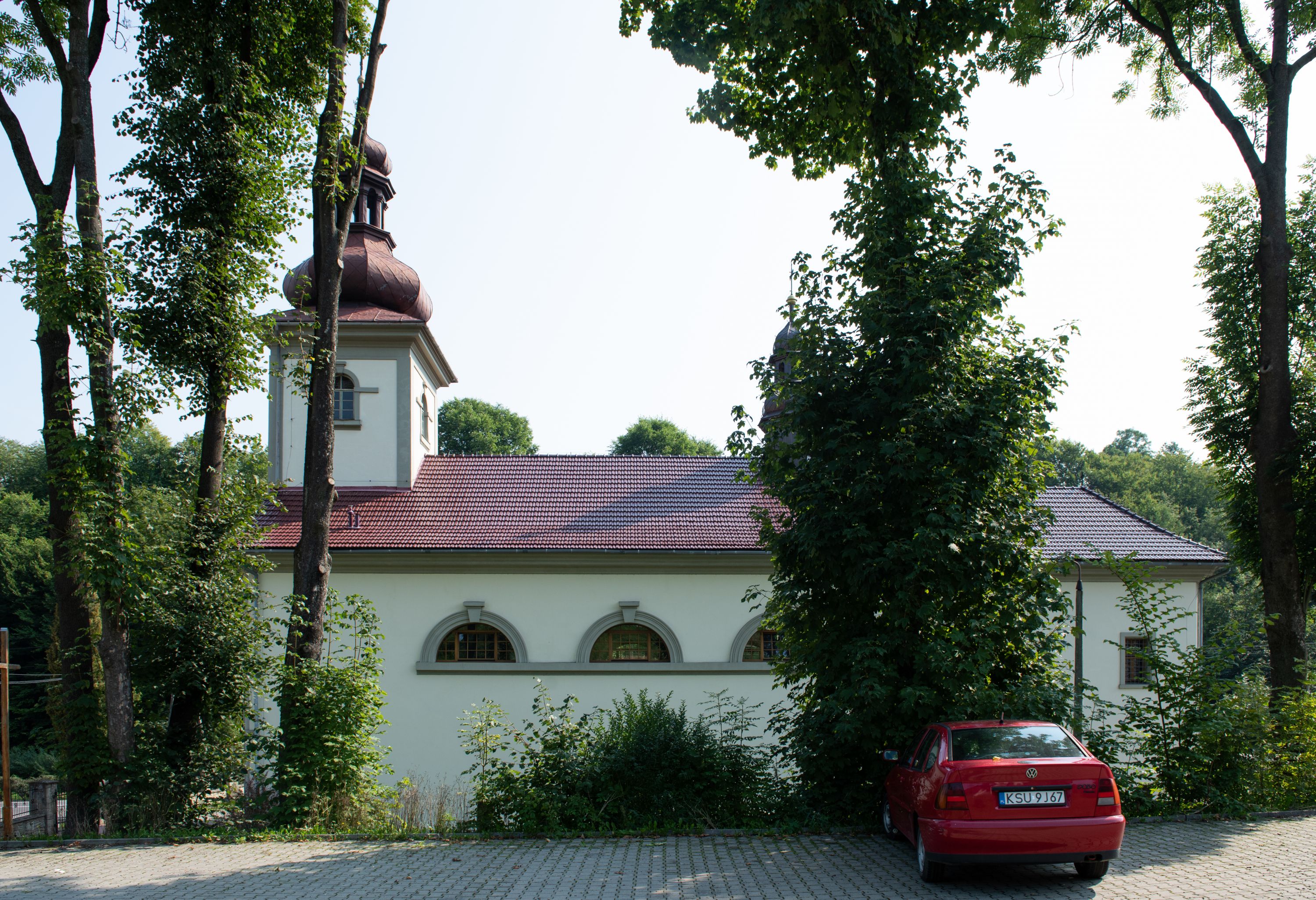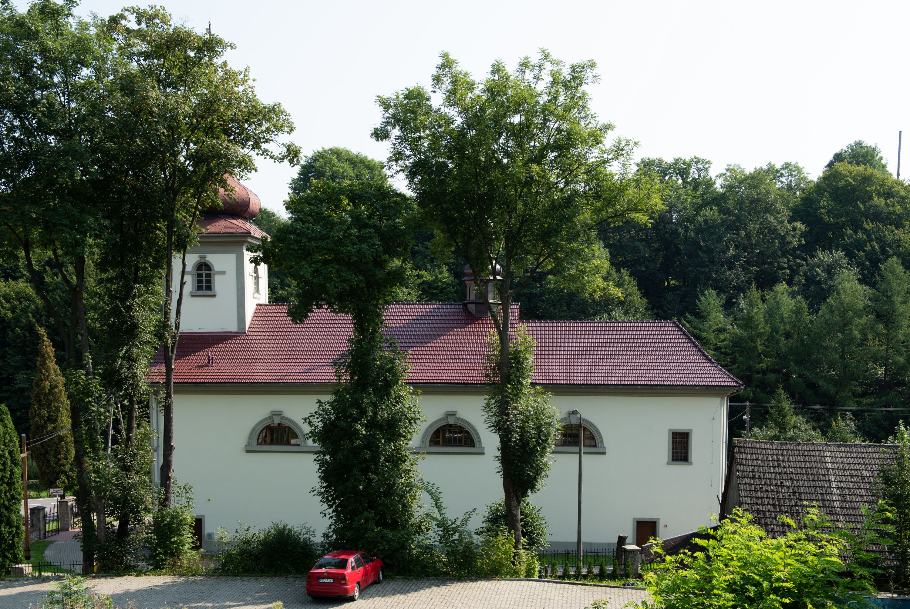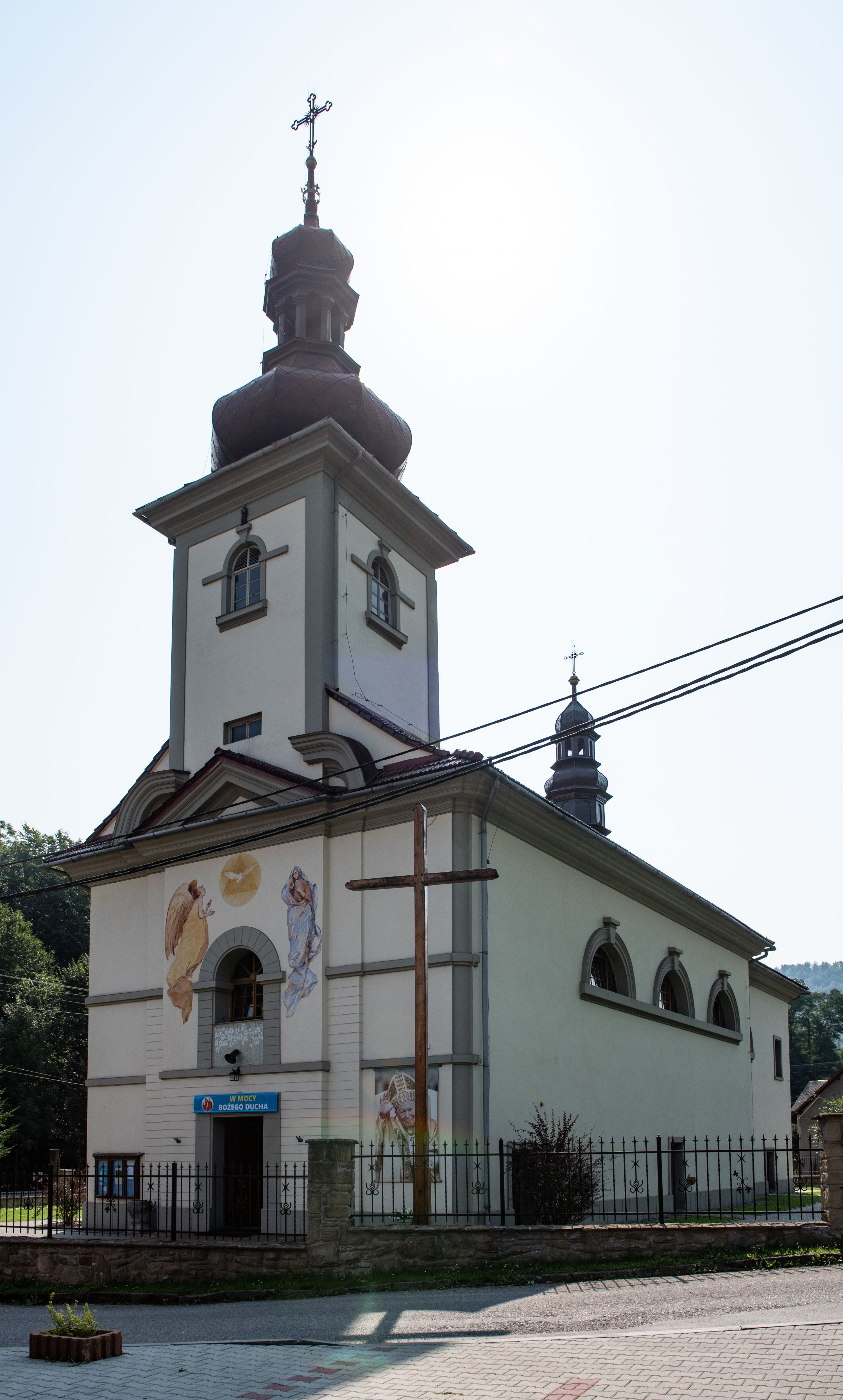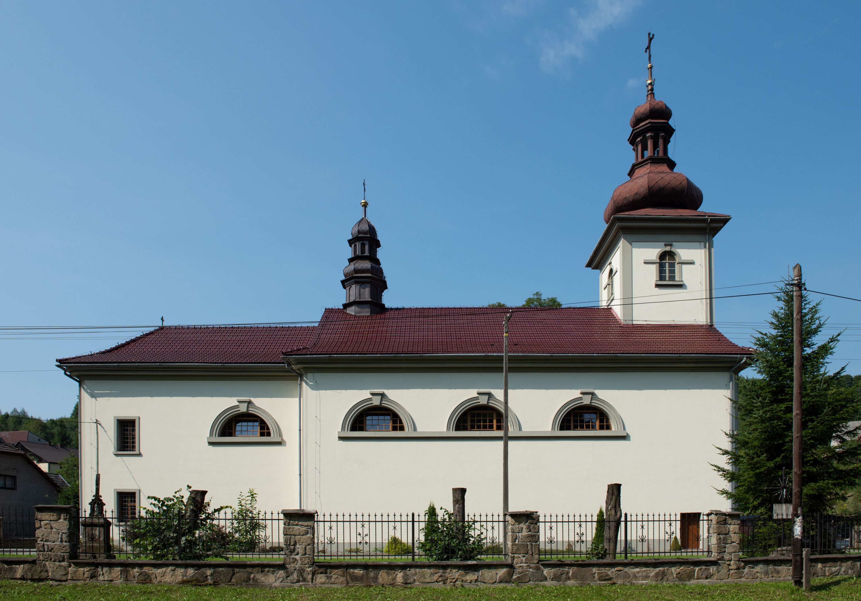 Kościół posadowiony na cokole. Elewacja frontowa ze zdwojonym ryzalitem, którego środek odpowiada szerokości wieży; podziały poziome przeprowadzone przy pomocy gzymsów. Na osi wejście i okno, oba w boniowanym obramieniu. Okno ujmuje polichromowana scena Zwiastowania. Ryzalit wieńczy trójkątny fronton. Cofnięty ryzalit w dolnej partii boniowany, wyżej gładki, zwieńczony ćwierćkolistymi fragmentami przerwanego przyczółka. Boki elewacji frontowej gładkie, zwieńczone frontonem przerwanym na masyw czworobocznej wieży przeprutej z każdej strony oknem w kształcie stojącego prostokąta zamkniętego łukiem pełnym. Elewacje boczne gładkie, przeprute półkolistymi oknami. Od wschodu poniżej okien szare płyciny, od południa, w kapliczkowej oprawie grupa Ukrzyżowania. Dach nad nawą dwuspadowy, nad prezbiterium trójspadowy, dach wieńczy baniasty hełm z latarnią zakończony krzyżem, na kalenicy barokowa wieżyczka na sygnaturkę.