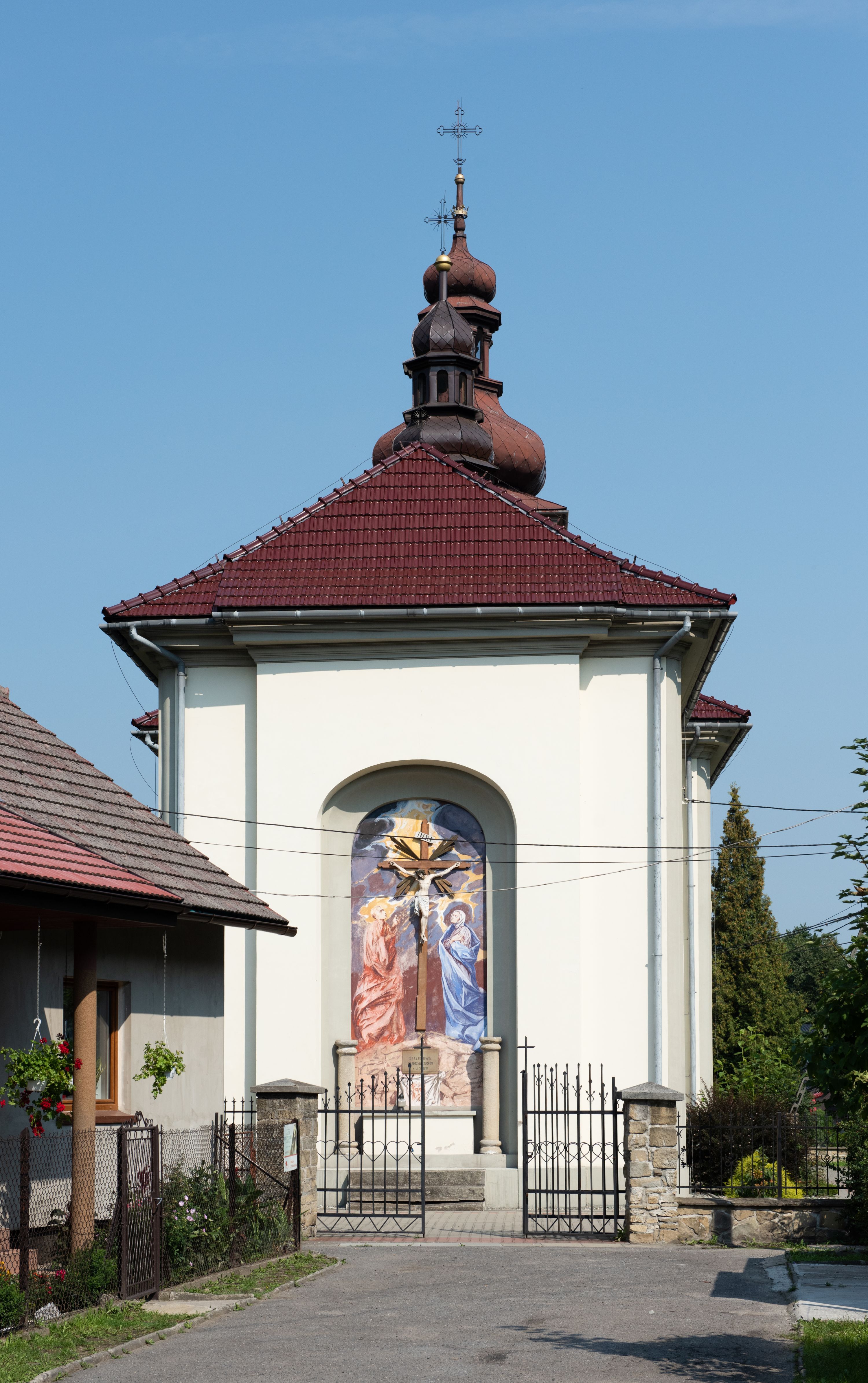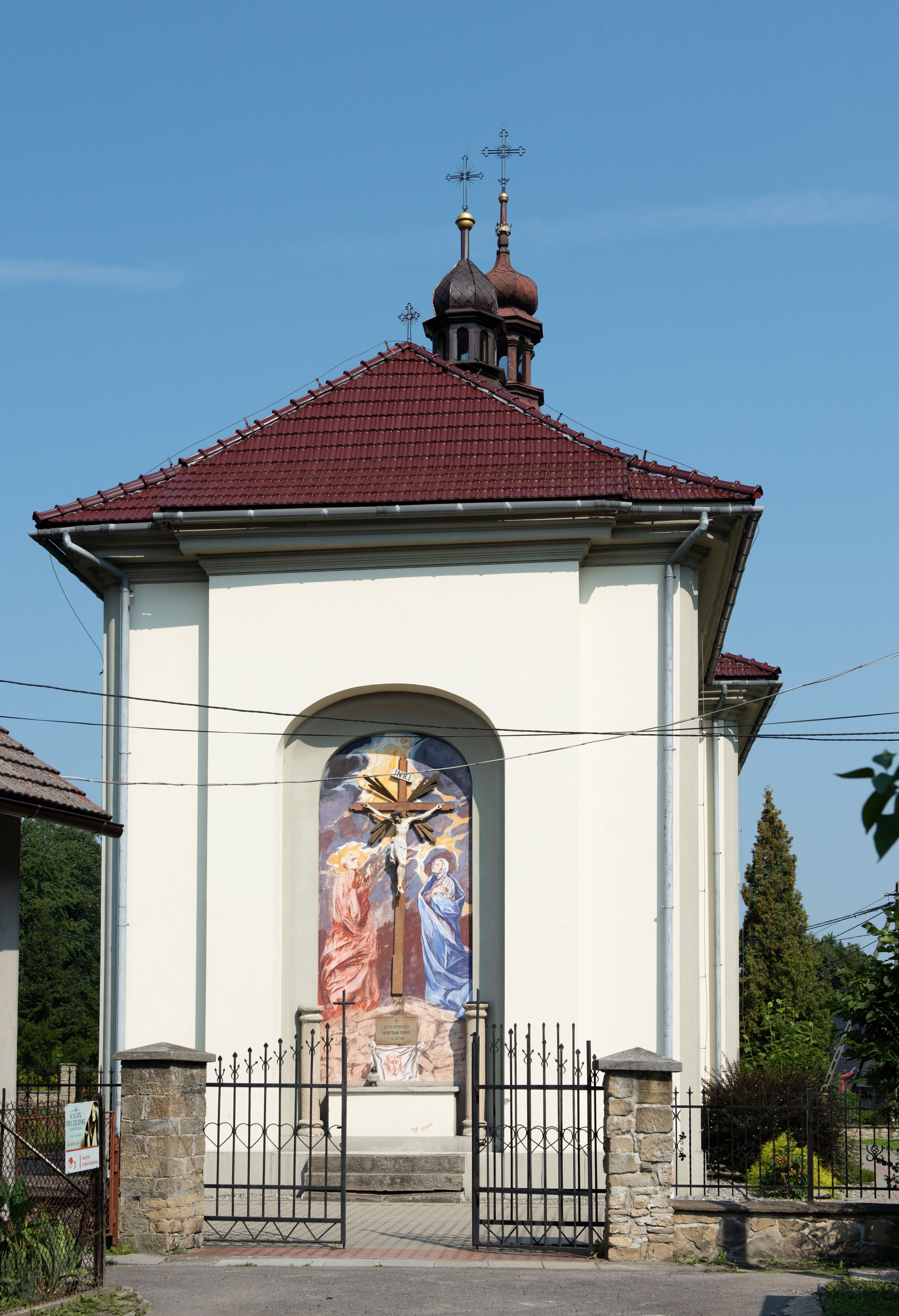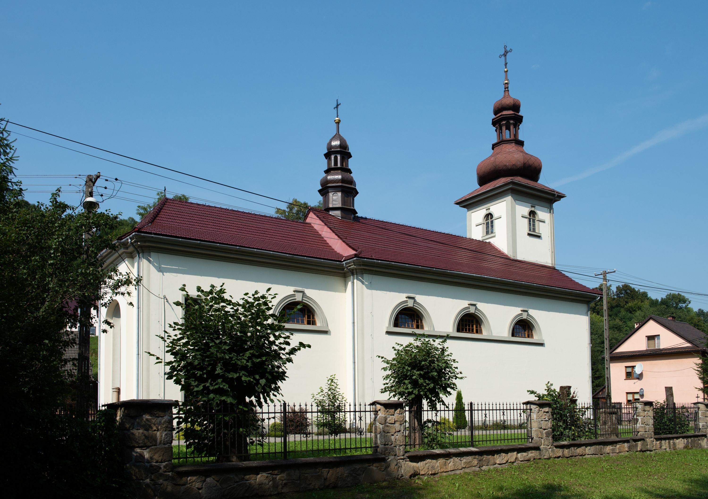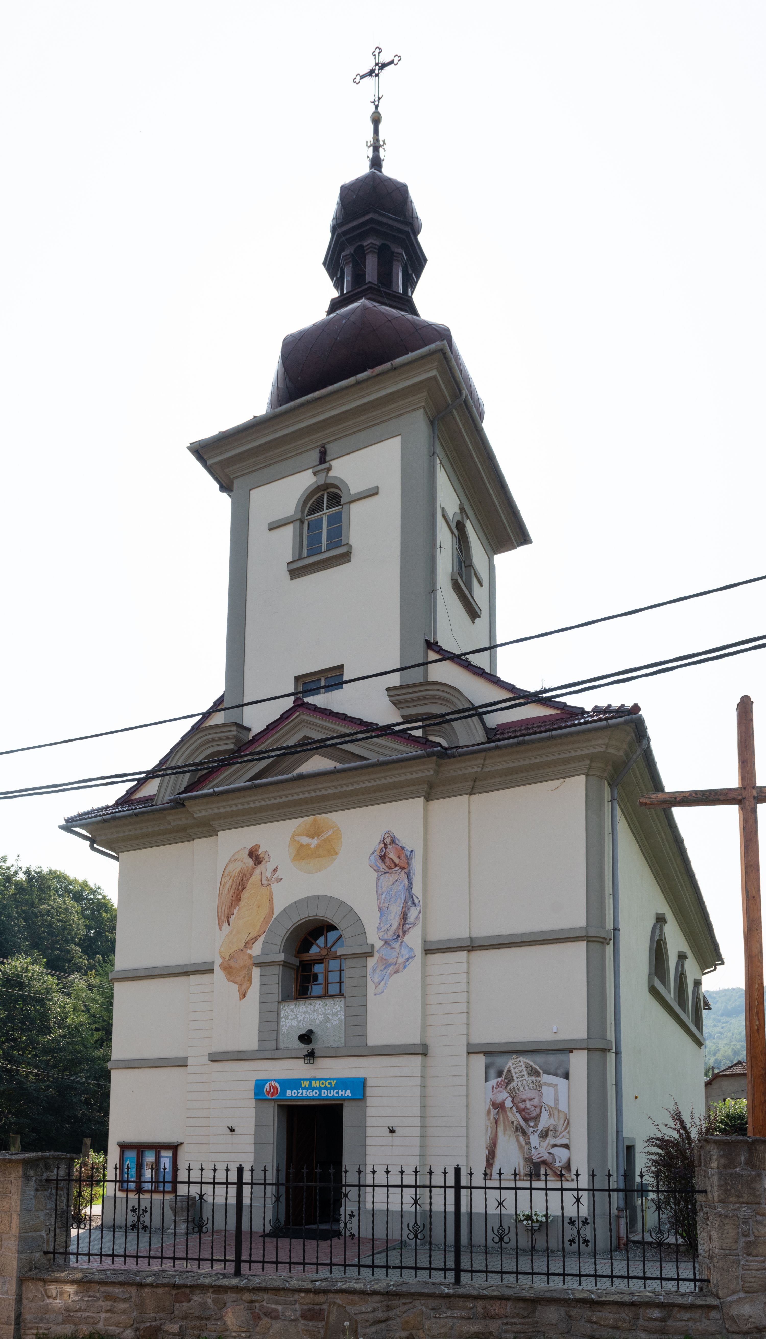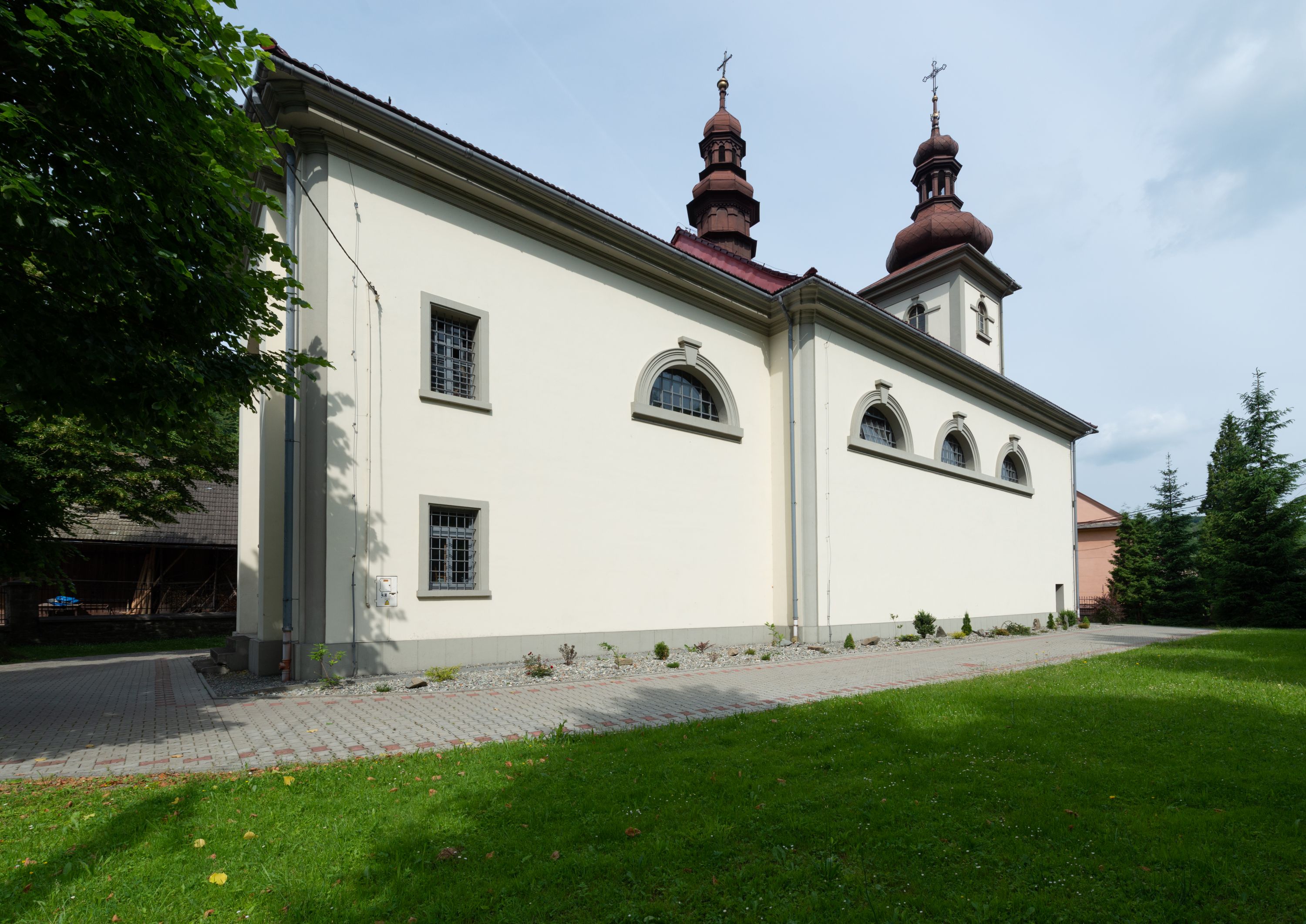 Kościół posadowiony na cokole. Elewacja frontowa ze zdwojonym ryzalitem, którego środek odpowiada szerokości wieży; podziały poziome przeprowadzone przy pomocy gzymsów. Na osi wejście i okno, oba w boniowanym obramieniu. Okno ujmuje polichromowana scena Zwiastowania. Ryzalit wieńczy trójkątny fronton. Cofnięty ryzalit w dolnej partii boniowany, wyżej gładki, zwieńczony ćwierćkolistymi fragmentami przerwanego przyczółka. Boki elewacji frontowej gładkie, zwieńczone frontonem przerwanym na masyw czworobocznej wieży przeprutej z każdej strony oknem w kształcie stojącego prostokąta zamkniętego łukiem pełnym. Elewacje boczne gładkie, przeprute półkolistymi oknami. Od wschodu poniżej okien szare płyciny, od południa, w kapliczkowej oprawie grupa Ukrzyżowania. Dach nad nawą dwuspadowy, nad prezbiterium trójspadowy, dach wieńczy baniasty hełm z latarnią zakończony krzyżem, na kalenicy barokowa wieżyczka na sygnaturkę.
