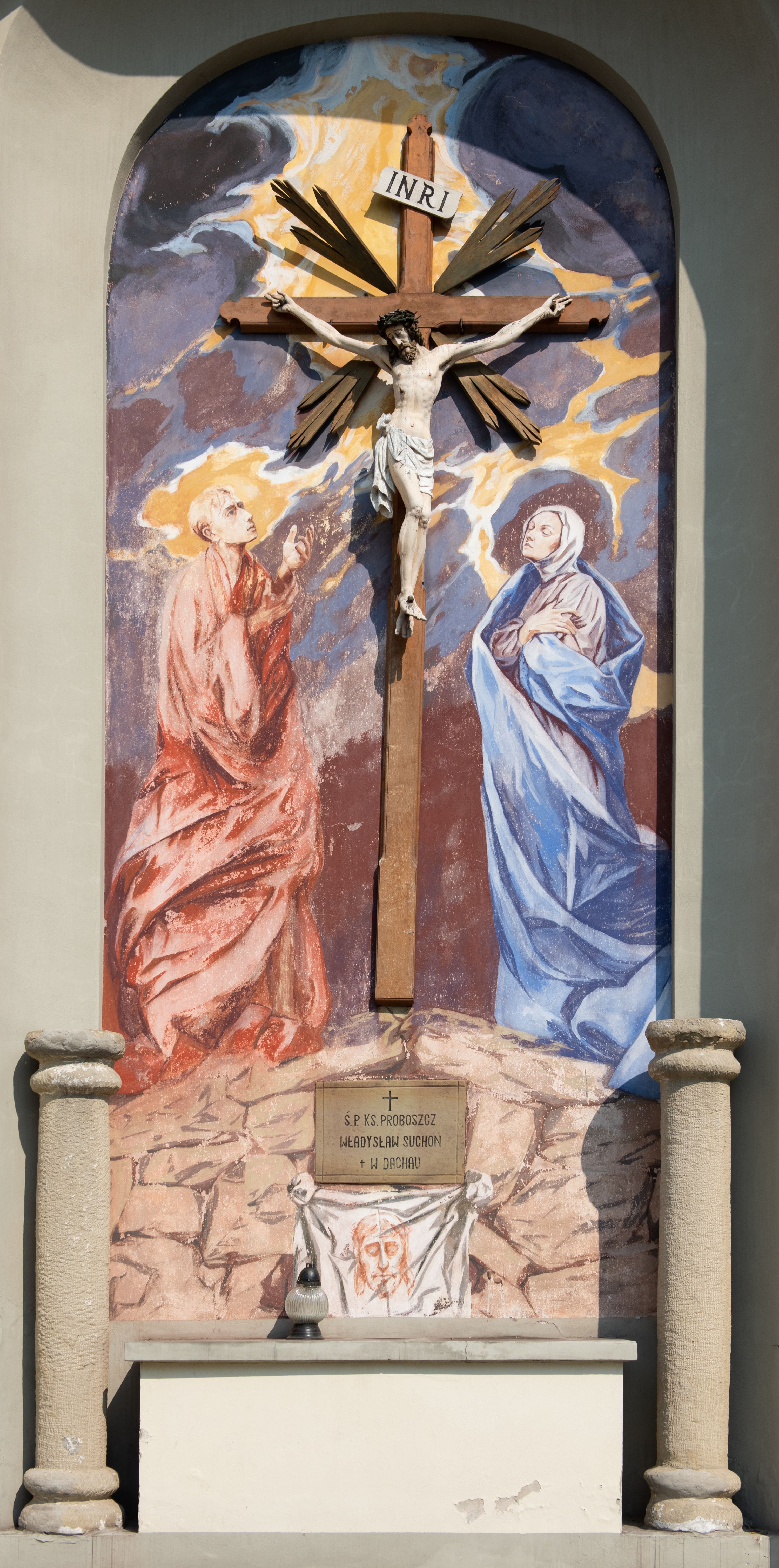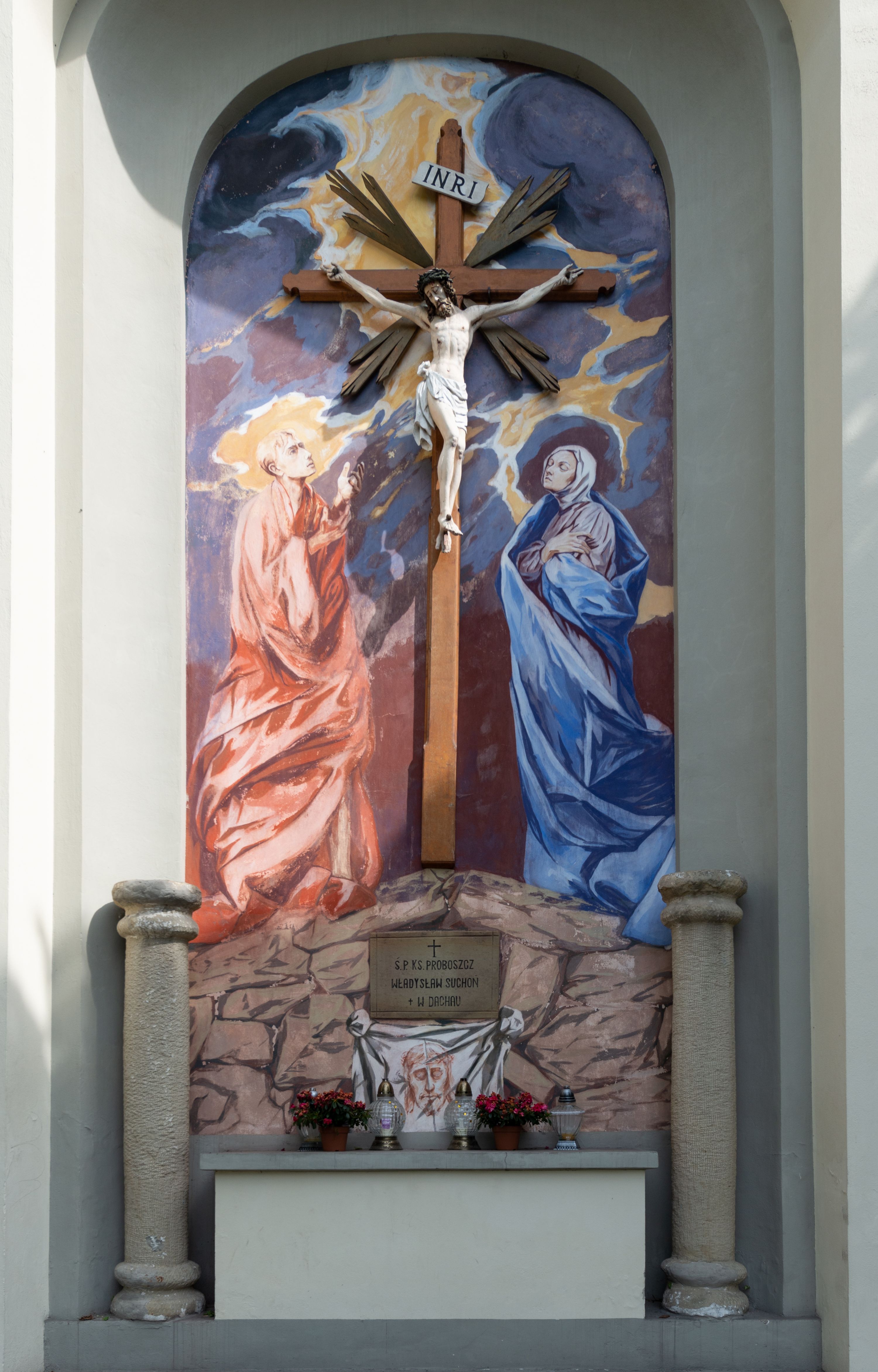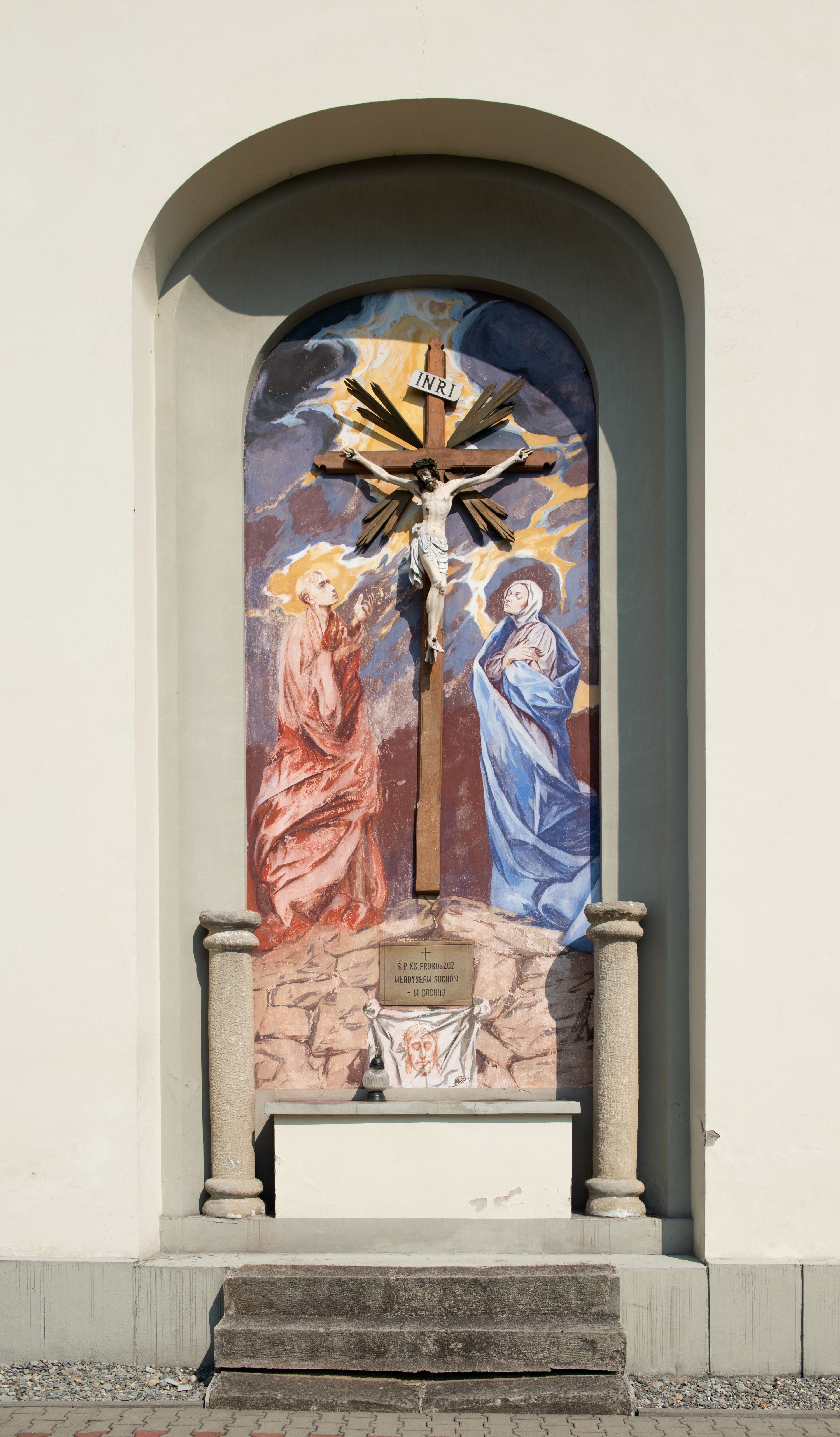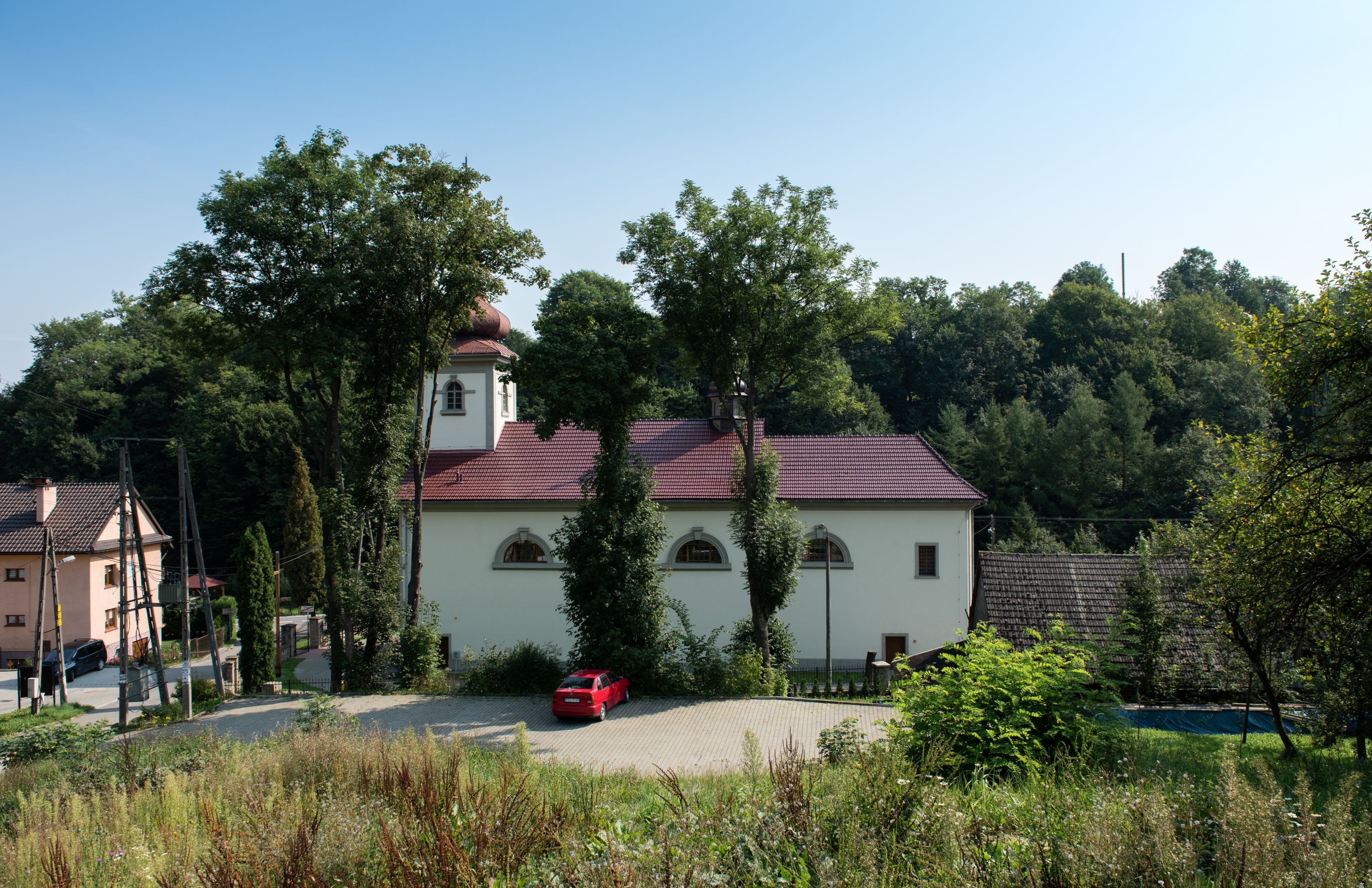 Kościół posadowiony na cokole. Elewacja frontowa ze zdwojonym ryzalitem, którego środek odpowiada szerokości wieży; podziały poziome przeprowadzone przy pomocy gzymsów. Na osi wejście i okno, oba w boniowanym obramieniu. Okno ujmuje polichromowana scena Zwiastowania. Ryzalit wieńczy trójkątny fronton. Cofnięty ryzalit w dolnej partii boniowany, wyżej gładki, zwieńczony ćwierćkolistymi fragmentami przerwanego przyczółka. Boki elewacji frontowej gładkie, zwieńczone frontonem przerwanym na masyw czworobocznej wieży przeprutej z każdej strony oknem w kształcie stojącego prostokąta zamkniętego łukiem pełnym. Elewacje boczne gładkie, przeprute półkolistymi oknami. Od wschodu poniżej okien szare płyciny, od południa, w kapliczkowej oprawie grupa Ukrzyżowania. Dach nad nawą dwuspadowy, nad prezbiterium trójspadowy, dach wieńczy baniasty hełm z latarnią zakończony krzyżem, na kalenicy barokowa wieżyczka na sygnaturkę.