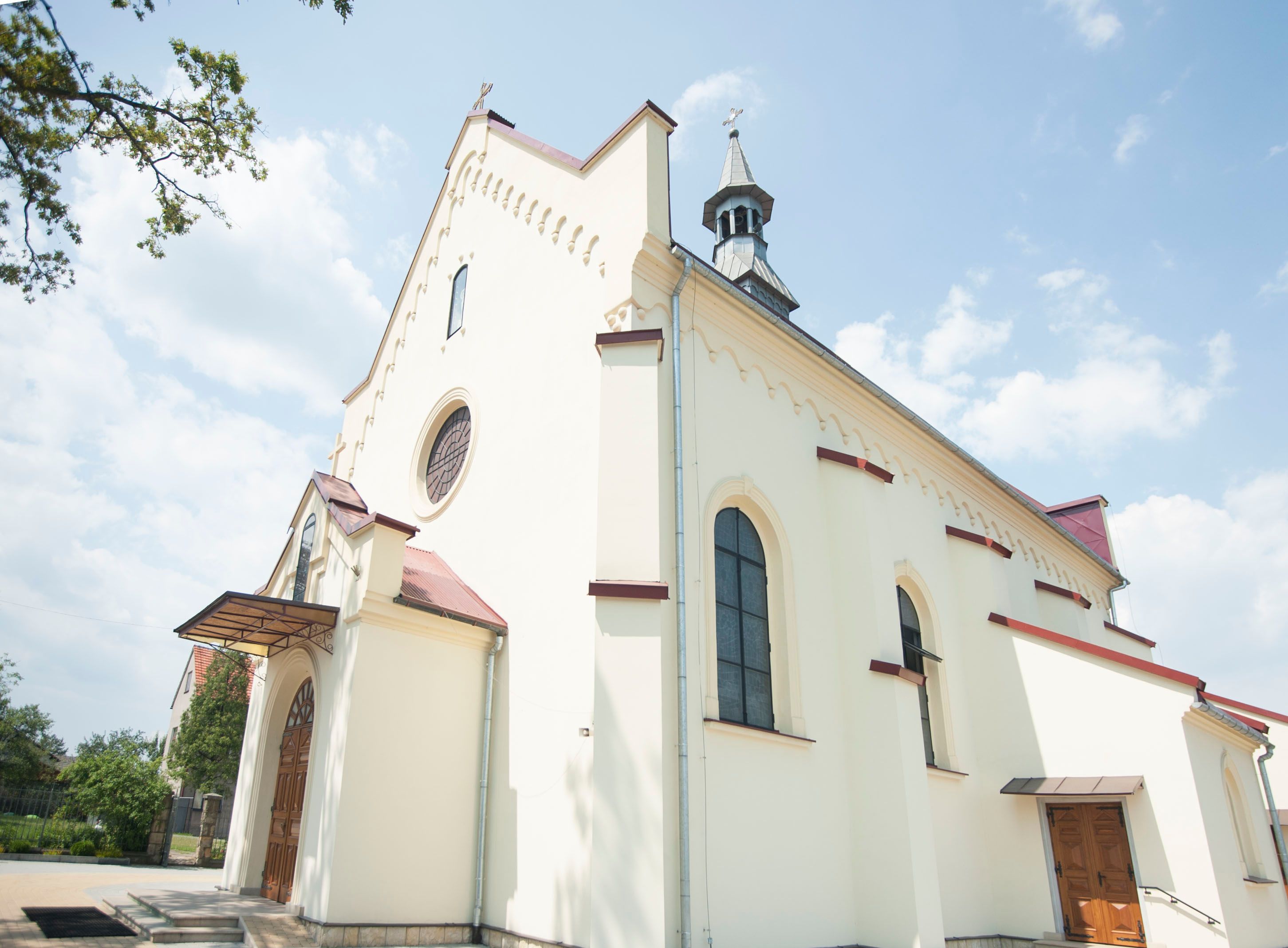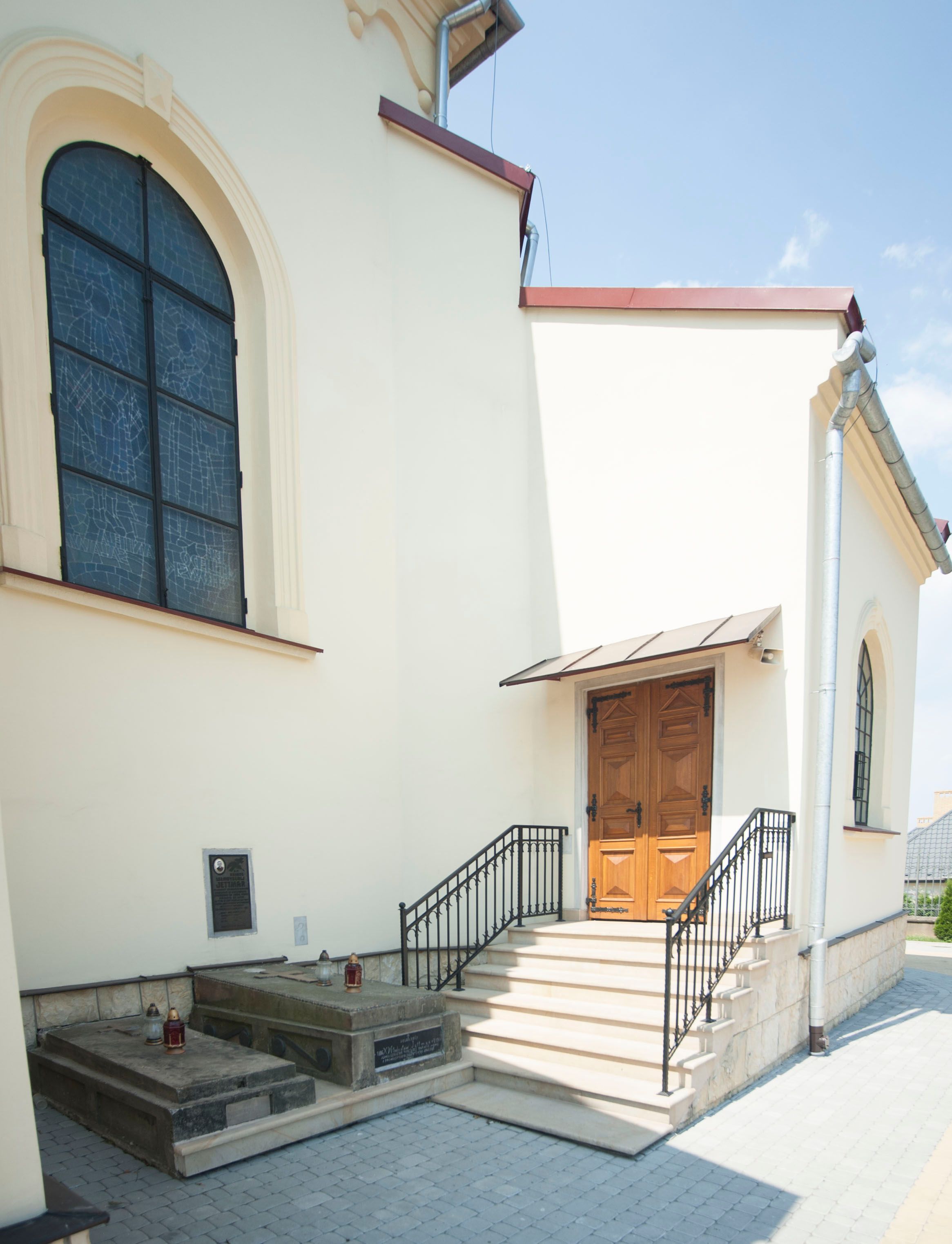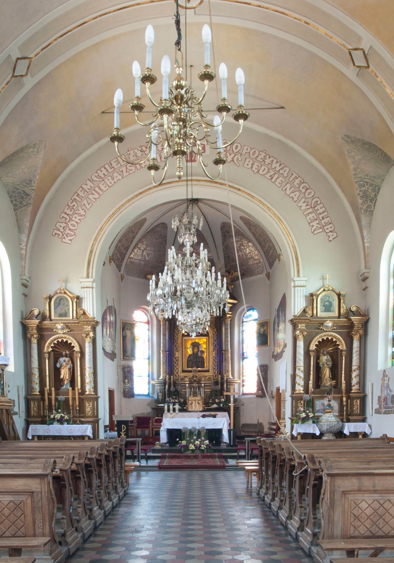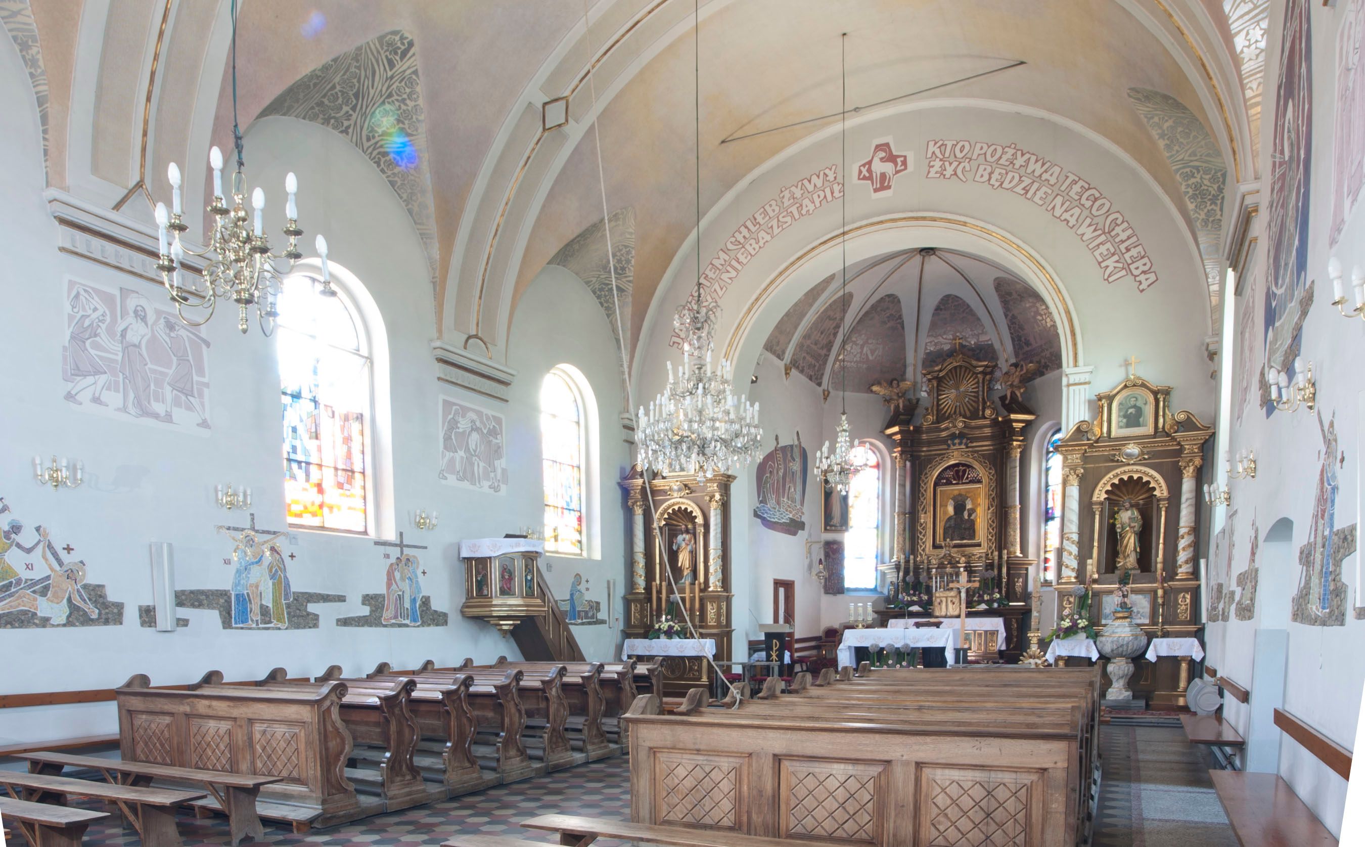 Kościół usytuowany w centrum wsi, u zbiegu głównych dróg, położony na niewielkim wzniesieniu, na placu otoczonym ogrodzeniem z kamiennymi filarami i metalową kratą. Budynek orientowany, jednonawowy, czteroprzęsłowy, z węższym prezbiterium zamkniętym trójbocznie. Od zachodu do fasady dostawiona niewielka kruchta; od południa dostawiona kaplica na planie prostokąta. Prezbiterium ujęte symetrycznie aneksami: pomieszczenie gospodarcze od północy i zakrystia od południa. Kościół sklepiony kolebkowo na gurtach z lunetami; prezbiterium nakryte sklepieniem parasolowatym; kaplica sklepieniem pseudoklasztornym; aneksy i kruchta z płaskim stropem. Wnętrze oświetlają prostokątne okna zamknięte półkoliście; w ścianie zachodniej okno okrągłe; w kaplicy i aneksach również okna zamknięte półkoliście. Wejście główne na osi kościoła, prostokątne; prezbiterium skomunikowane z aneksami prostokątnymi drzwiami; z zakrystii wyjście na zewnątrz. Chór muzyczny wsparty na czterech metalowych kolumnach z częścią środkową wybrzuszoną; z parapetem ozdobionym pseudopłycinami, kostkowaniem i lambrekinem. Fasada jednoosiowa, jednokondygnacyjna z trójkątnym szczytem, ozdobiona krenelażem. Na osi kruchta, zamknięta trójkątnym szczytem z prostokątnym wejściem o półkolistym zwieńczeniu. Elewacje ujęte są uskokowymi przyporami i zwieńczone gzymsem z motywem lambrekinów. Dachy dwuspadowe nad nawą i prezbiterium; pulpitowe nad aneksami i kaplicą; kryte blachą. Dach wieńczy wieżyczka na sygnaturkę w formie gloriety zwieńczonej ostrosłupem z krzyżem.