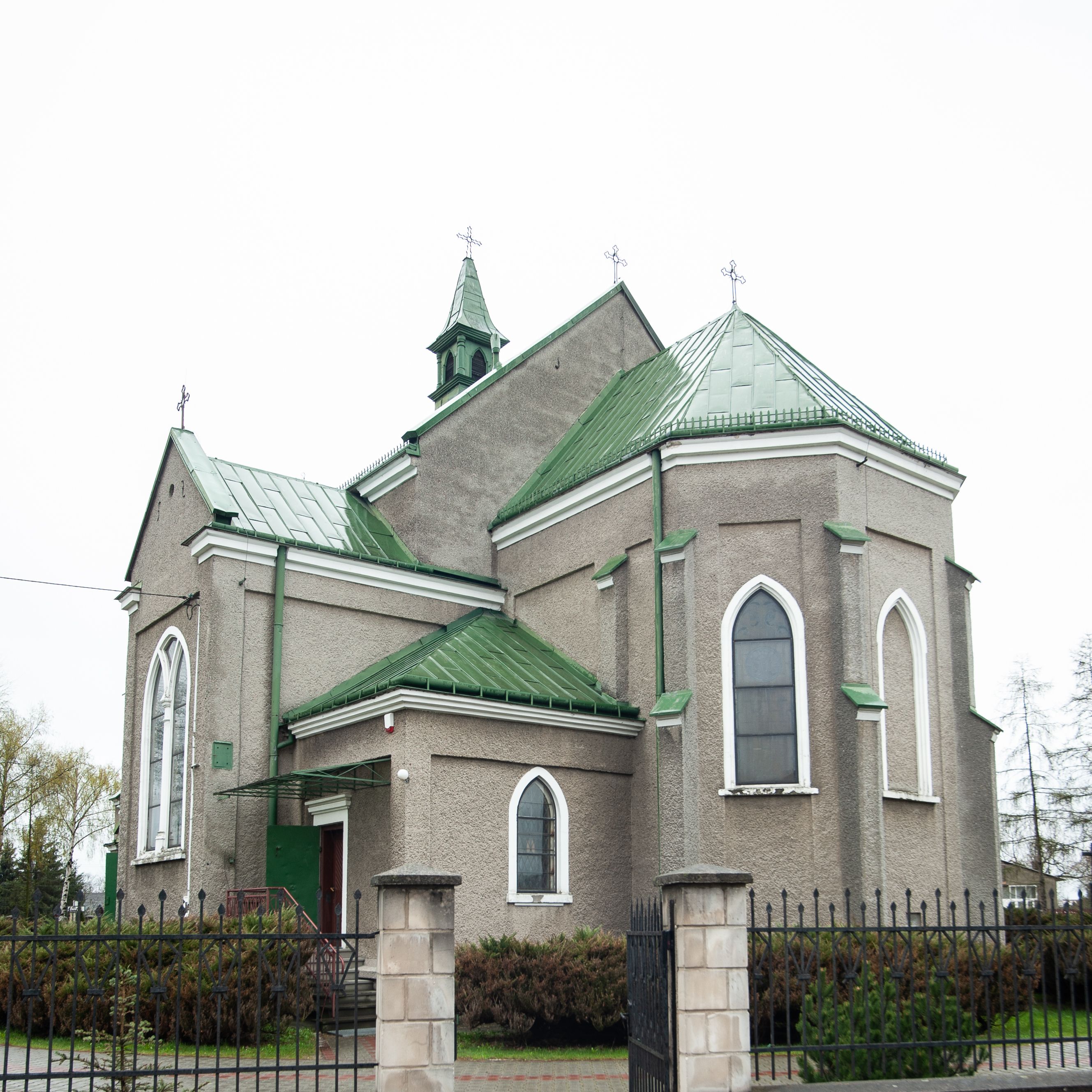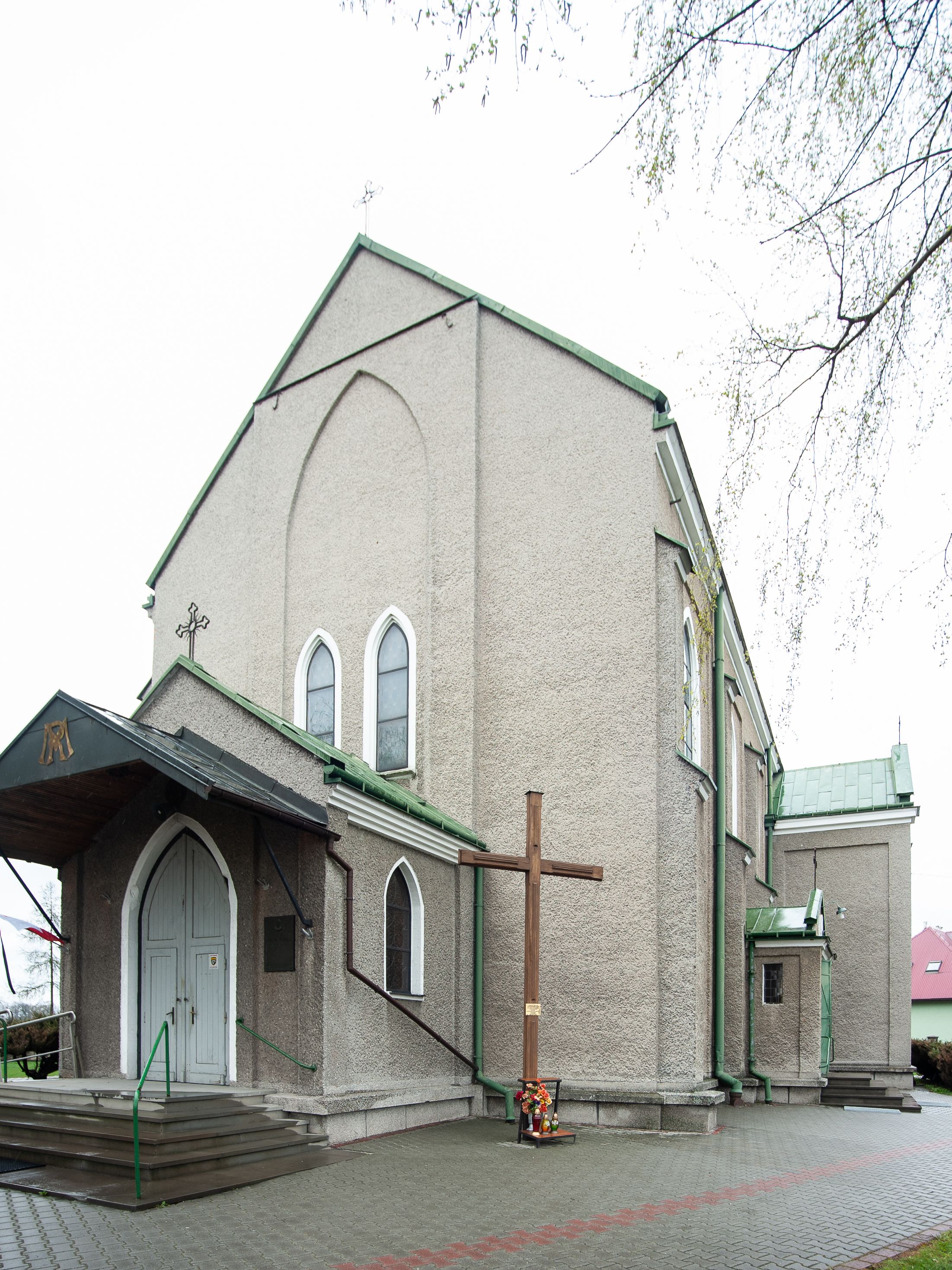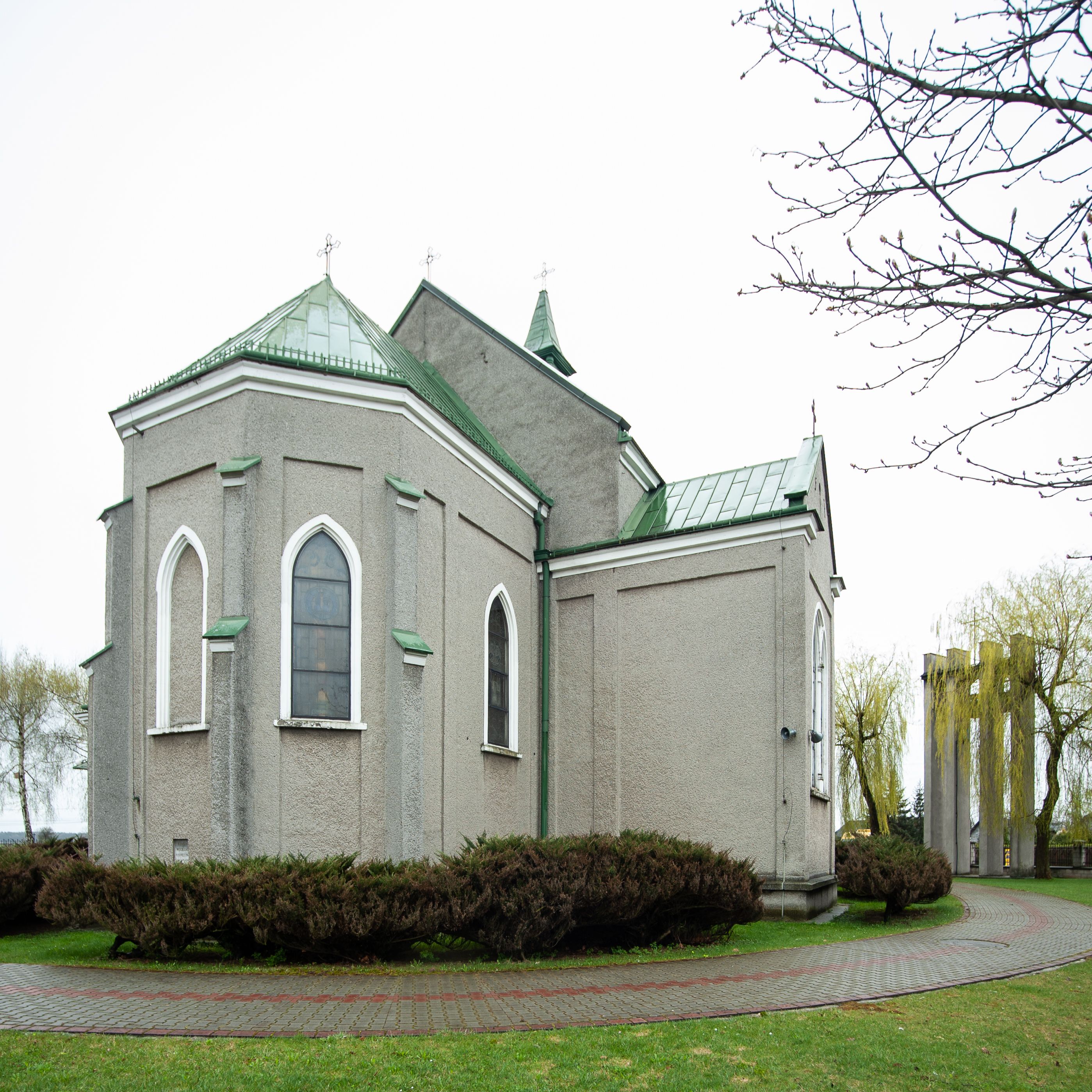 Kościół murowany z cegły, tynkowany, orientowany z odchyleniem ku północy. Zbudowany na planie krzyża łacińskiego, jednonawowy z transeptem, pięcioprzęsłowy, z jednoprzęsłowym prezbiterium zamkniętym trójbocznie. Sklepienie beczkowe spłaszczone (koszowe) na gurtach z lunetami stykającymi się wierzchołkami. W pierwszym od zachodu przęśle nawy chór muzyczny konstrukcji żelbetowej wsparty na dwóch filarach o przekroju ośmioboku i dwóch analogicznych półfilarach. Balustrada artykułowana ostrołukowymi niszami. Ściany boczne rozczłonkowane analogicznymi półfilarami, ustawionymi na tle pilastrów; proste kapitele toskańskie. Ściana tęczowa z arkadą ostrołukową, ujętą po bokach dwoma mniejszymi ostrołukowymi płycinami. Od zachodu prostokątna kruchta z dwoma ostrołukowymi otworami drzwiowymi. Mniejsza prostokątna kruchta od południa, skomunikowana z nawą kamiennym, profilowanym portalem prostokątnym. W prezbiterium od południa prostokątny otwór wejściowy do zakrystii. Okna obustronnie rozglifione, z parapetami, o kształcie wydłużonego prostokąta, zamkniętego ostrołukowo; po trzy w ścianach bocznych nawy, trzy w prezbiterium. Dwa mniejsze w fasadzie kościoła, po jednym na ścianach bocznych kruchty zachodniej. W zamknięciu ścian transeptu, większe ostrołukowe okna z podziałami kamiennymi dzielącymi okno na dwie, mniejsze, przedzielone półfilarem, zamknięte ostrołukowo części. Kościół nakryty dachem dwuspadowym z blachy. Fasada bezwieżowa z trójkątnym szczytem. Na zewnętrznej, wschodniej ścianie prezbiterium niewielka kwadratowa płycina z inskrypcją: „KAMIEŃ / WĘGIELNY / POŚWIĘCONY / DN(IA) 21 VI 1936”.