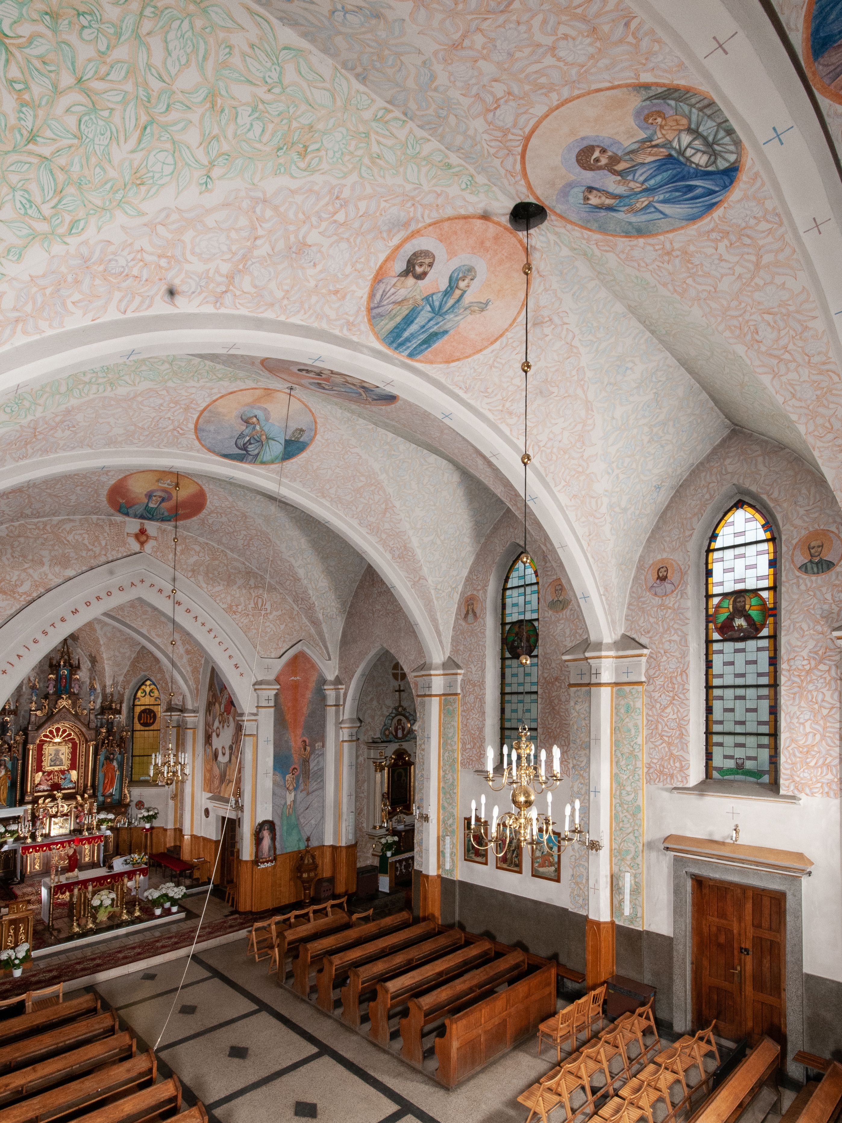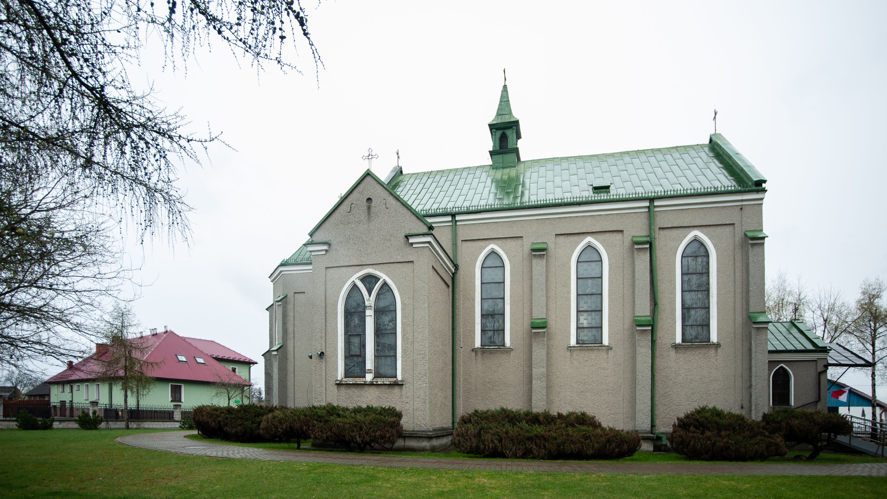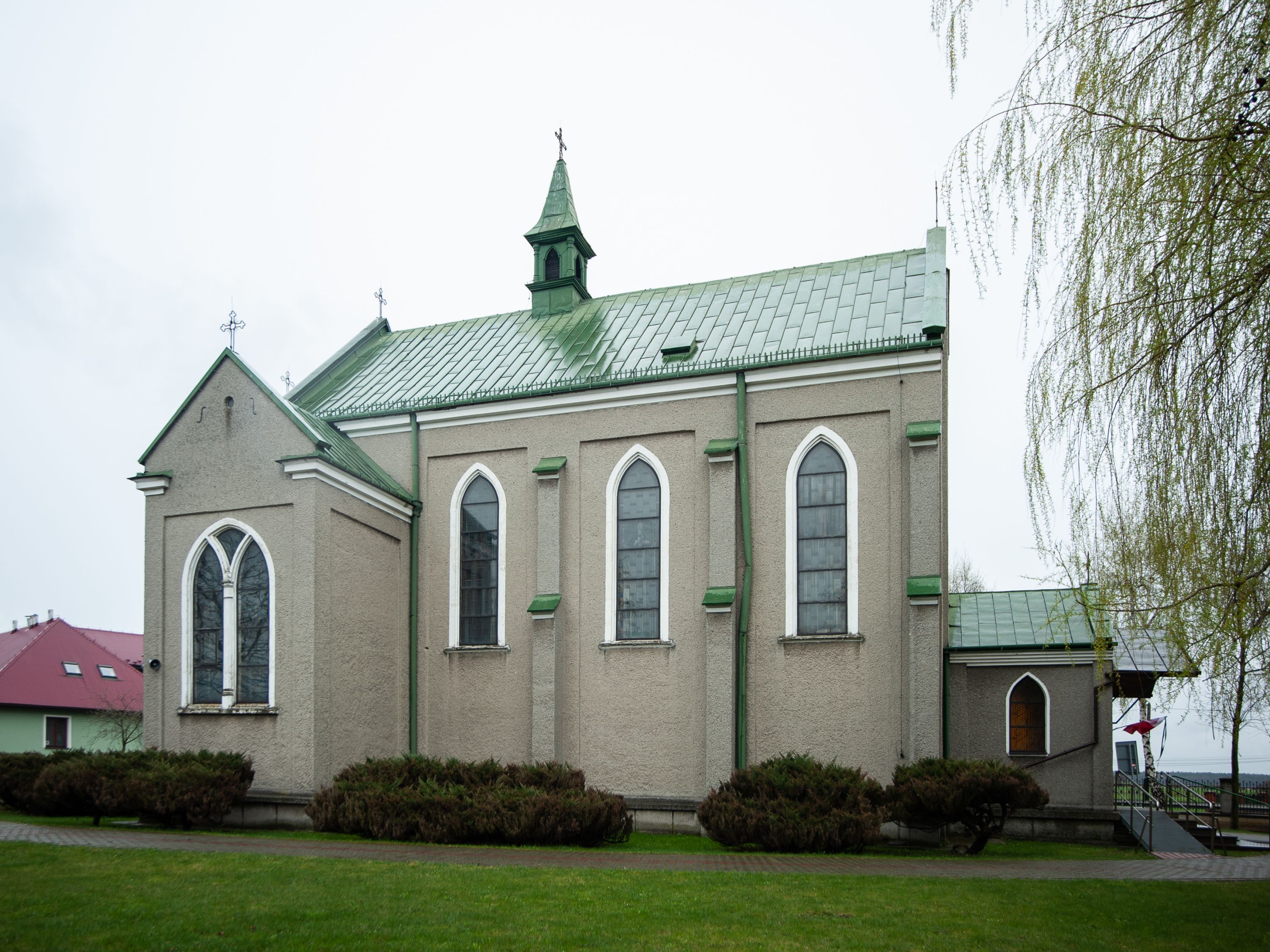 Kościół murowany z cegły, tynkowany, orientowany z odchyleniem ku północy. Zbudowany na planie krzyża łacińskiego, jednonawowy z transeptem, pięcioprzęsłowy, z jednoprzęsłowym prezbiterium zamkniętym trójbocznie. Sklepienie beczkowe spłaszczone (koszowe) na gurtach z lunetami stykającymi się wierzchołkami. W pierwszym od zachodu przęśle nawy chór muzyczny konstrukcji żelbetowej wsparty na dwóch filarach o przekroju ośmioboku i dwóch analogicznych półfilarach. Balustrada artykułowana ostrołukowymi niszami. Ściany boczne rozczłonkowane analogicznymi półfilarami, ustawionymi na tle pilastrów; proste kapitele toskańskie. Ściana tęczowa z arkadą ostrołukową, ujętą po bokach dwoma mniejszymi ostrołukowymi płycinami. Od zachodu prostokątna kruchta z dwoma ostrołukowymi otworami drzwiowymi. Mniejsza prostokątna kruchta od południa, skomunikowana z nawą kamiennym, profilowanym portalem prostokątnym. W prezbiterium od południa prostokątny otwór wejściowy do zakrystii. Okna obustronnie rozglifione, z parapetami, o kształcie wydłużonego prostokąta, zamkniętego ostrołukowo; po trzy w ścianach bocznych nawy, trzy w prezbiterium. Dwa mniejsze w fasadzie kościoła, po jednym na ścianach bocznych kruchty zachodniej. W zamknięciu ścian transeptu, większe ostrołukowe okna z podziałami kamiennymi dzielącymi okno na dwie, mniejsze, przedzielone półfilarem, zamknięte ostrołukowo części. Kościół nakryty dachem dwuspadowym z blachy. Fasada bezwieżowa z trójkątnym szczytem. Na zewnętrznej, wschodniej ścianie prezbiterium niewielka kwadratowa płycina z inskrypcją: „KAMIEŃ / WĘGIELNY / POŚWIĘCONY / DN(IA) 21 VI 1936”.
