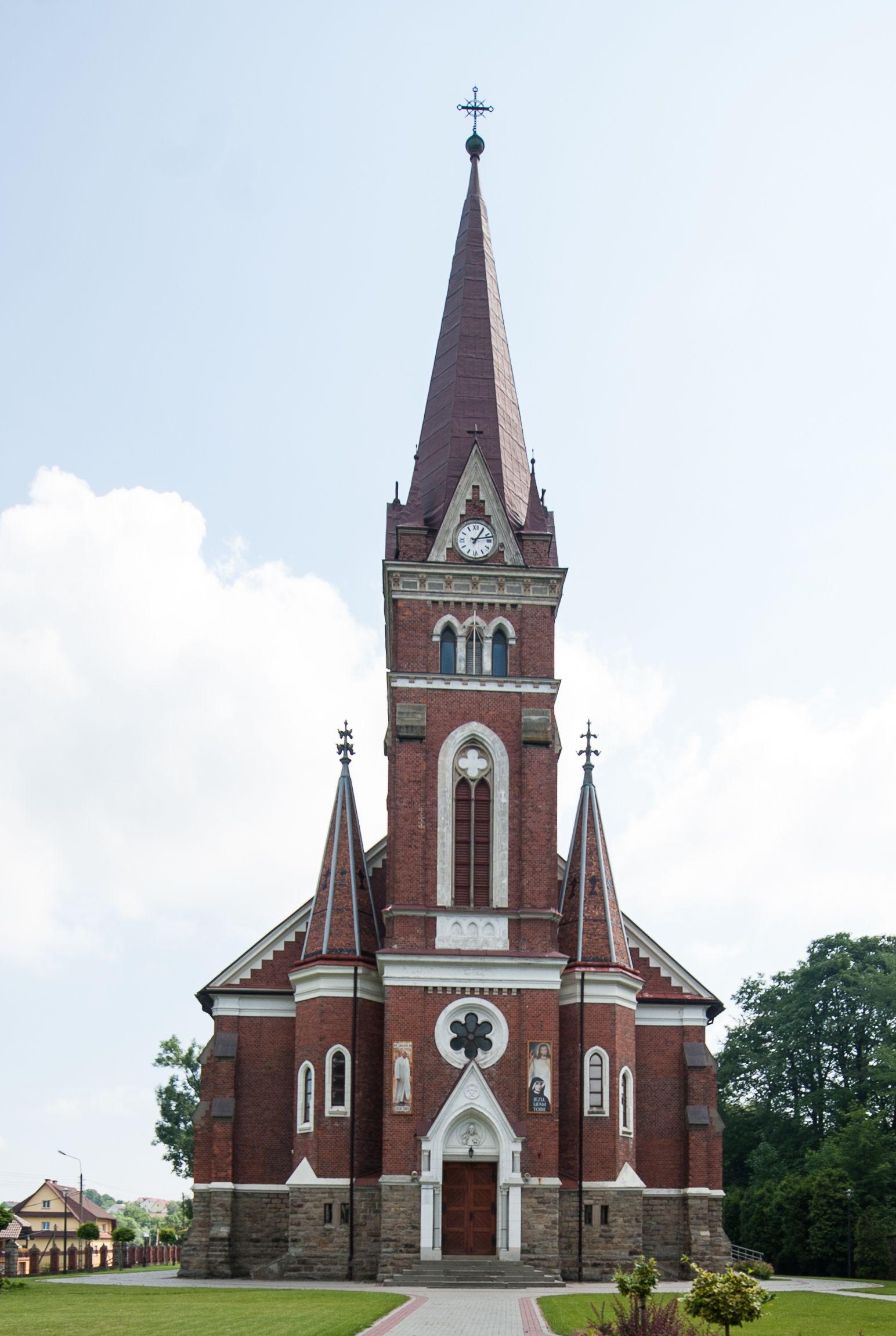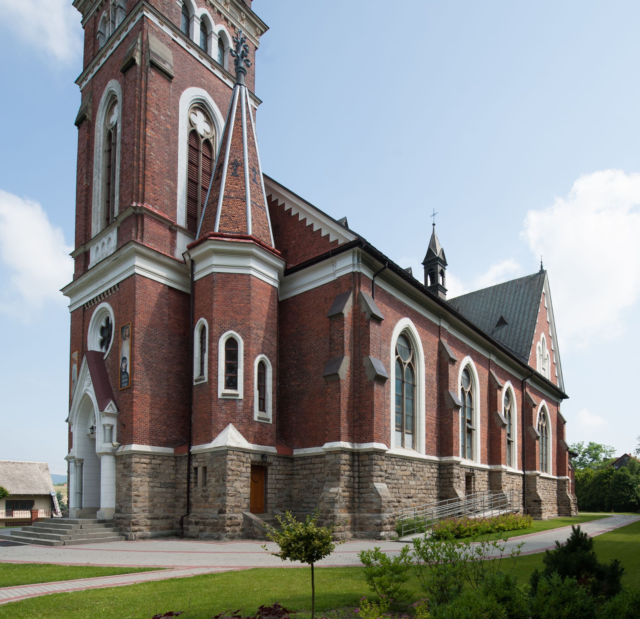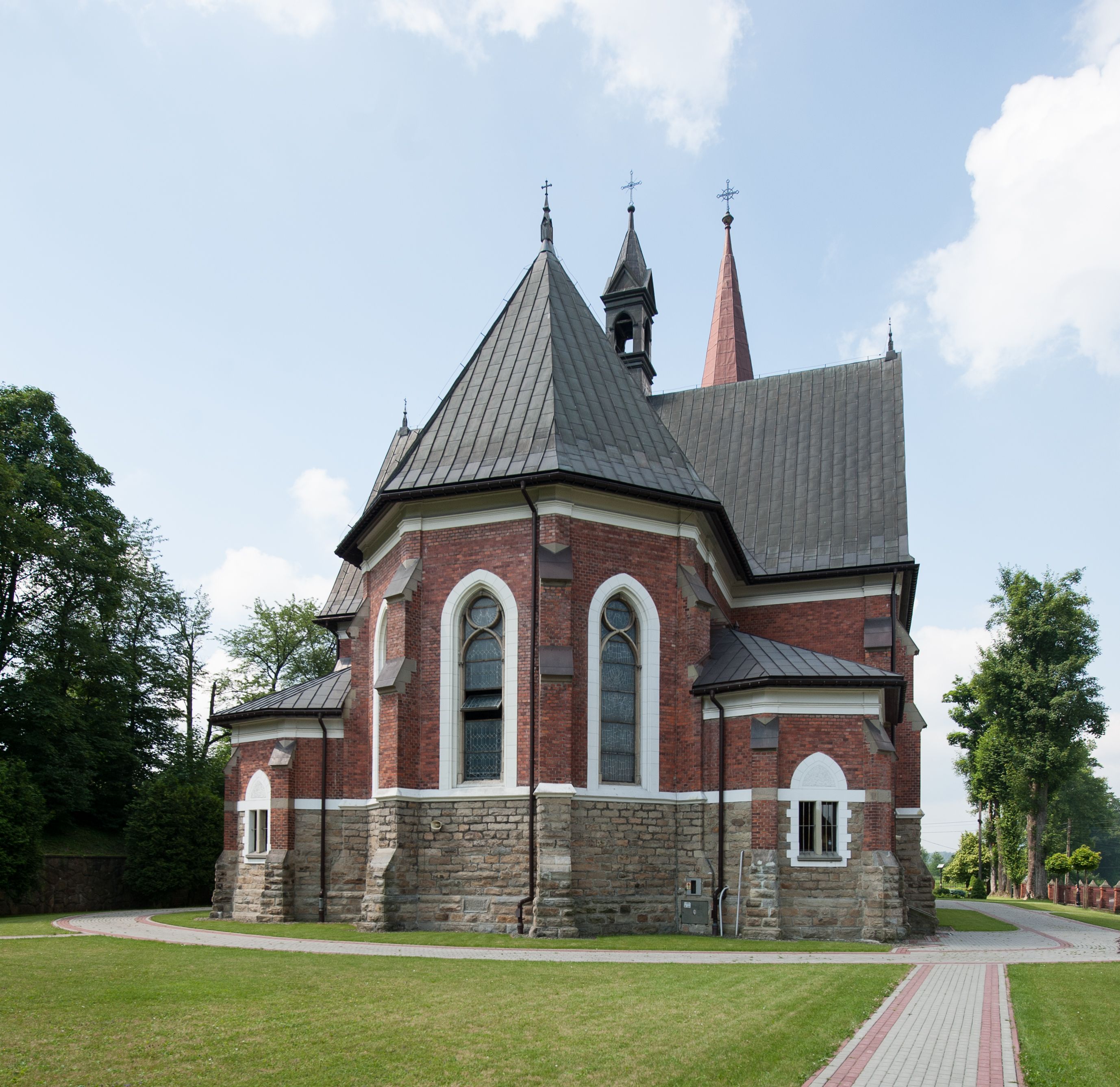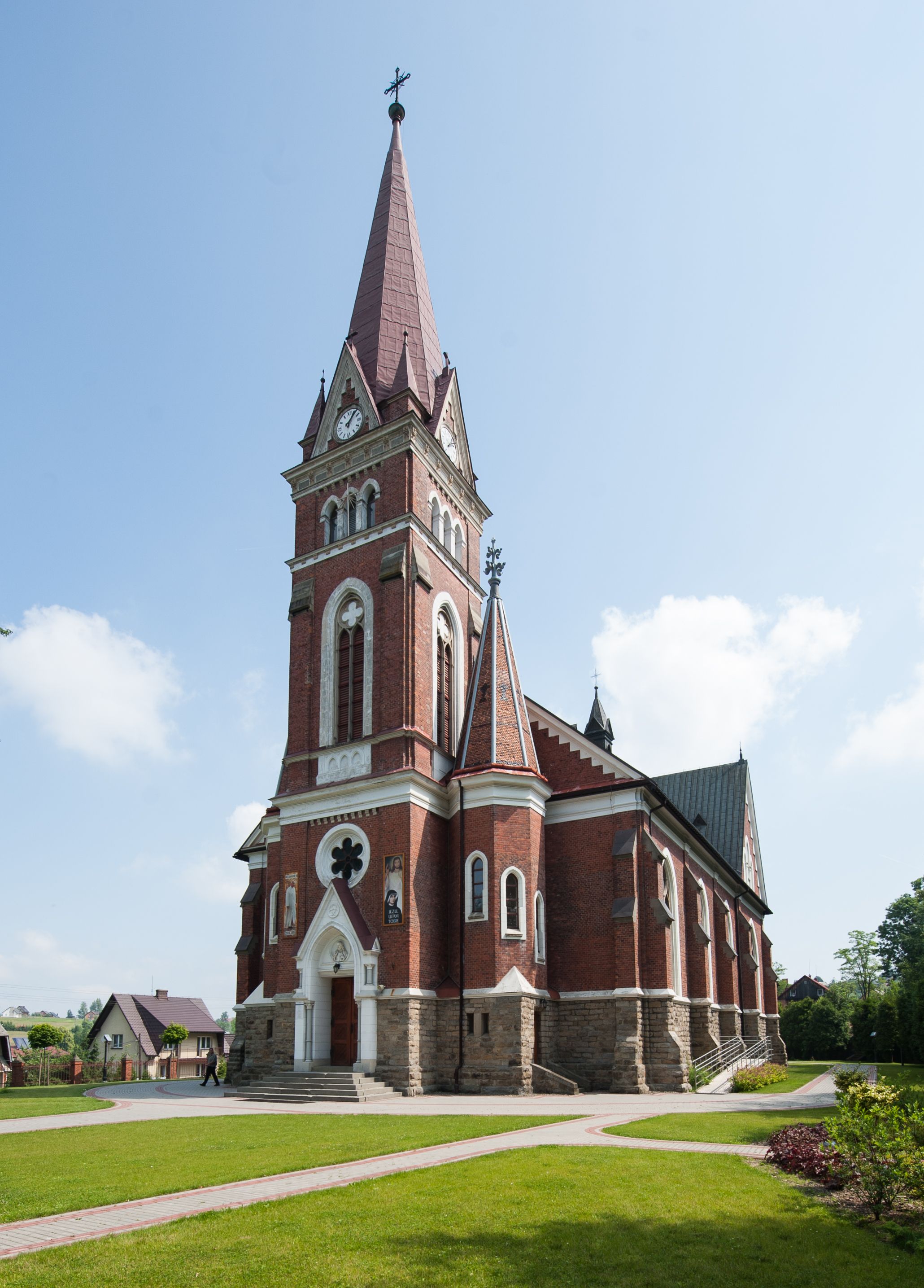Świątynia powstała według projektu Karola Korna z Bielska. W 1902 roku kościół przykryto dachem, ukończono wieżę, założono sklepienia oraz zaszklono oknami, z których prawdopodobnie trzy w prezbiterium otrzymały już witraże. Budowlę poświęcił 21 czerwca 1903 ksiądz Marcelin Narcyz Klimkiewicz, dziekan suski. Niewątpliwie już wtedy znajdowały się w kościele dwa neogotyckie ołtarze (główny i jeden boczny) zamówione w tyrolskiej pracowni Ferdinanda Stuflessera oraz nowe organy z wytwórni braci Riegerów. W kolejnym roku, również w pracowni Stuflessera, zamówiono stacje drogi krzyżowej oraz zlecono stolarzowi Antoniemu Ćwiąkale wykonanie stalli do prezbiterium. 1 września 1906 kościół został konsekrowany przez biskupa pomocniczego Anatola Nowaka, sufragana krakowskiego. W 1909 roku zostały sprawione trzy nowe dzwony, które utracono w czasie pierwszej wojny światowej. Nowe dzwony sprawiono w 1925 roku, lecz te również zaginęły w czasie drugiej wojny światowej. Ostatecznie, po wojnach i pożarze z 1949 roku, w którym dwa stare dzwony spadły i rozbiły się, kościół nie posiadał przez kilka lat żadnych. Nowe zakupiono dopiero w 1952 roku.